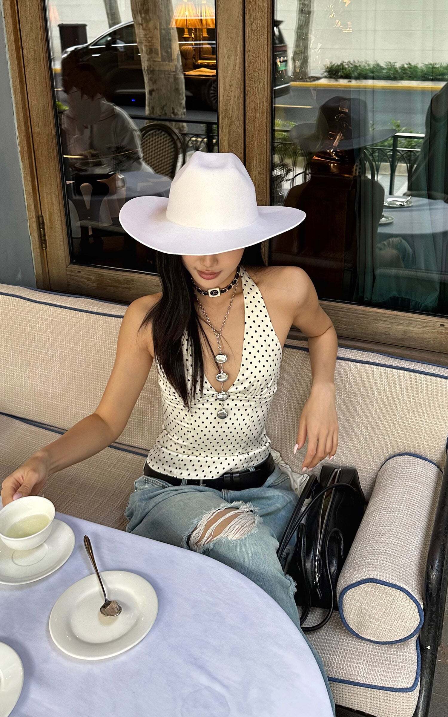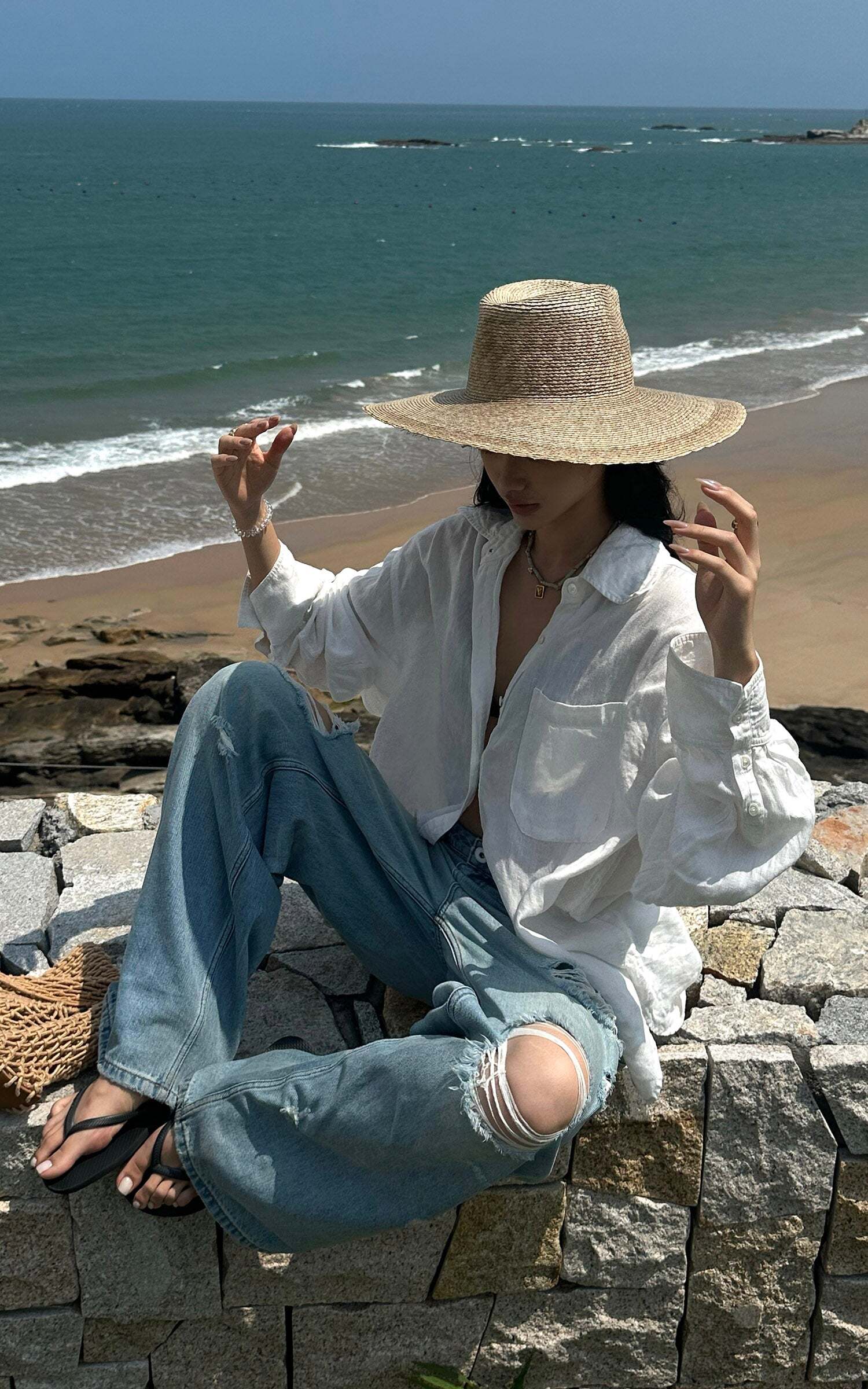 These wide-leg jeans feature a vintage-inspired light wash and bold distressed details that channel effortless rebellion. The high-waisted silhouette elongates the leg, while oversized shredded rips bring a raw, undone edge. Designed to fall loosely around the legs, they fuse nonchalant street attitude with a fashion-forward cut. Style with a barely-there top and heels for downtown glamour, or layer with a blazer for structured contrast. An unapologetic essential for the modern muse.