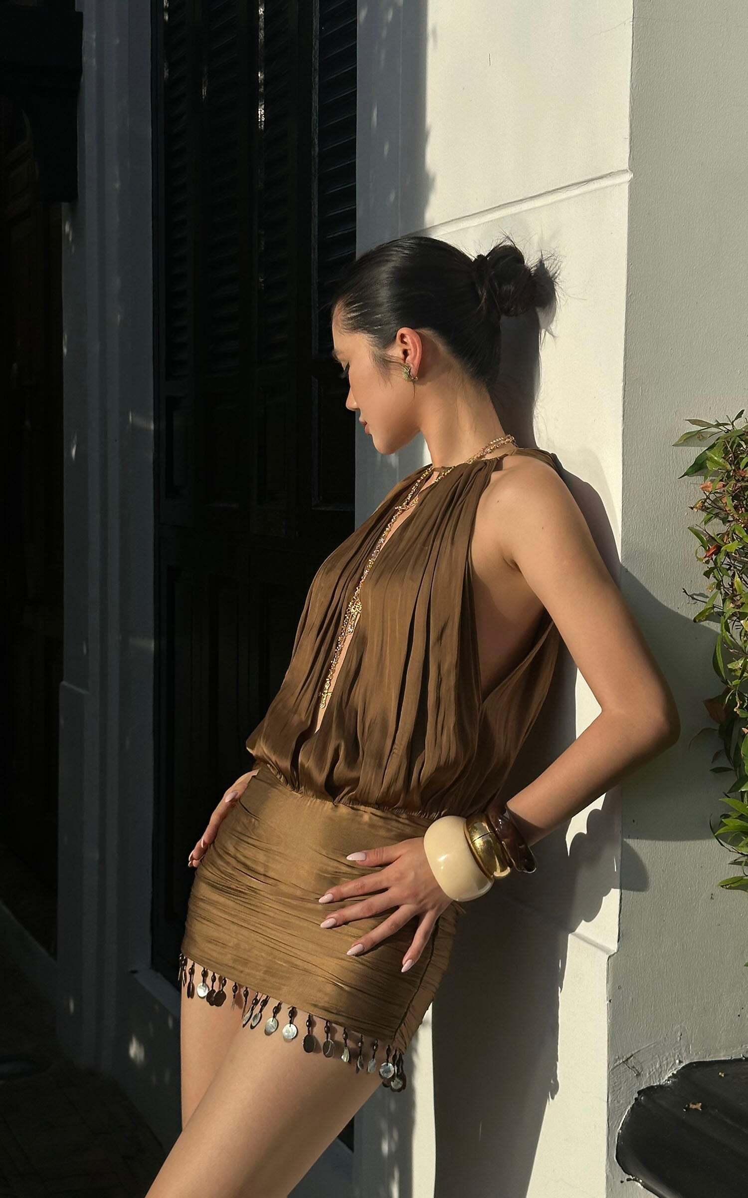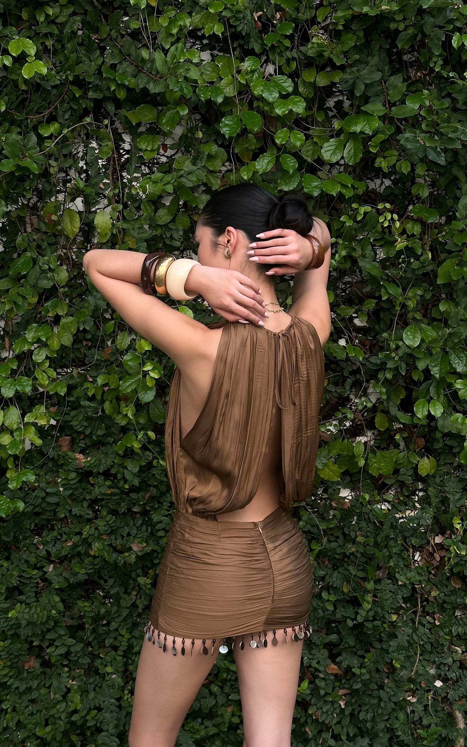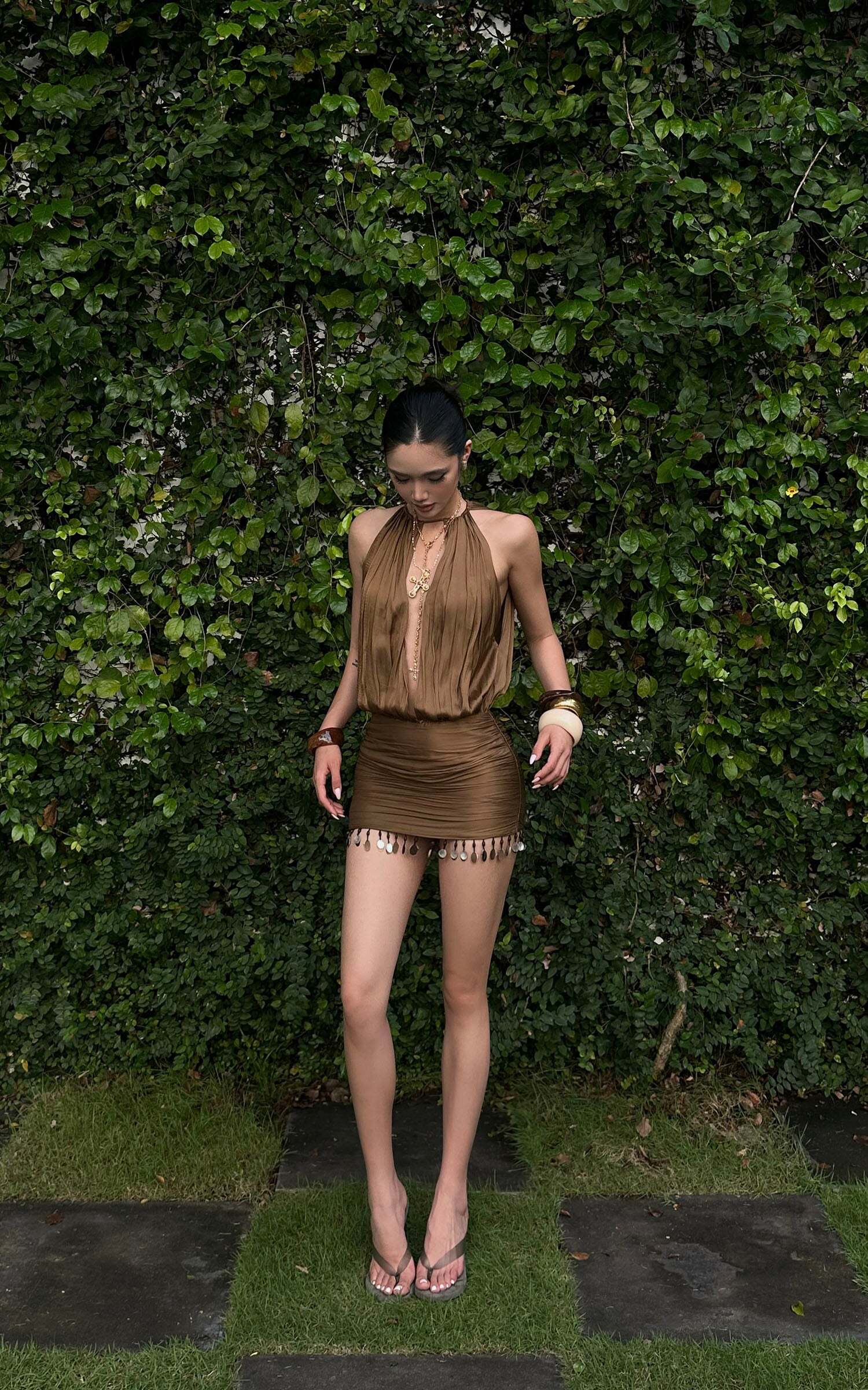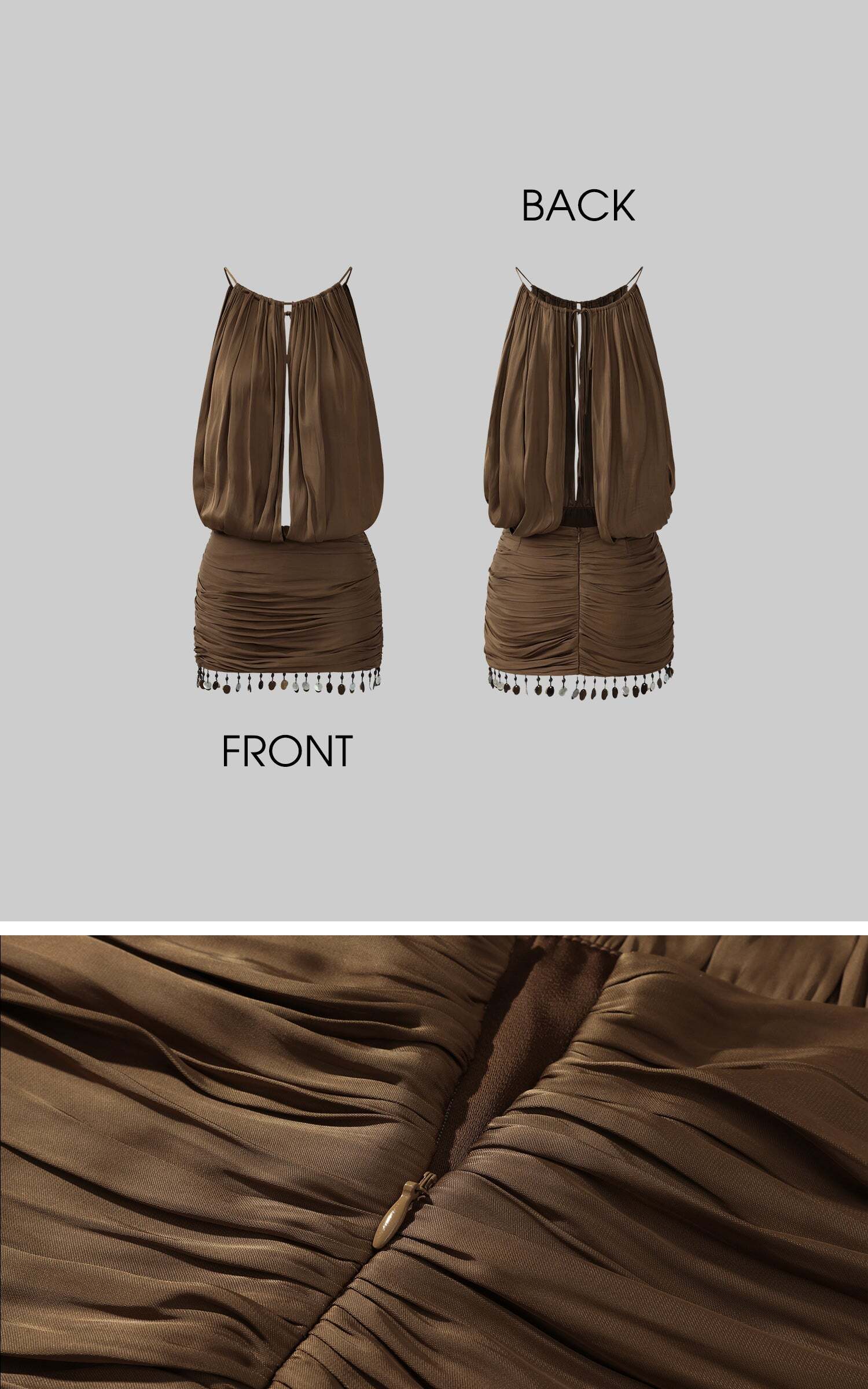 A sultry statement piece that clings and flows in all the right places. This mini dress features a voluminous draped halter bodice with an ultra-low back and a fitted ruched skirt that hugs your curves. The hemline is adorned with dangling shell-inspired beads that shimmer with every step, perfect for dusk-lit beach soirées or after-dark rooftop scenes. Barely-there straps and a gathered neckline finish the effortlessly seductive silhouette.