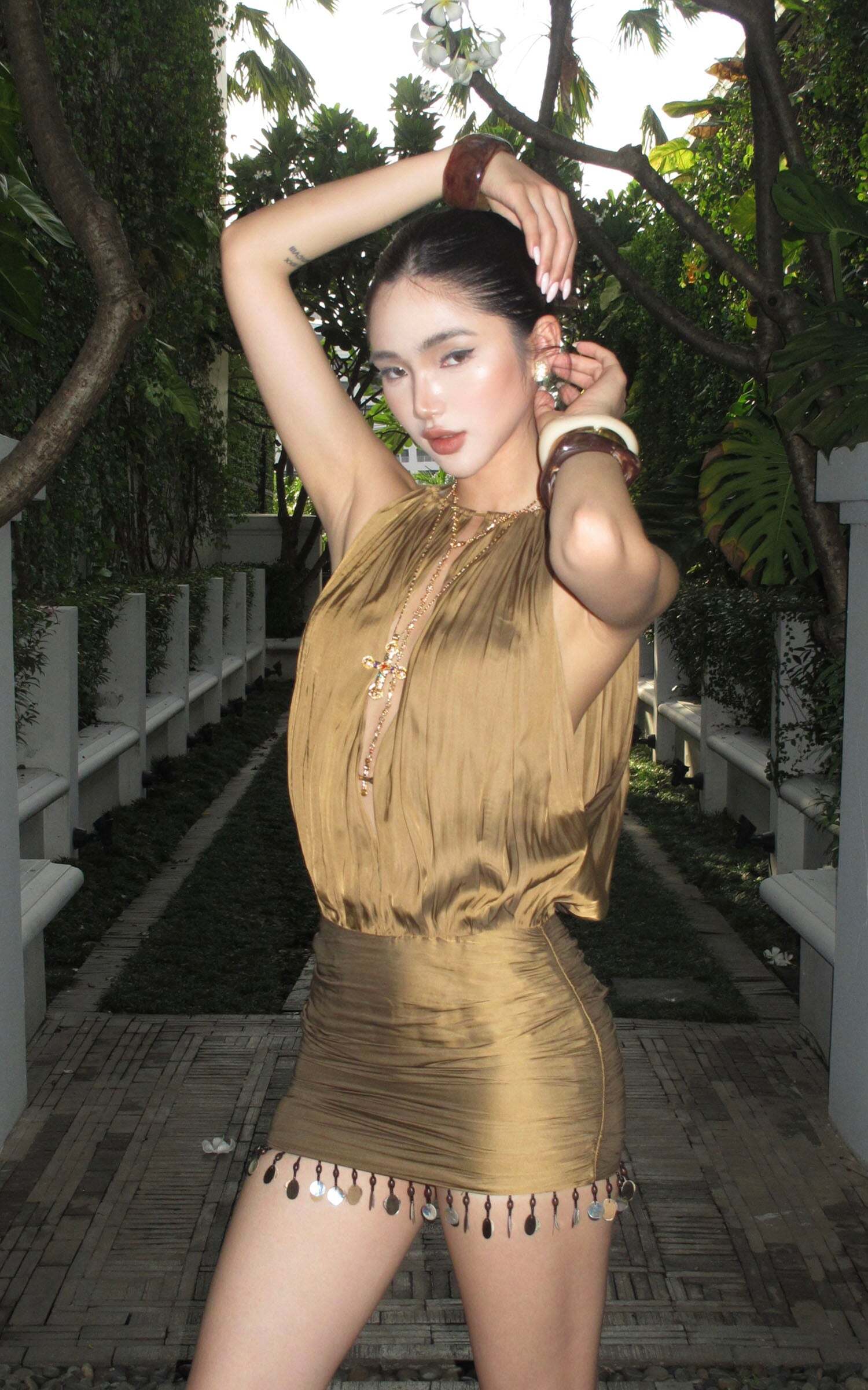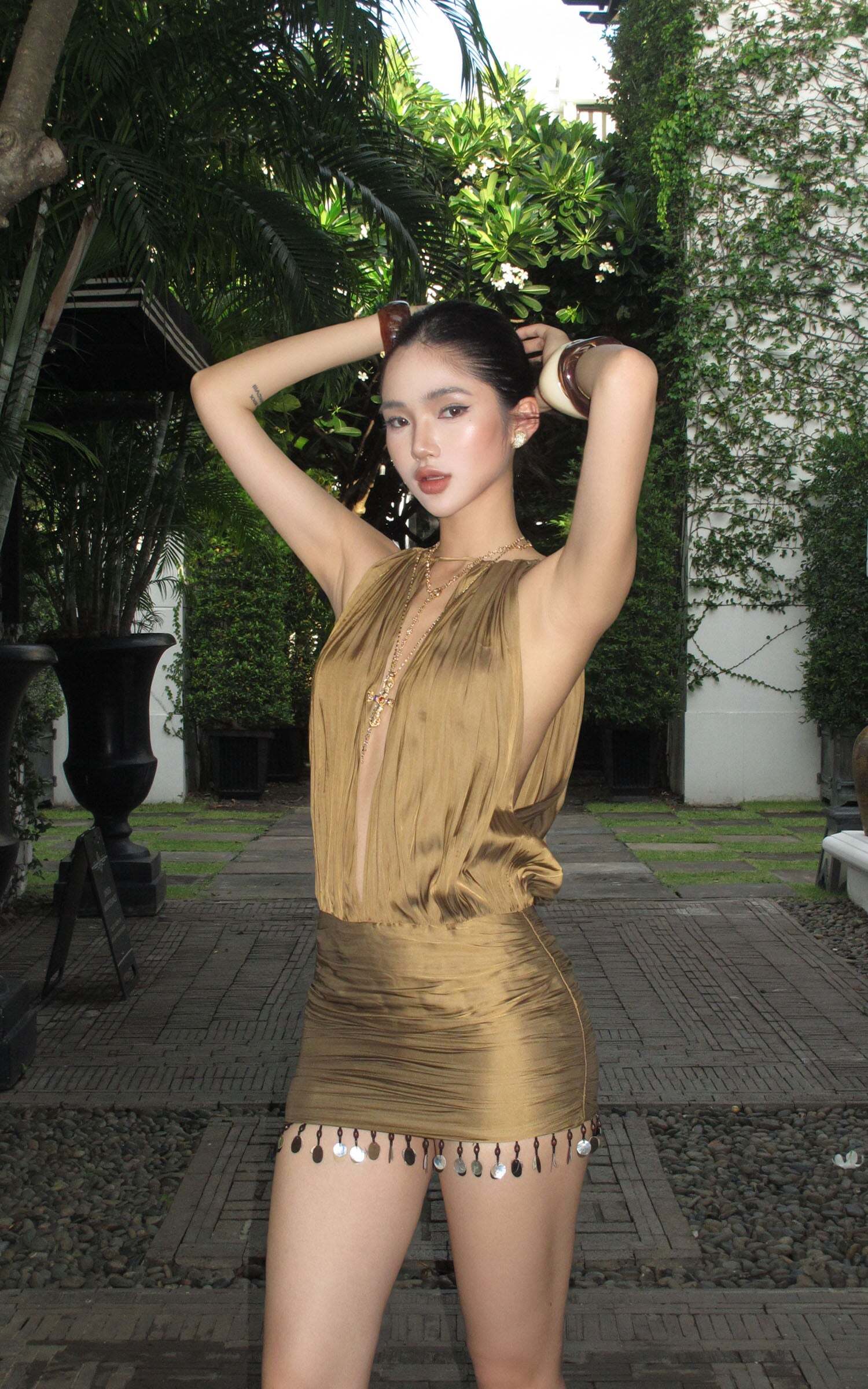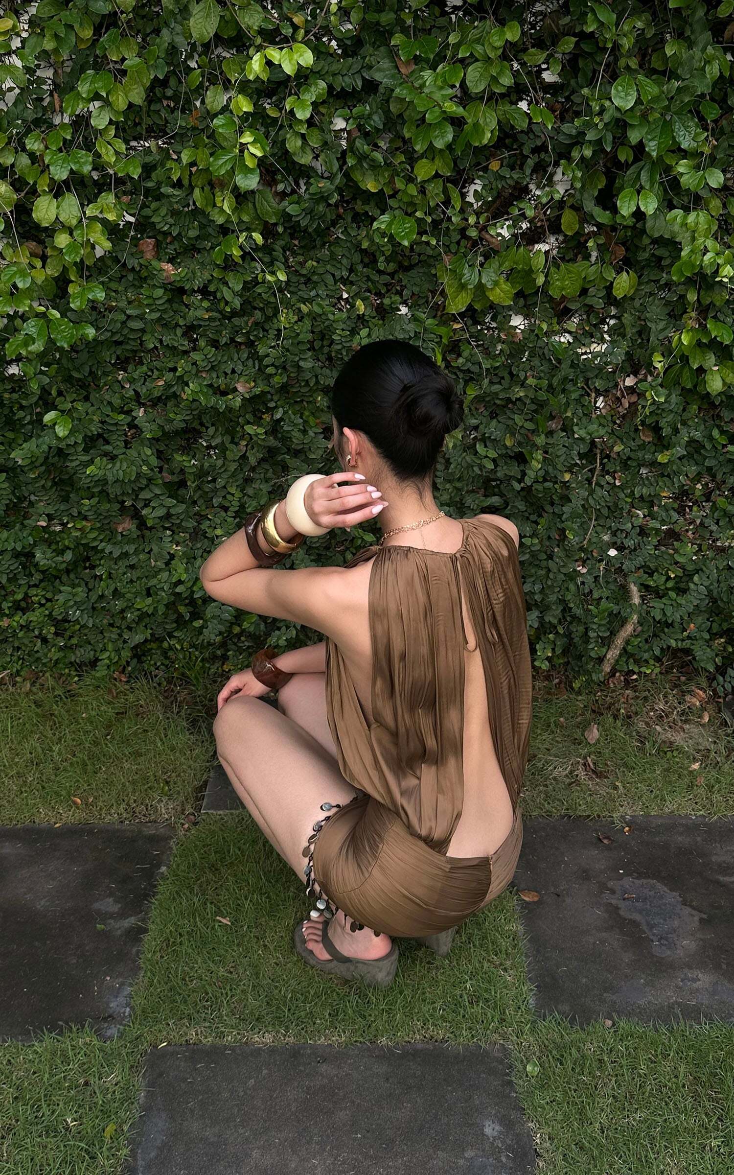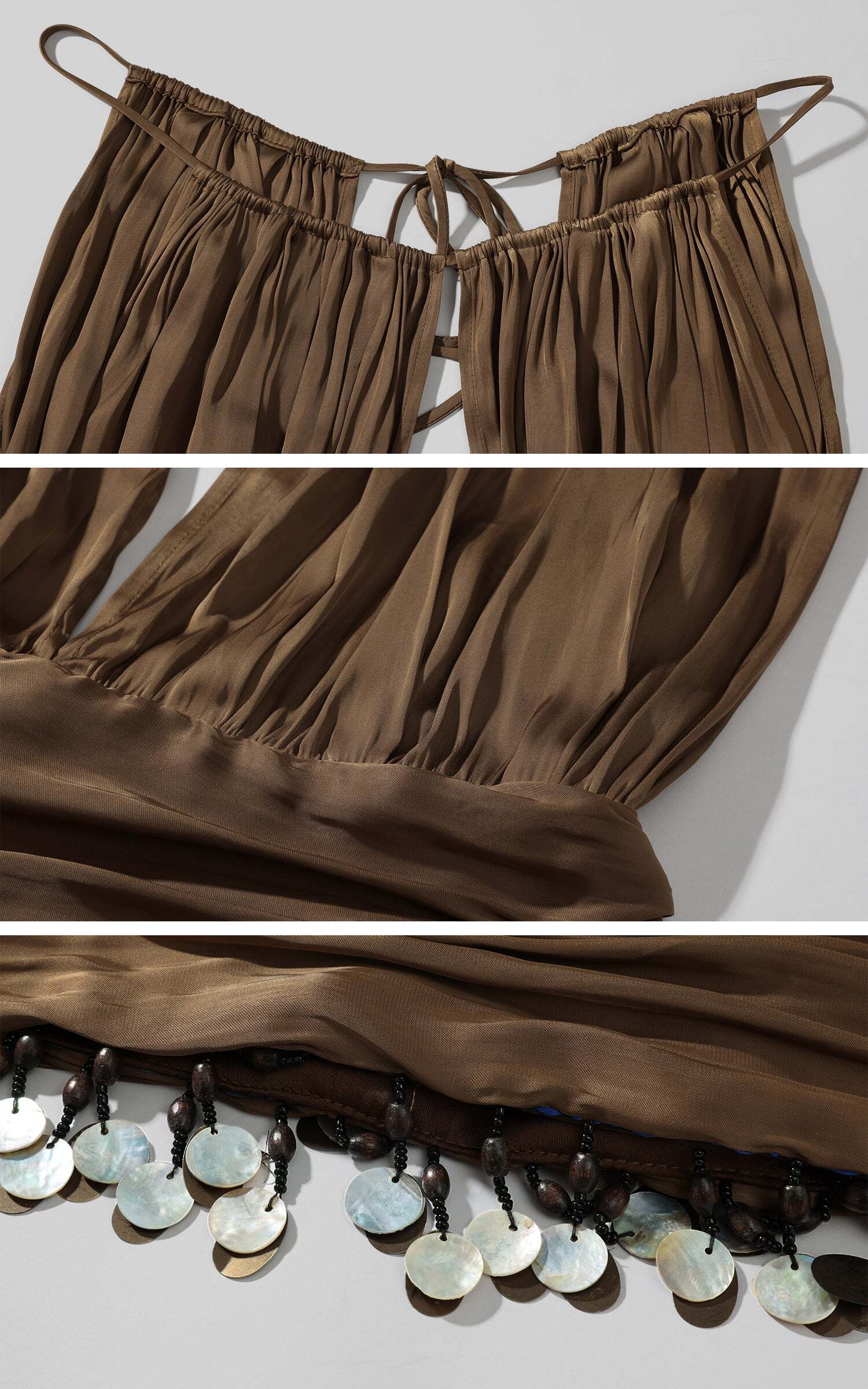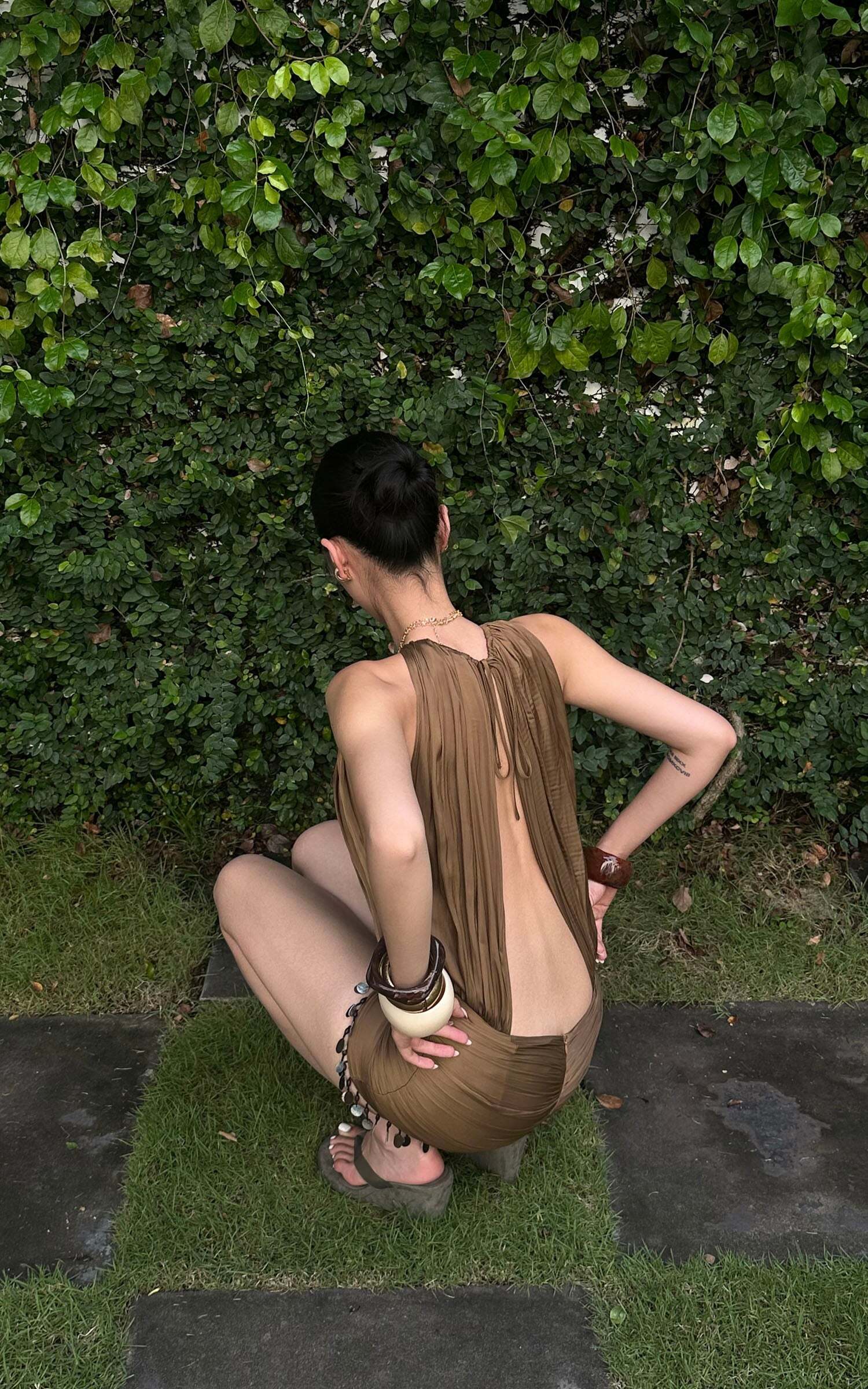 A sultry statement piece that clings and flows in all the right places. This mini dress features a voluminous draped halter bodice with an ultra-low back and a fitted ruched skirt that hugs your curves. The hemline is adorned with dangling shell-inspired beads that shimmer with every step, perfect for dusk-lit beach soirées or after-dark rooftop scenes. Barely-there straps and a gathered neckline finish the effortlessly seductive silhouette.