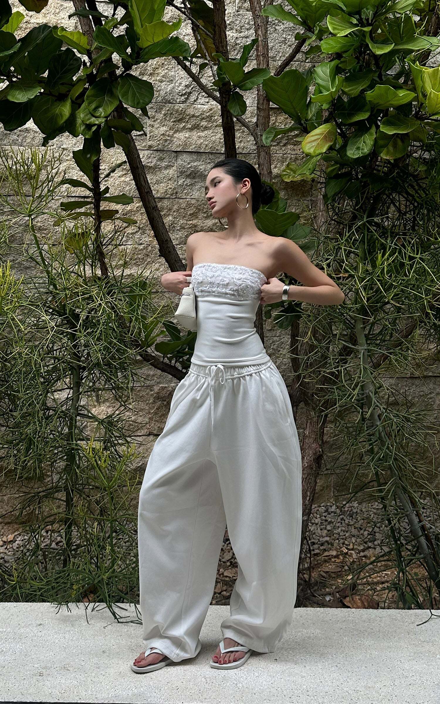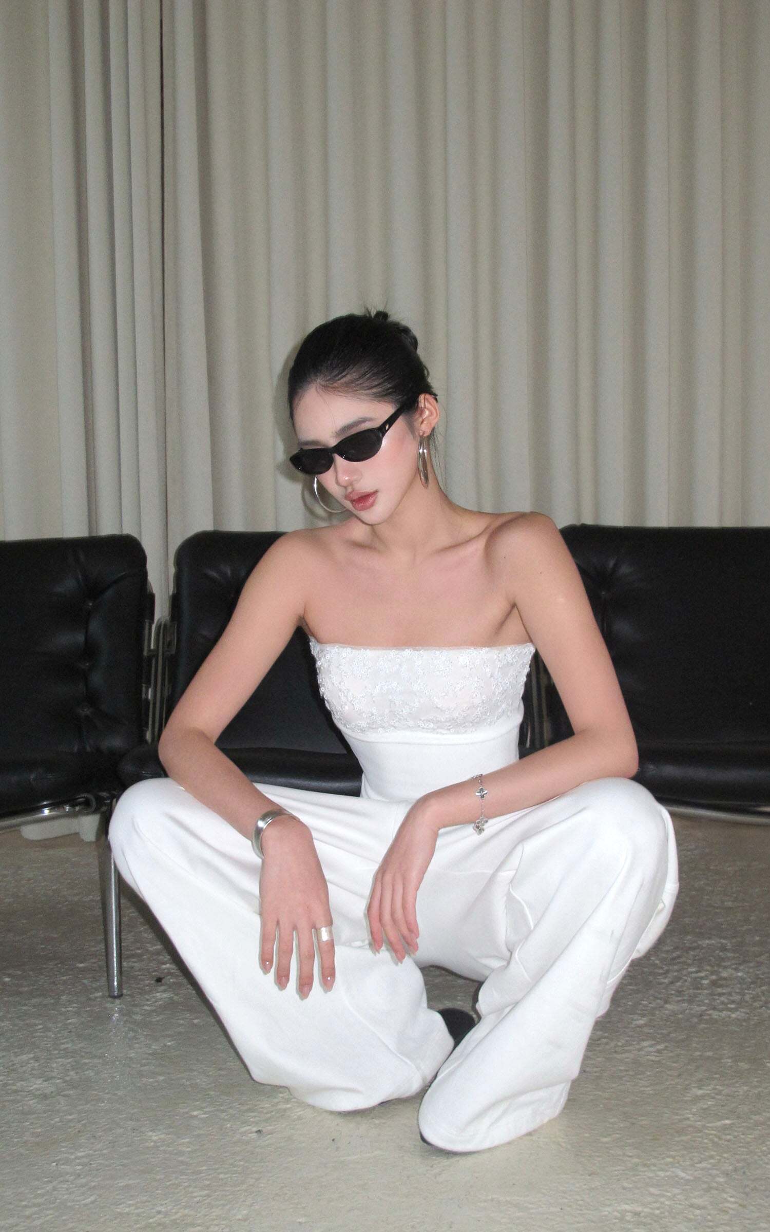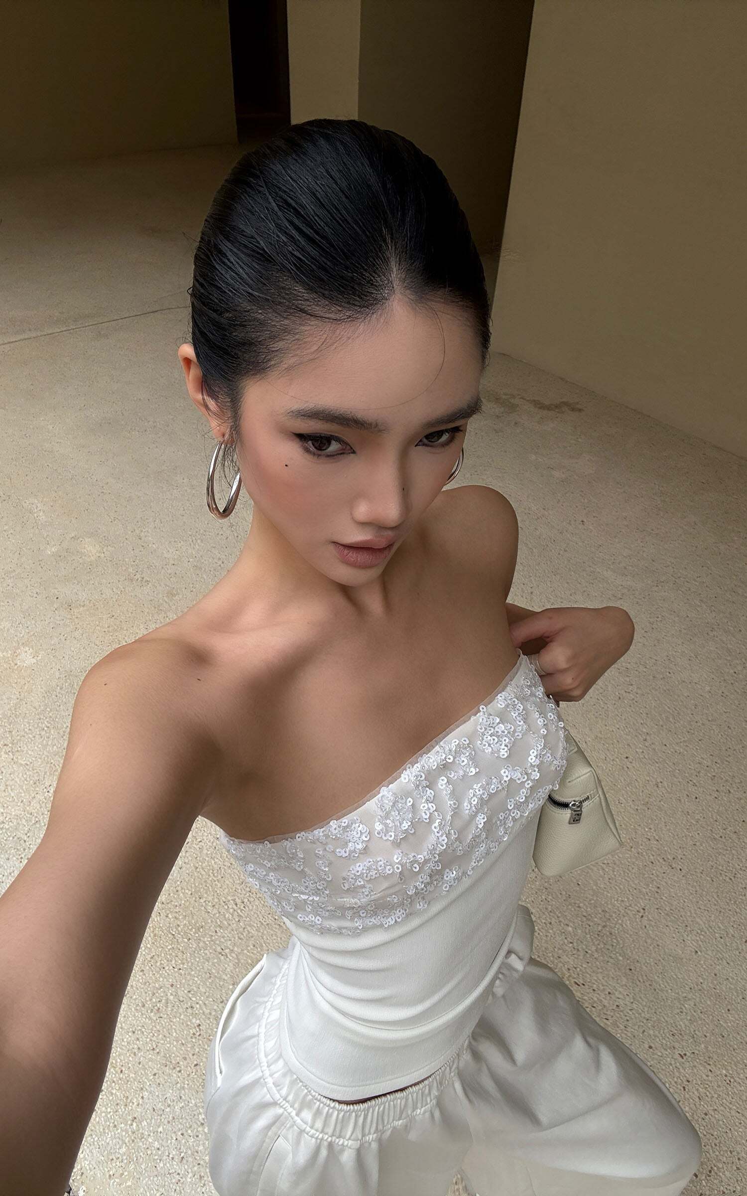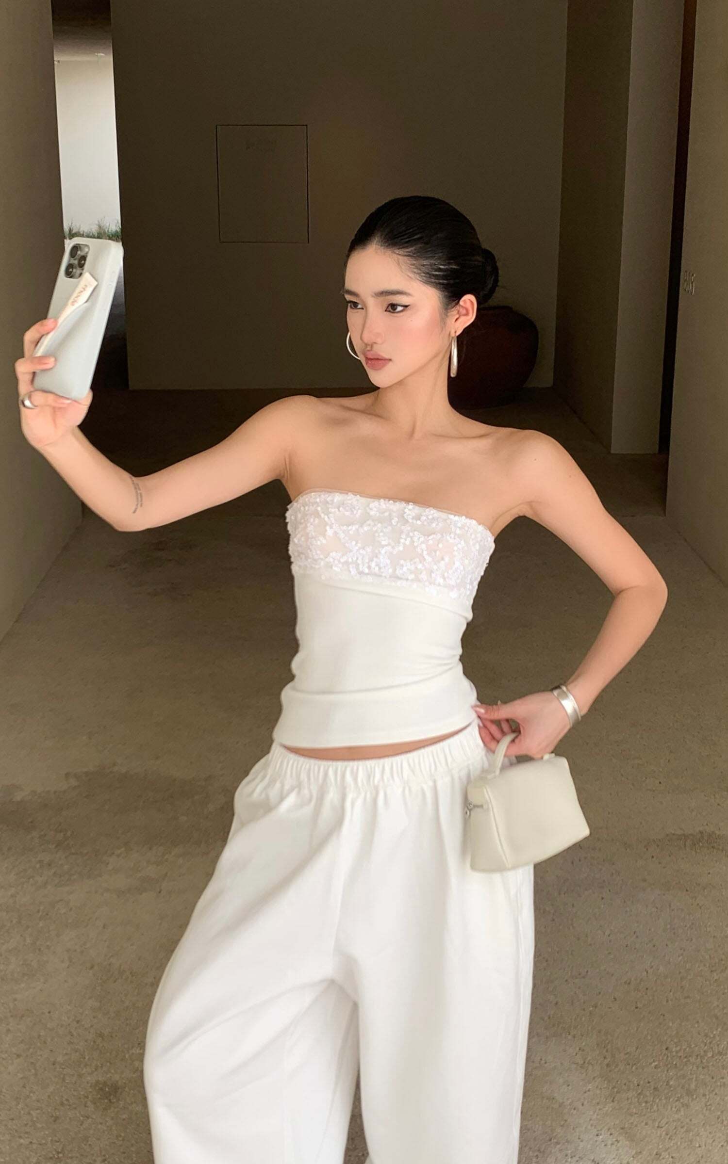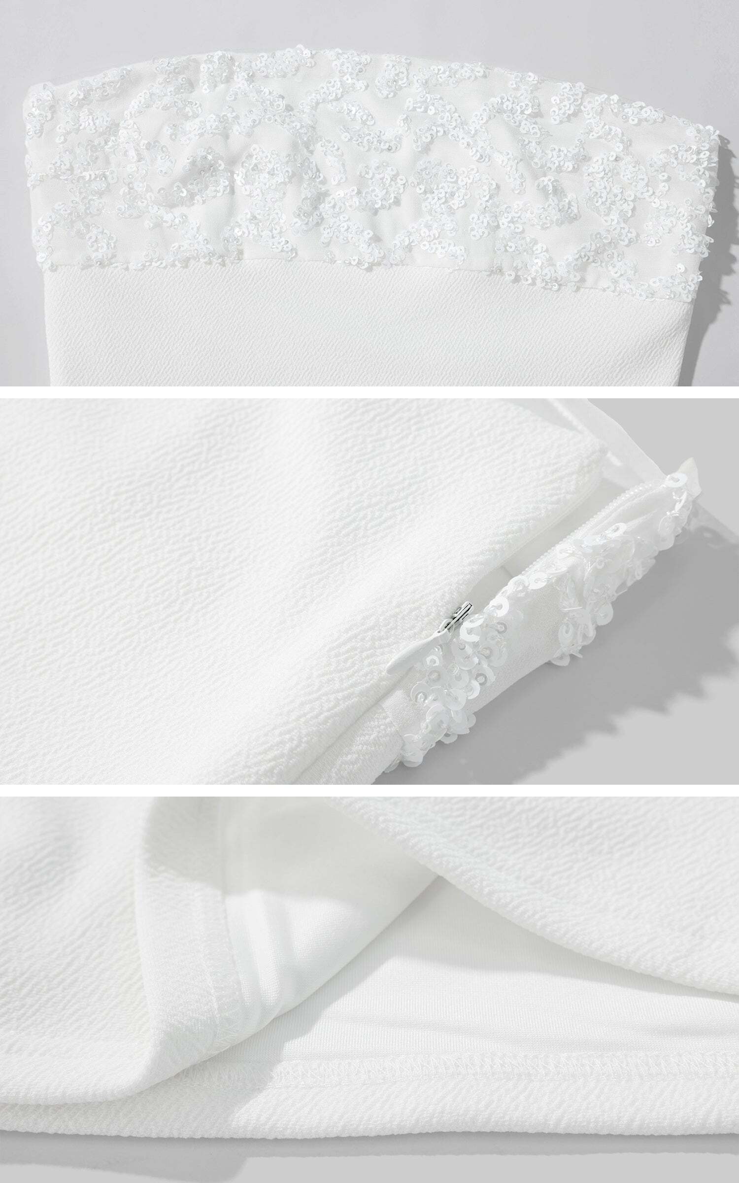 A sultry statement in soft structure—this strapless top is crafted to captivate. The clean silhouette hugs your shape with sculptural ease, while the top is adorned with delicate sequin embroidery that catches the light like a whispered flirtation. The textured knit fabric brings comfort and stretch, balanced by a hidden side zip that keeps the profile sleek. Style it with slouchy cargos or fluid trousers for contrast, or go full siren with a slinky midi and sharp heels. It’s minimal, luminous, and unapologetically bold.