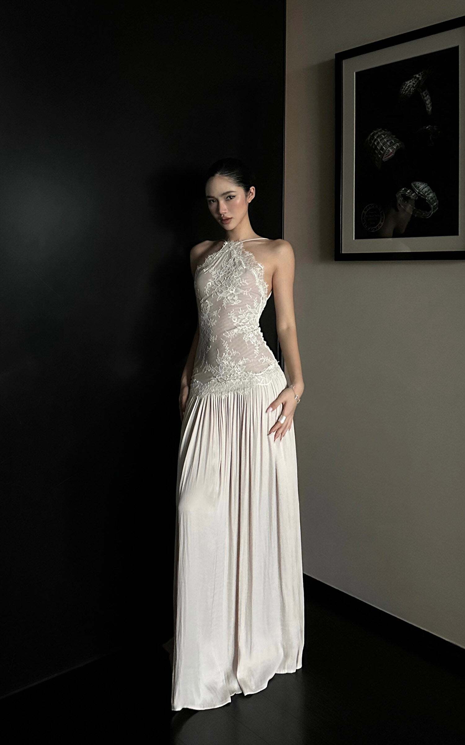 This ethereal halter dress turns heads with its sheer lace bodice, sculpted to accentuate the body like a second skin. A soft pleated skirt flows elegantly from the scalloped lace waist, swaying with your every step. The delicate floral embroidery and fine mesh create a sensual contrast against bare skin, while adjustable spaghetti straps offer a barely-there look. Dreamy yet daring — this is a night-out statement made for the spotlight.