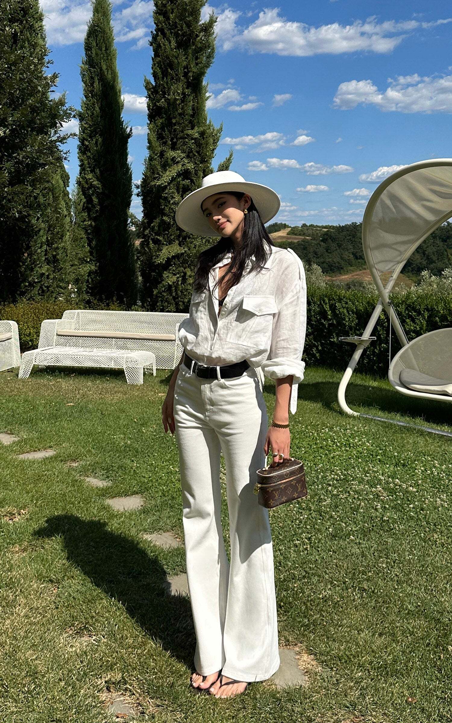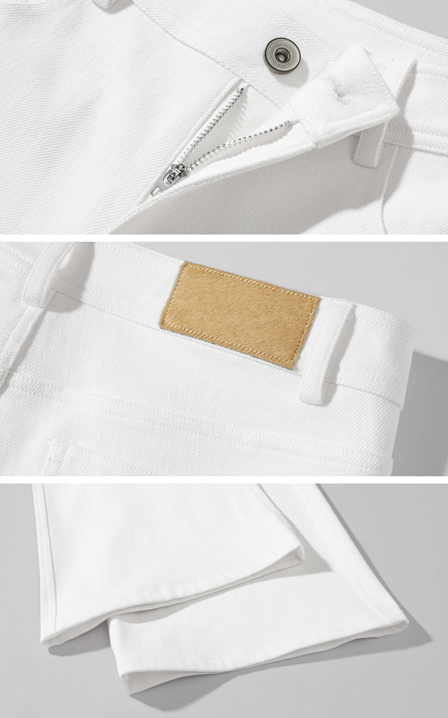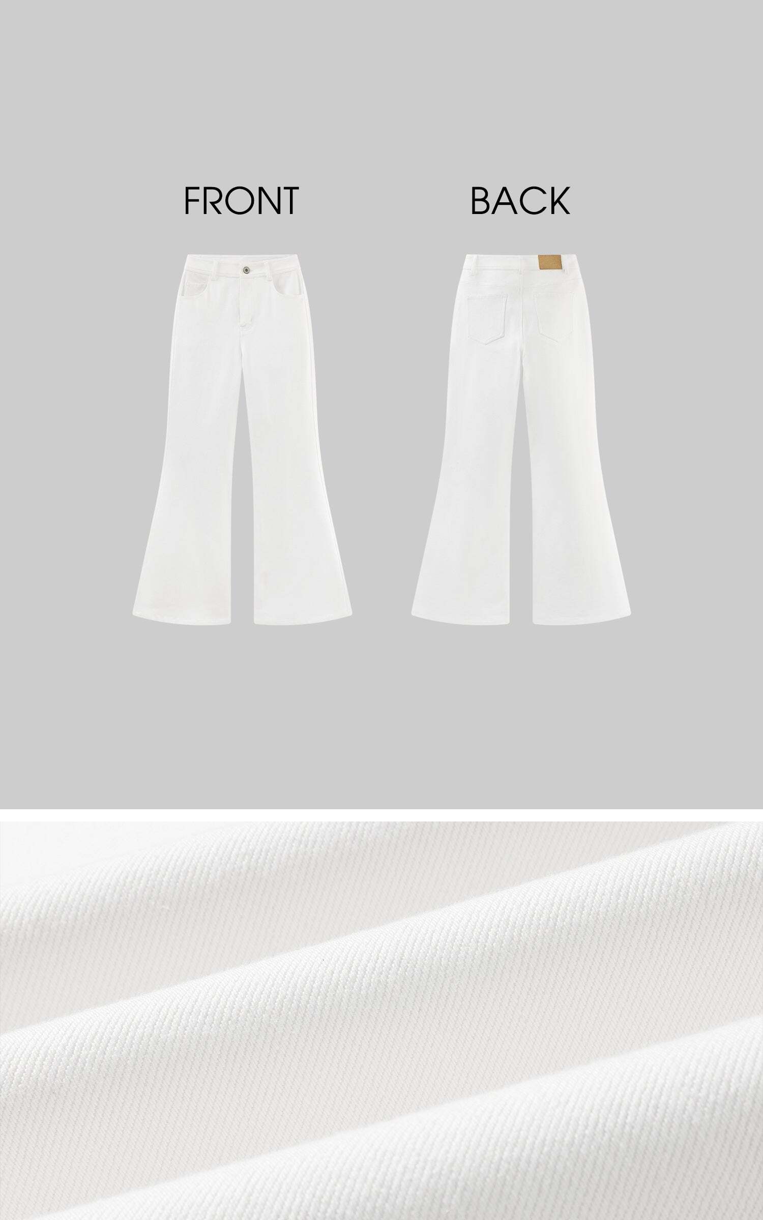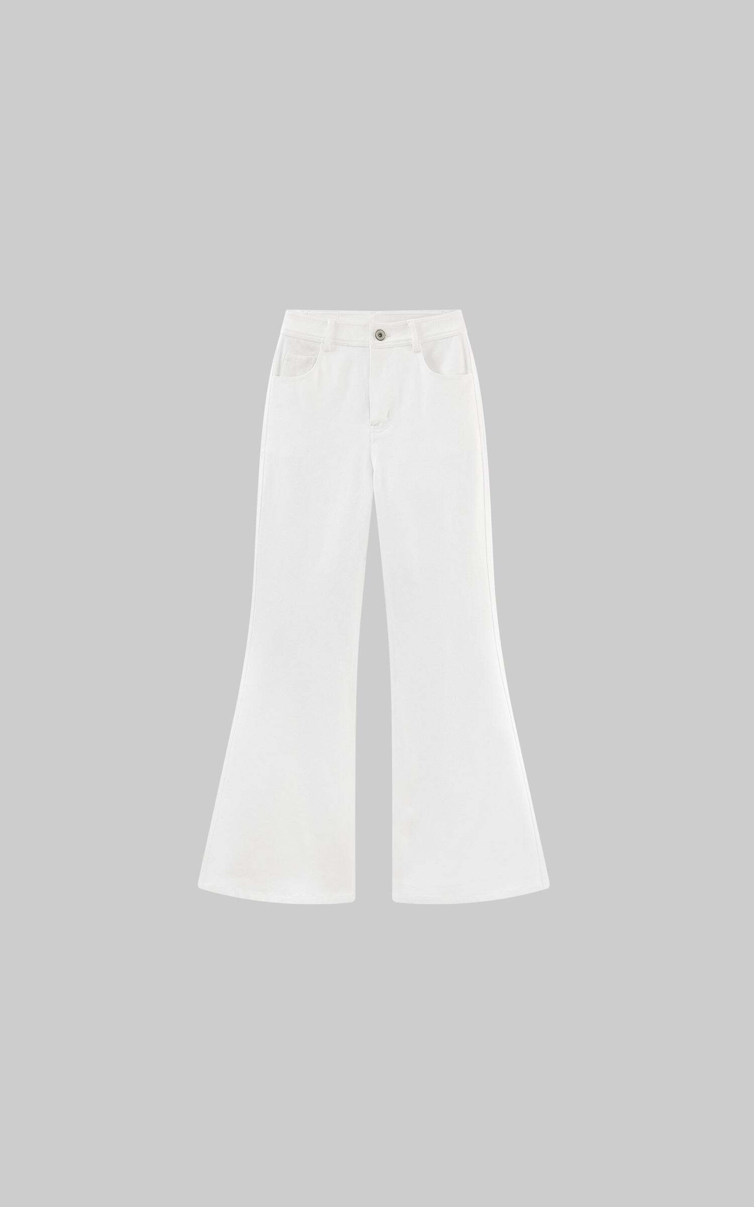 Cut to flatter and designed to elongate, these high-rise jeans feature a subtle flare that flows from hip to hem. Crafted from structured yet comfortable denim, they hold their shape while allowing ease of movement. The clean, all-white wash brings a fresh, versatile edge—perfect for pairing with a crisp shirt, oversized blazer, or summer knit. Five-pocket construction, front zip closure, and tonal stitching keep the look refined and timeless, ready to take you from city strolls to coastal escapes.