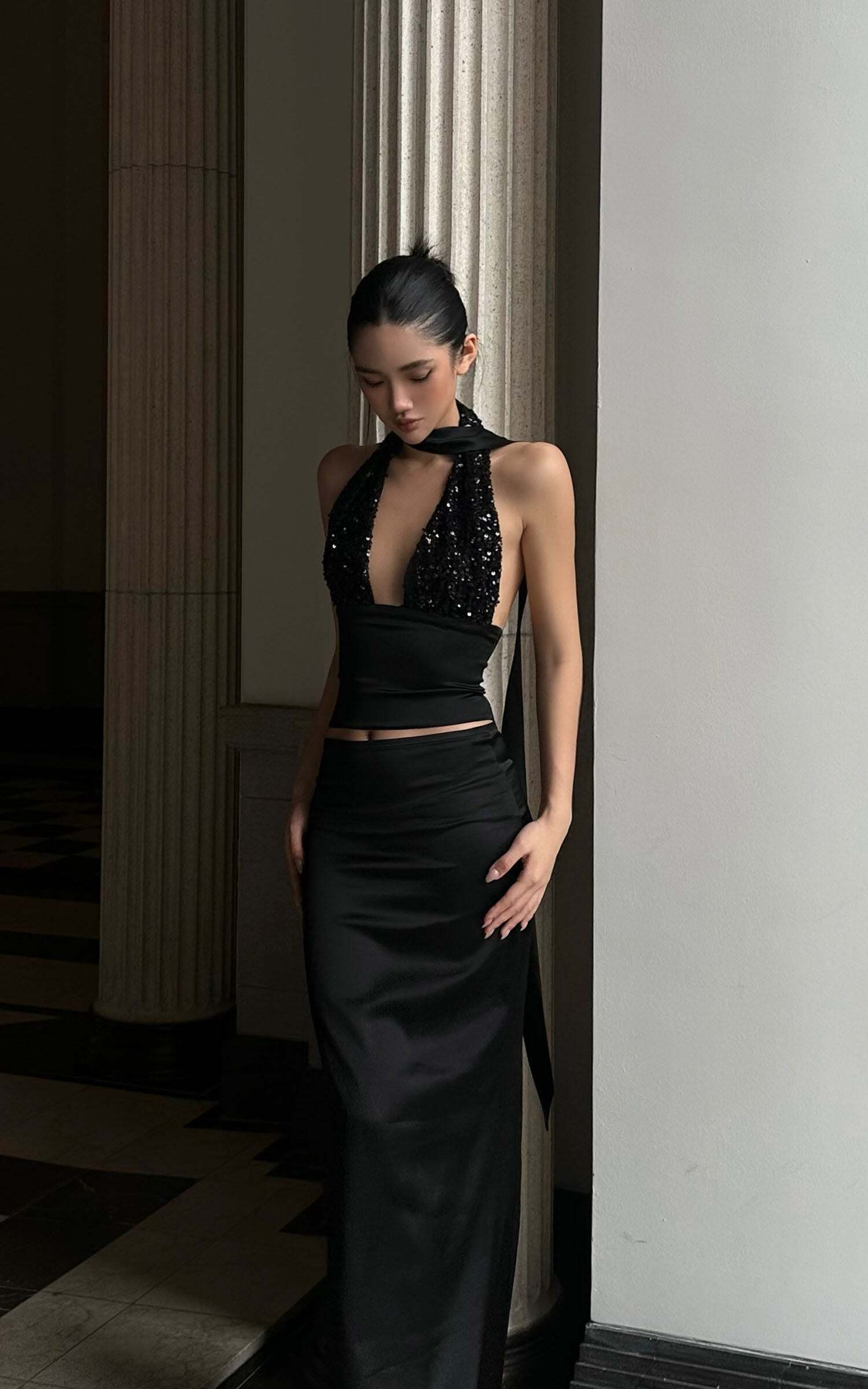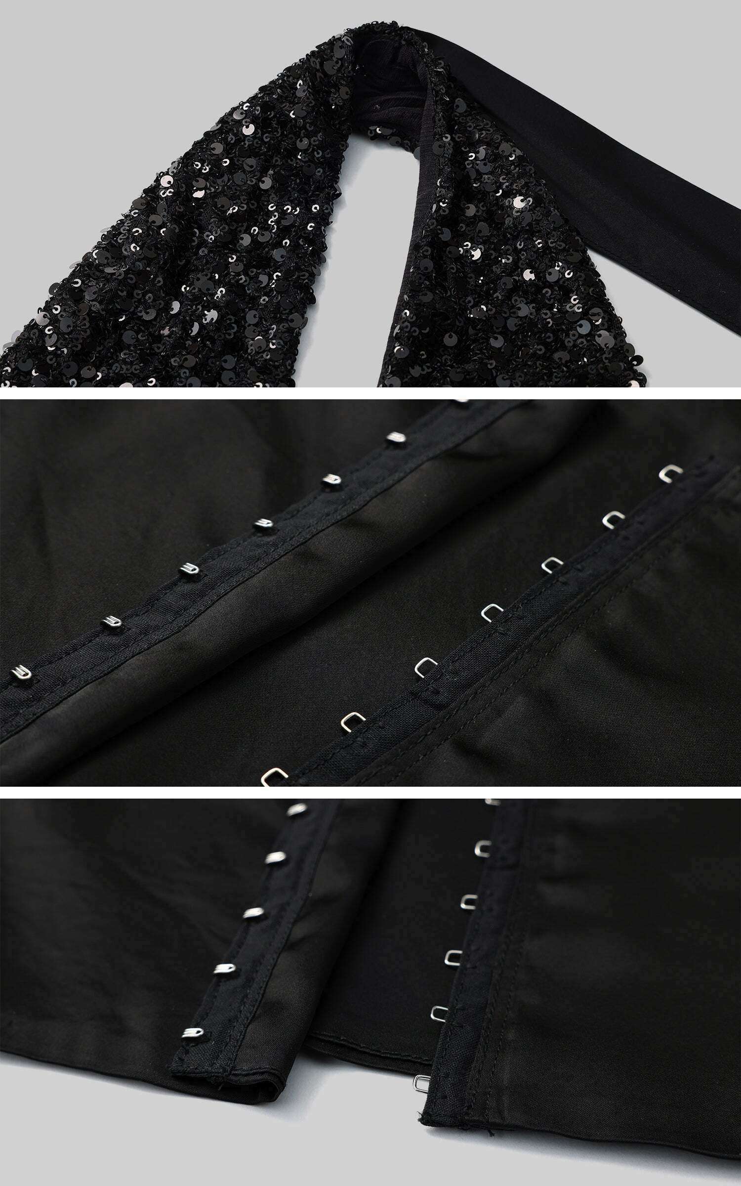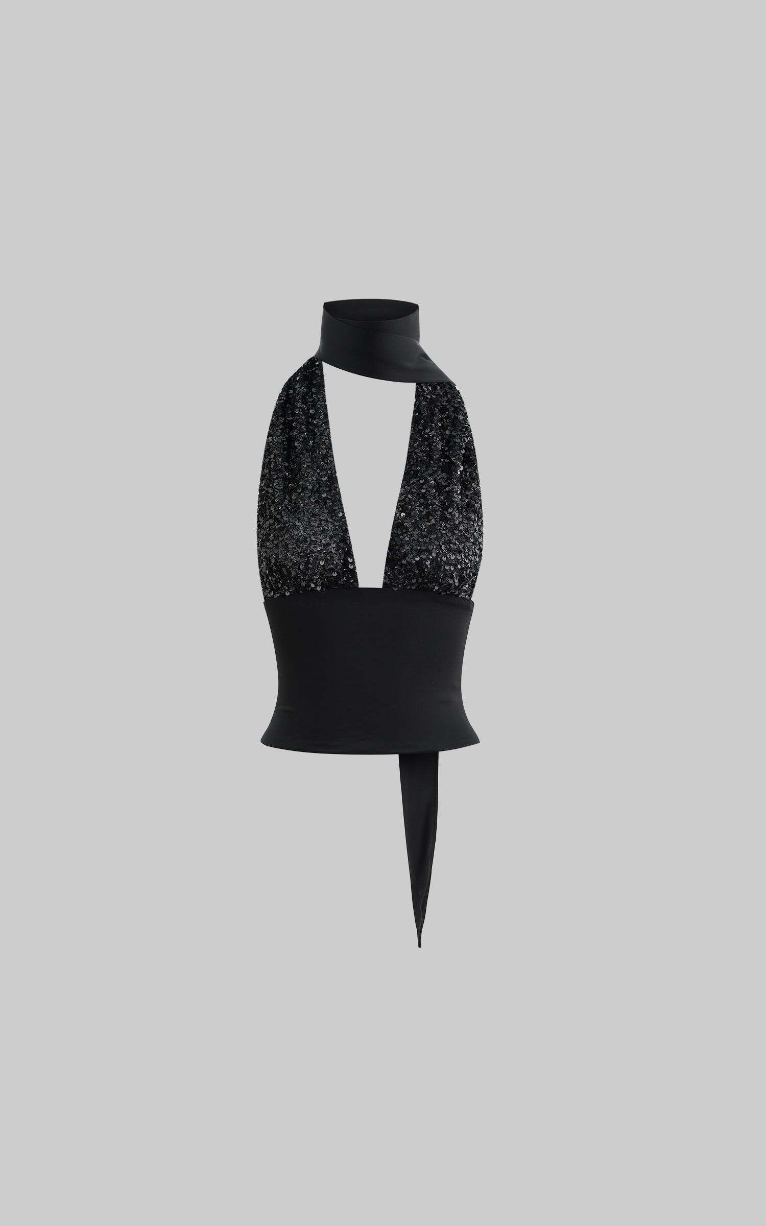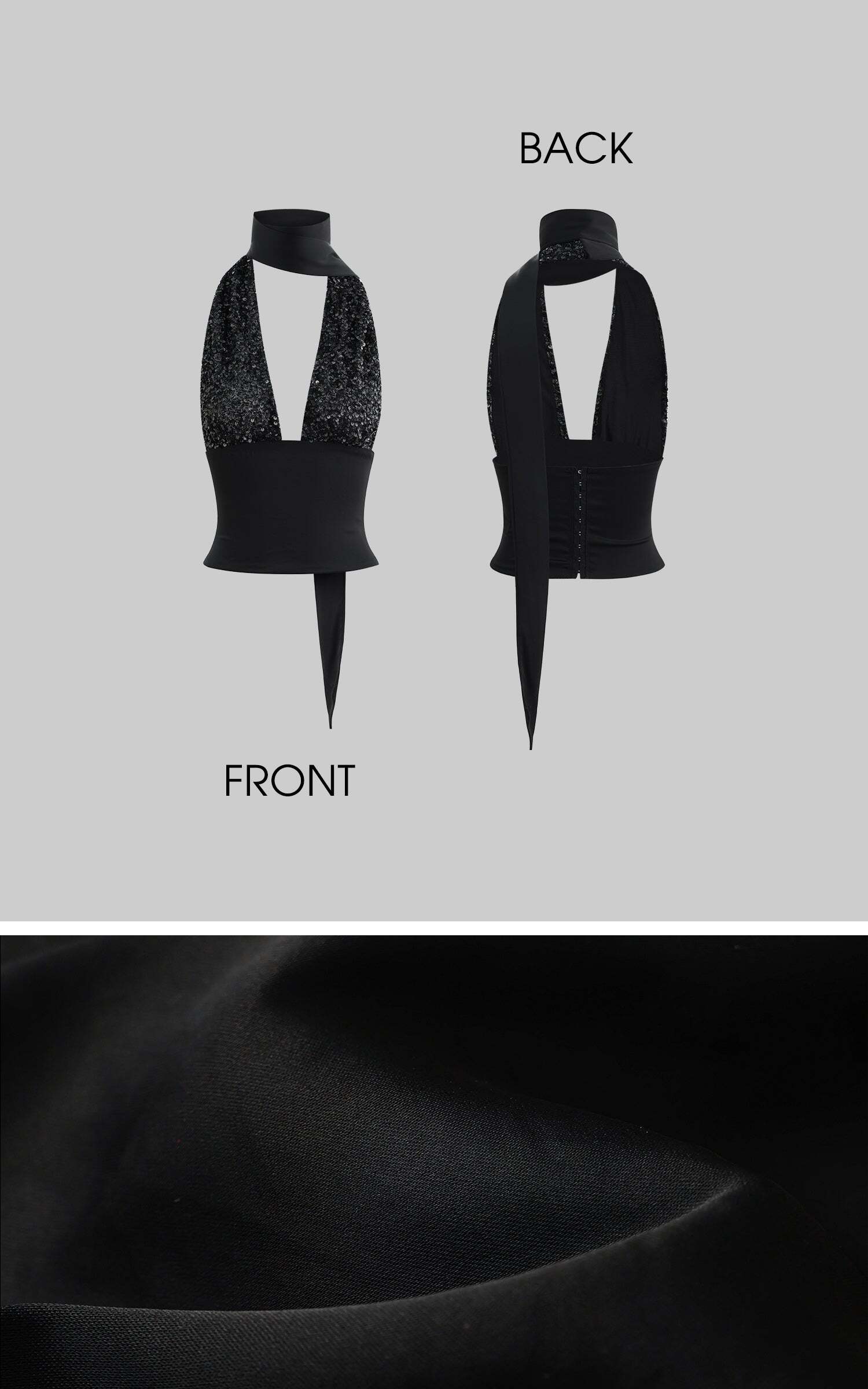 Designed to dazzle — this halter corset top fuses sharp sensuality with high-glam shine. A plunging V-neck is covered in jet-black sequins, catching the light with every breath. The sculpted waist is cinched for a corset-like effect, while the exaggerated necktie wraps and drapes, adding a bold finish. The open back, complete with hook fastenings, turns every exit into a statement.