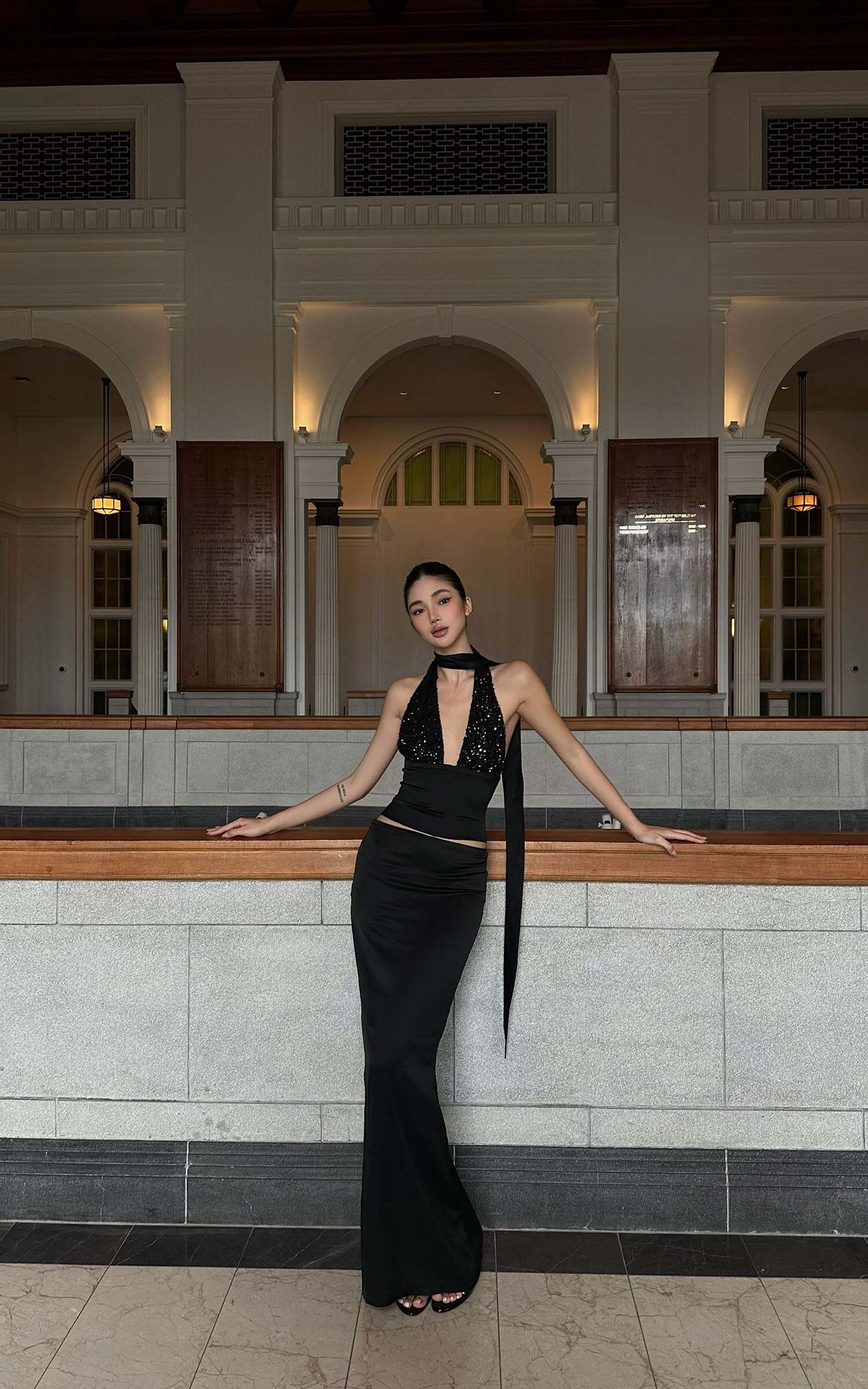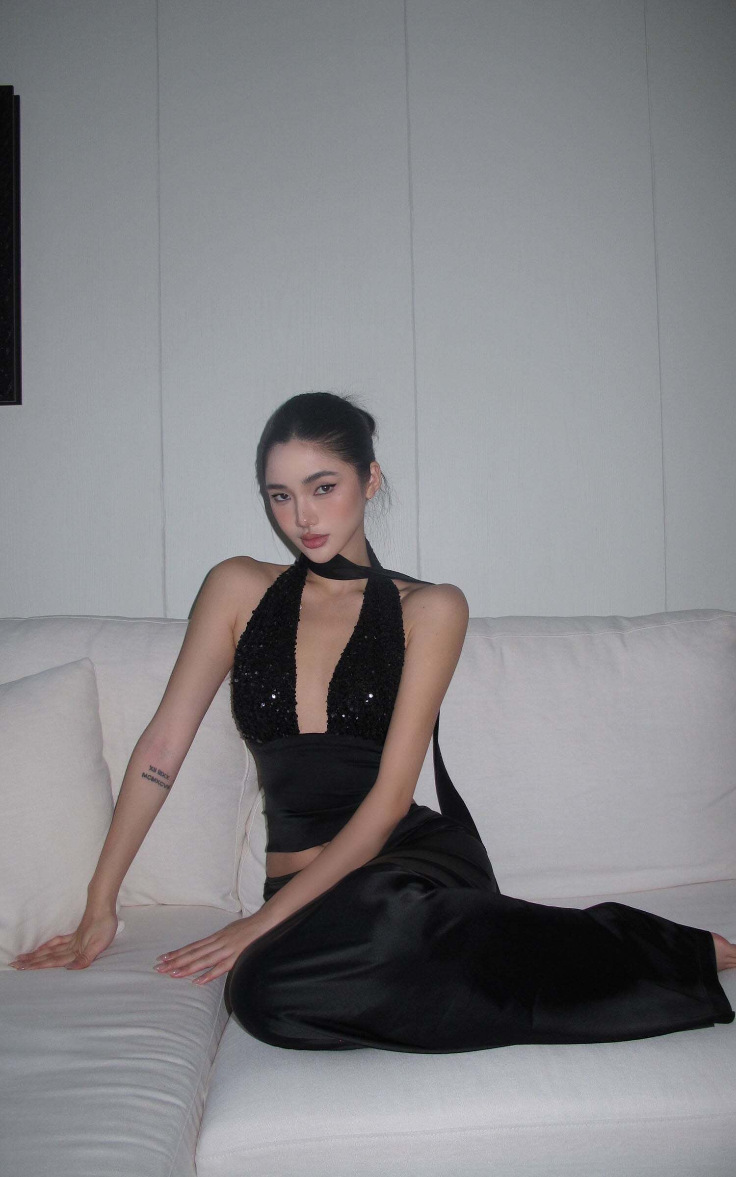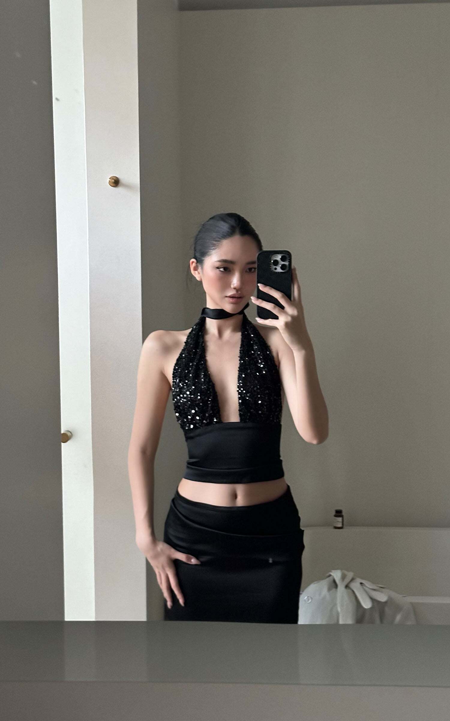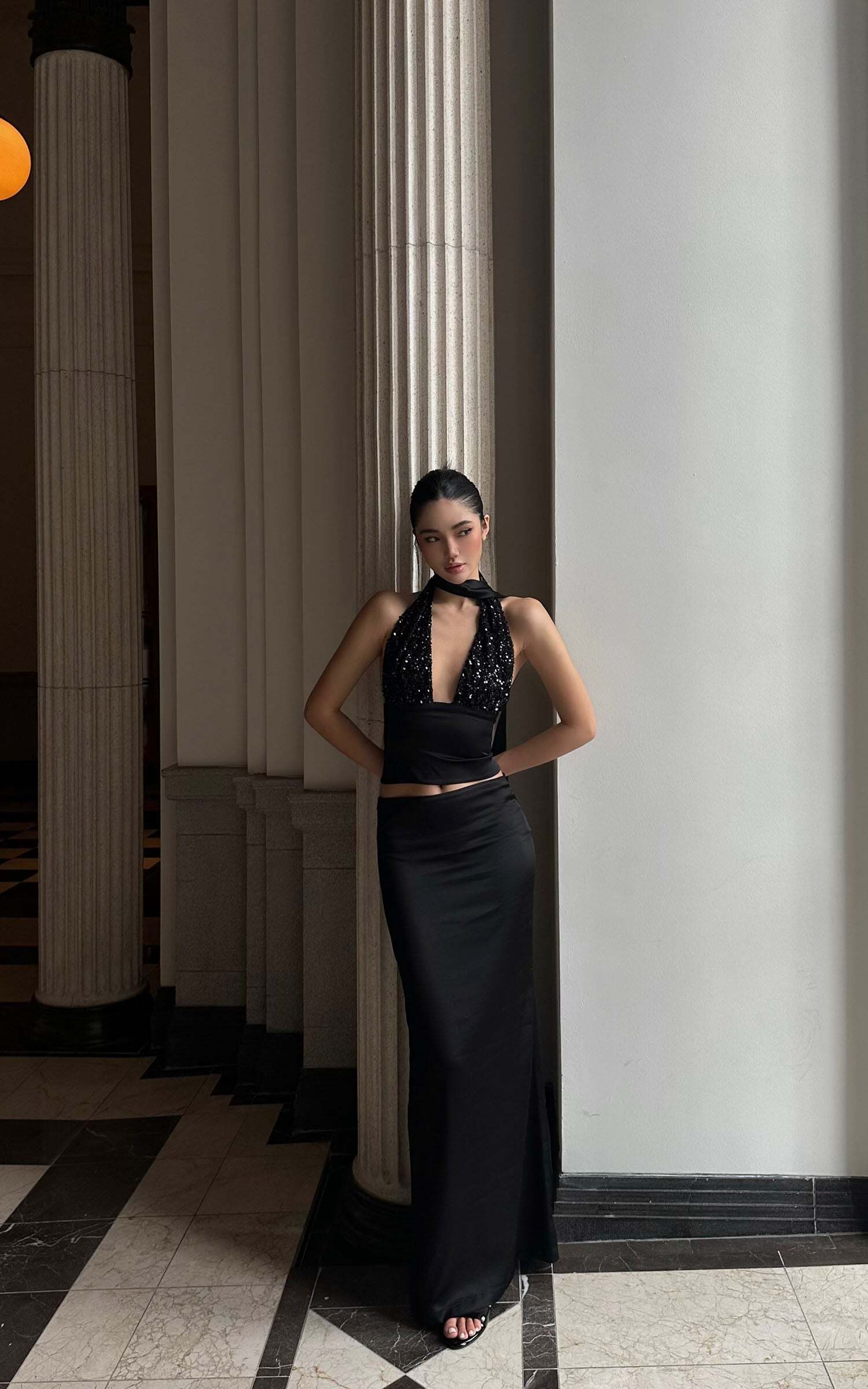 Designed to dazzle — this halter corset top fuses sharp sensuality with high-glam shine. A plunging V-neck is covered in jet-black sequins, catching the light with every breath. The sculpted waist is cinched for a corset-like effect, while the exaggerated necktie wraps and drapes, adding a bold finish. The open back, complete with hook fastenings, turns every exit into a statement.