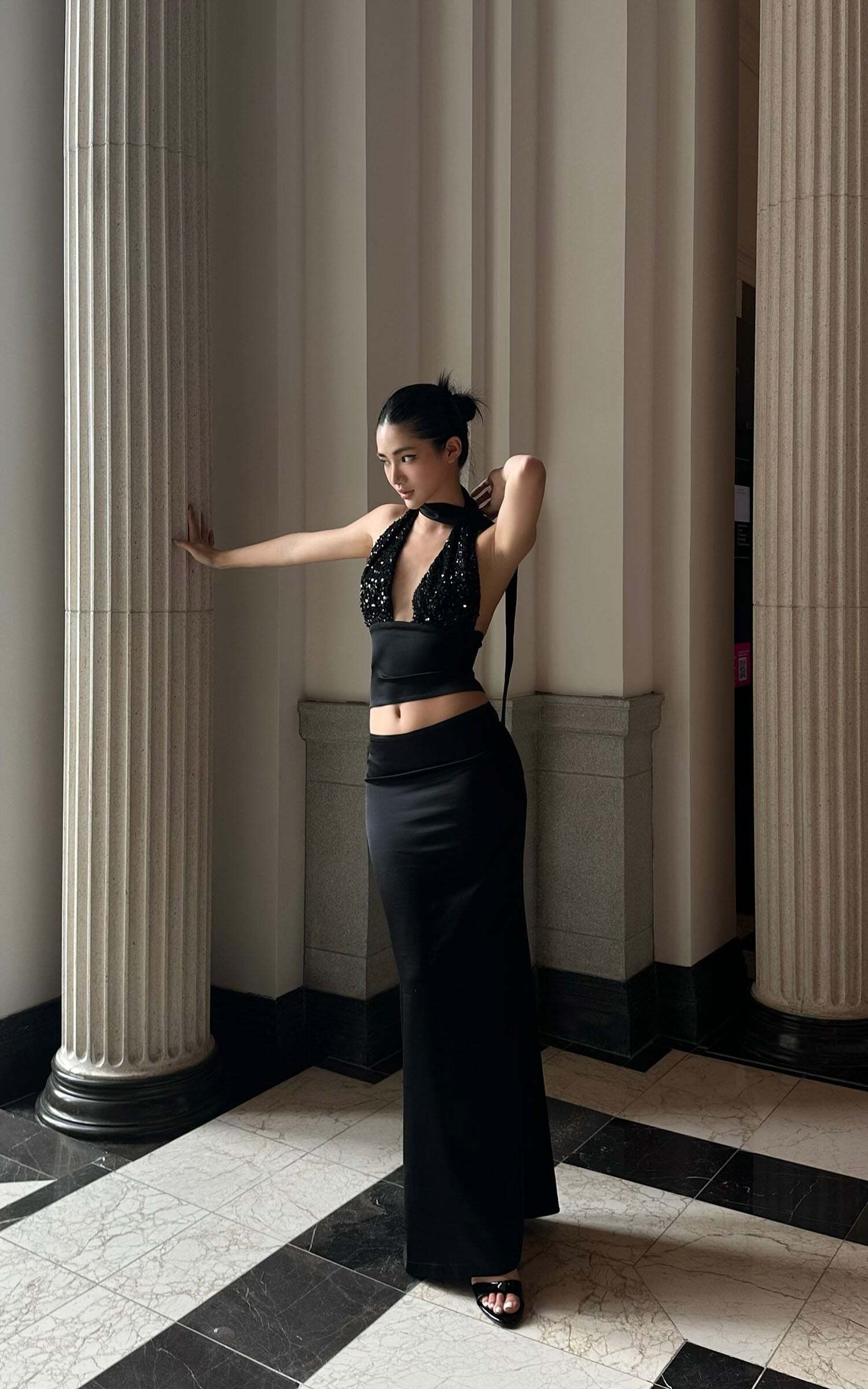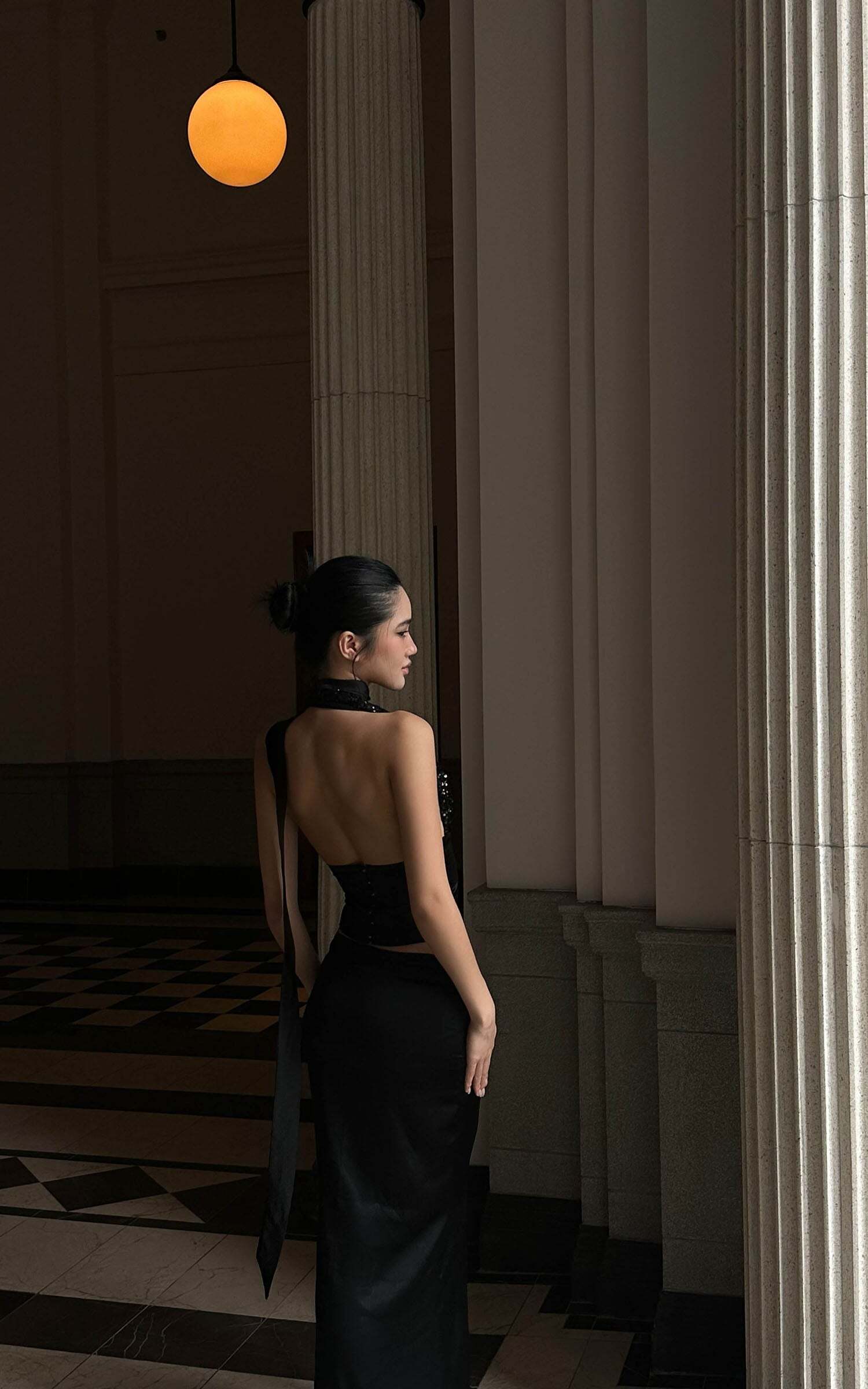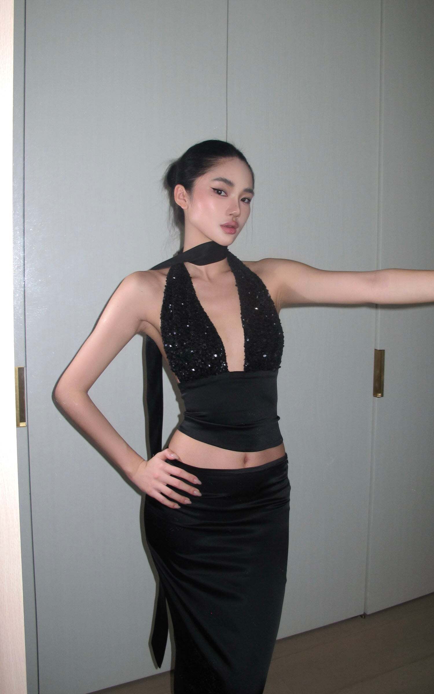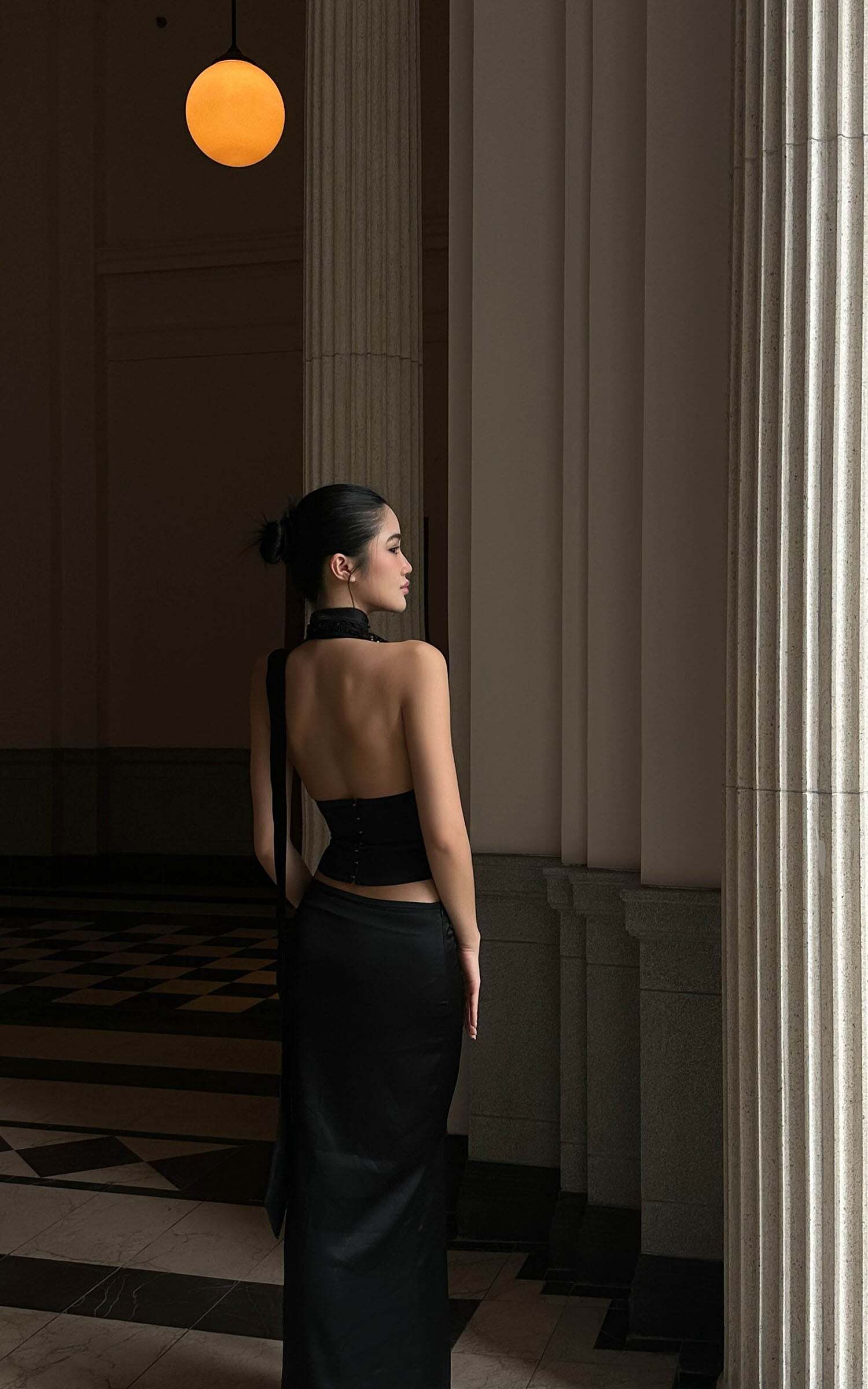 Designed to dazzle — this halter corset top fuses sharp sensuality with high-glam shine. A plunging V-neck is covered in jet-black sequins, catching the light with every breath. The sculpted waist is cinched for a corset-like effect, while the exaggerated necktie wraps and drapes, adding a bold finish. The open back, complete with hook fastenings, turns every exit into a statement.