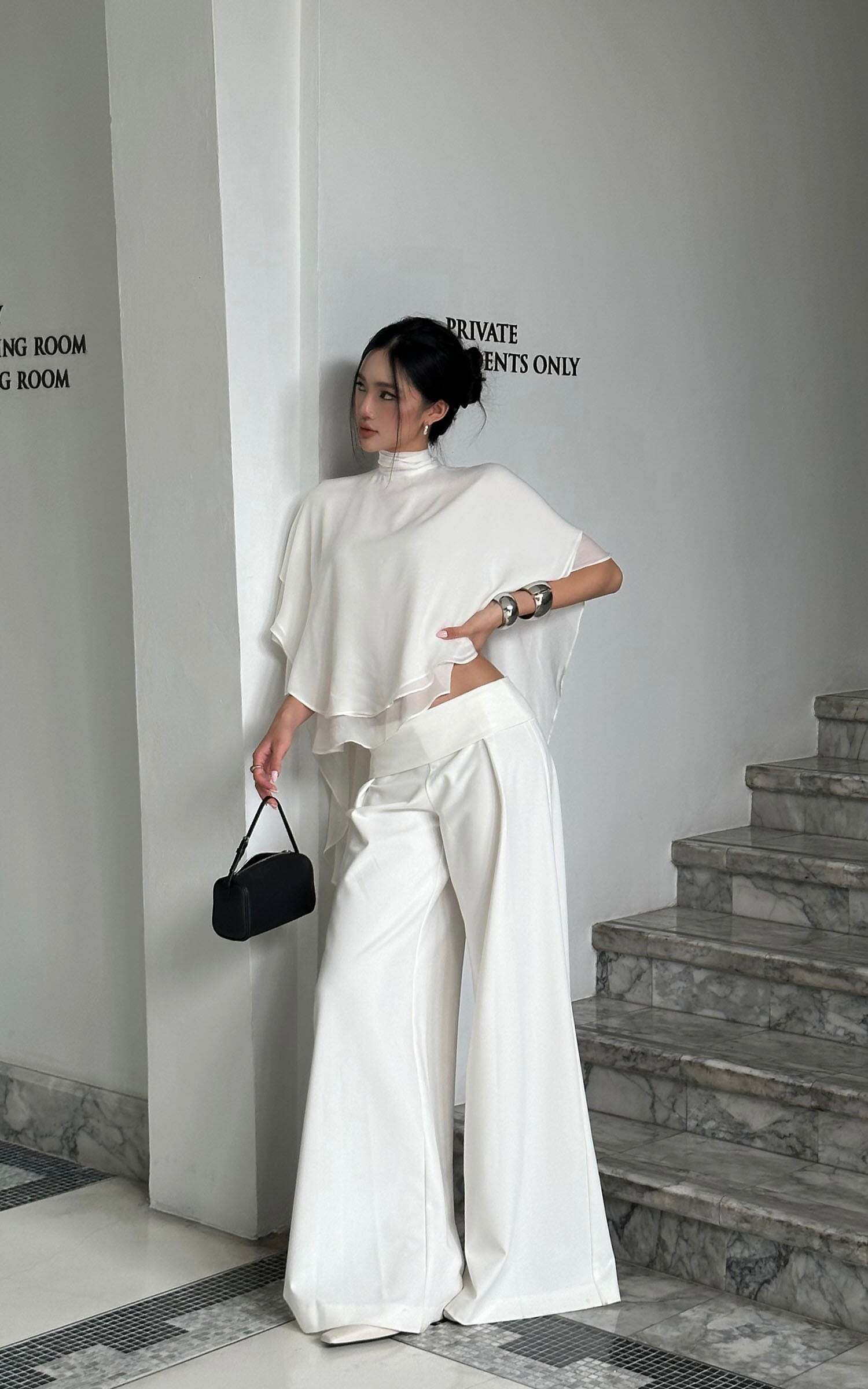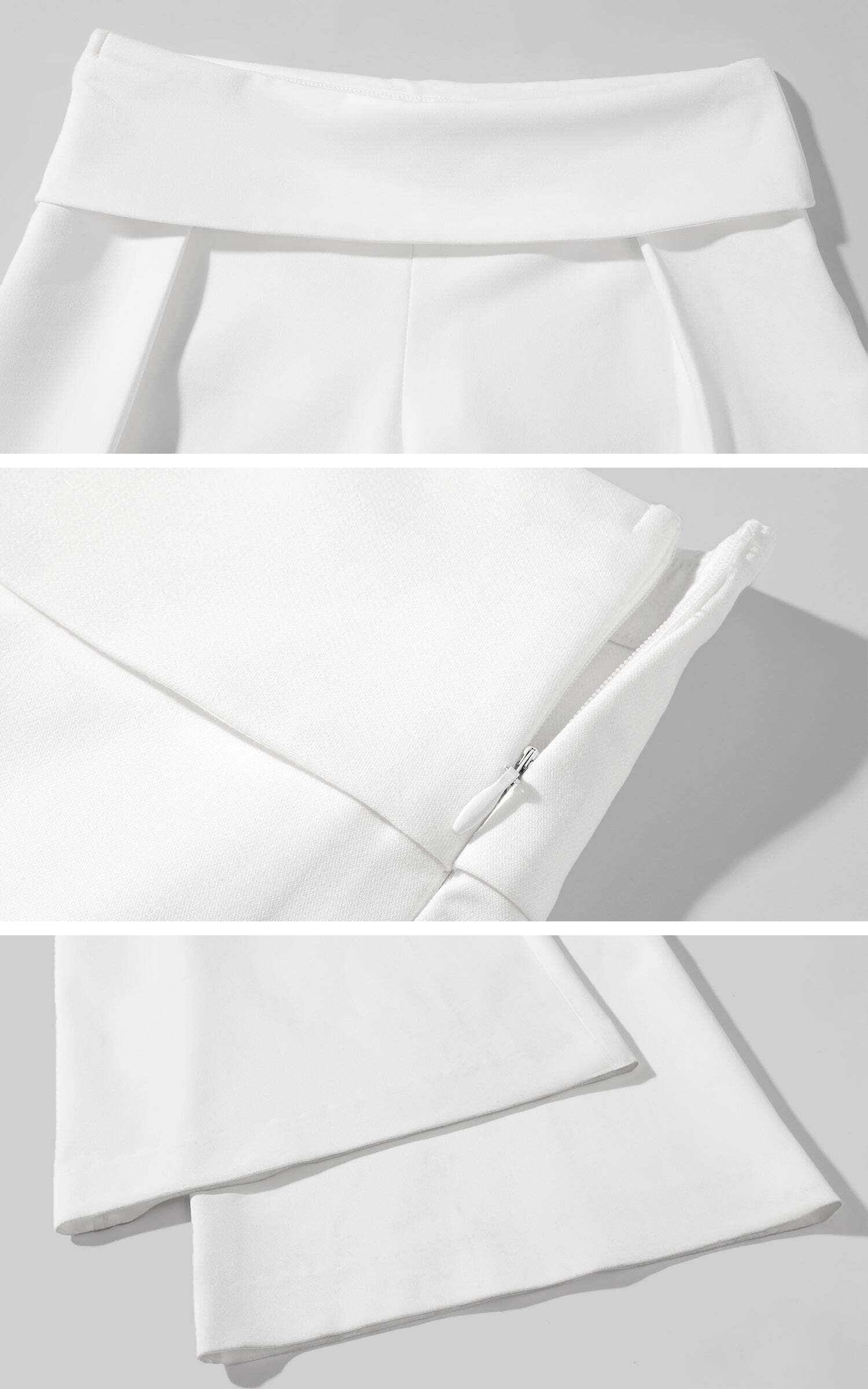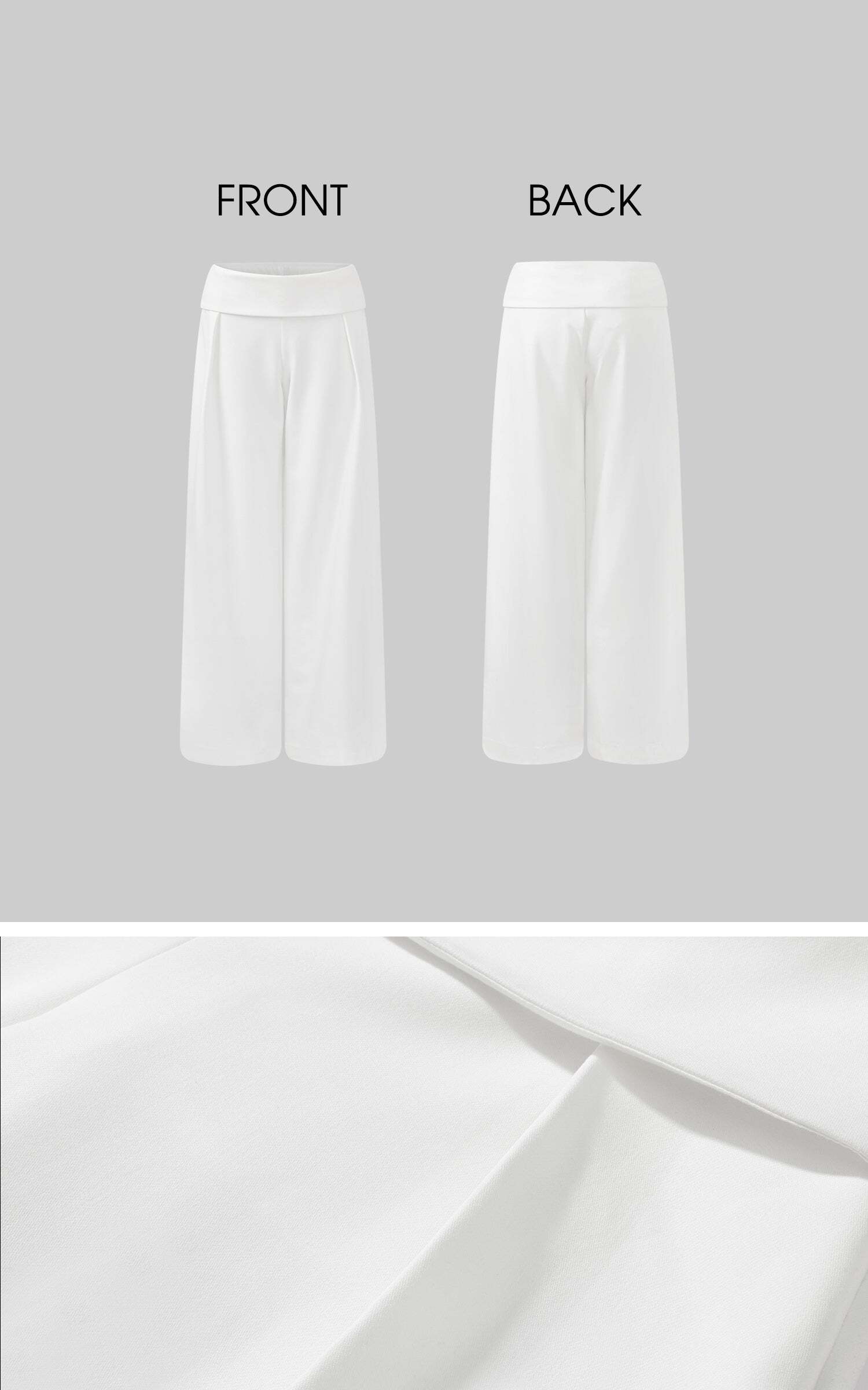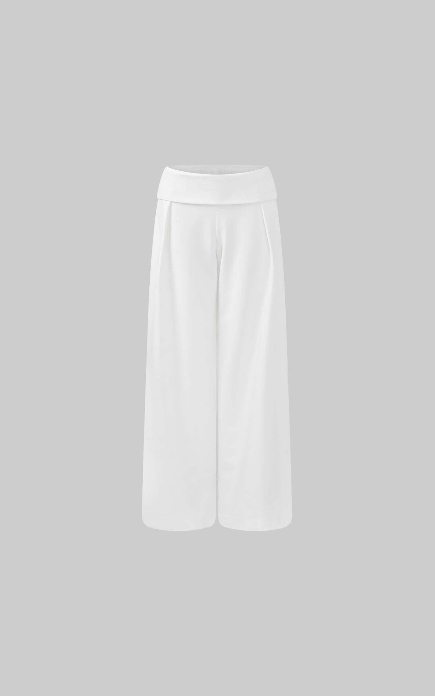 Tailored with a clean, sculptural silhouette, these wide-leg trousers sit high on the waist with a smooth, folded-over band that flatters and elongates the torso. The structured fabric drapes fluidly, holding its shape without stiffness. A concealed side zip ensures a seamless finish. Pair with airy tops or sharp blazers to channel understated boldness.
