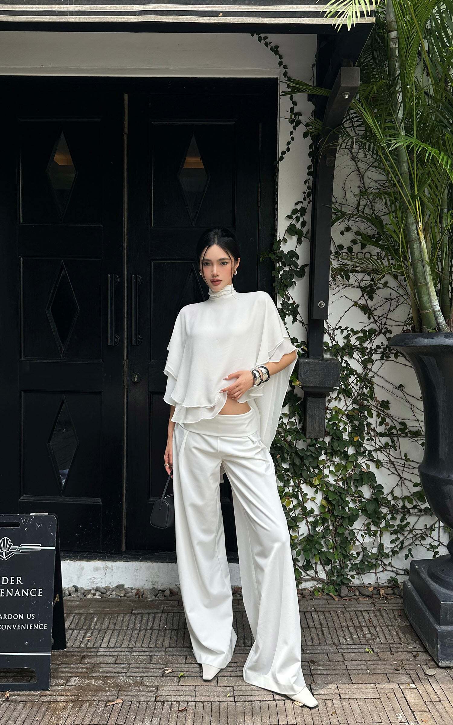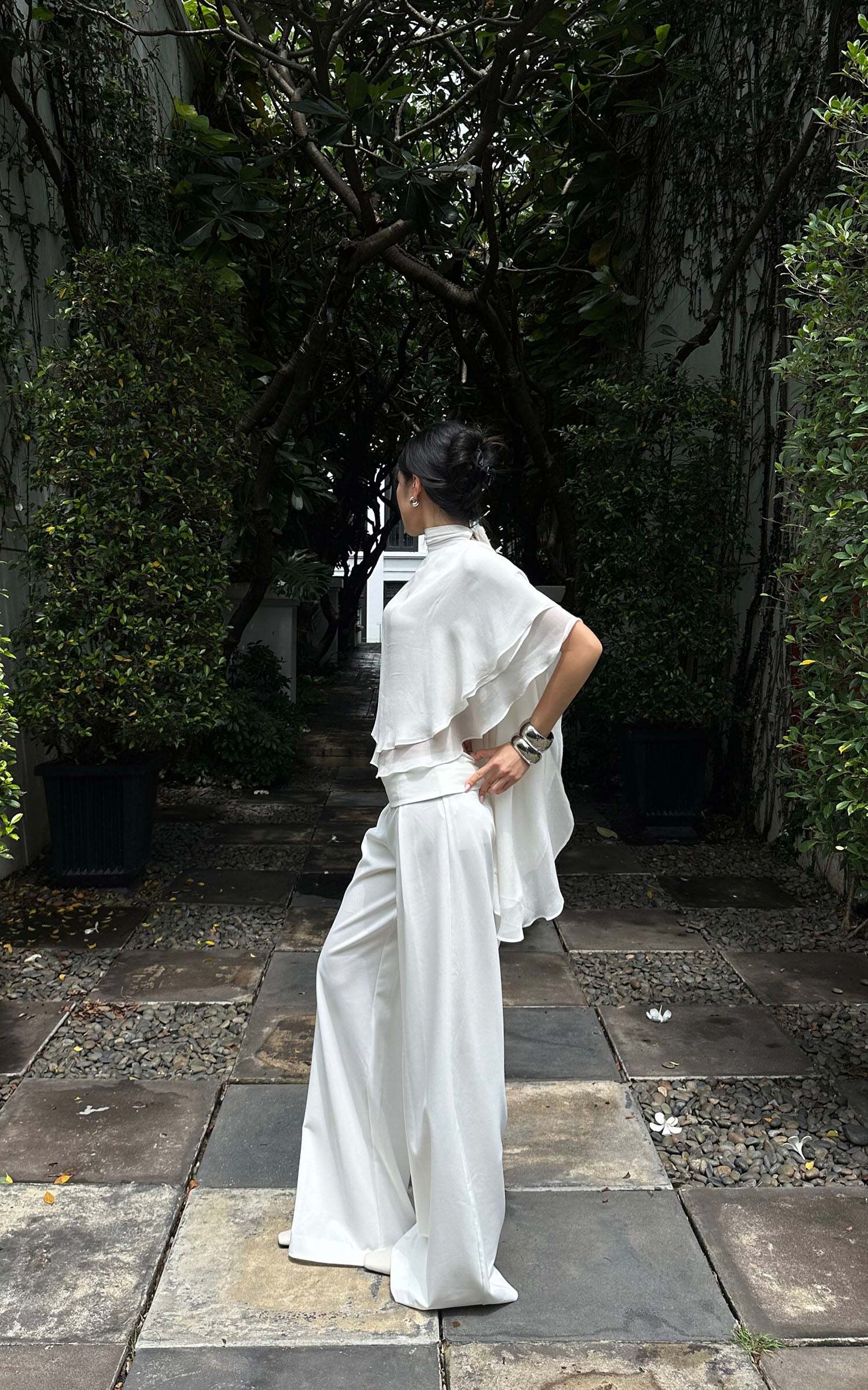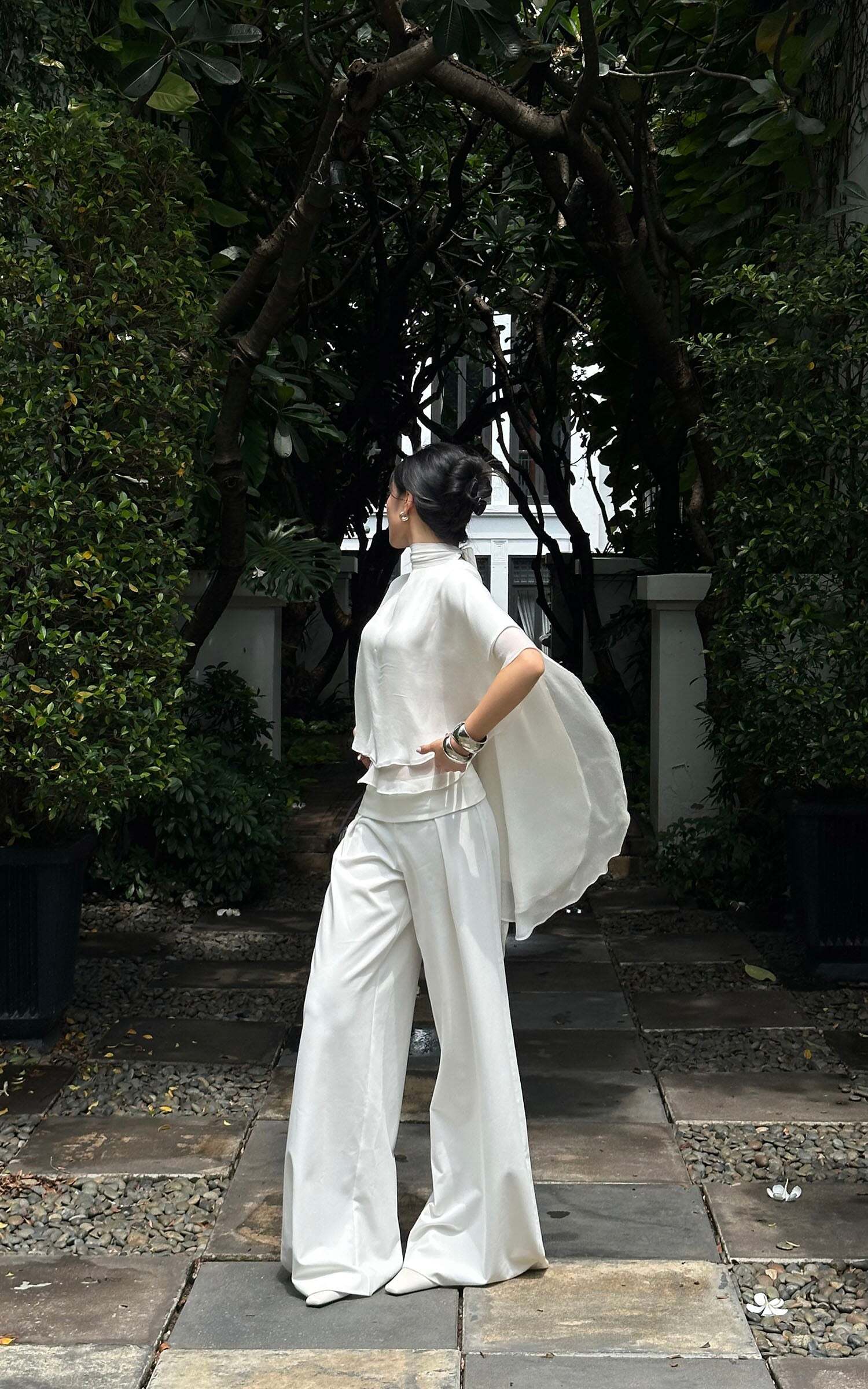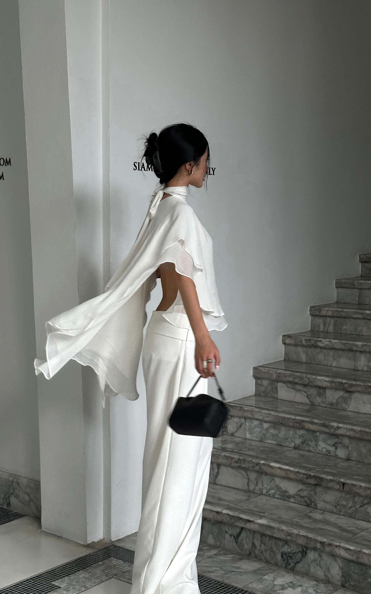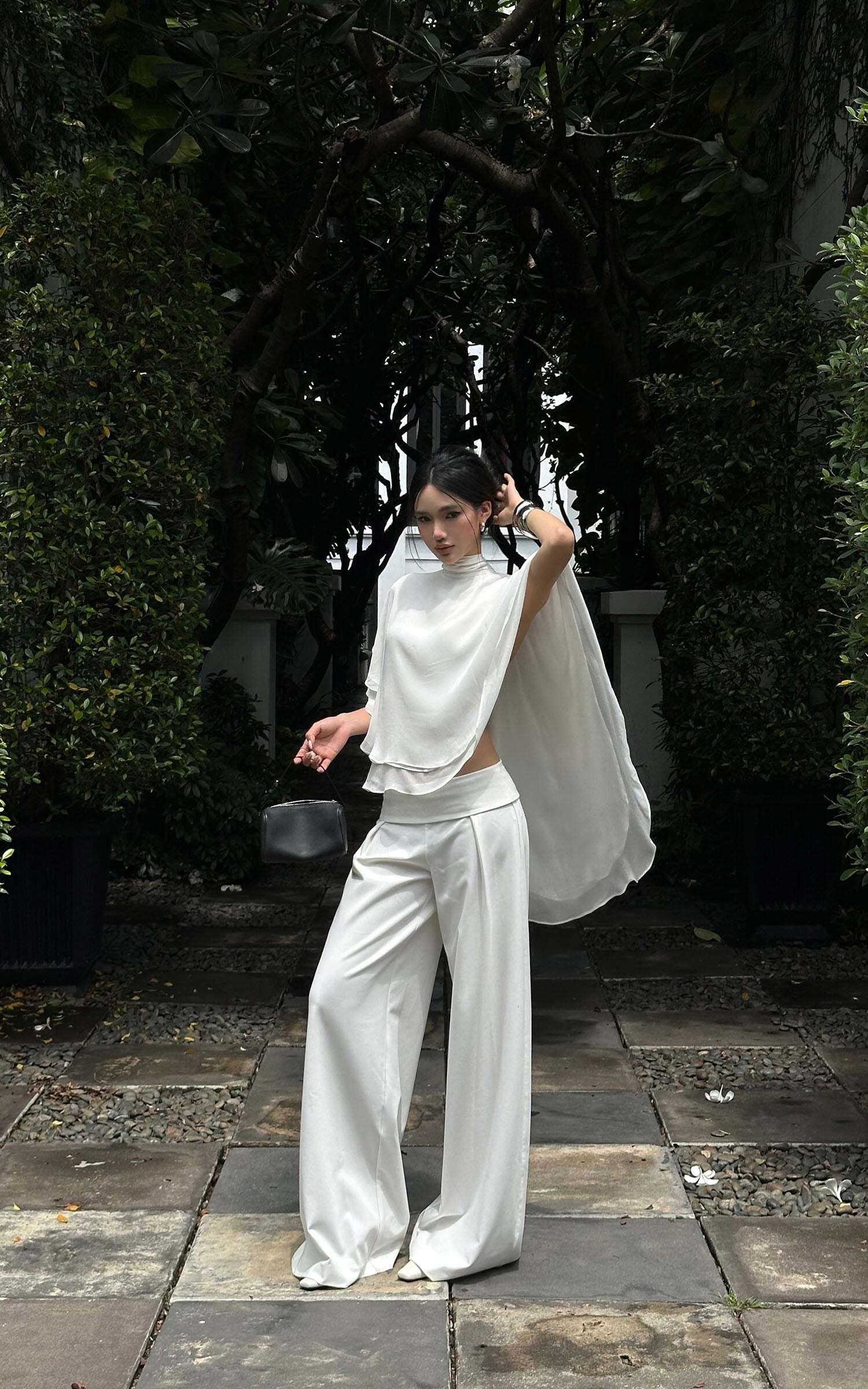 Tailored with a clean, sculptural silhouette, these wide-leg trousers sit high on the waist with a smooth, folded-over band that flatters and elongates the torso. The structured fabric drapes fluidly, holding its shape without stiffness. A concealed side zip ensures a seamless finish. Pair with airy tops or sharp blazers to channel understated boldness.