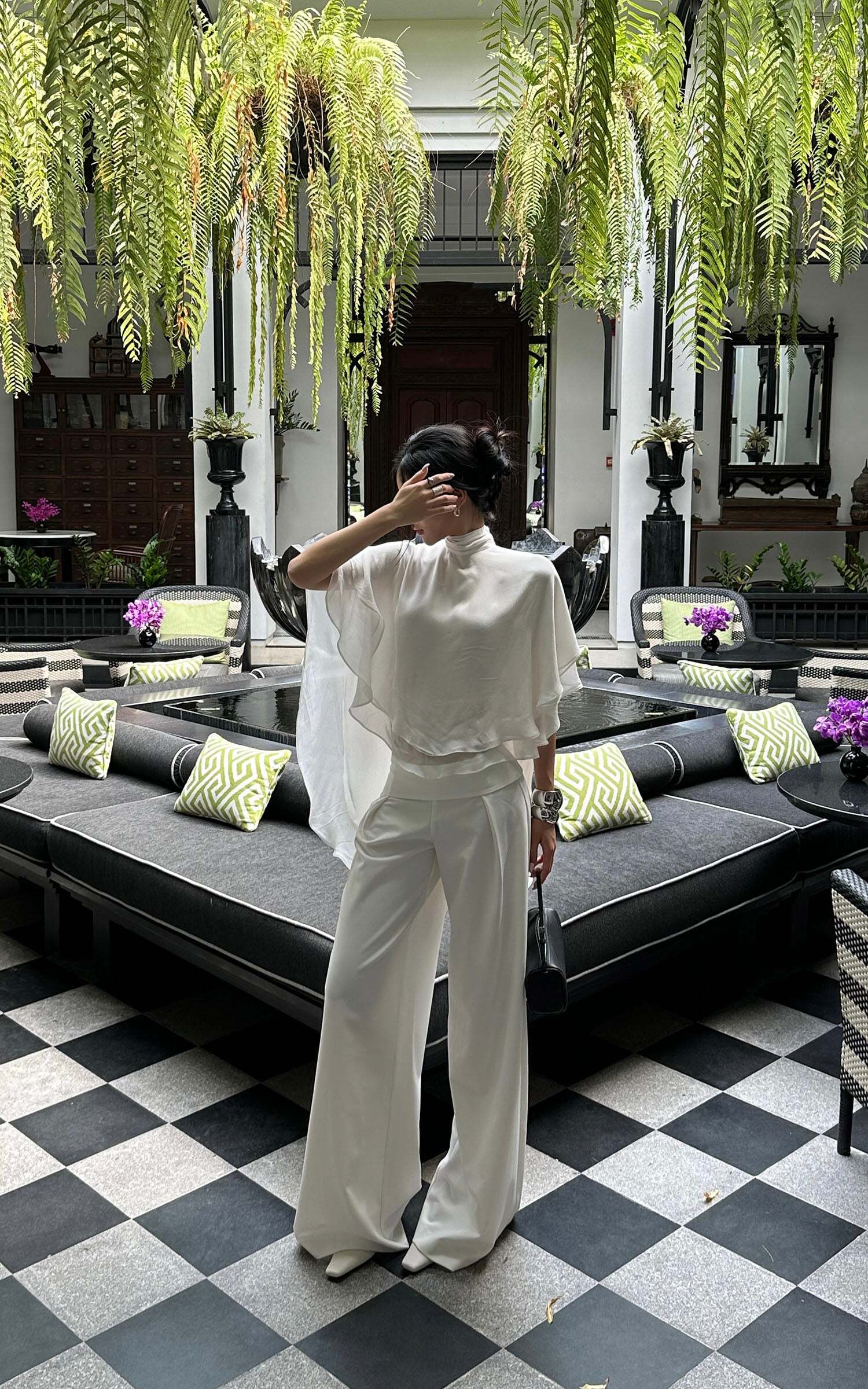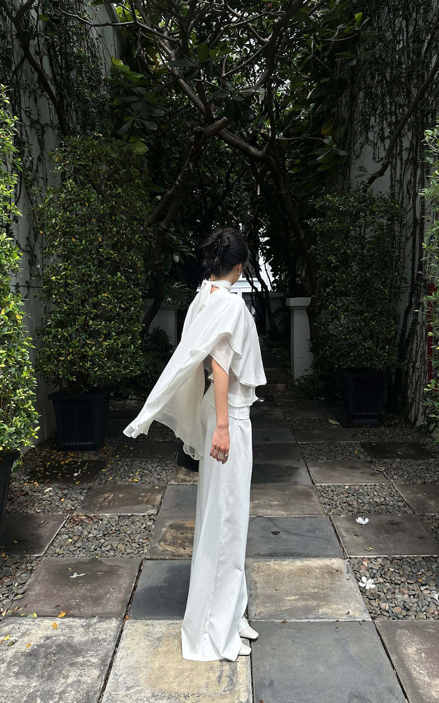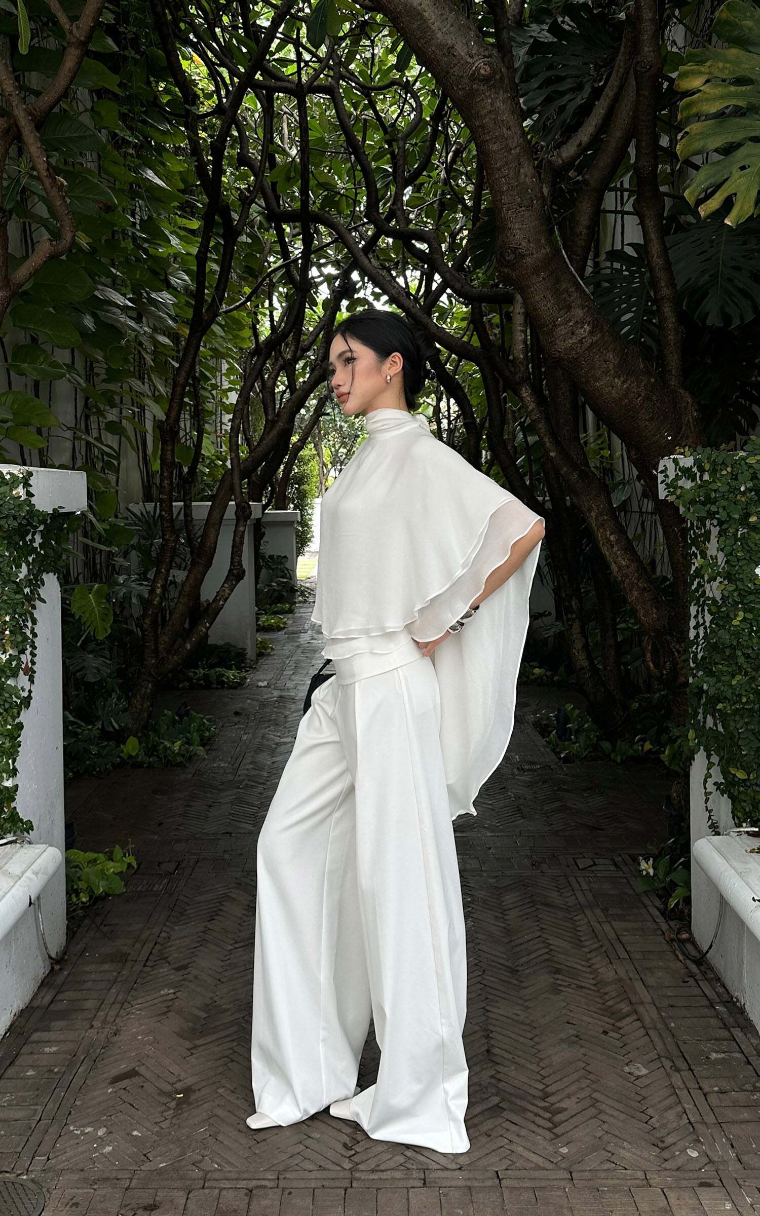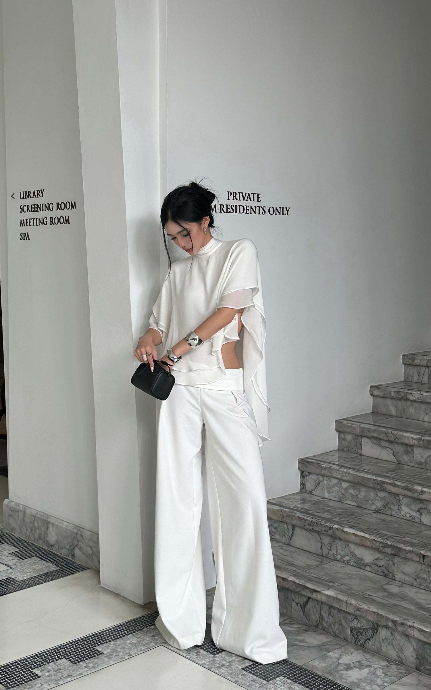 Tailored with a clean, sculptural silhouette, these wide-leg trousers sit high on the waist with a smooth, folded-over band that flatters and elongates the torso. The structured fabric drapes fluidly, holding its shape without stiffness. A concealed side zip ensures a seamless finish. Pair with airy tops or sharp blazers to channel understated boldness.
