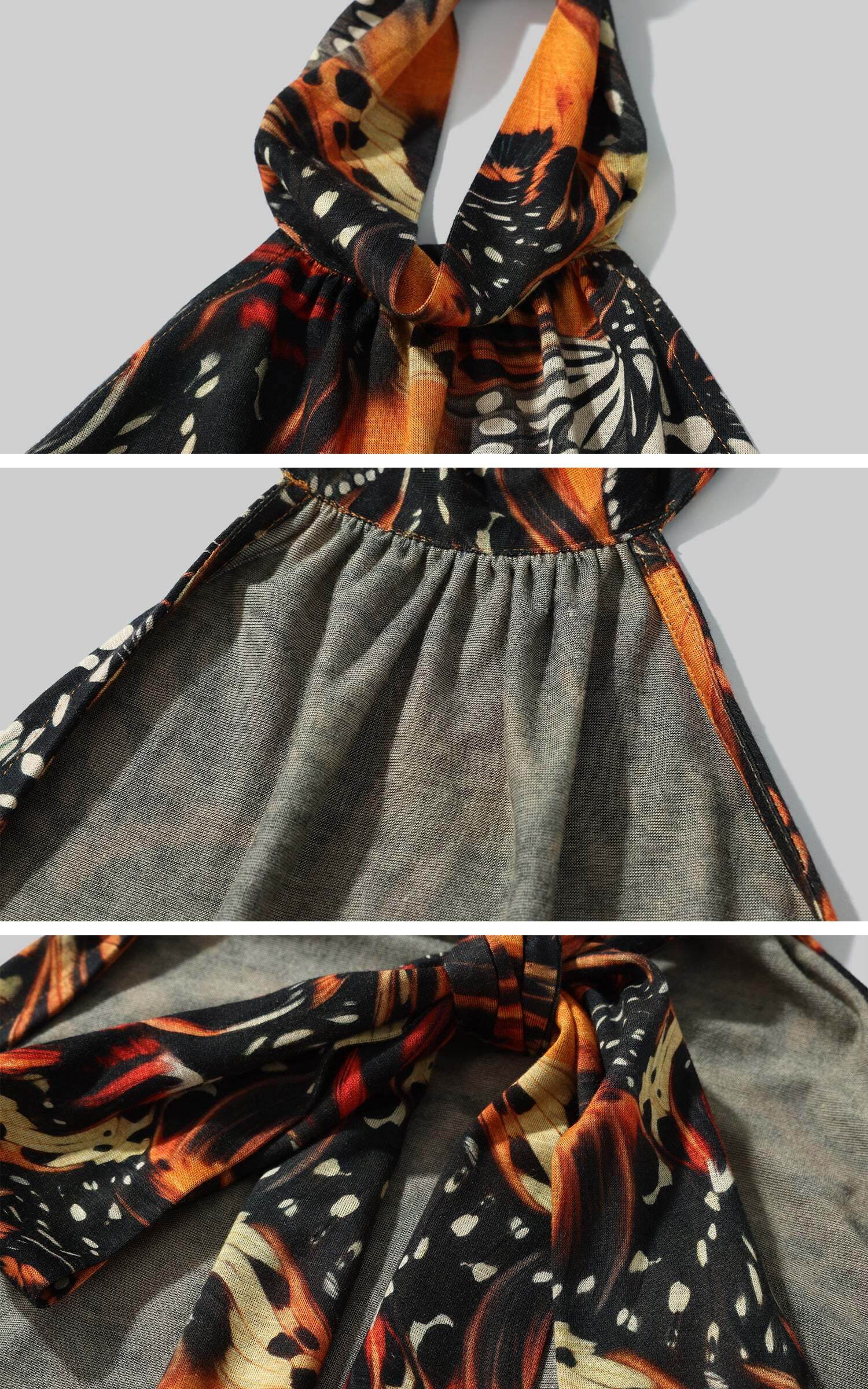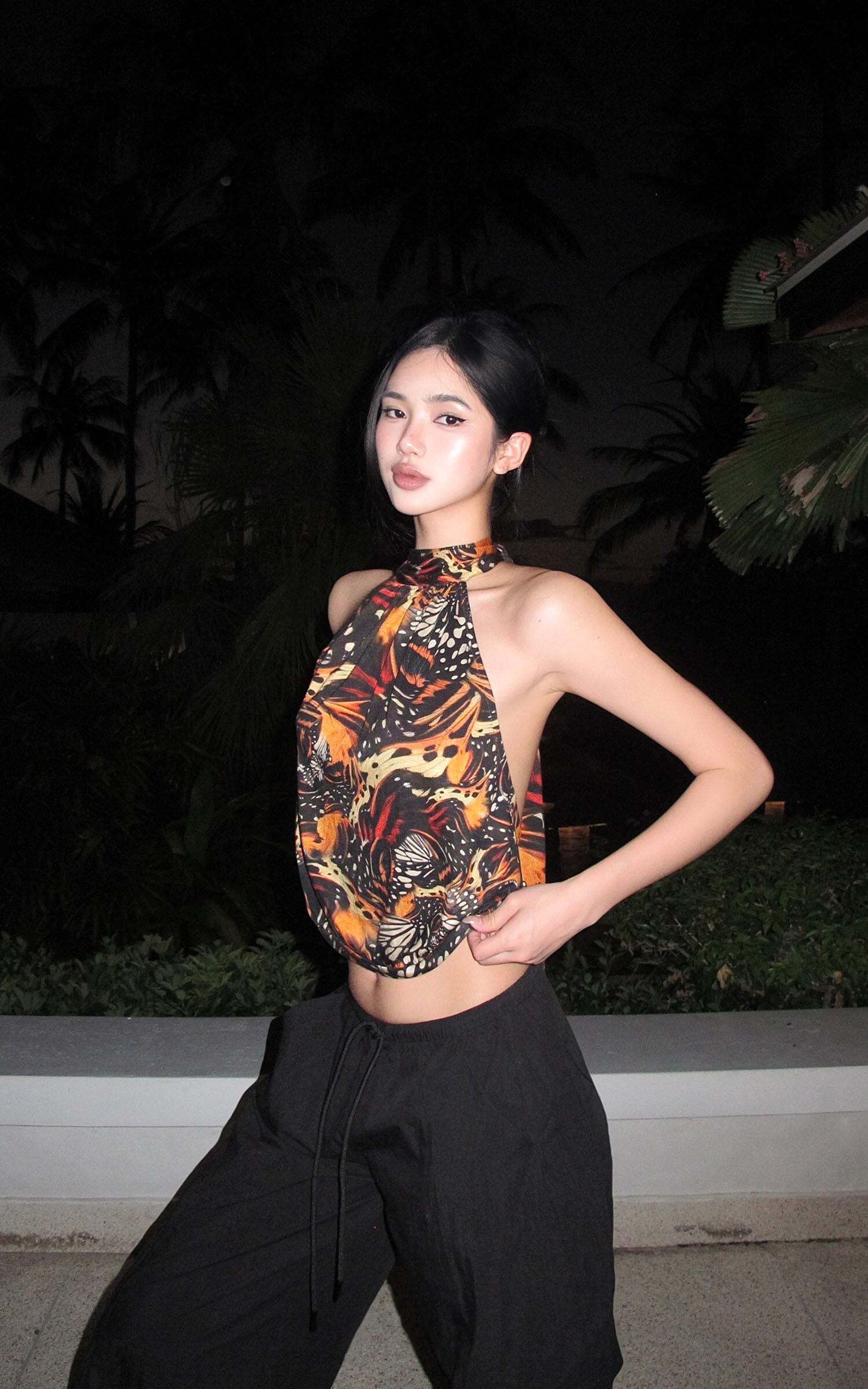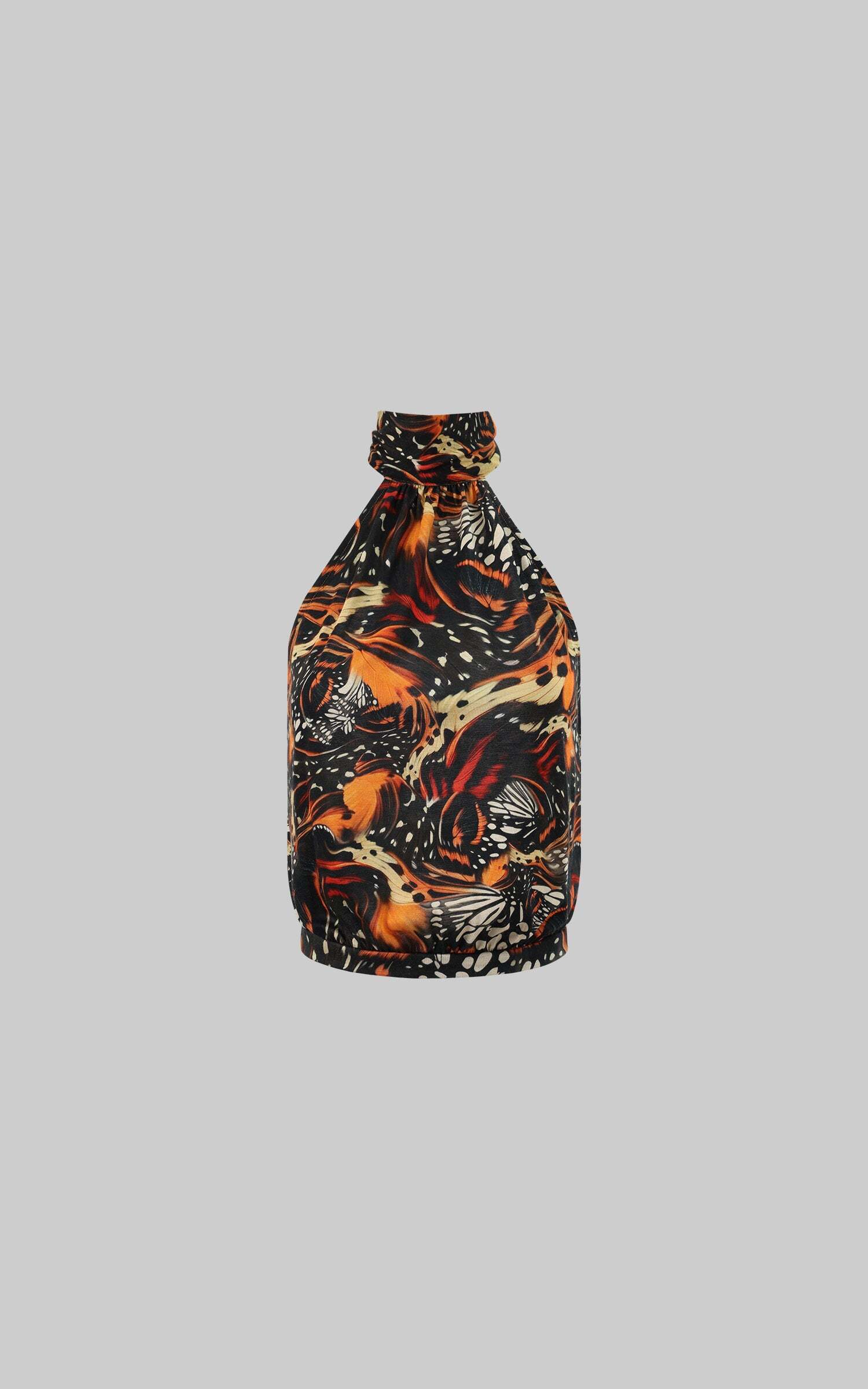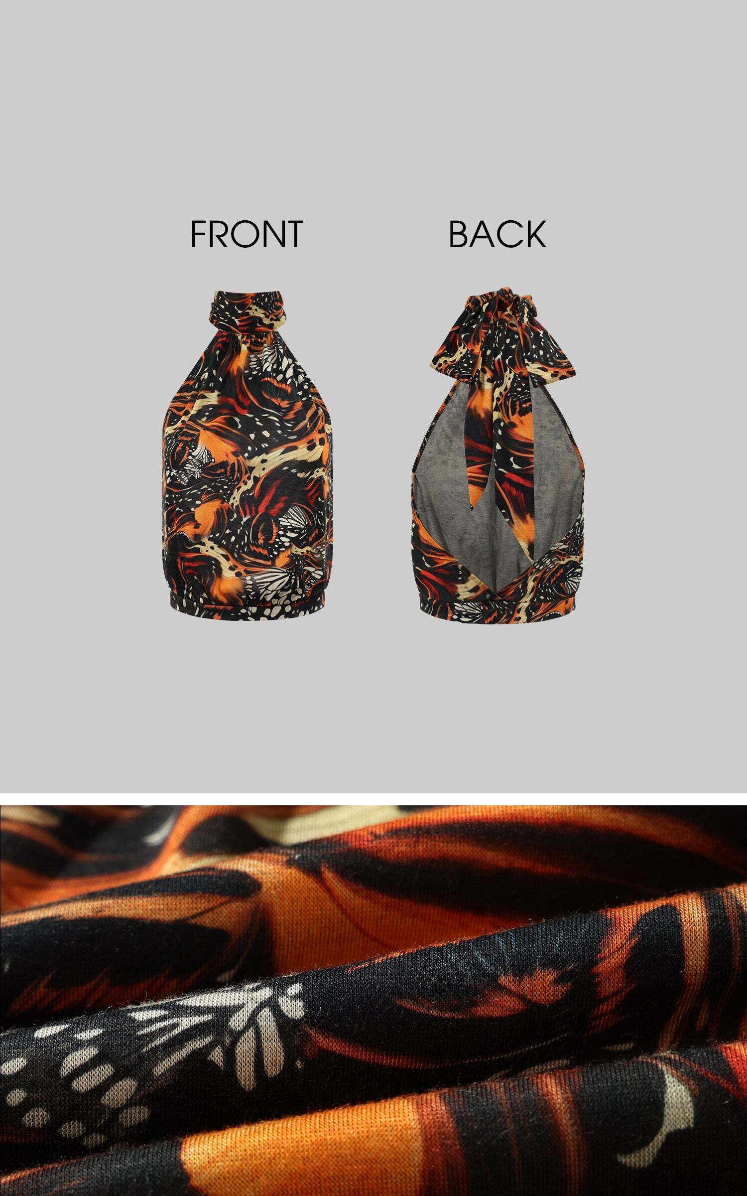 A statement piece born for twilight escapes. This halter top features an intoxicating swirl of fiery orange, obsidian black, and creamy beige in a butterfly-inspired print that’s equal parts wild and hypnotic. The dramatic draped silhouette flatters your form with a barely-there open back and long trailing ties that knot elegantly behind the neck and waist.Crafted from soft stretch jersey, this piece moves like second skin. Style it with oversized black cargos or a floor-grazing skirt—whether you’re chasing the sunset or turning heads after dark, it’s made for magnetic energy.