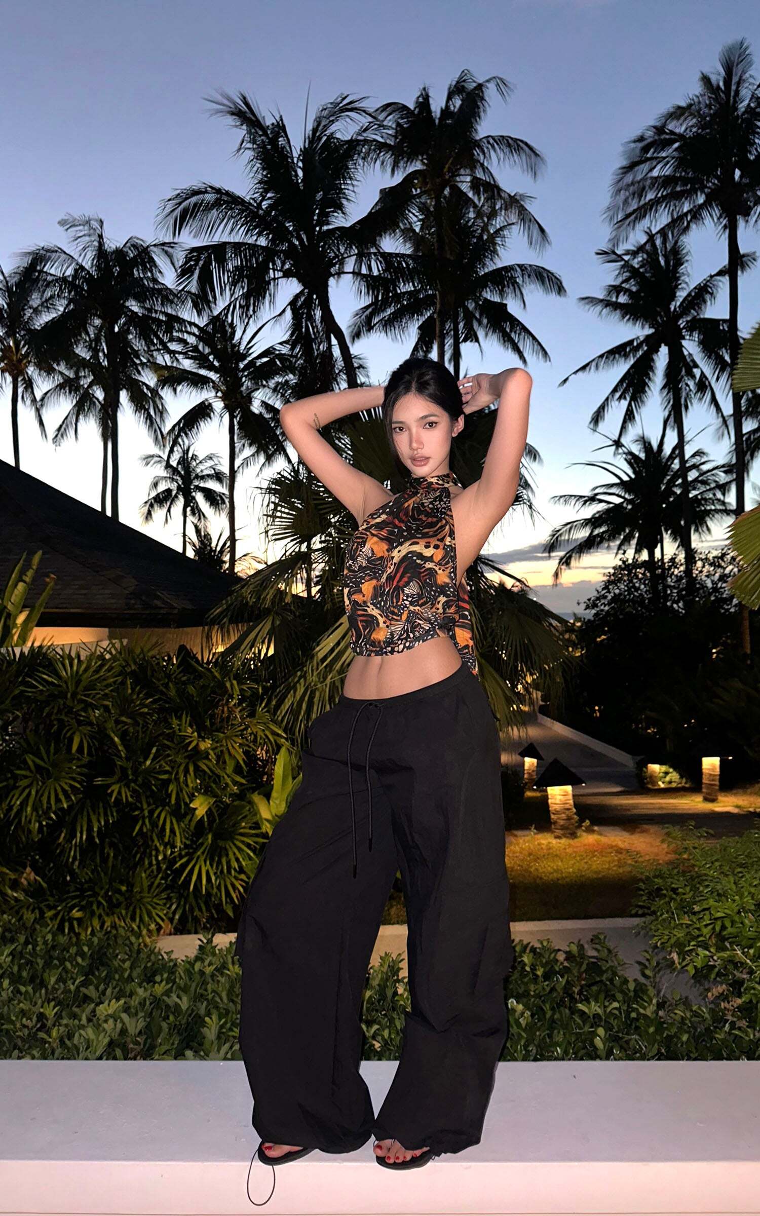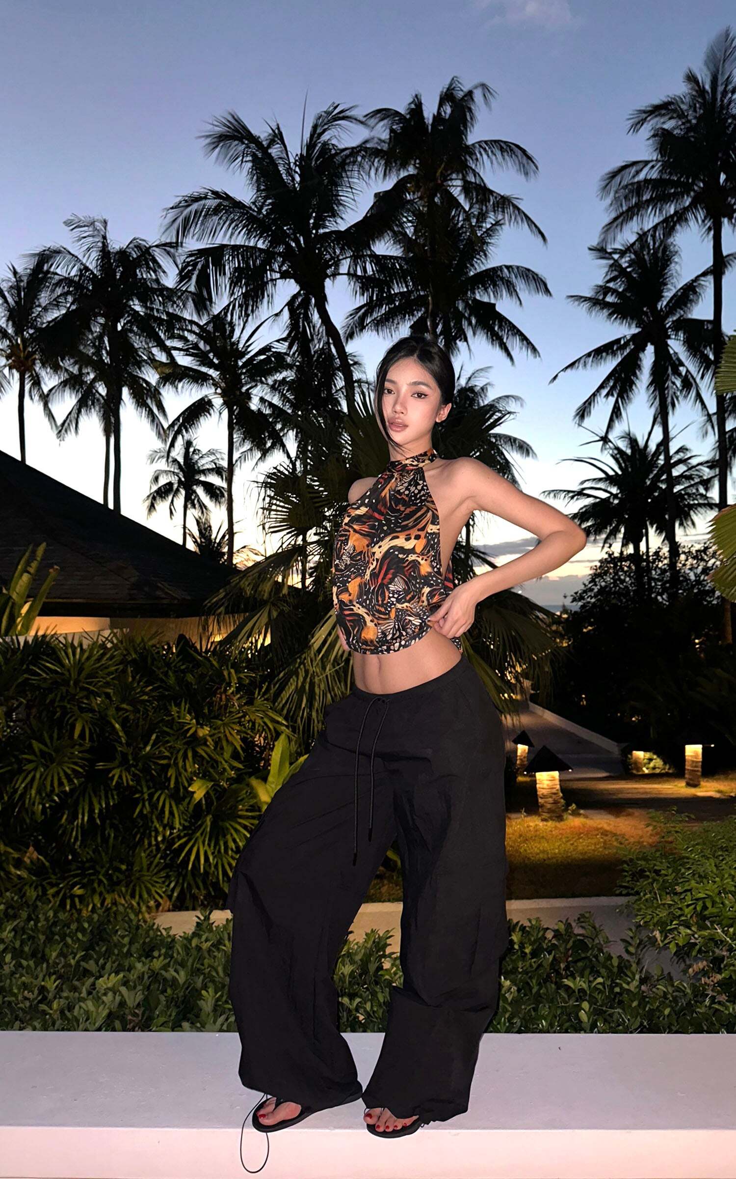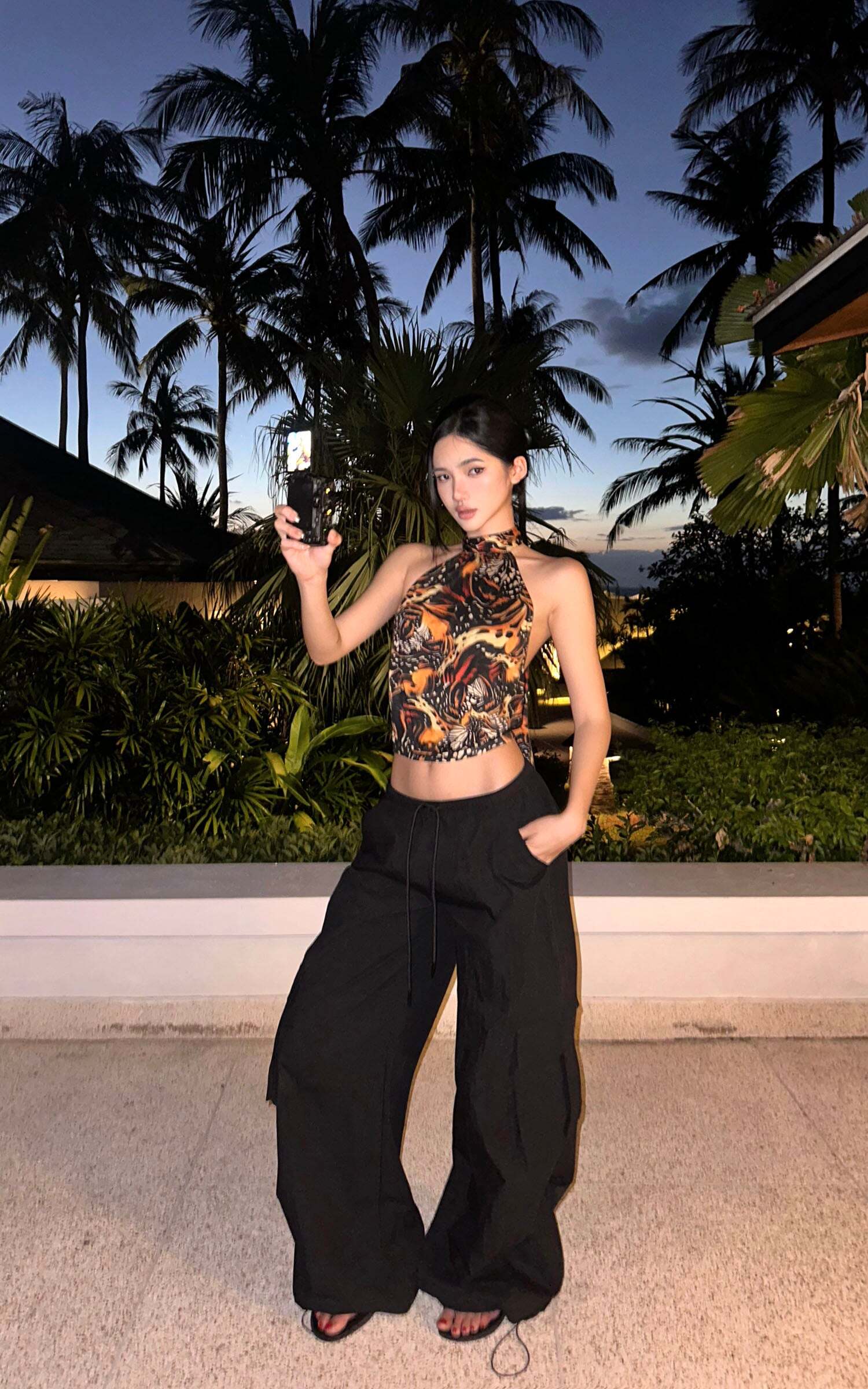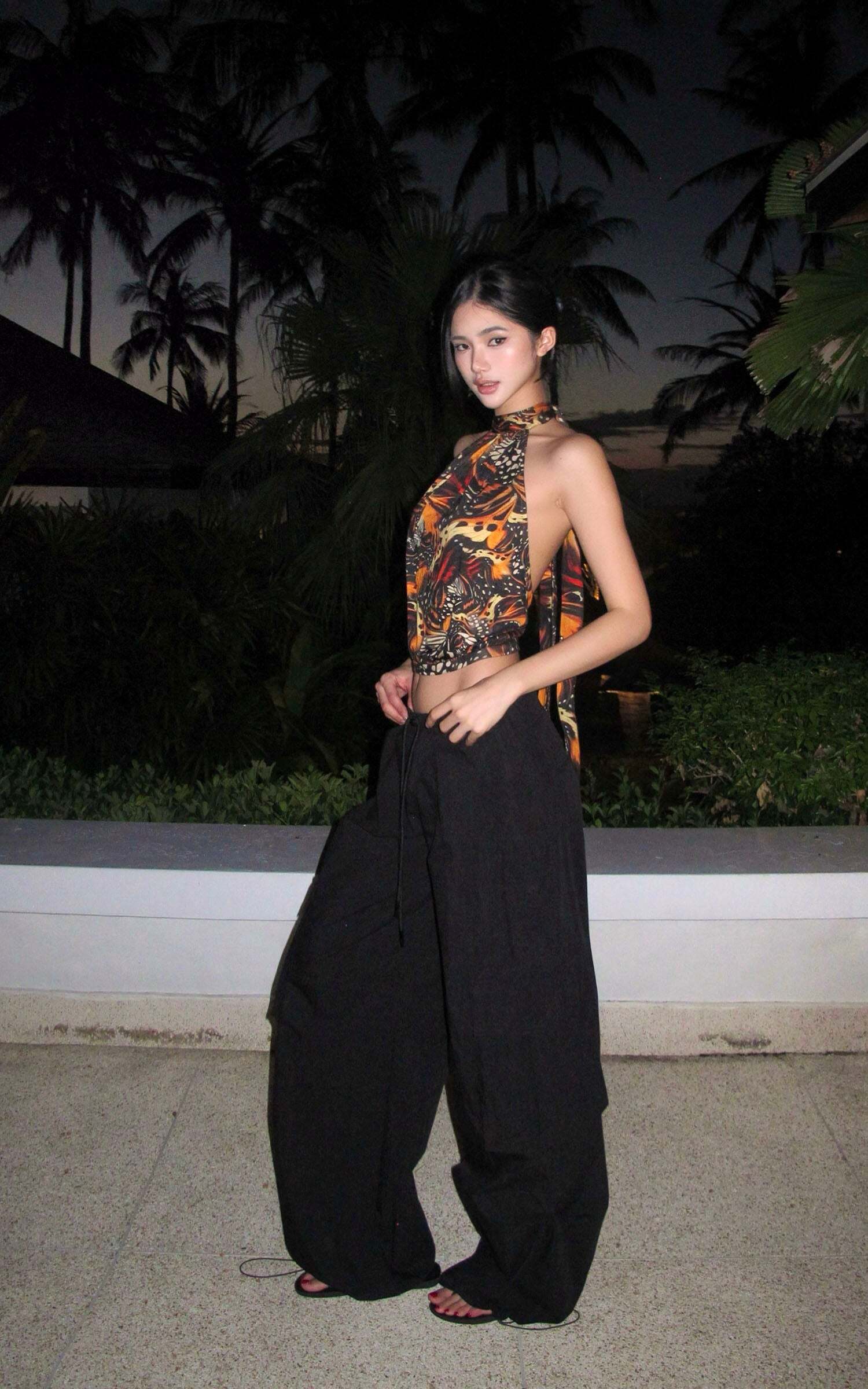 A statement piece born for twilight escapes. This halter top features an intoxicating swirl of fiery orange, obsidian black, and creamy beige in a butterfly-inspired print that’s equal parts wild and hypnotic. The dramatic draped silhouette flatters your form with a barely-there open back and long trailing ties that knot elegantly behind the neck and waist.Crafted from soft stretch jersey, this piece moves like second skin. Style it with oversized black cargos or a floor-grazing skirt—whether you’re chasing the sunset or turning heads after dark, it’s made for magnetic energy.