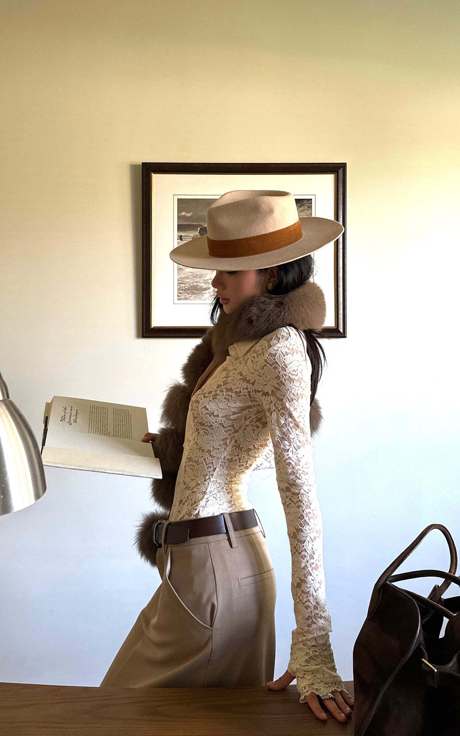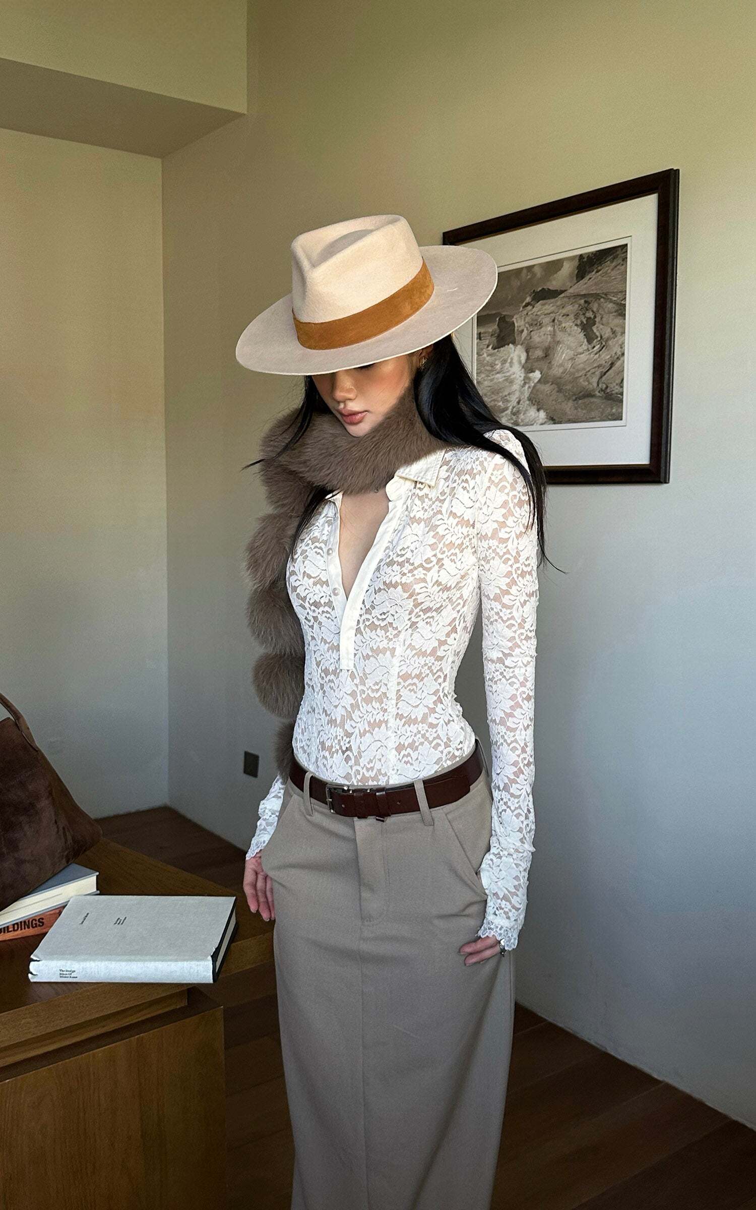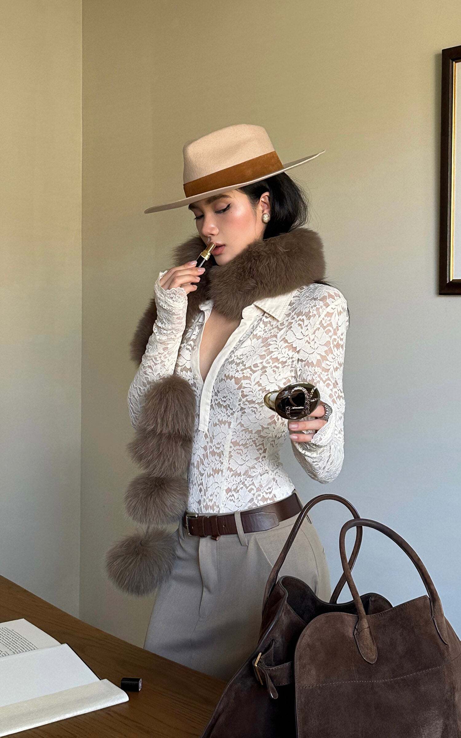 A fitted lace shirt with sheer floral textures, collared neckline, and button-down detail. Its slim silhouette and delicate transparency create a balance of sensuality and sophistication. Style it with tailored trousers for a sharp contrast, or wear it with flowing skirts for a modern romantic mood.