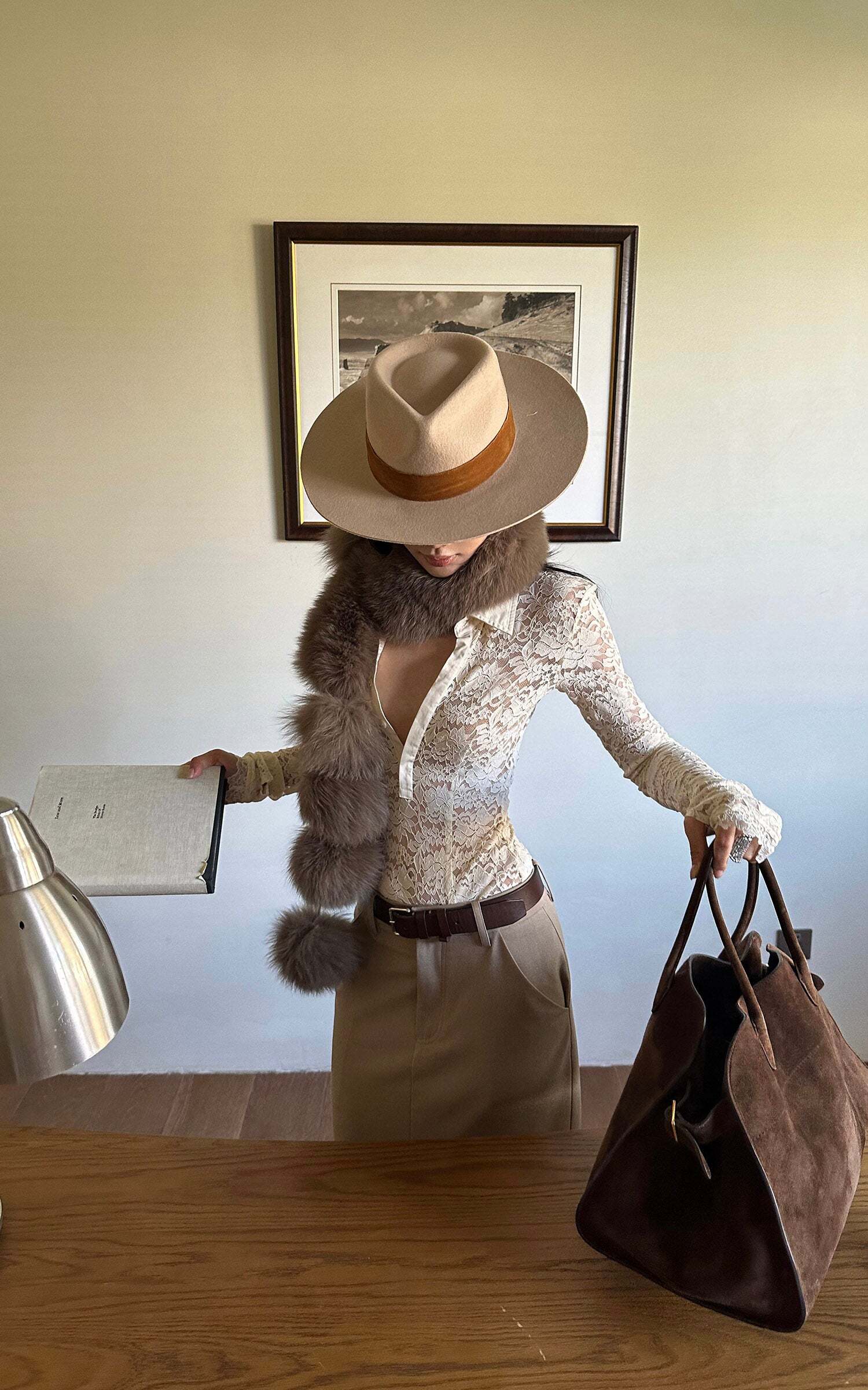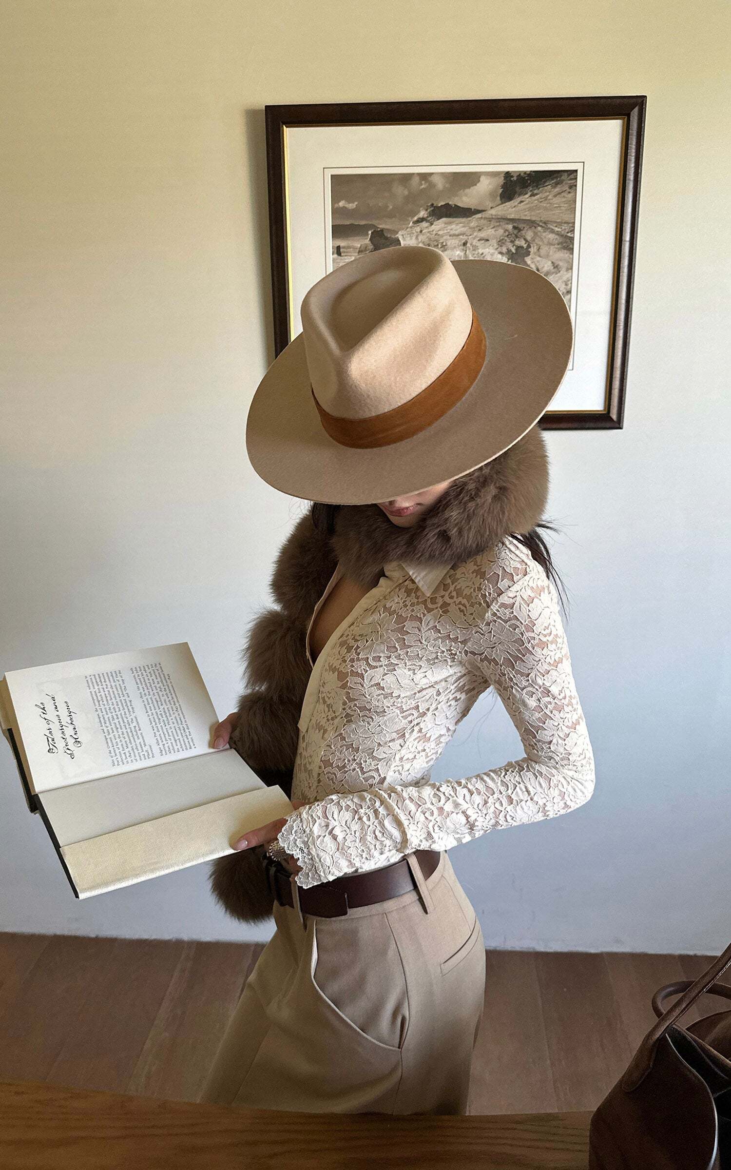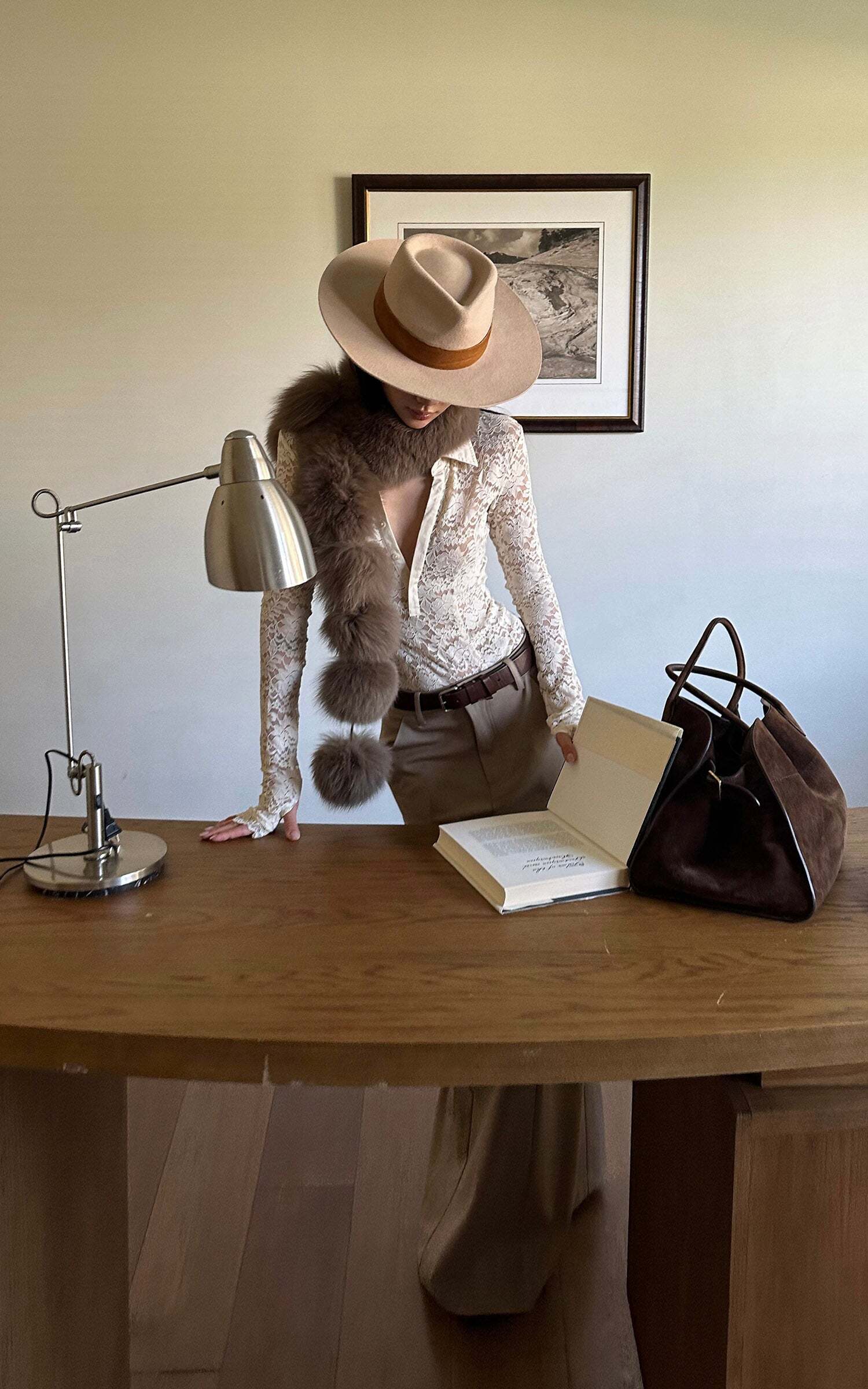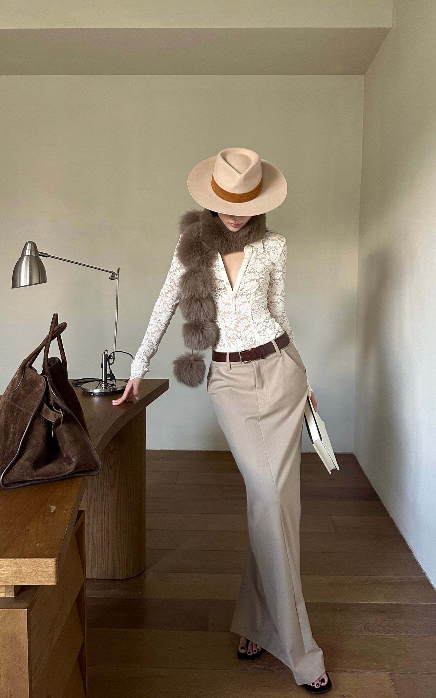 A fitted lace shirt with sheer floral textures, collared neckline, and button-down detail. Its slim silhouette and delicate transparency create a balance of sensuality and sophistication. Style it with tailored trousers for a sharp contrast, or wear it with flowing skirts for a modern romantic mood.