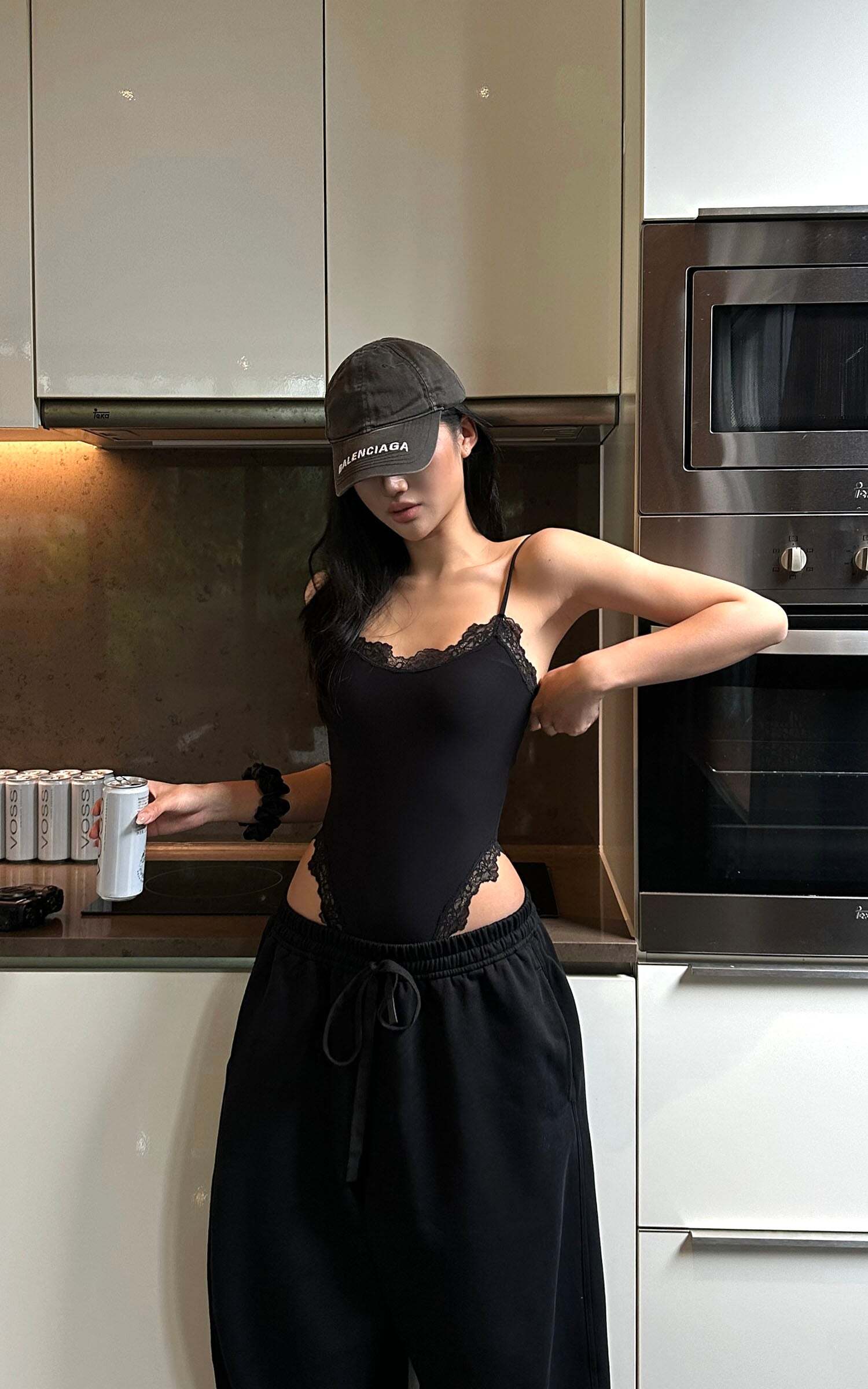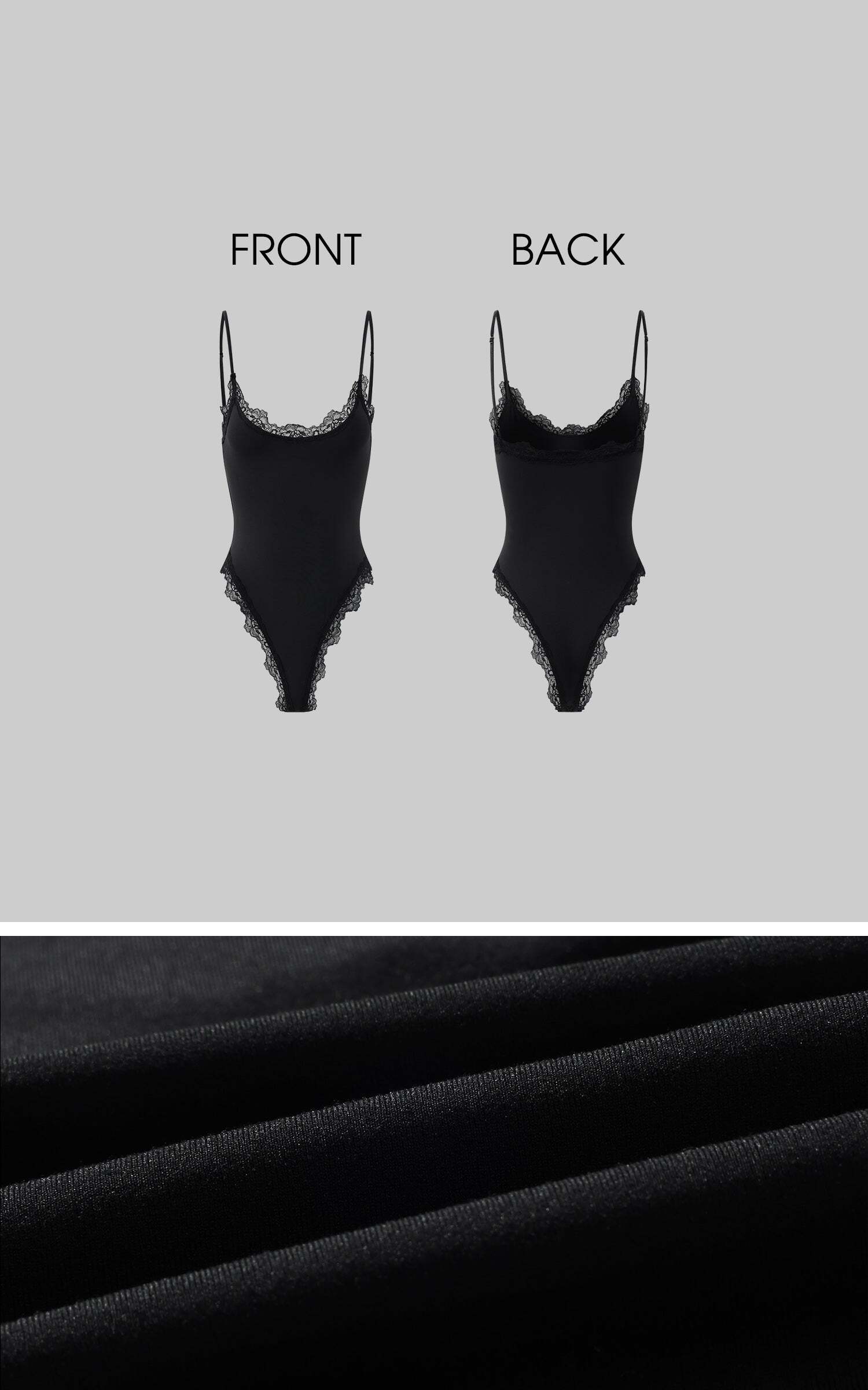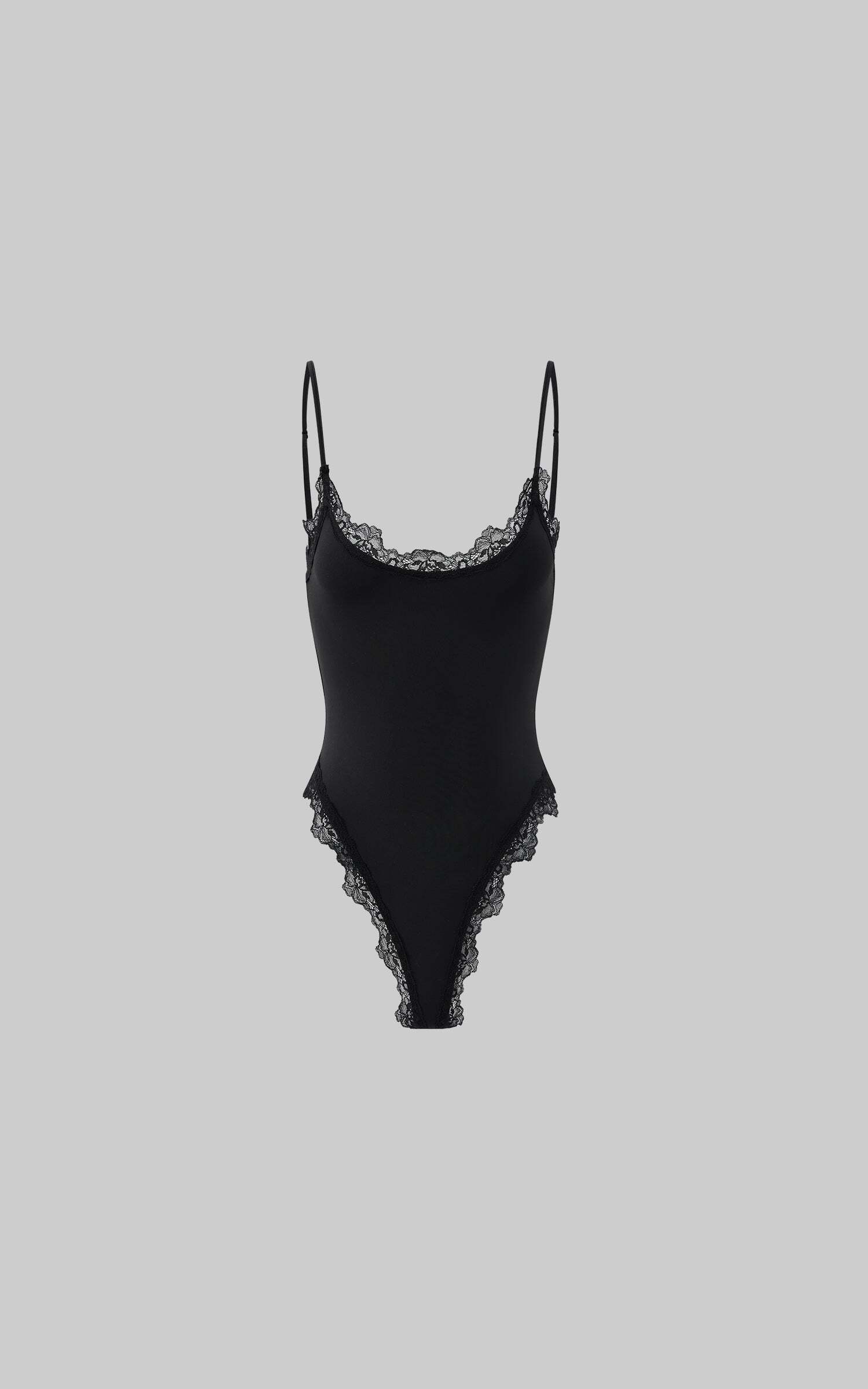 This is not your average bodysuit. Cut from a soft stretch fabric that sculpts the body like second skin, it’s finished with delicate lace trimming that dances along the neckline and high-cut leg openings. A daring side cut-out elongates the silhouette, adding heat to its clean lines. Adjustable straps and snap-button closure ensure the perfect fit from every angle.Dress it down with oversized sweatpants and a cap for off-duty attitude, or layer it under sheer layers and blazers for sultry nighttime energy. Bold yet minimal, intimate yet public—this piece exists in tension, and that’s where the magic lies.