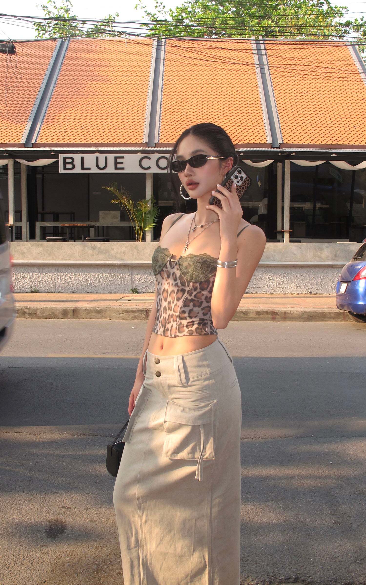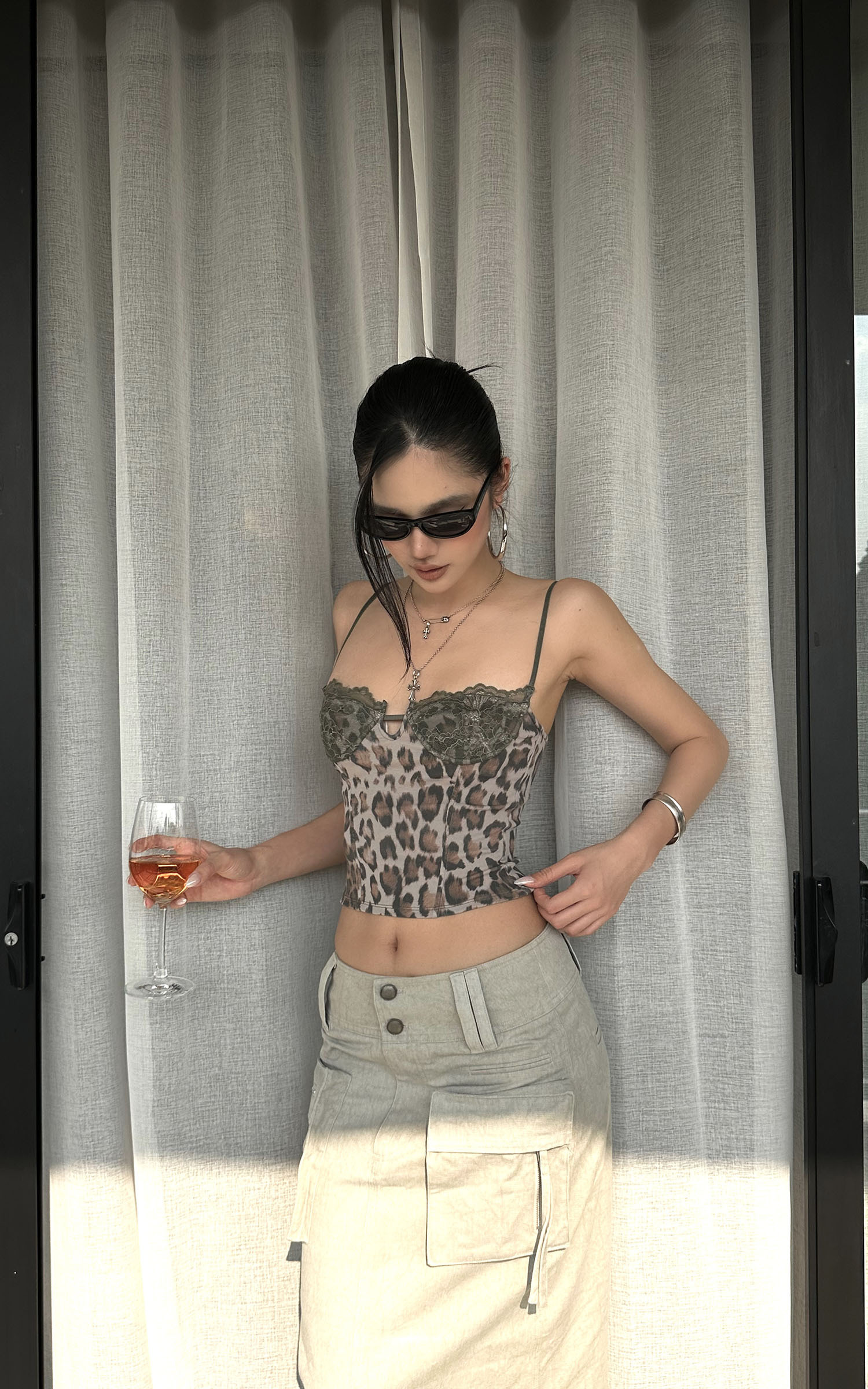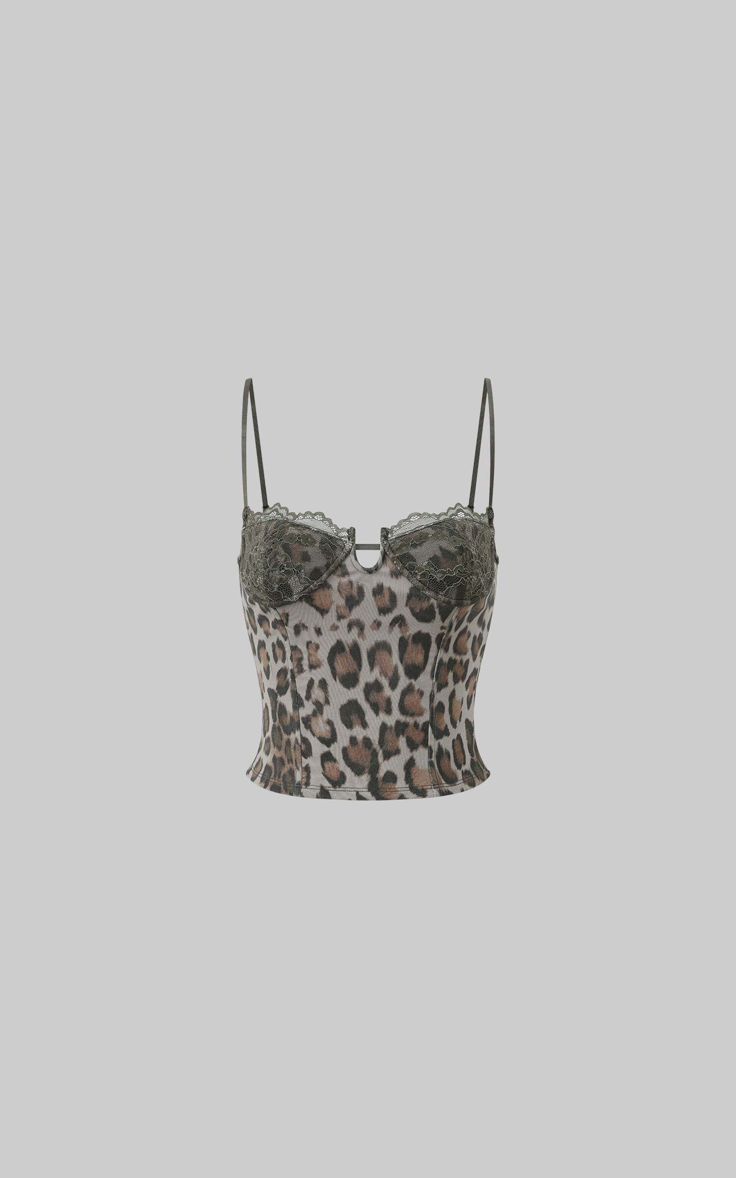 Daring and divine, this corset-inspired cami is a head-turning ode to sensual confidence. Draped in a fierce leopard print with forest green lace cups, it blurs the line between lingerie and outerwear. The hook-and-eye back closure sculpts the figure while the underwire bust lends a flattering lift. Cut from soft ribbed fabric with a touch of stretch, it hugs in all the right places. Pair it with cargo skirts, wide-leg denim, or low-rise tailoring — whatever your weapon, this top plays hard.