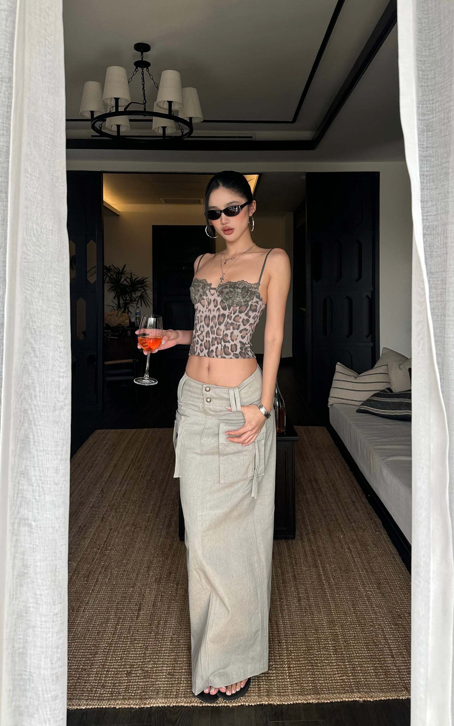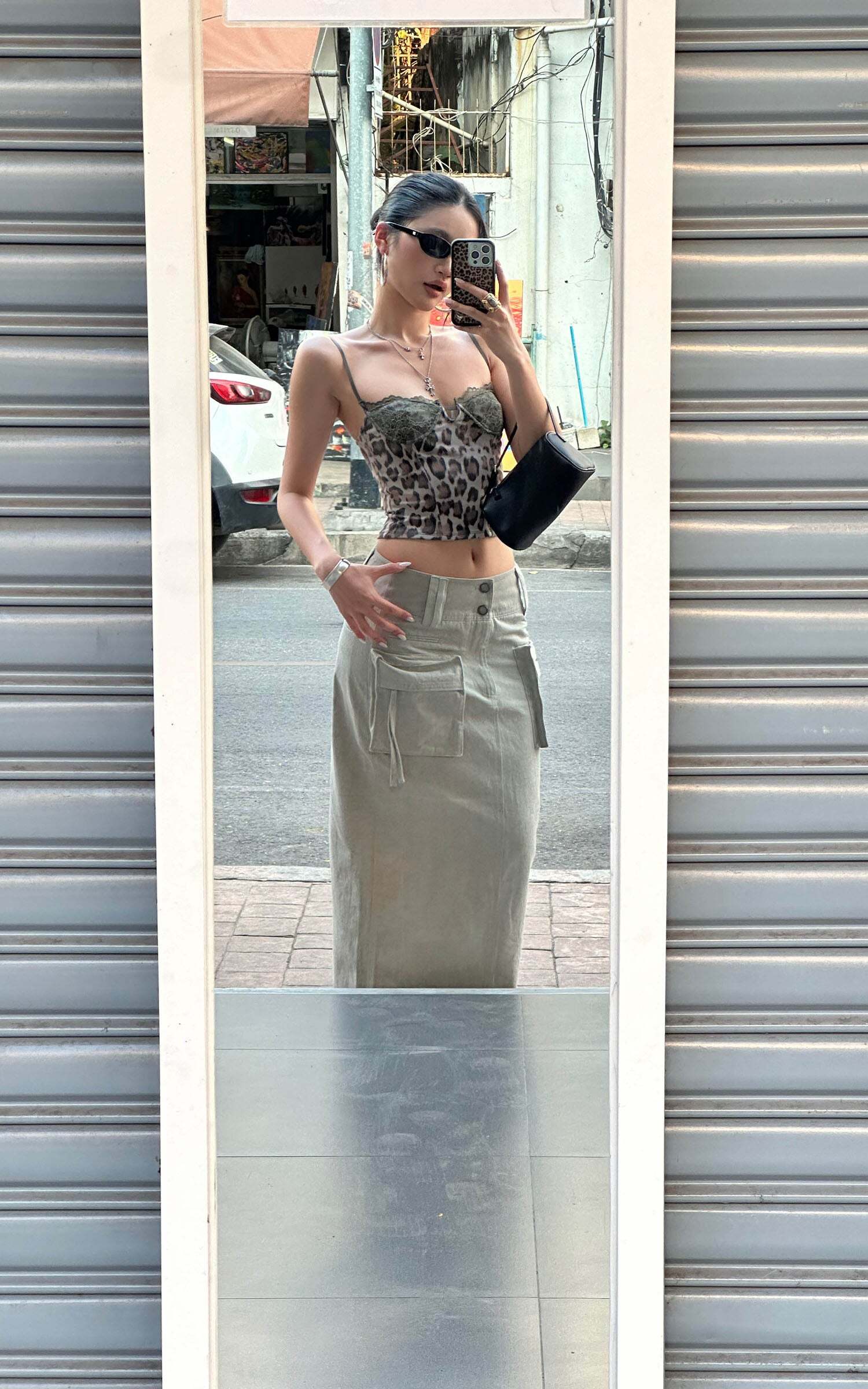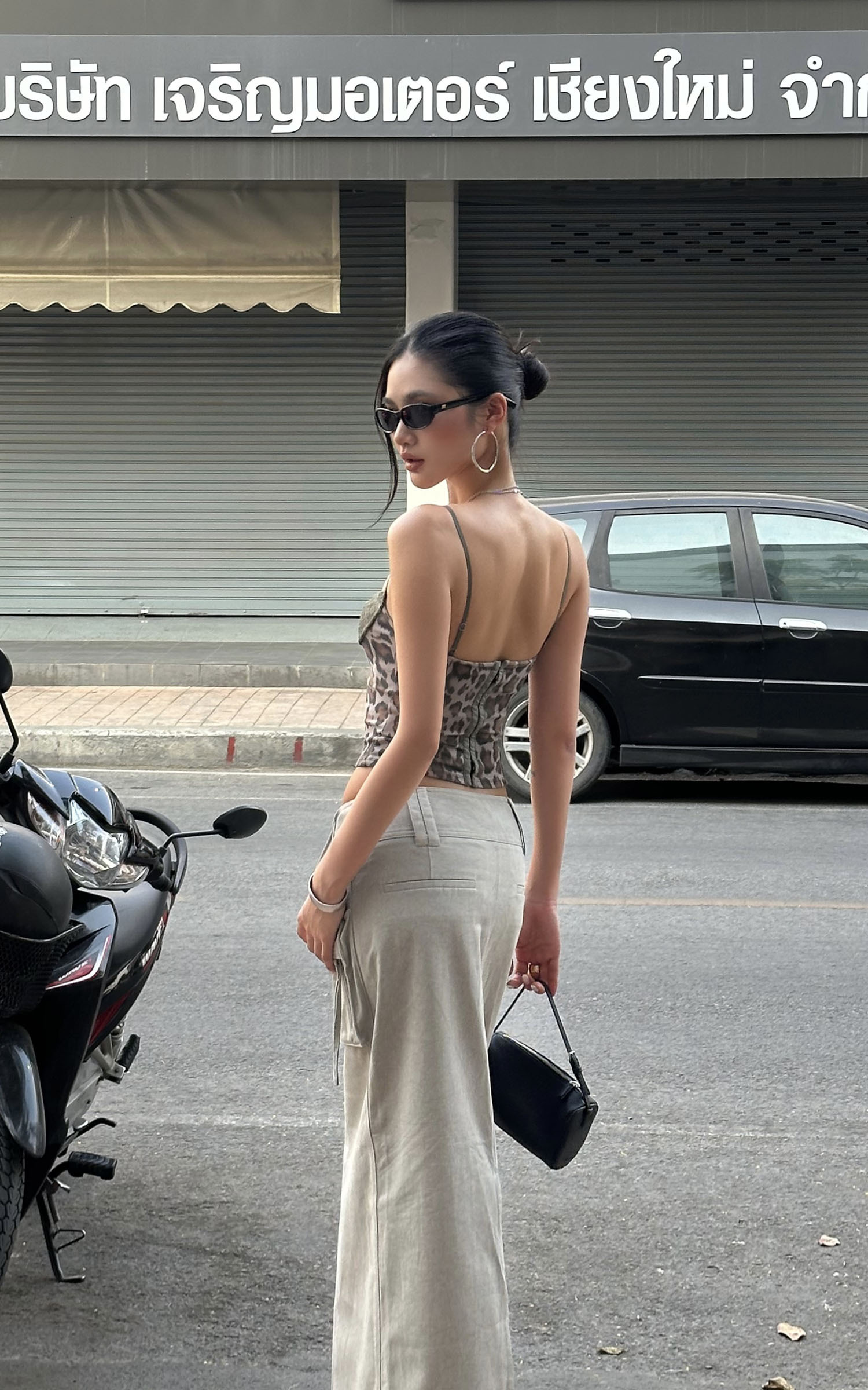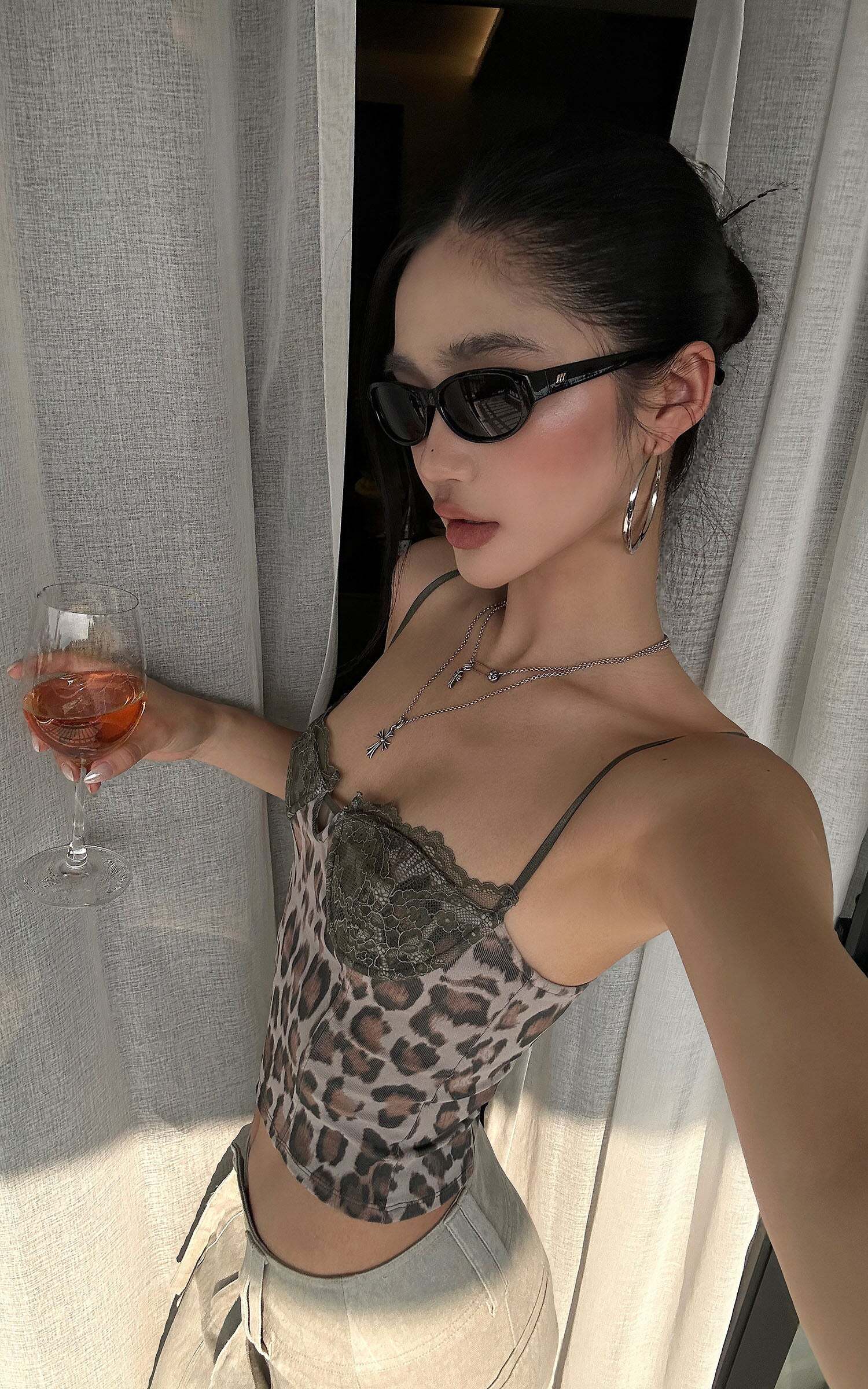 Daring and divine, this corset-inspired cami is a head-turning ode to sensual confidence. Draped in a fierce leopard print with forest green lace cups, it blurs the line between lingerie and outerwear. The hook-and-eye back closure sculpts the figure while the underwire bust lends a flattering lift. Cut from soft ribbed fabric with a touch of stretch, it hugs in all the right places. Pair it with cargo skirts, wide-leg denim, or low-rise tailoring — whatever your weapon, this top plays hard.