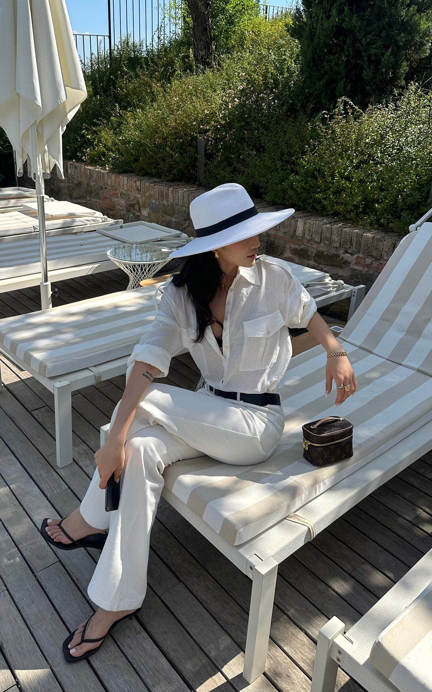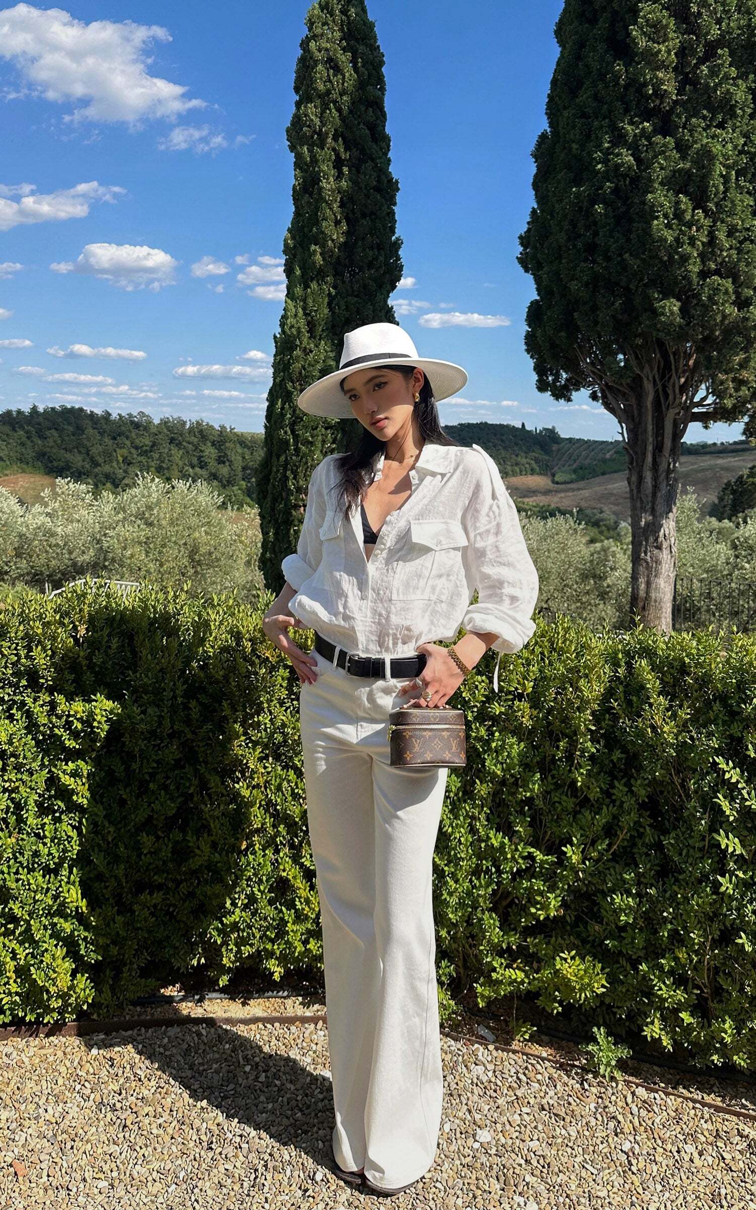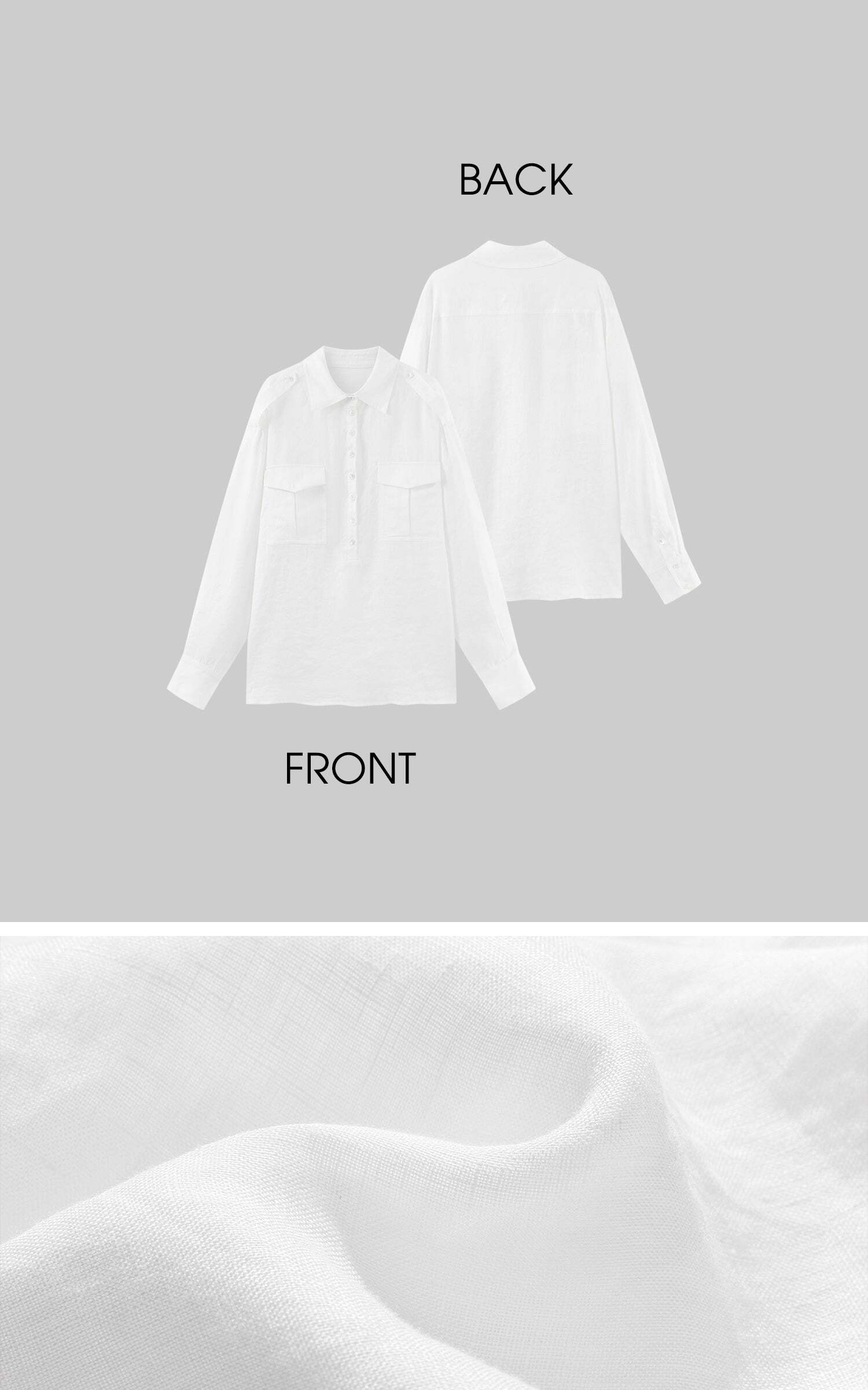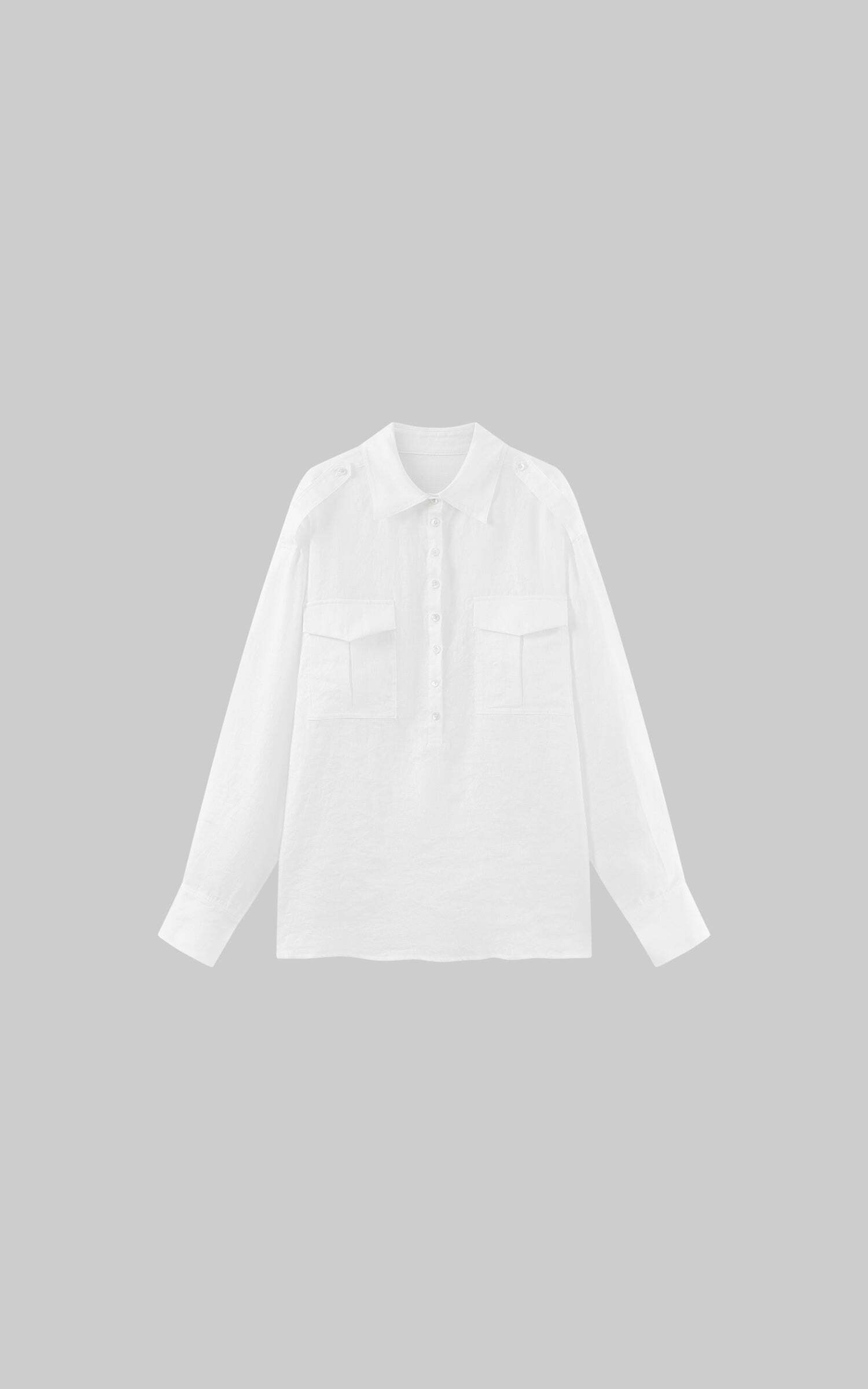Lightweight and effortlessly tailored, this linen shirt blends casual ease with structured detail. Designed with sharp epaulettes, flap patch pockets, and a partial button placket, it offers a versatile silhouette that transitions from sunlit strolls to evening drinks. The breathable weave drapes with subtle texture, perfect for layering over swimwear or pairing with sleek separates for a refined yet relaxed mood.