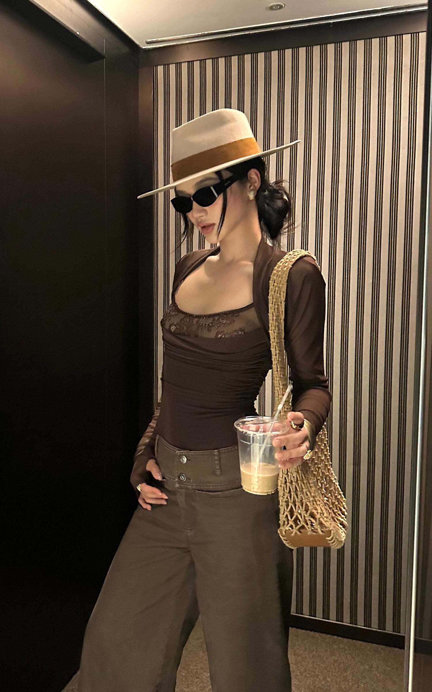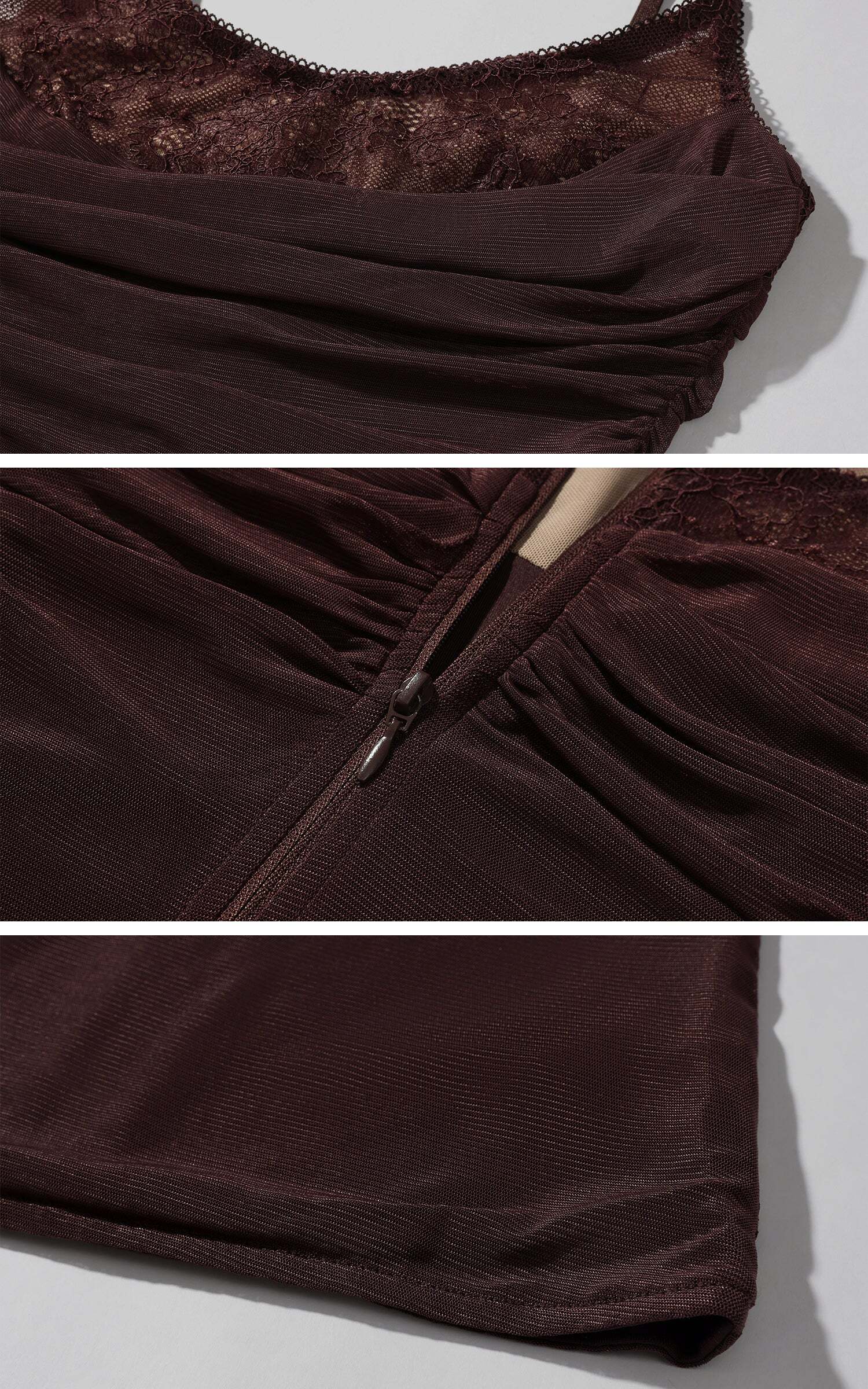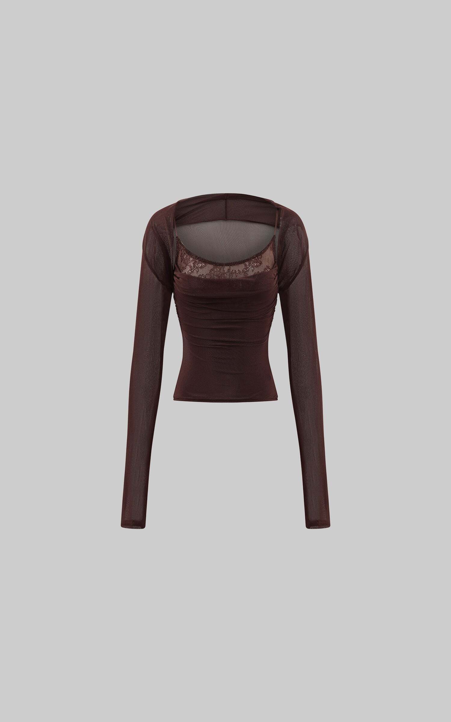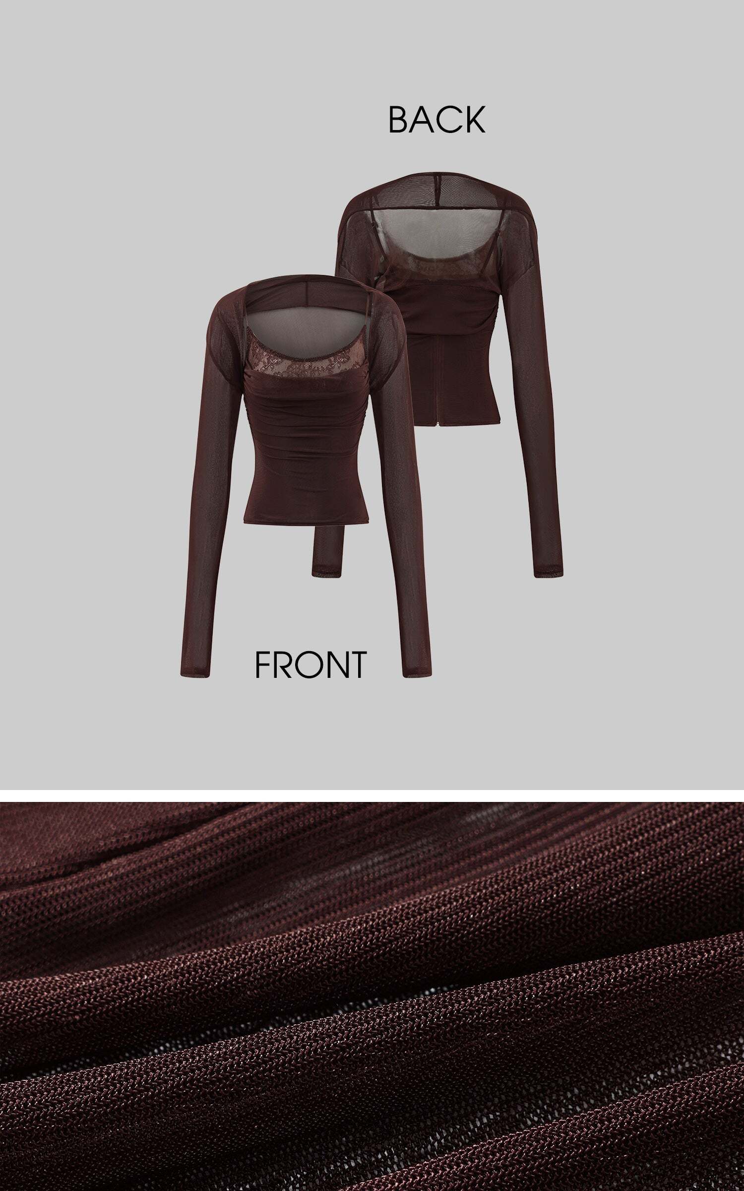 A bold redefinition of layered dressing—this two-piece set pairs a delicate lace-trimmed cami with a sheer mesh long-sleeve overlay. The figure-hugging silhouette creates instant allure, while the ruched detailing adds texture and depth. Designed to be styled together for a sultry evening statement or worn separately for versatile day-to-night looks. The stretch mesh fabric ensures comfort with edge, making it the ultimate piece for confident, effortless styling.