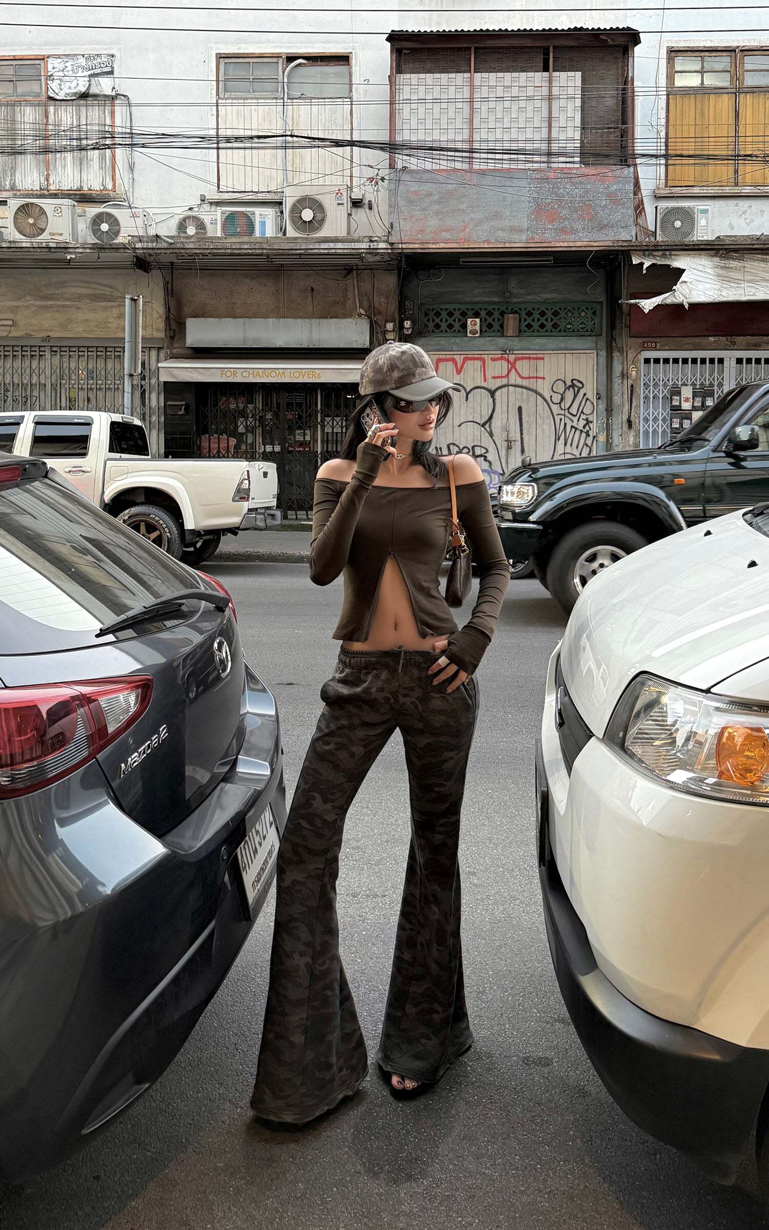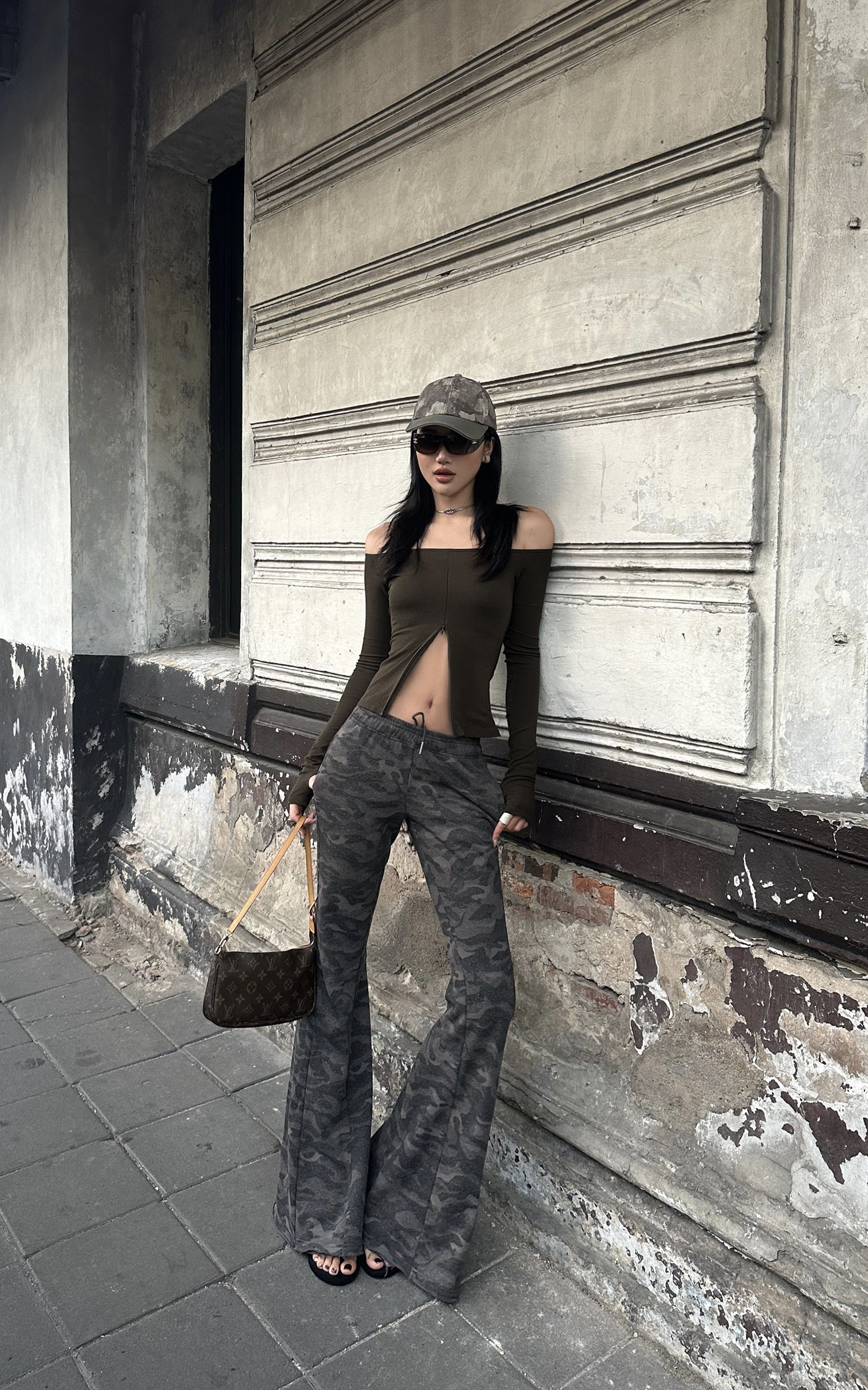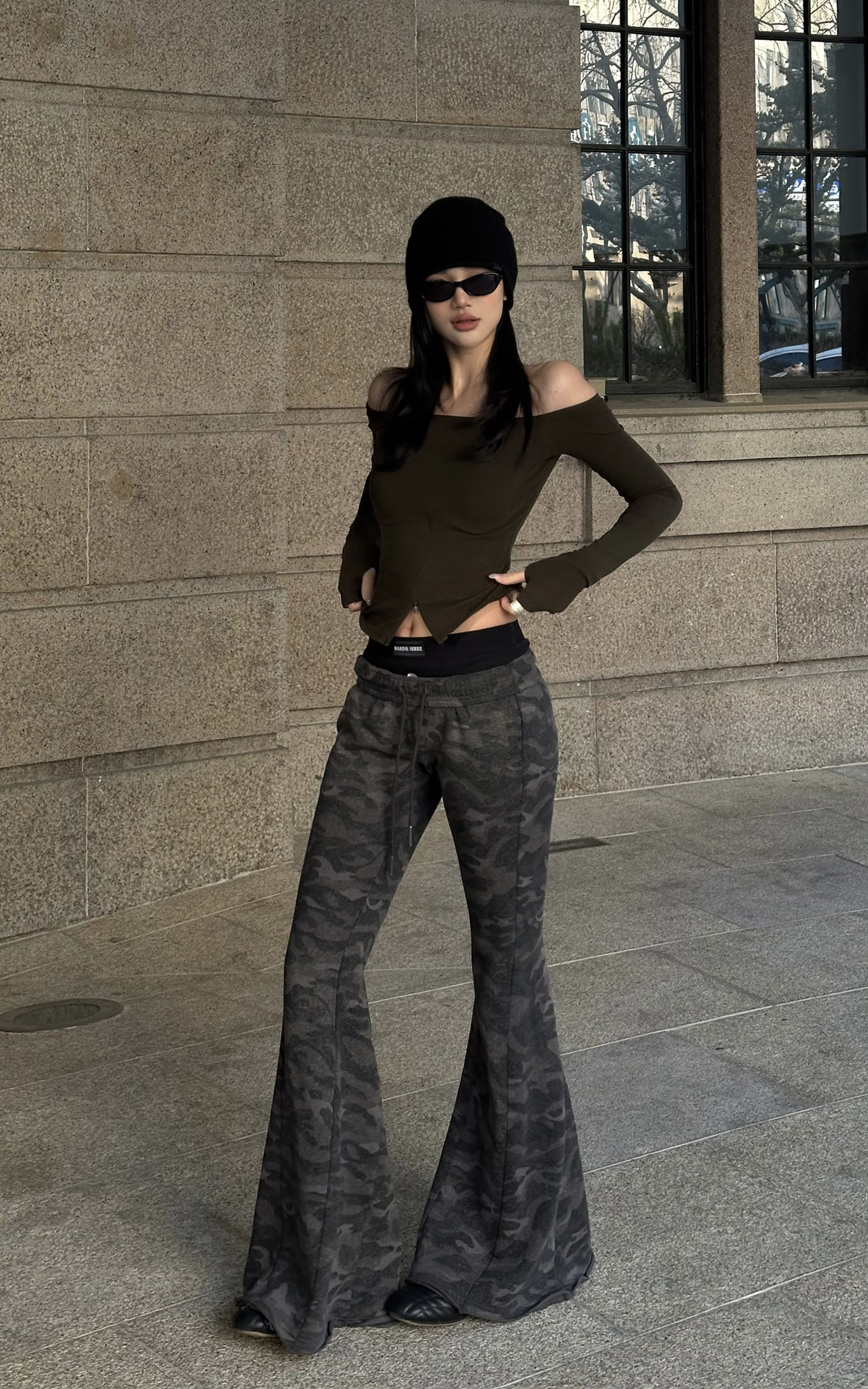 Sleek yet rebellious, this off-shoulder top features a sharp front hem slit that accentuates the waistline. Made from stretch cotton for a body-hugging fit, it balances comfort and structure effortlessly. Style it with camo pants or a deconstructed maxi skirt for a cool, street-inflected look.
