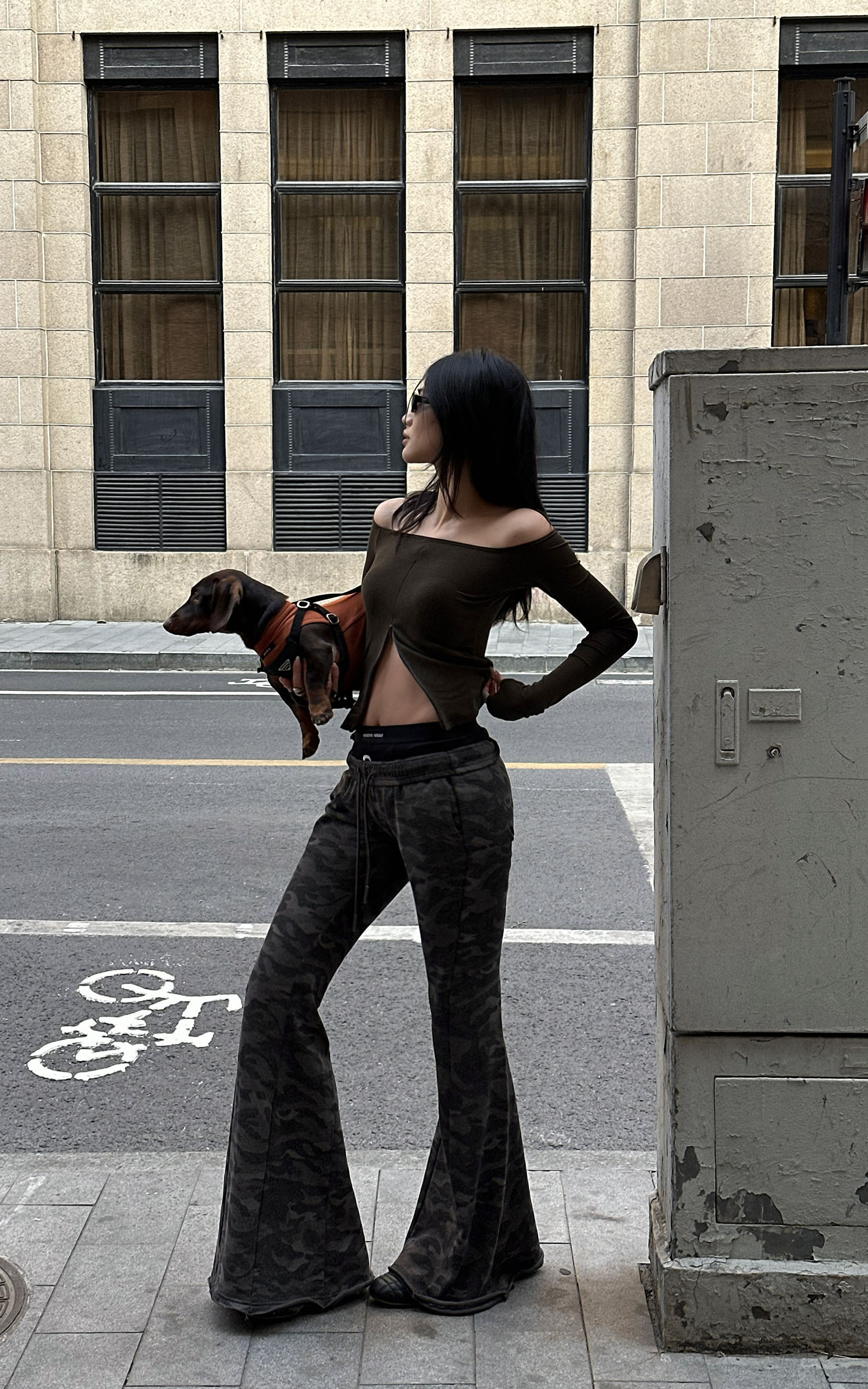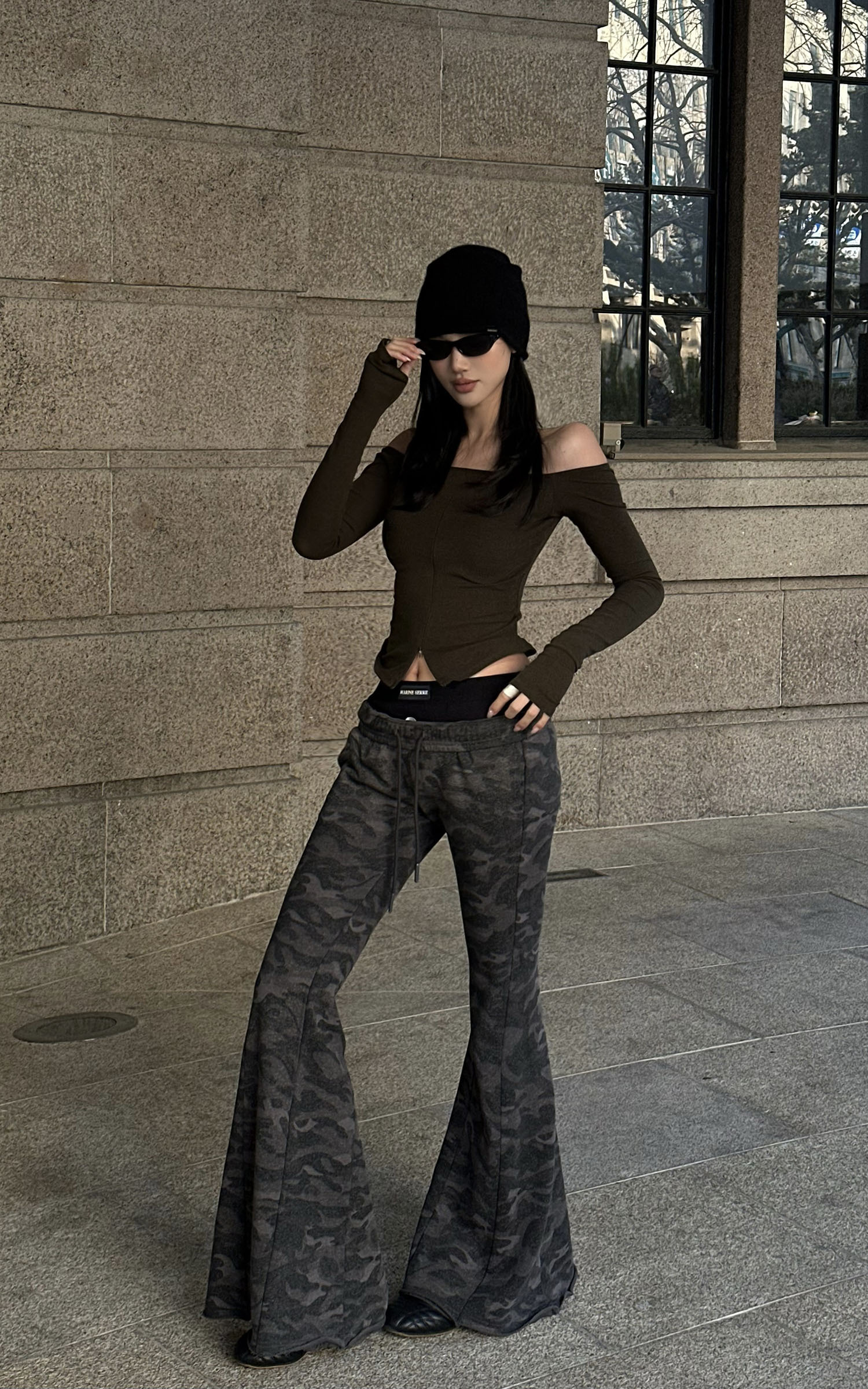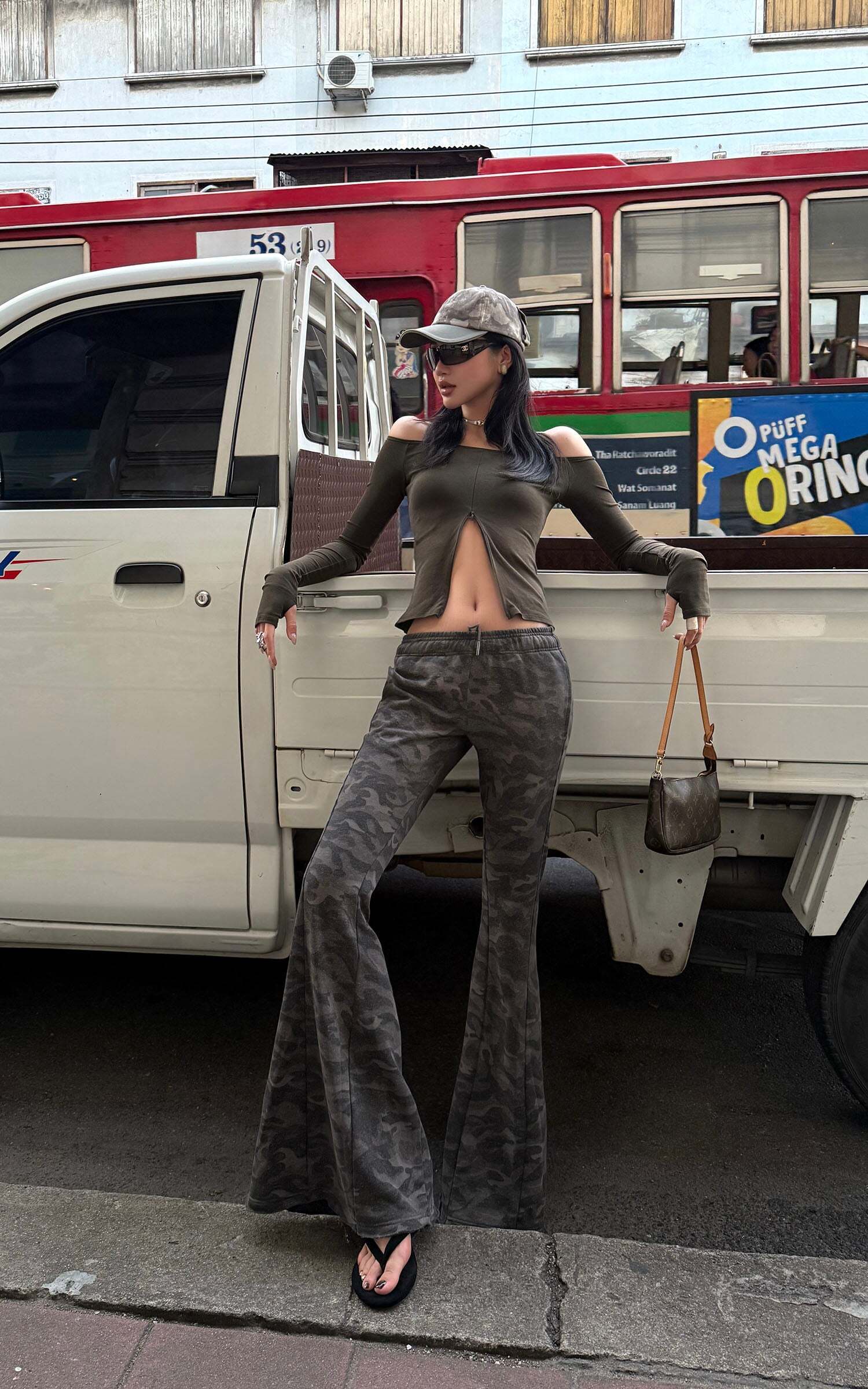 Sleek yet rebellious, this off-shoulder top features a sharp front hem slit that accentuates the waistline. Made from stretch cotton for a body-hugging fit, it balances comfort and structure effortlessly. Style it with camo pants or a deconstructed maxi skirt for a cool, street-inflected look.