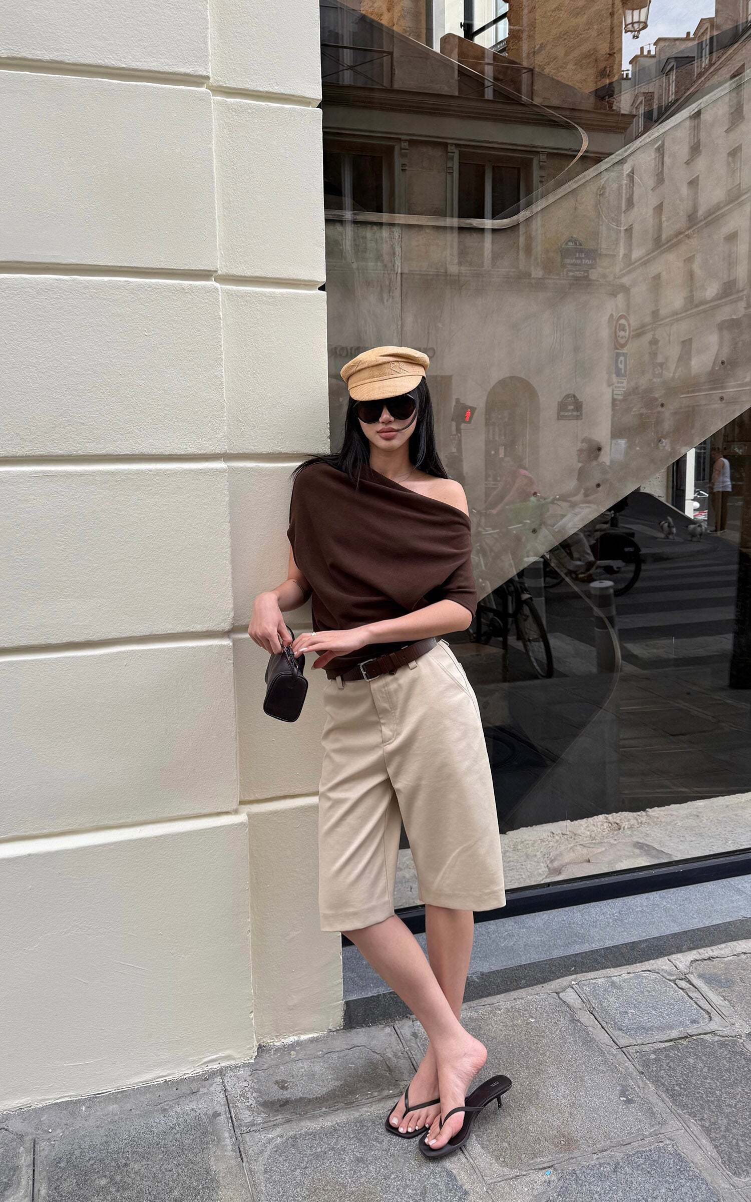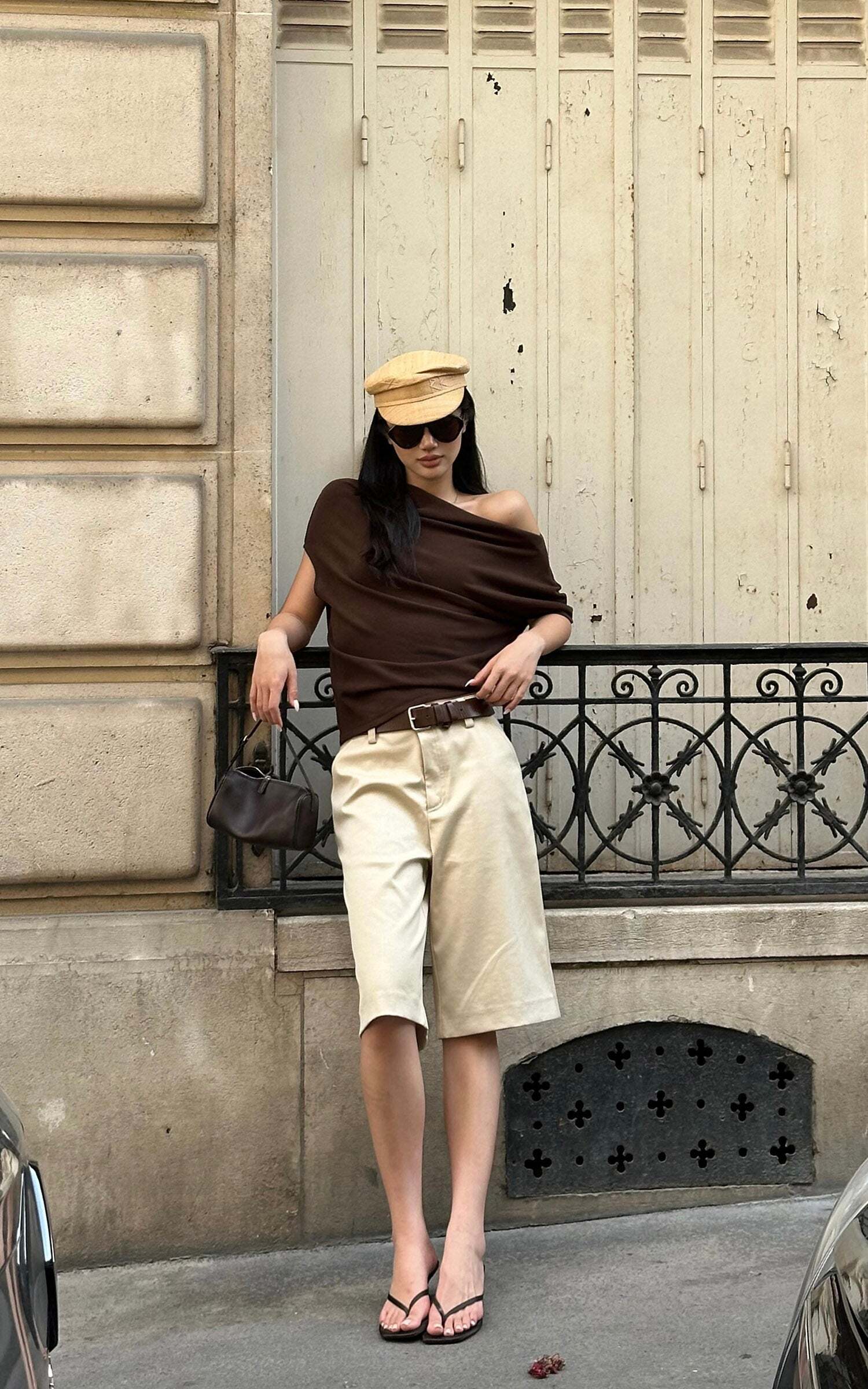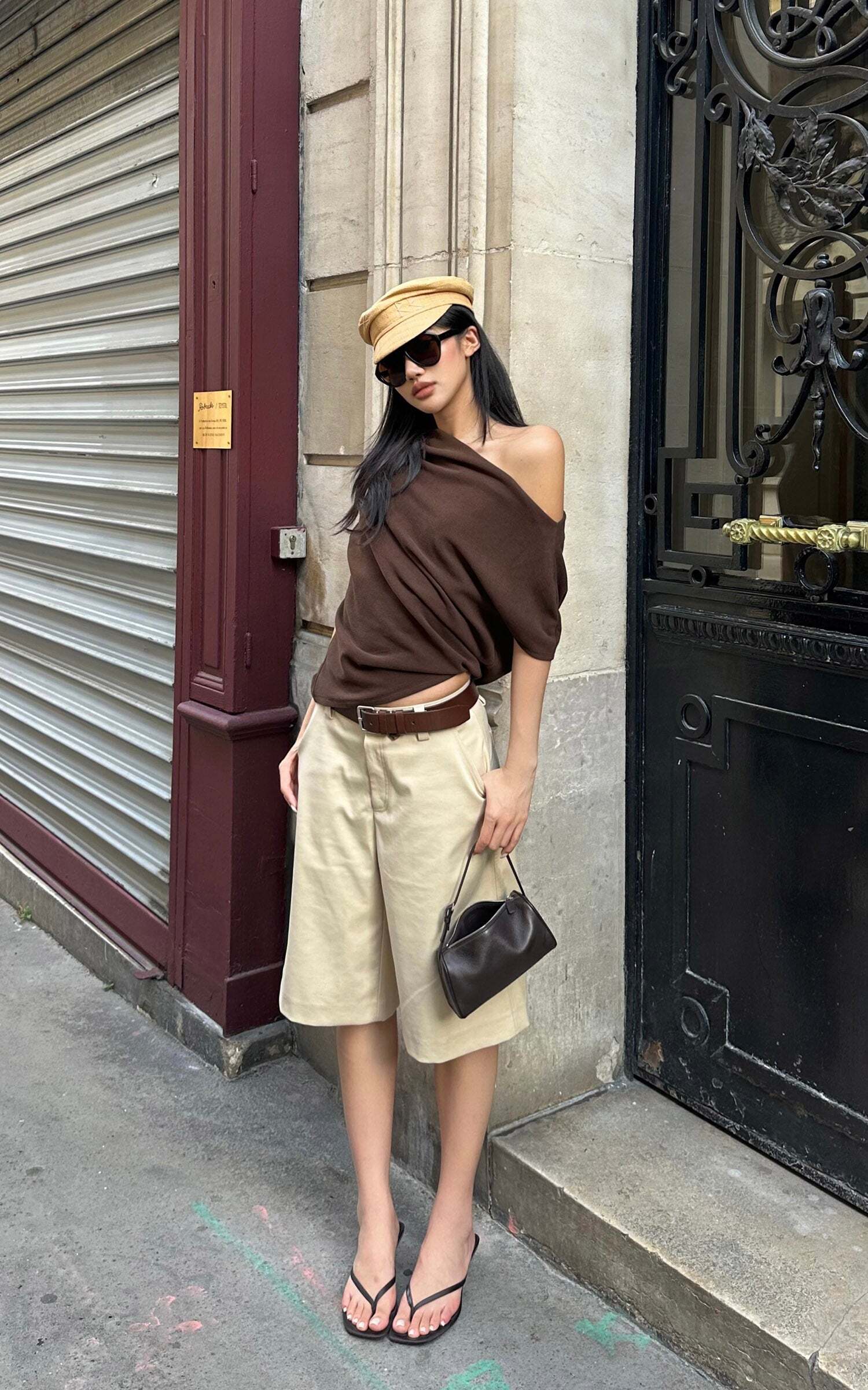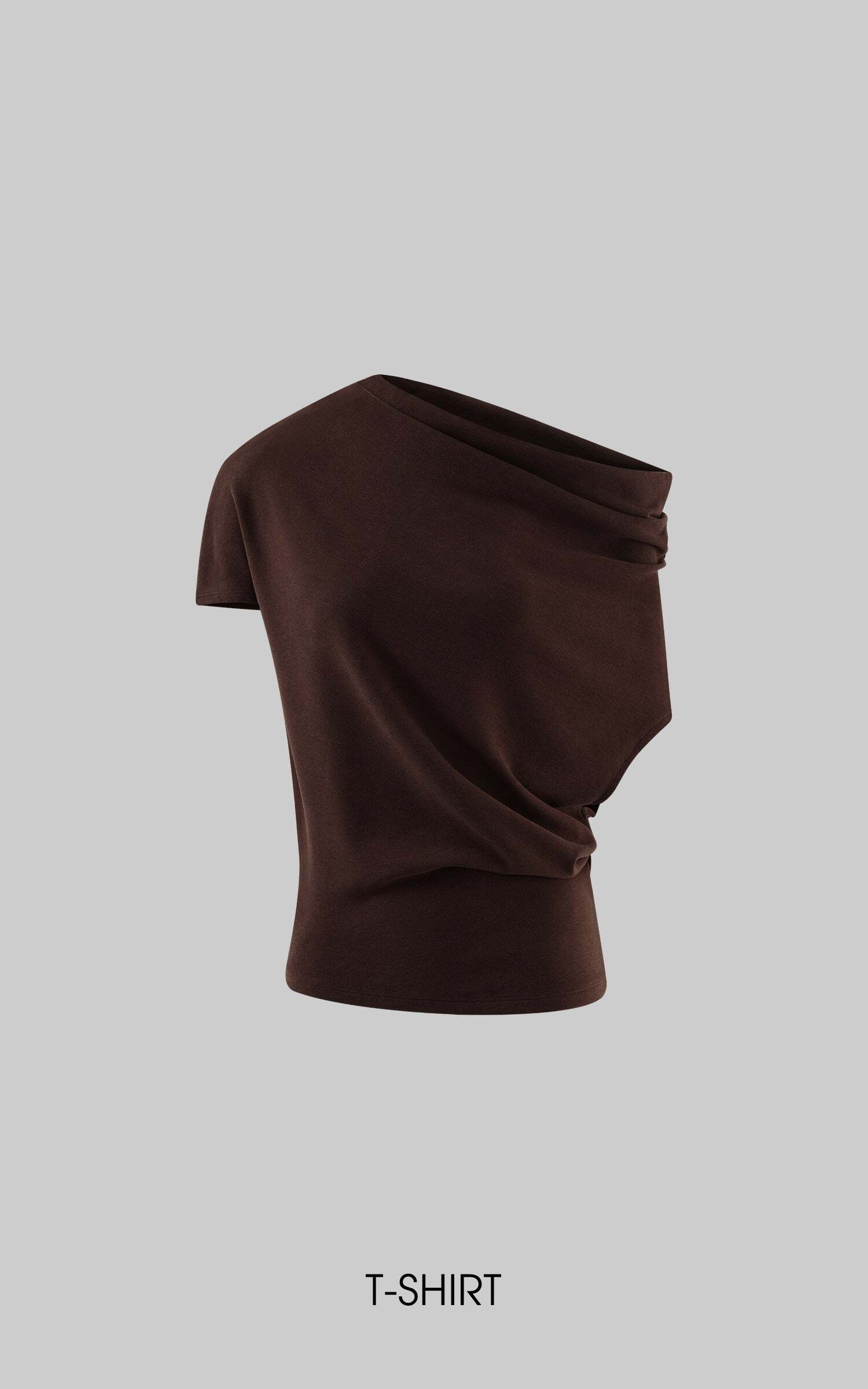 Featuring a single-shoulder neckline with natural draping, this fitted tee stands out with its sculptural silhouette. The soft, skin-friendly fabric offers a fluid drape, hugging the body while allowing ease of movement—effortless yet refined. Pair it with wide-leg trousers or a high-waist skirt for a seamless transition from street-ready cool to evening allure.