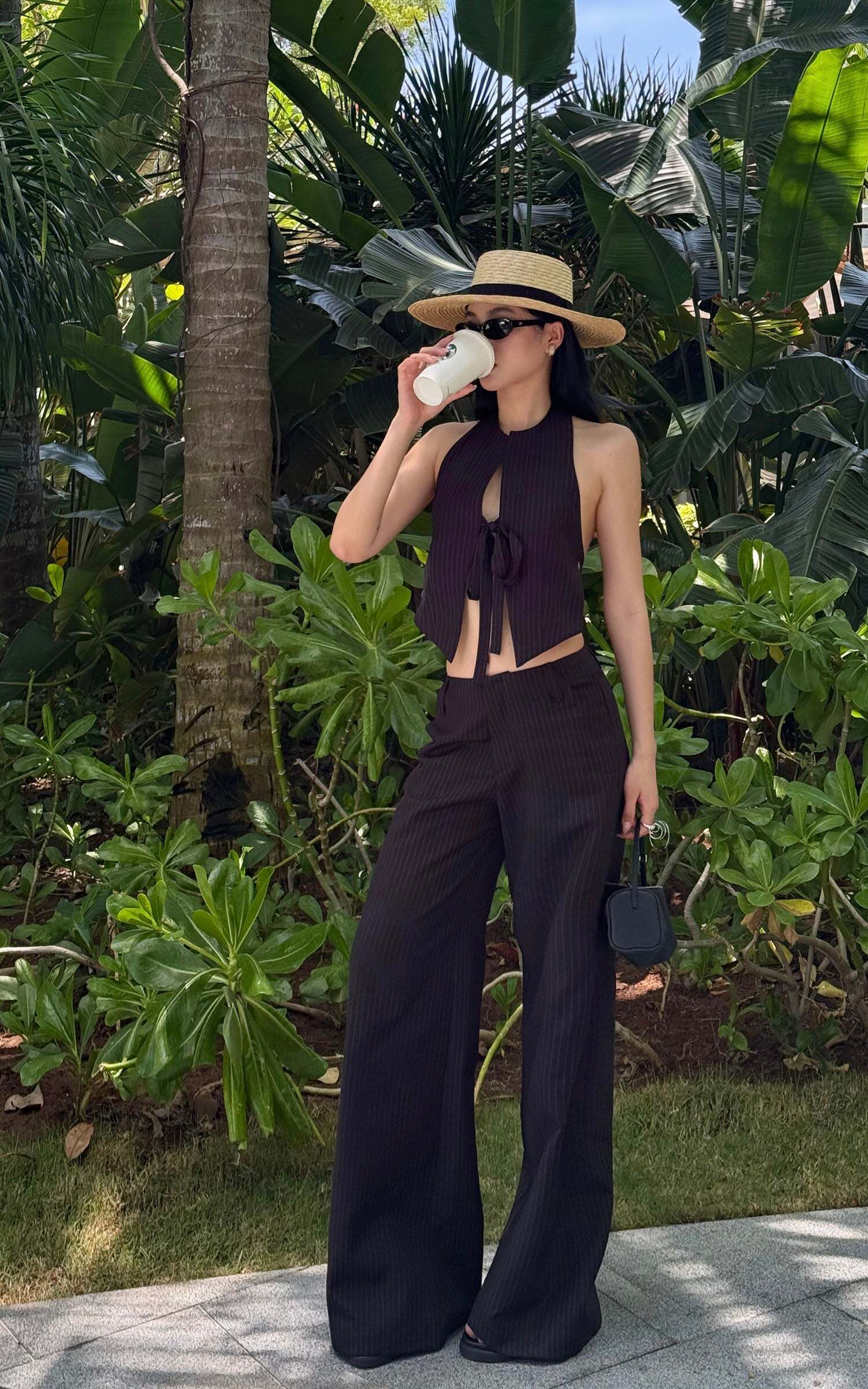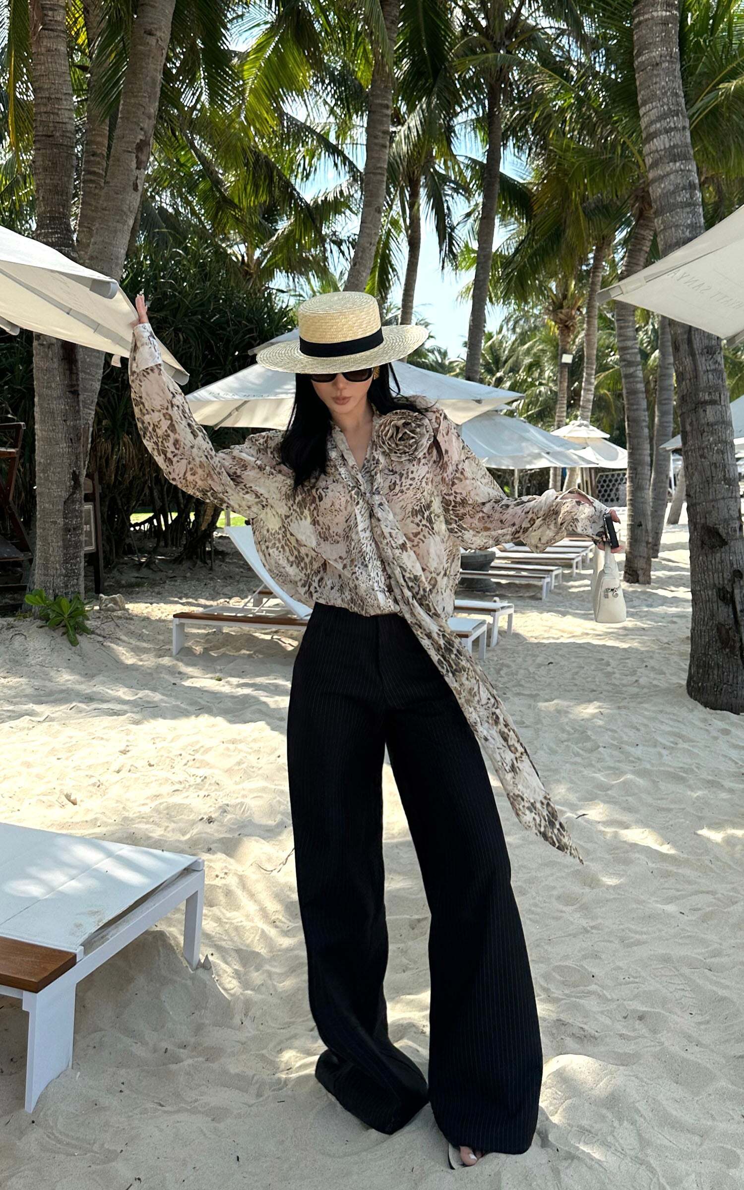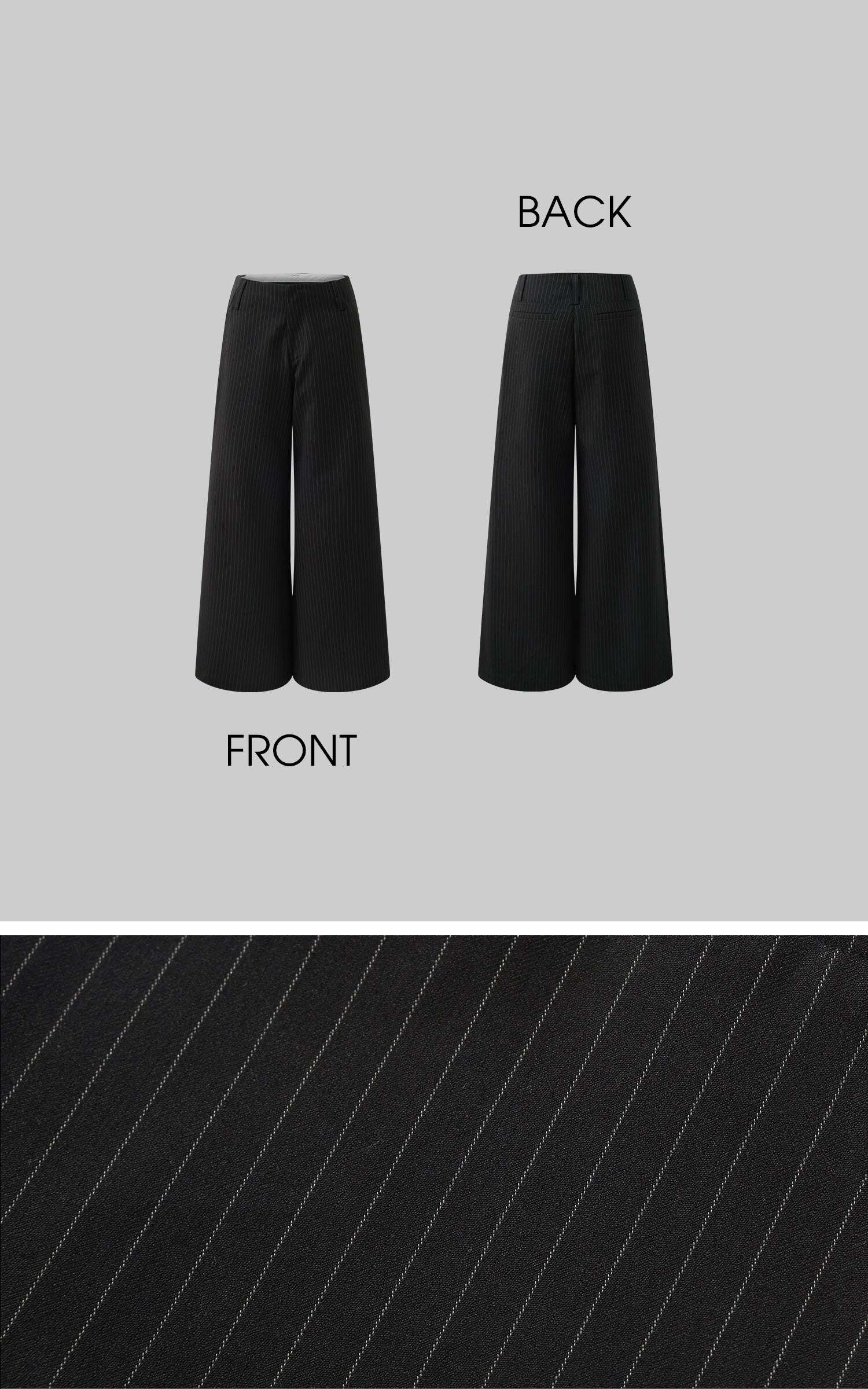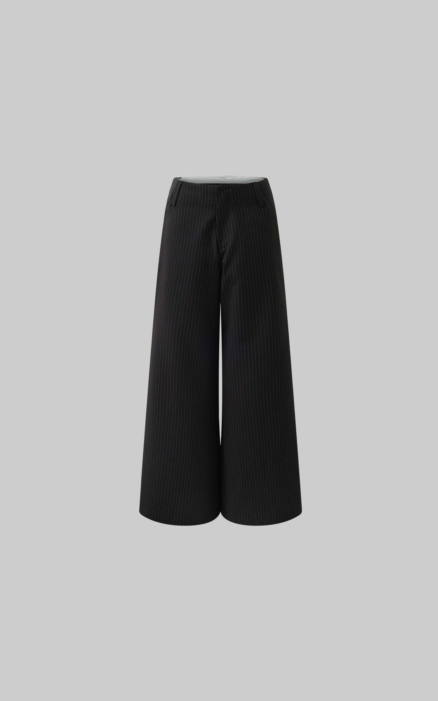Tailored with an effortless edge, these wide-leg trousers blend masculine precision with feminine nonchalance. The soft pinstripe suiting fabric flows with movement, while the high-rise waist elongates the silhouette. Subtle pleating adds shape without bulk, and the concealed zip and hook closure keeps things sleek. Style it with an open vest, bandeau, or nothing at all—these pants were made to roam the city or recline by the coast.
