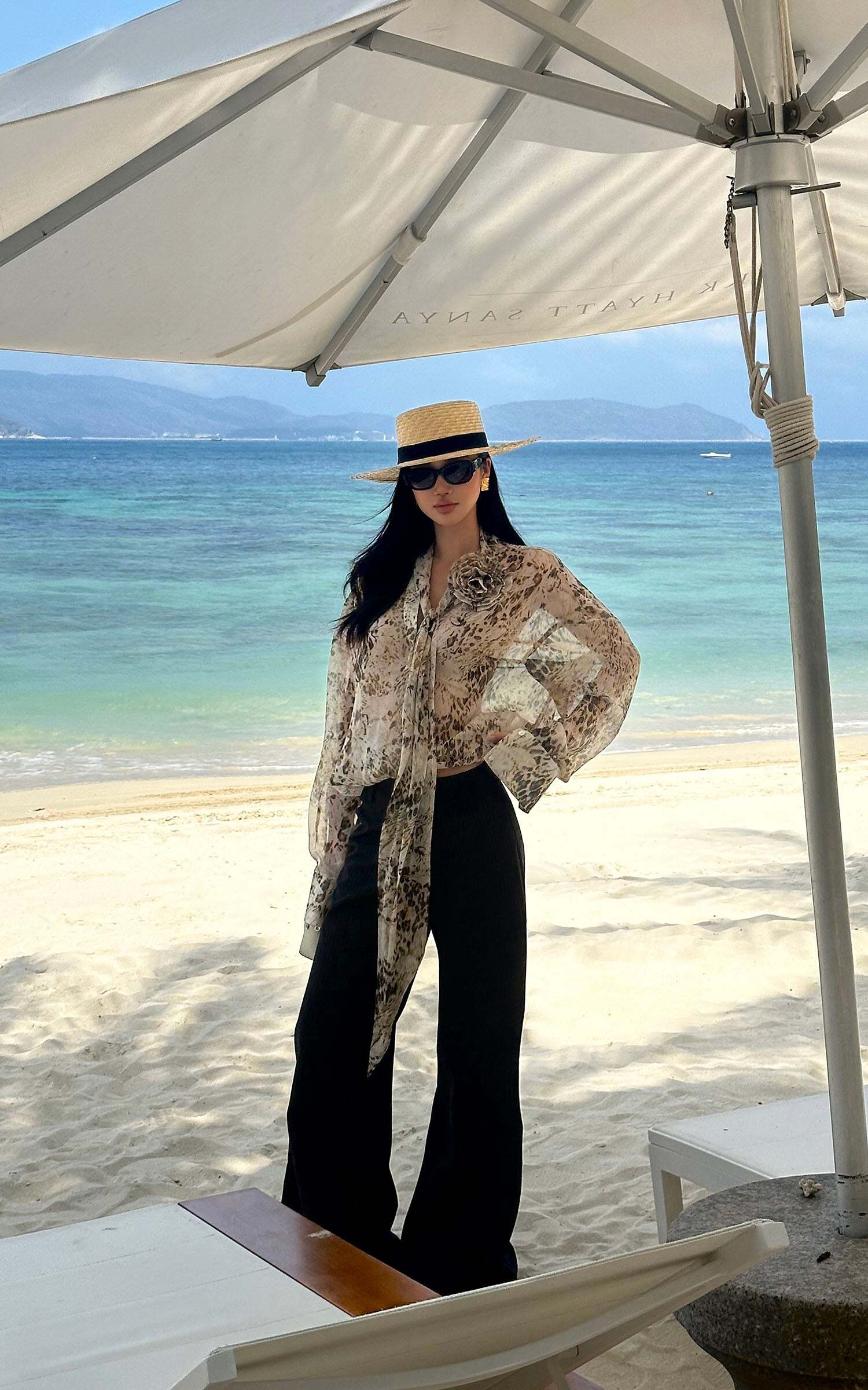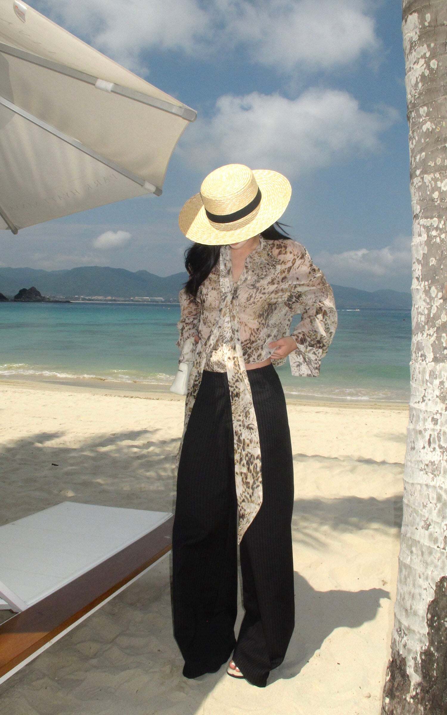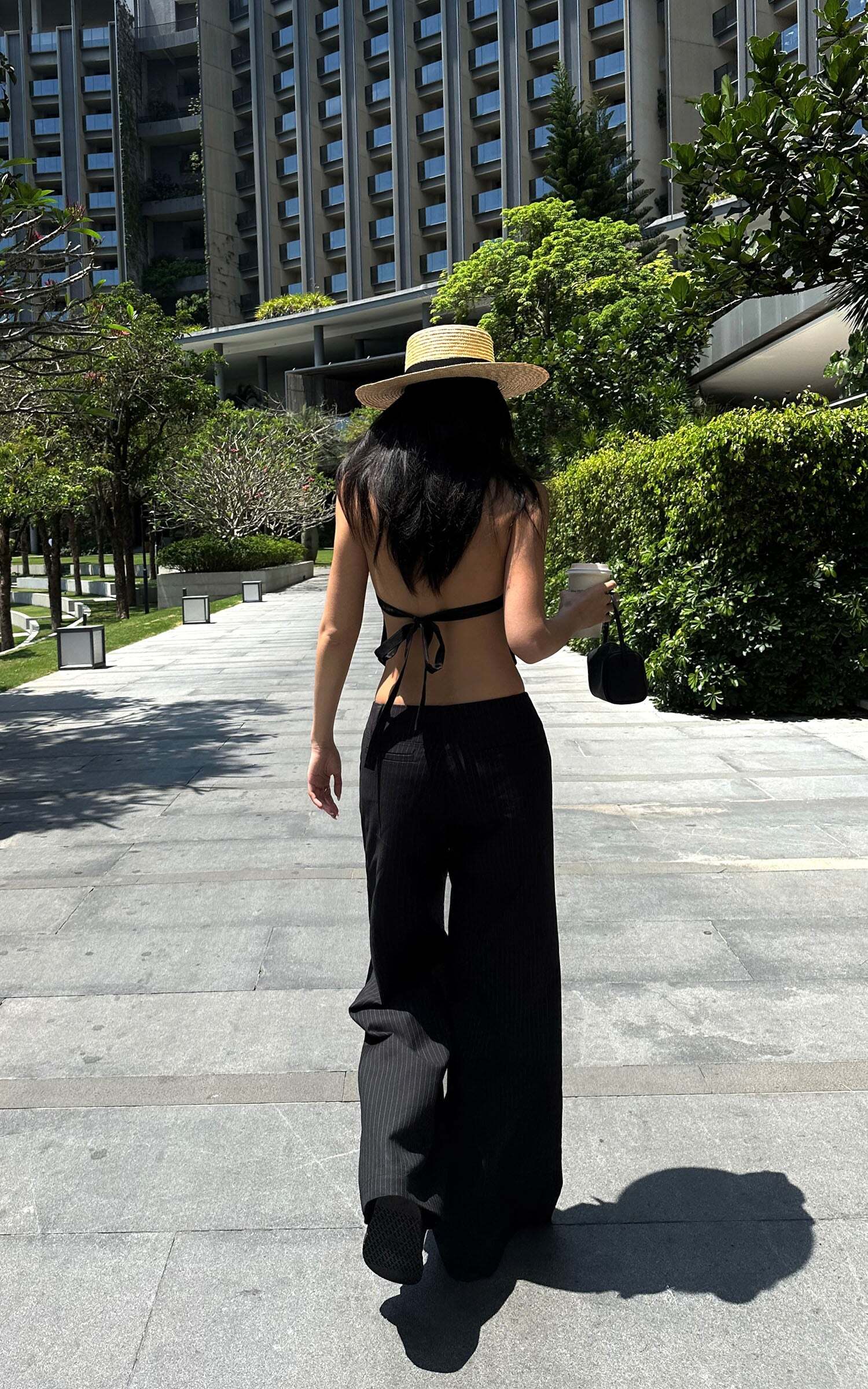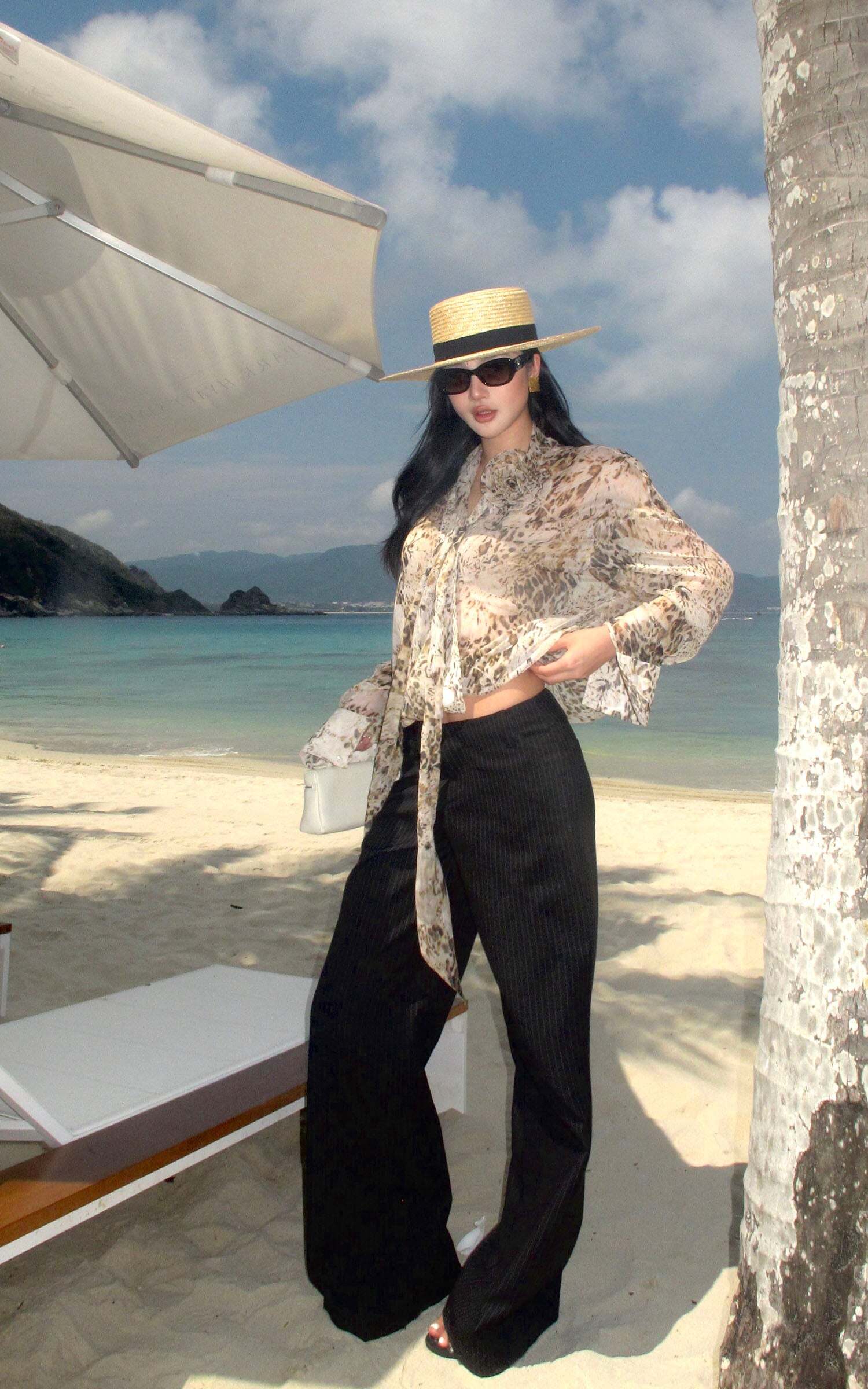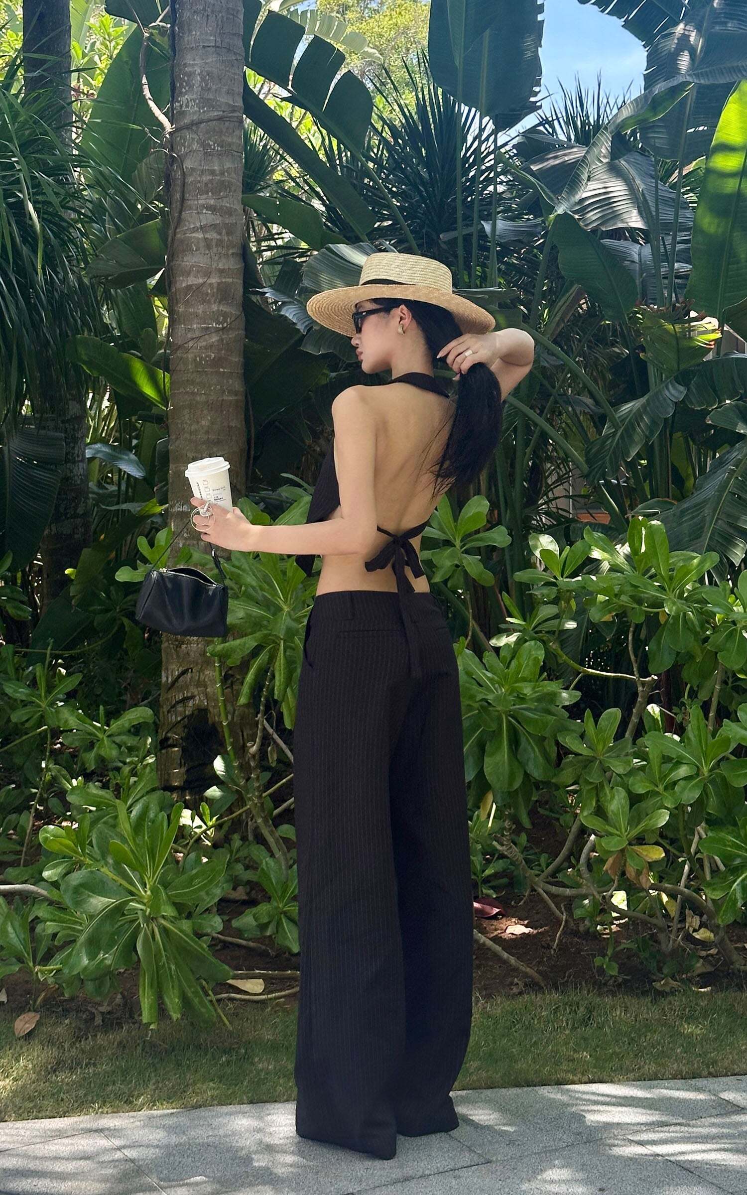 Tailored with an effortless edge, these wide-leg trousers blend masculine precision with feminine nonchalance. The soft pinstripe suiting fabric flows with movement, while the high-rise waist elongates the silhouette. Subtle pleating adds shape without bulk, and the concealed zip and hook closure keeps things sleek. Style it with an open vest, bandeau, or nothing at all—these pants were made to roam the city or recline by the coast.