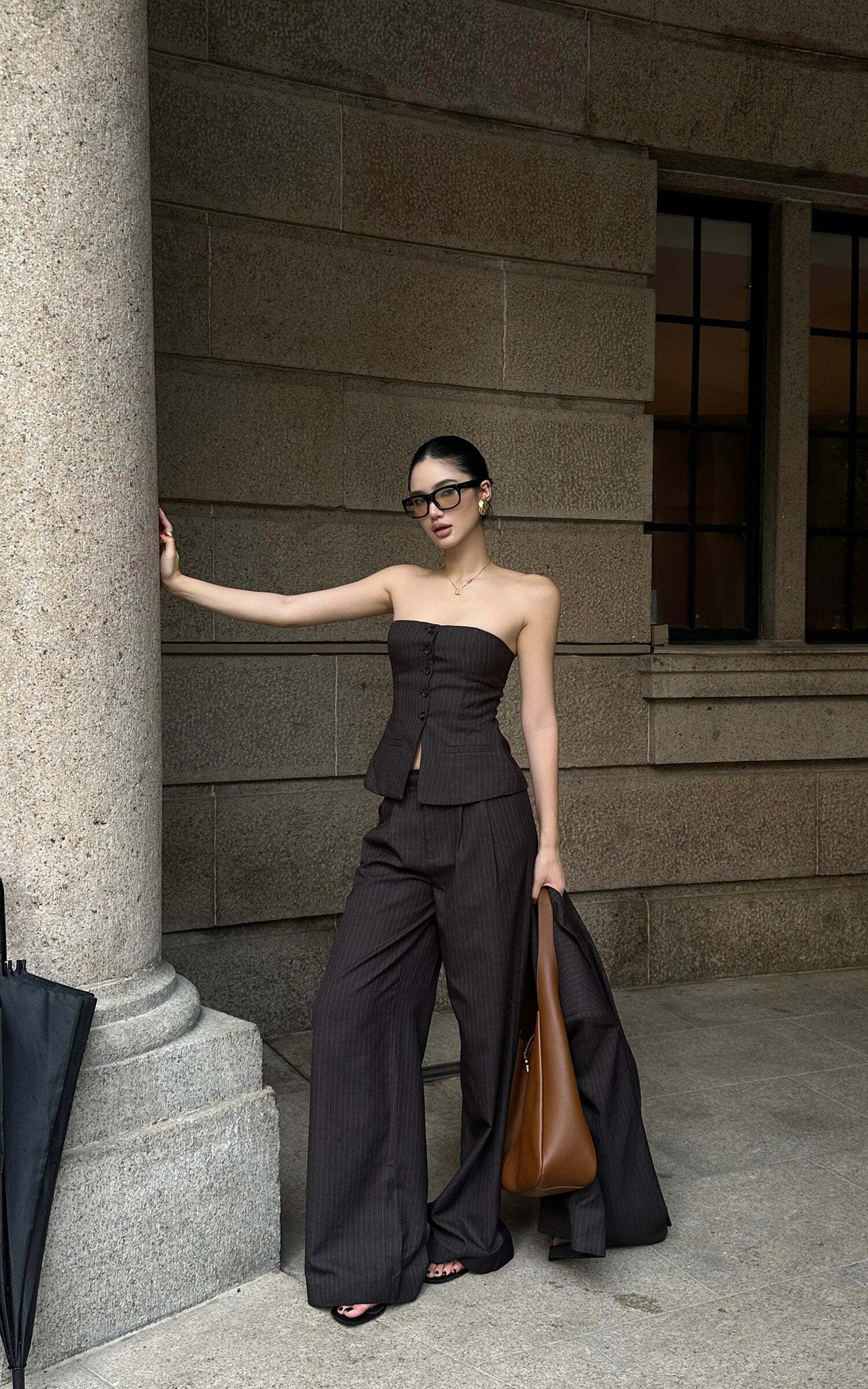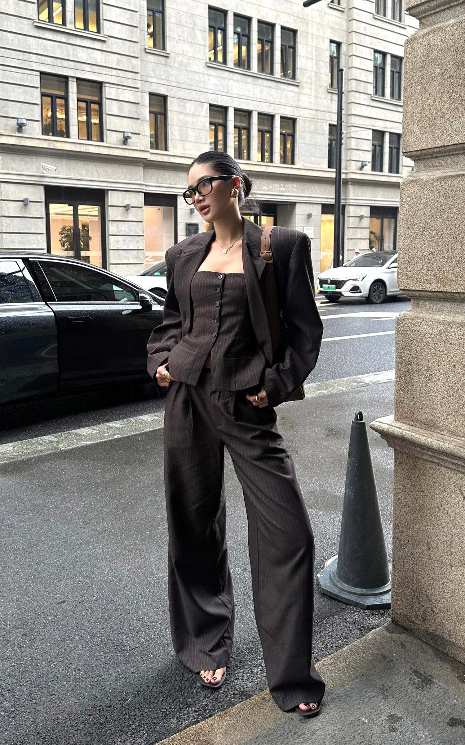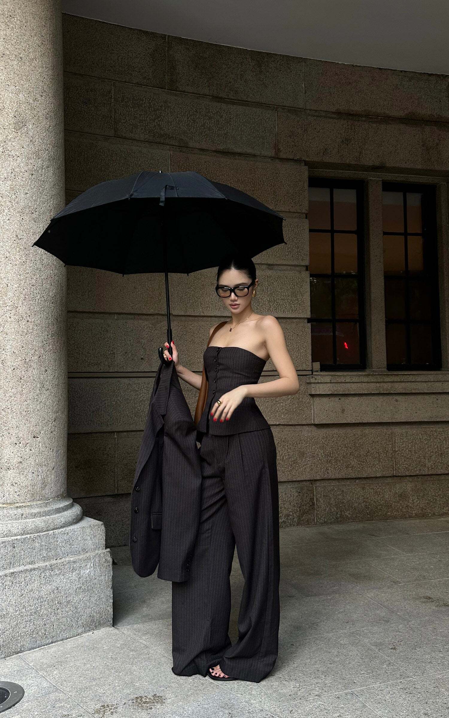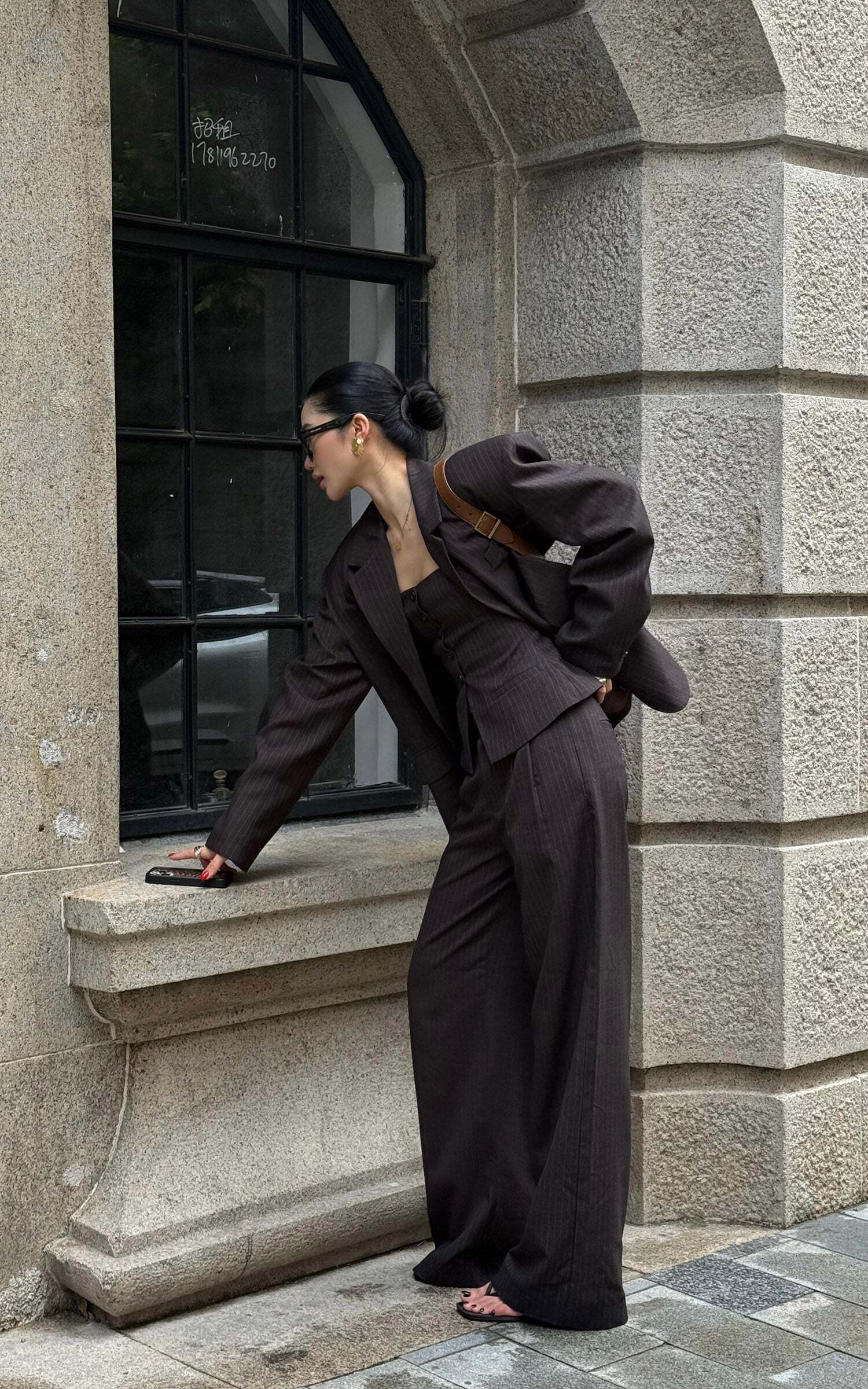 Cut from a lightweight suiting fabric with subtle pinstripes, these wide-leg trousers balance sharp tailoring with a relaxed silhouette. The high-rise waistband features belt loops and a single-button closure, leading to front pleats that add volume and fluid movement. Side pockets keep the design functional, while the clean back welt pockets maintain a streamlined look. Pair them with the matching vest or blazer for a powerfully coordinated city ensemble, or style them solo for effortless sophistication from day to night.