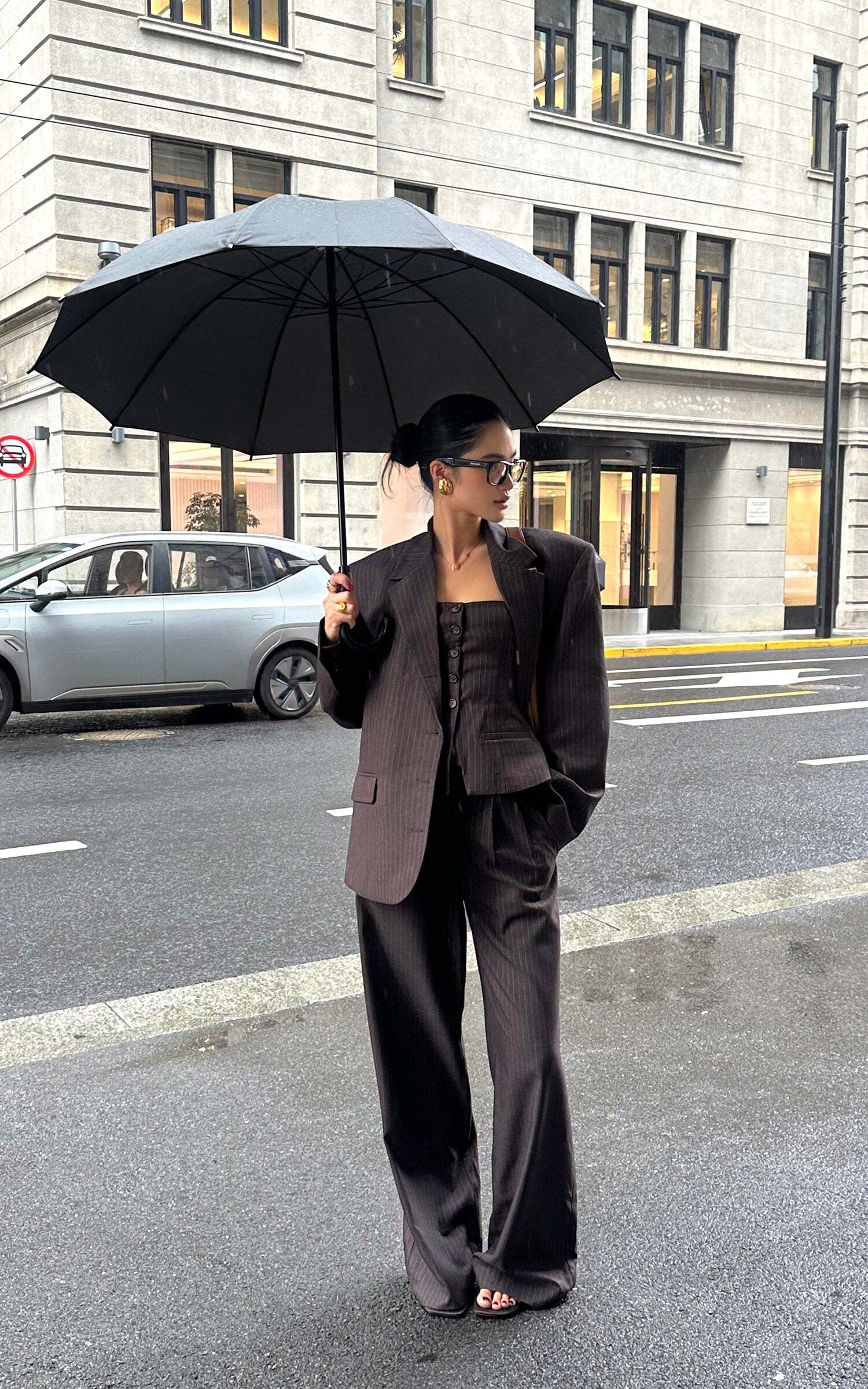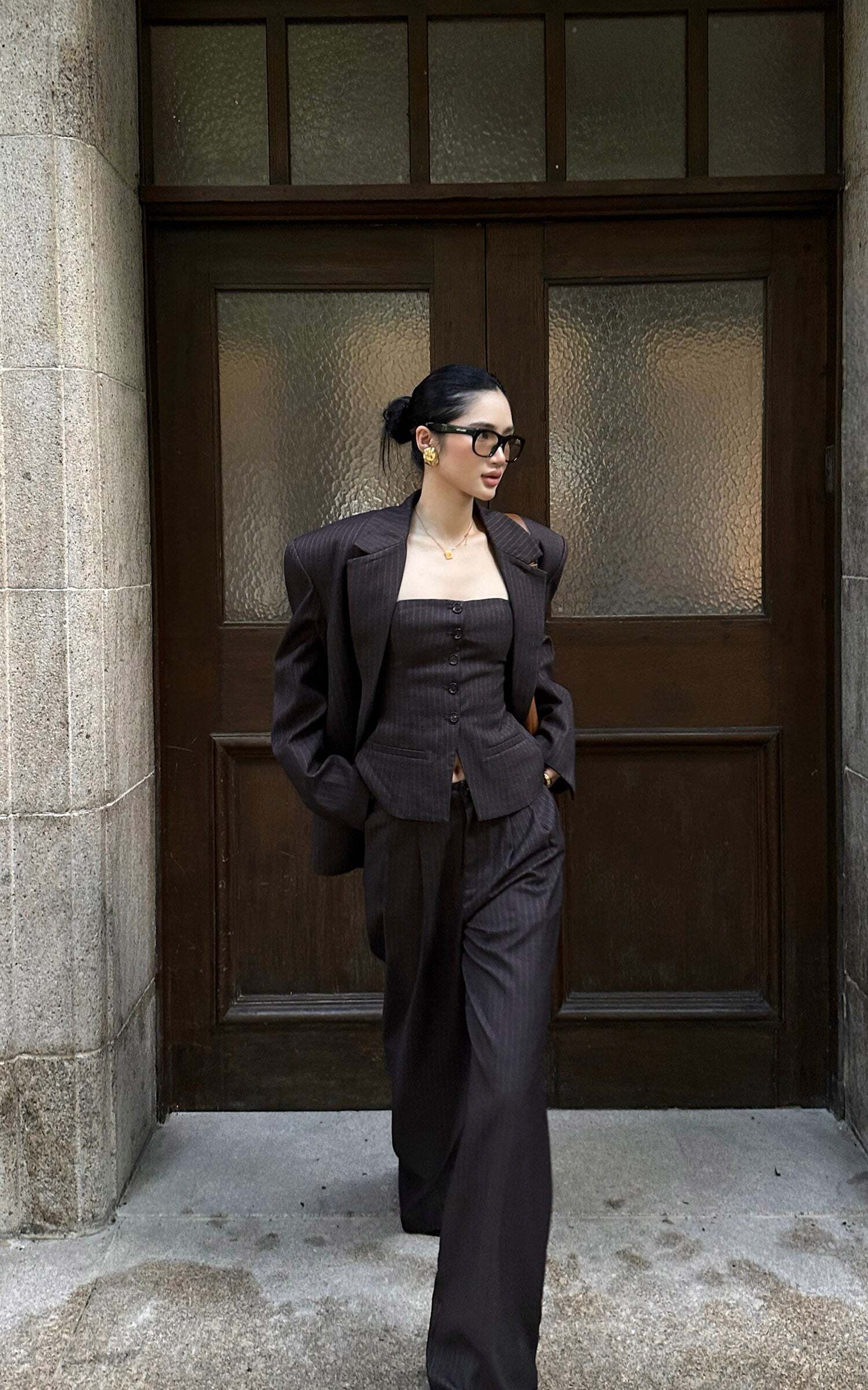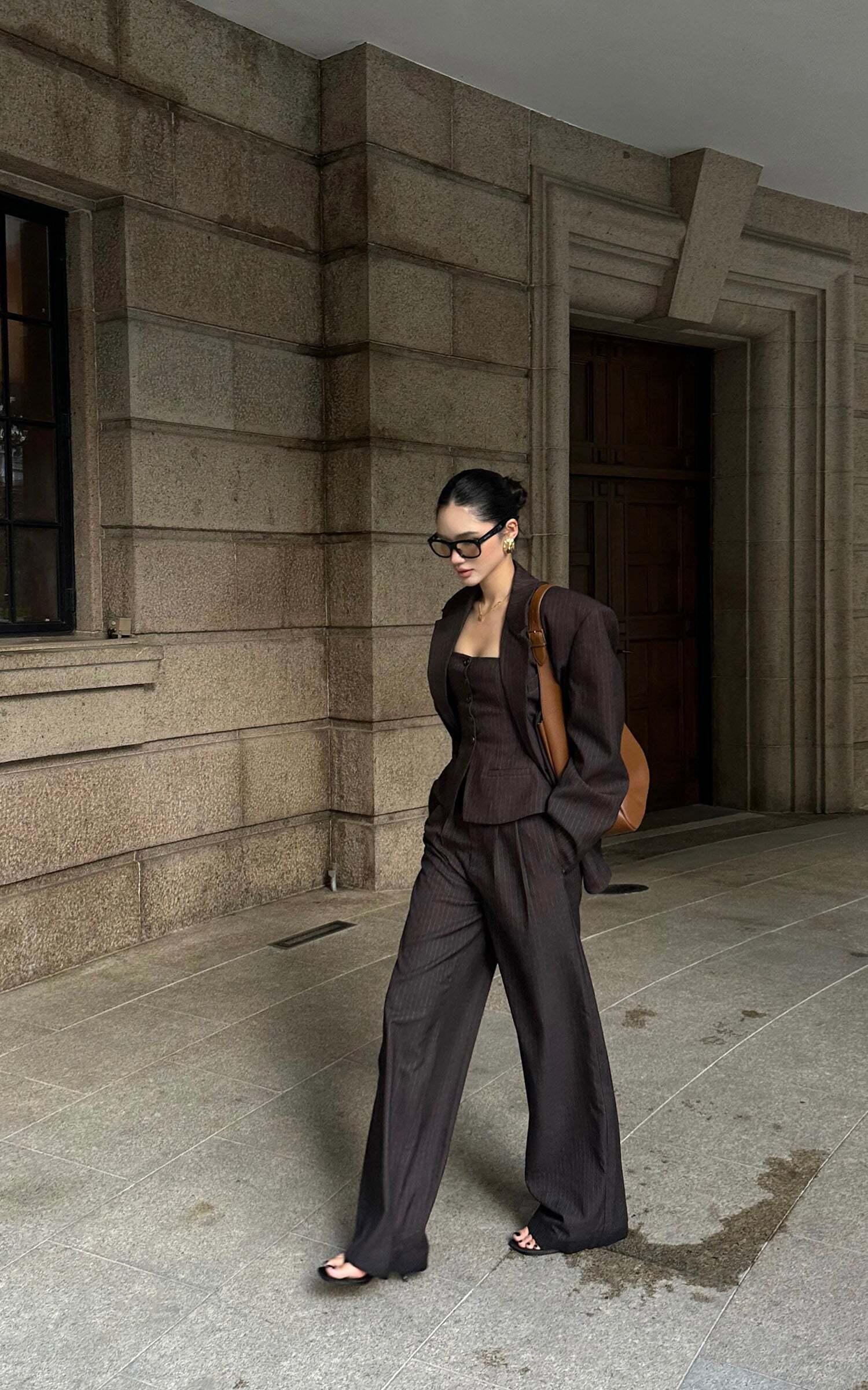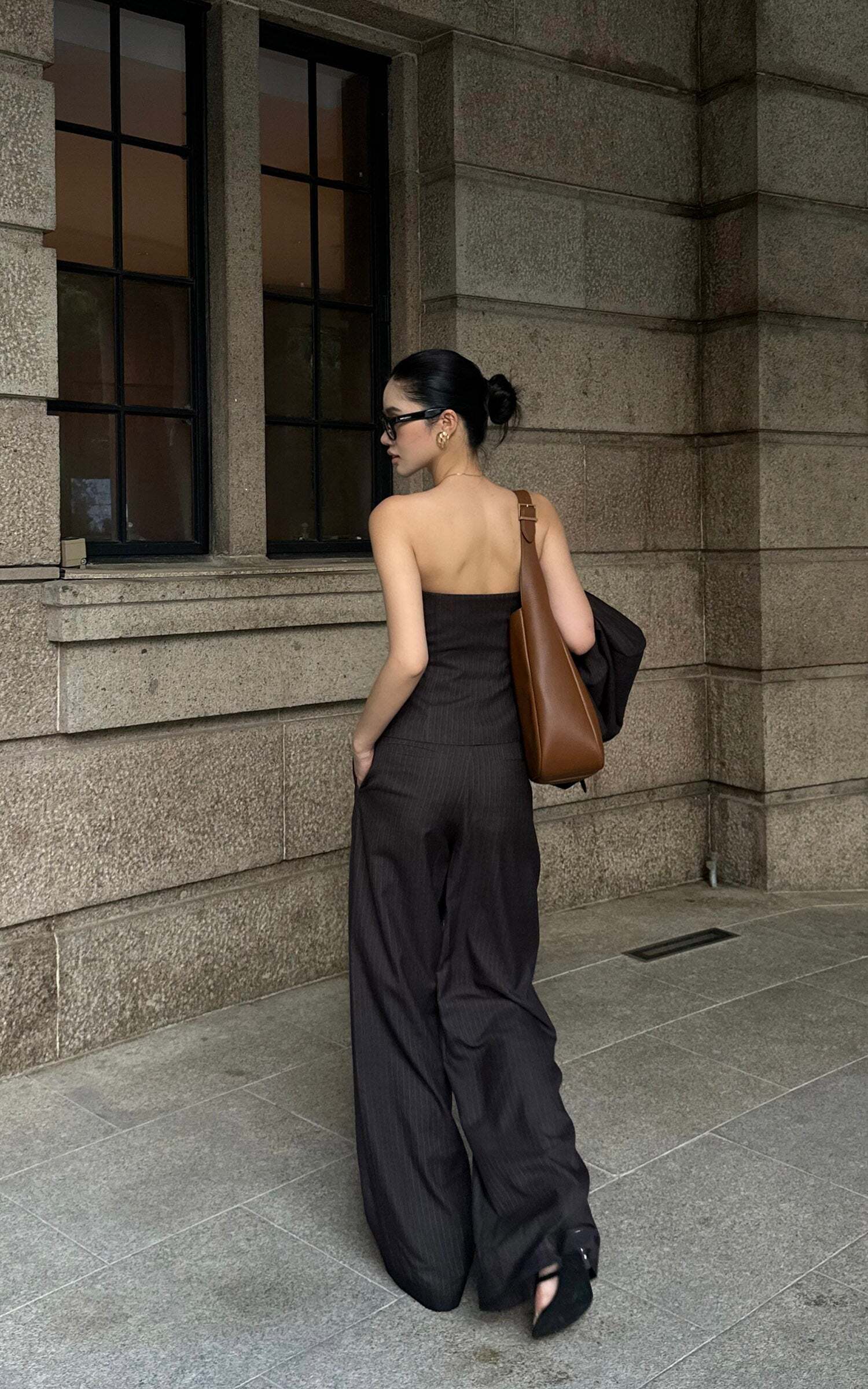 Cut from a lightweight suiting fabric with subtle pinstripes, these wide-leg trousers balance sharp tailoring with a relaxed silhouette. The high-rise waistband features belt loops and a single-button closure, leading to front pleats that add volume and fluid movement. Side pockets keep the design functional, while the clean back welt pockets maintain a streamlined look. Pair them with the matching vest or blazer for a powerfully coordinated city ensemble, or style them solo for effortless sophistication from day to night.