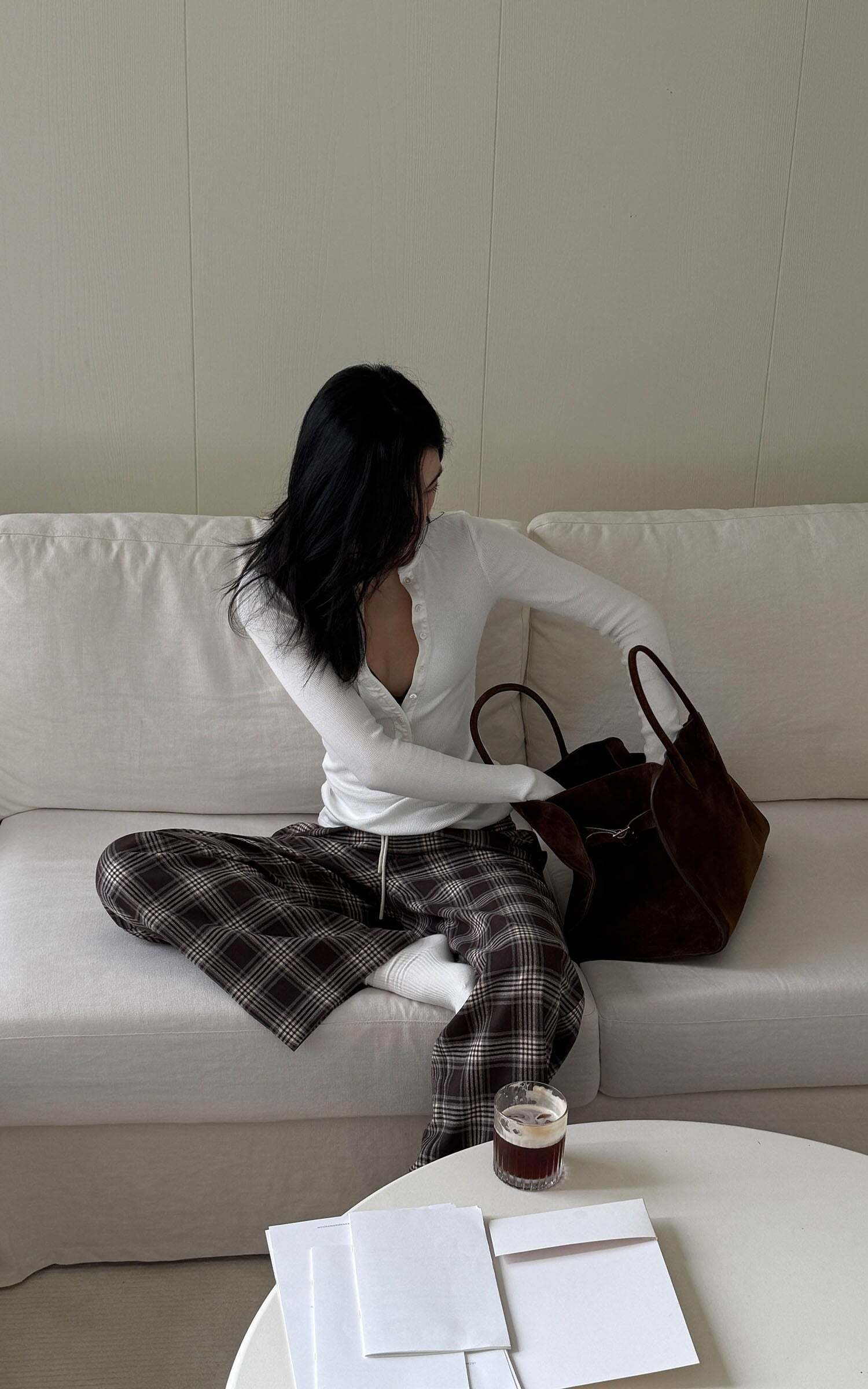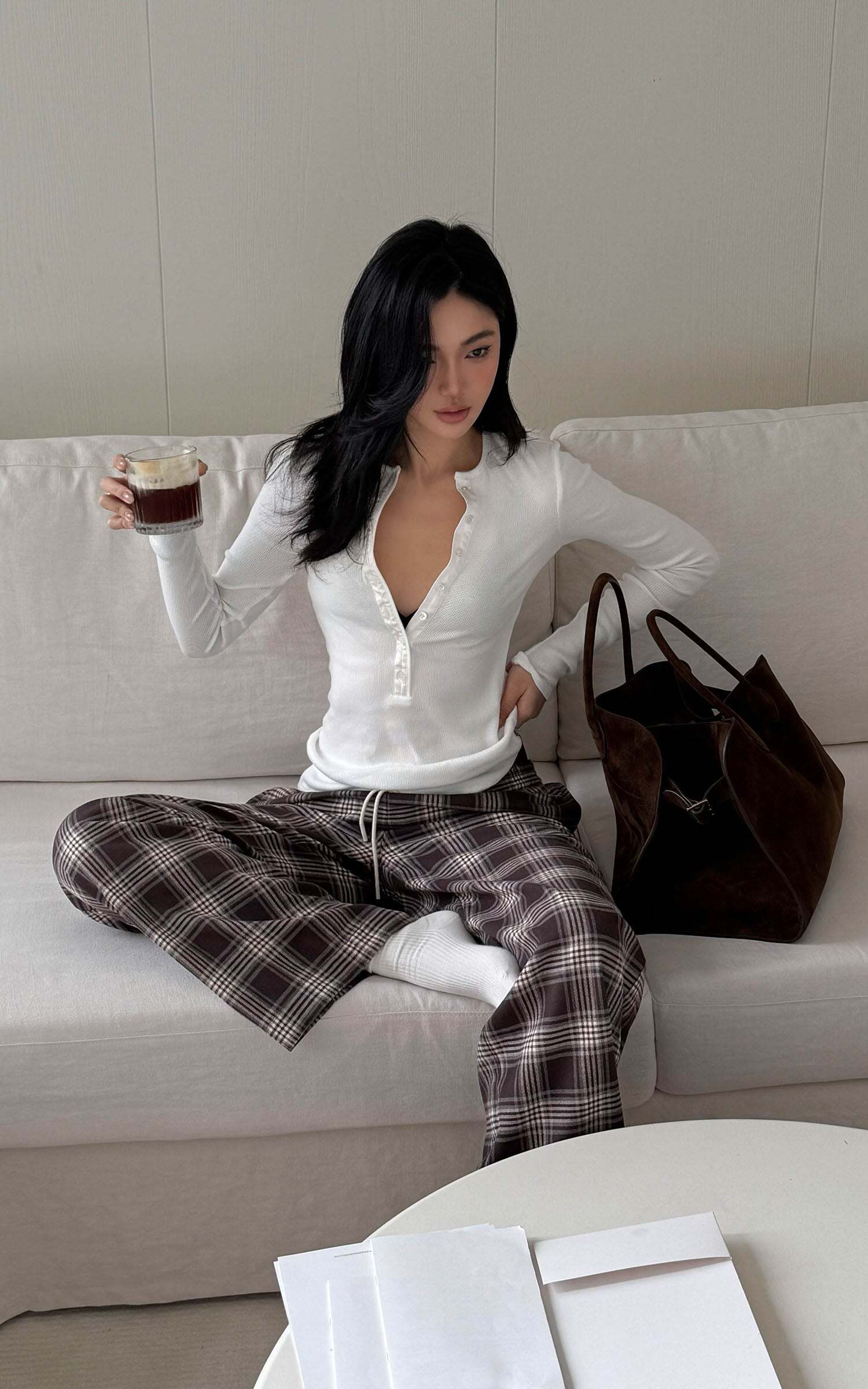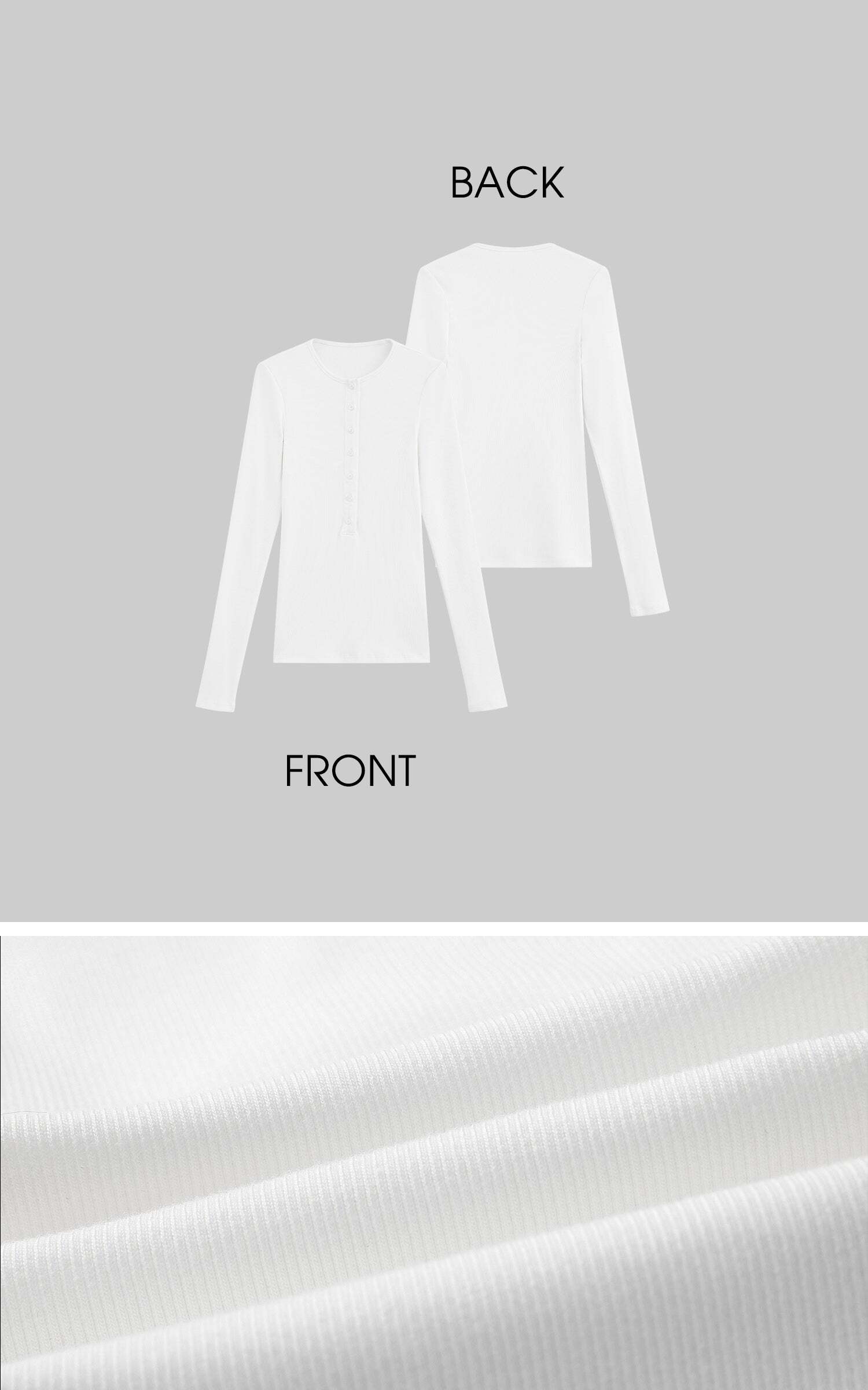 Unapologetically sensual with a sporty attitude — this fitted ribbed henley is your everyday seduction piece. Featuring a subtly stretchy texture, a deep button placket that lets you play with coverage, and long slim sleeves, it hugs your silhouette like a second skin. The off-white hue softens the boldness, making it perfect for both lounging and stepping out. Pair it with plaid trousers or layer it under oversized jackets for a downtown edge.