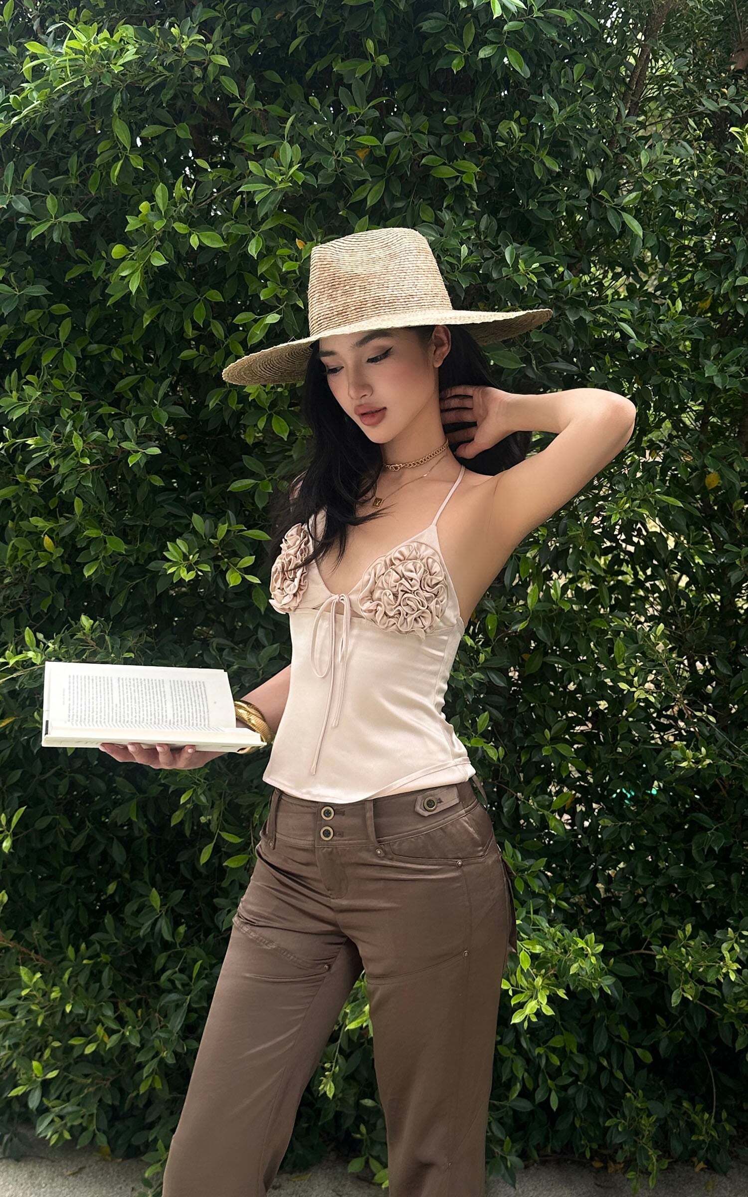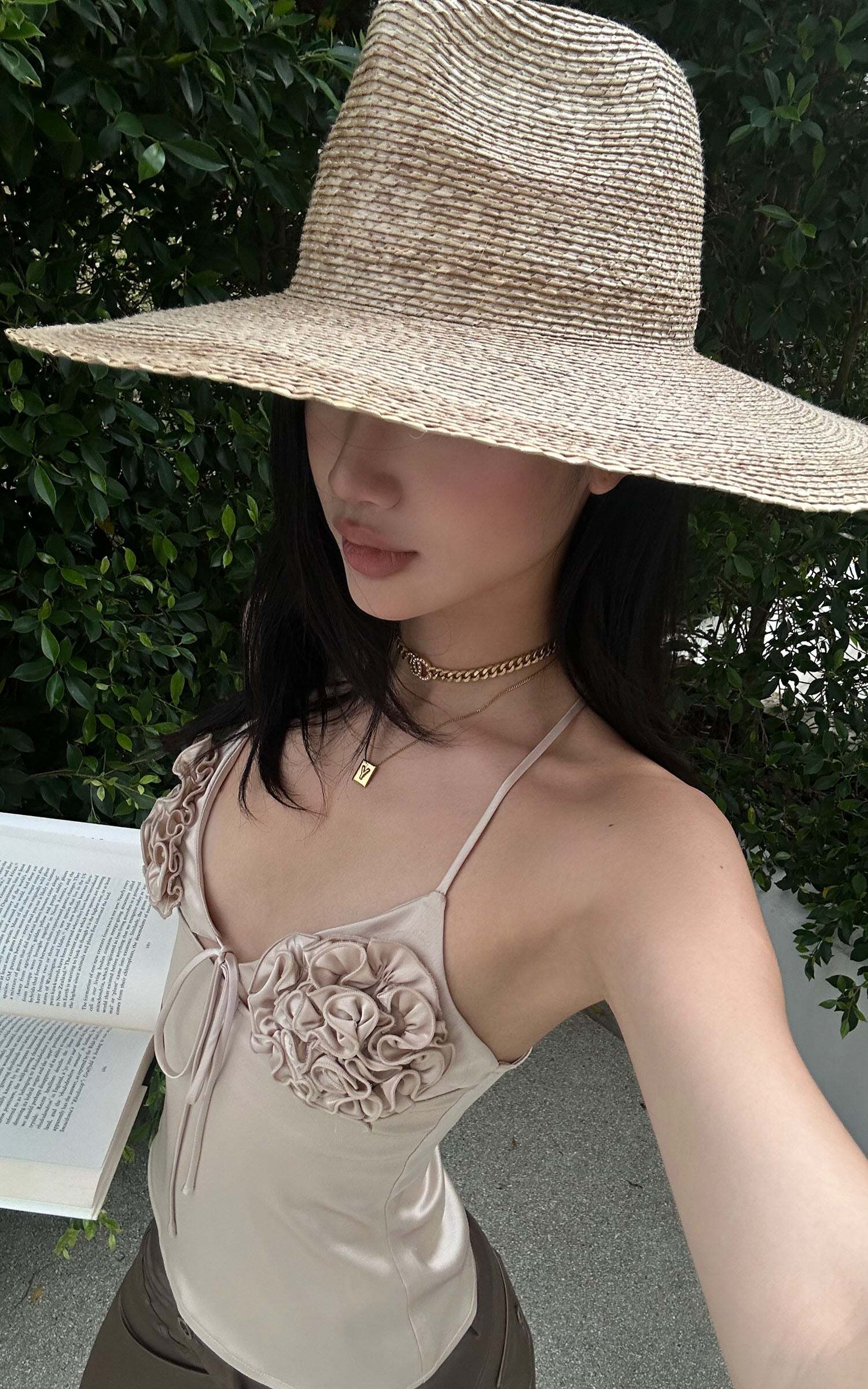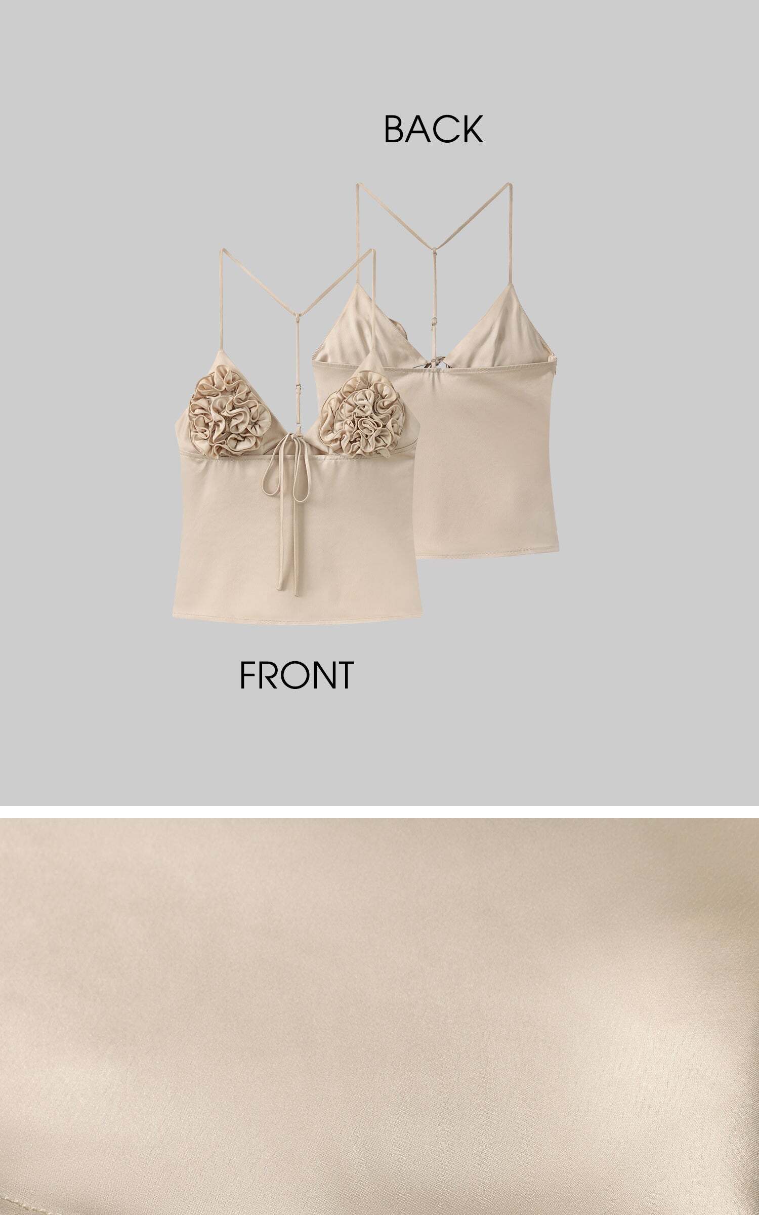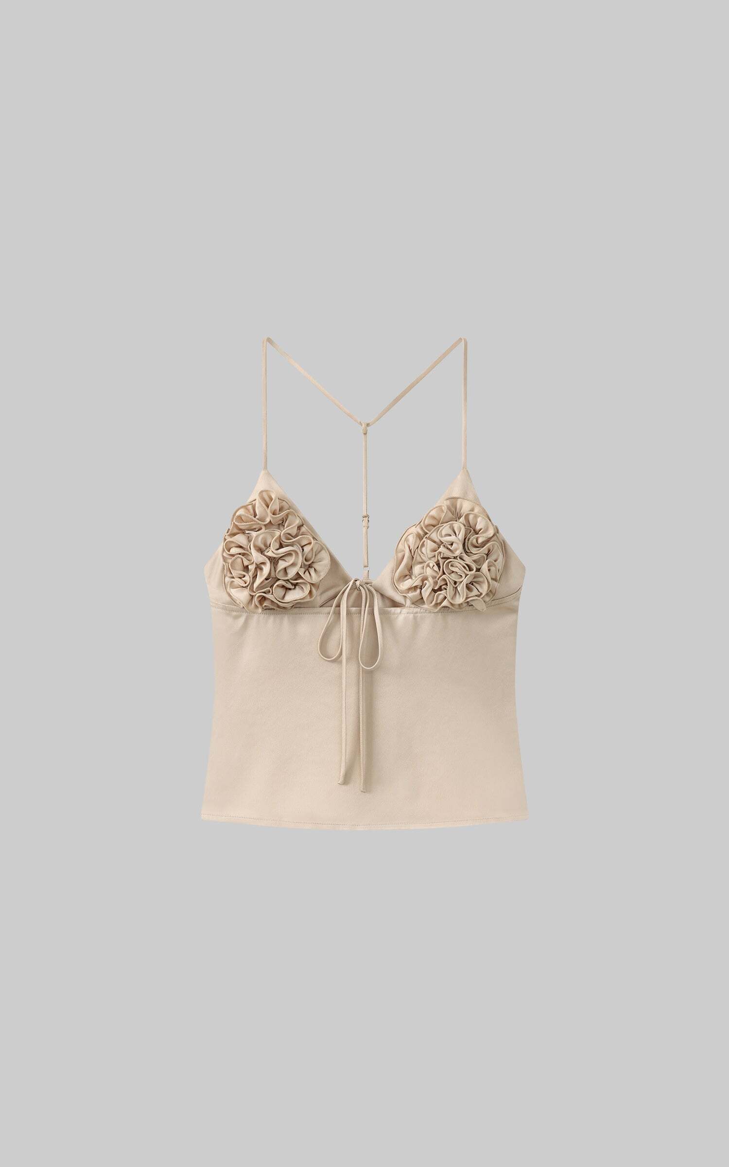 Delicate and sculptural, this camisole is a quiet celebration of sensuality. Crafted from a soft satin fabric that caresses the body, its cups are adorned with three-dimensional rosette appliqués—floral folds that bloom with every glance. Adjustable thin straps and a center-front tie ensure a flattering, custom fit. Whether worn alone or layered under tailoring, it adds a dose of poetic drama to any look.