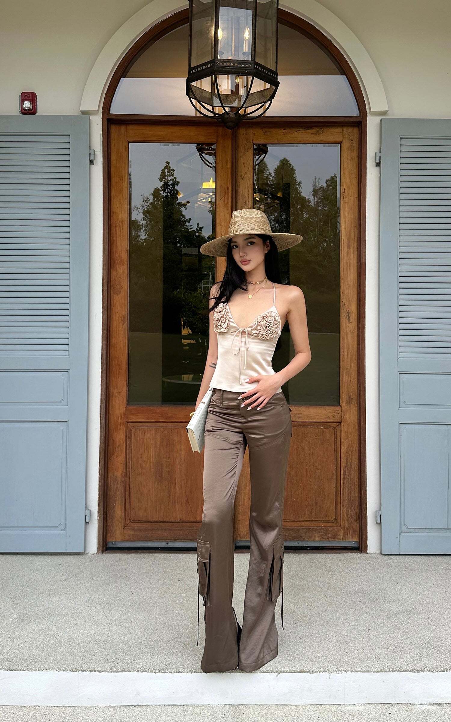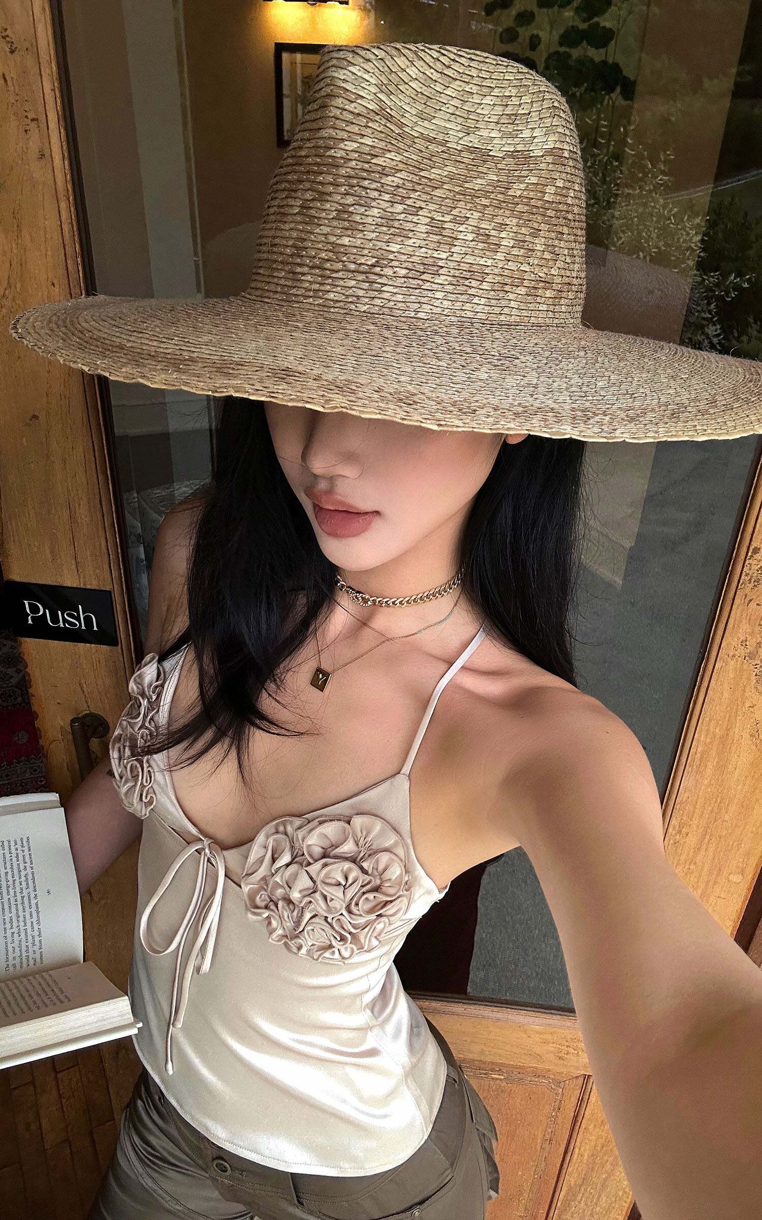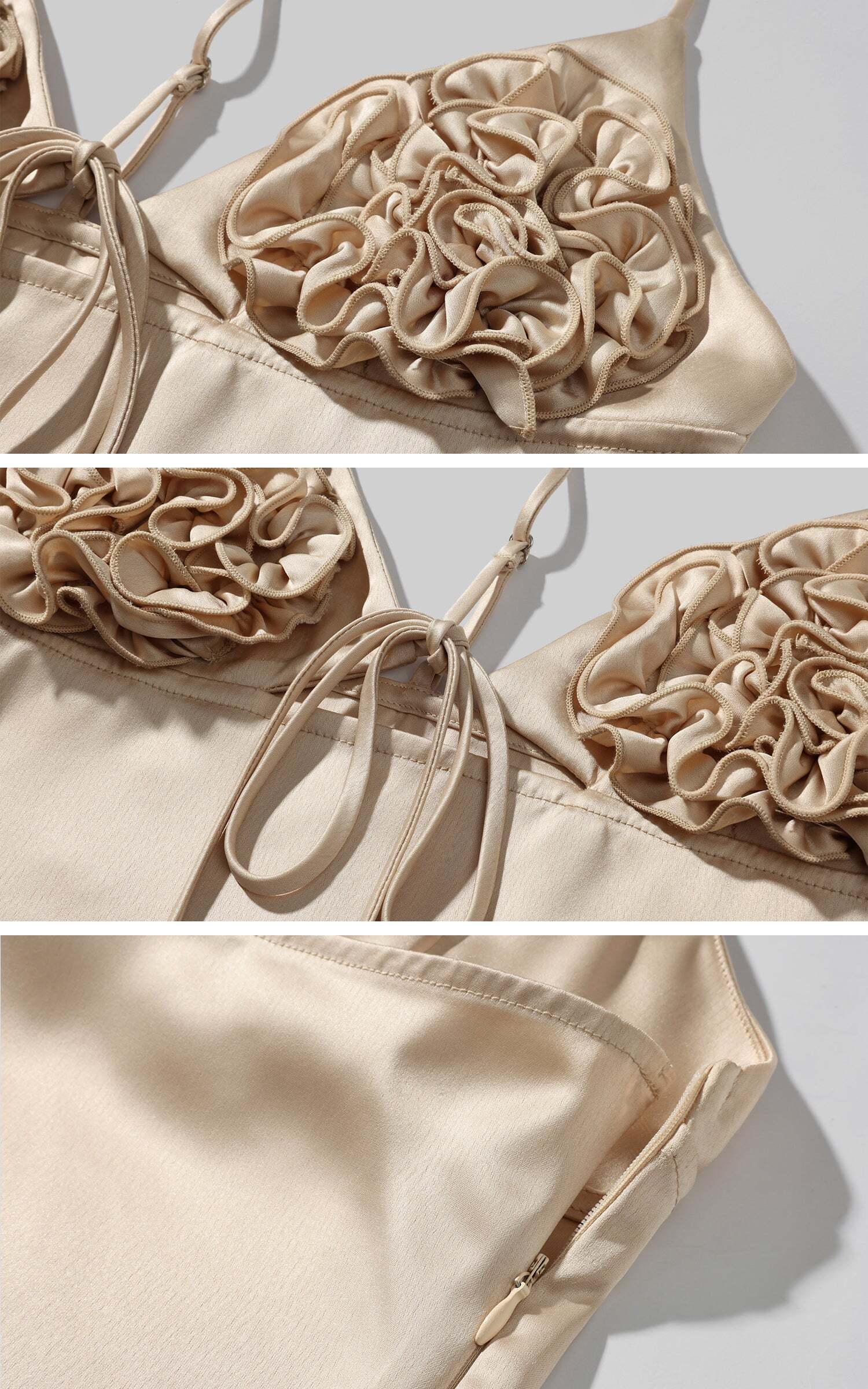 Delicate and sculptural, this camisole is a quiet celebration of sensuality. Crafted from a soft satin fabric that caresses the body, its cups are adorned with three-dimensional rosette appliqués—floral folds that bloom with every glance. Adjustable thin straps and a center-front tie ensure a flattering, custom fit. Whether worn alone or layered under tailoring, it adds a dose of poetic drama to any look.