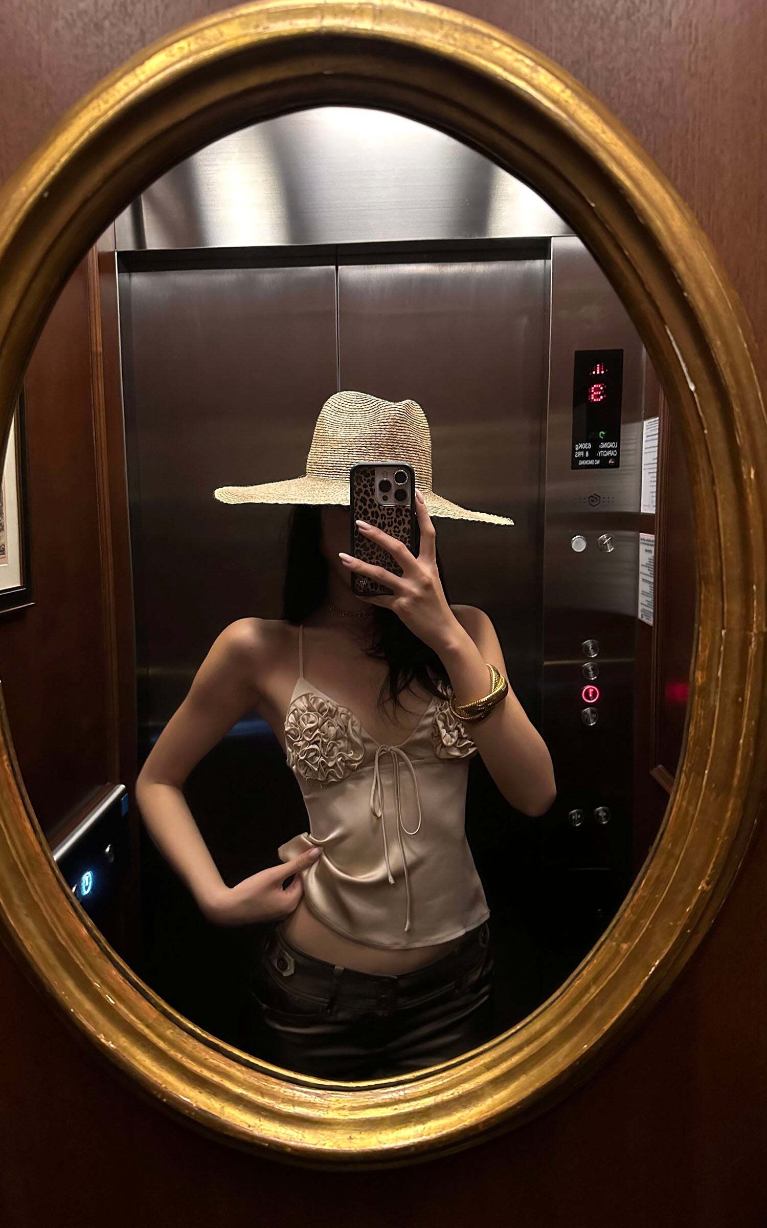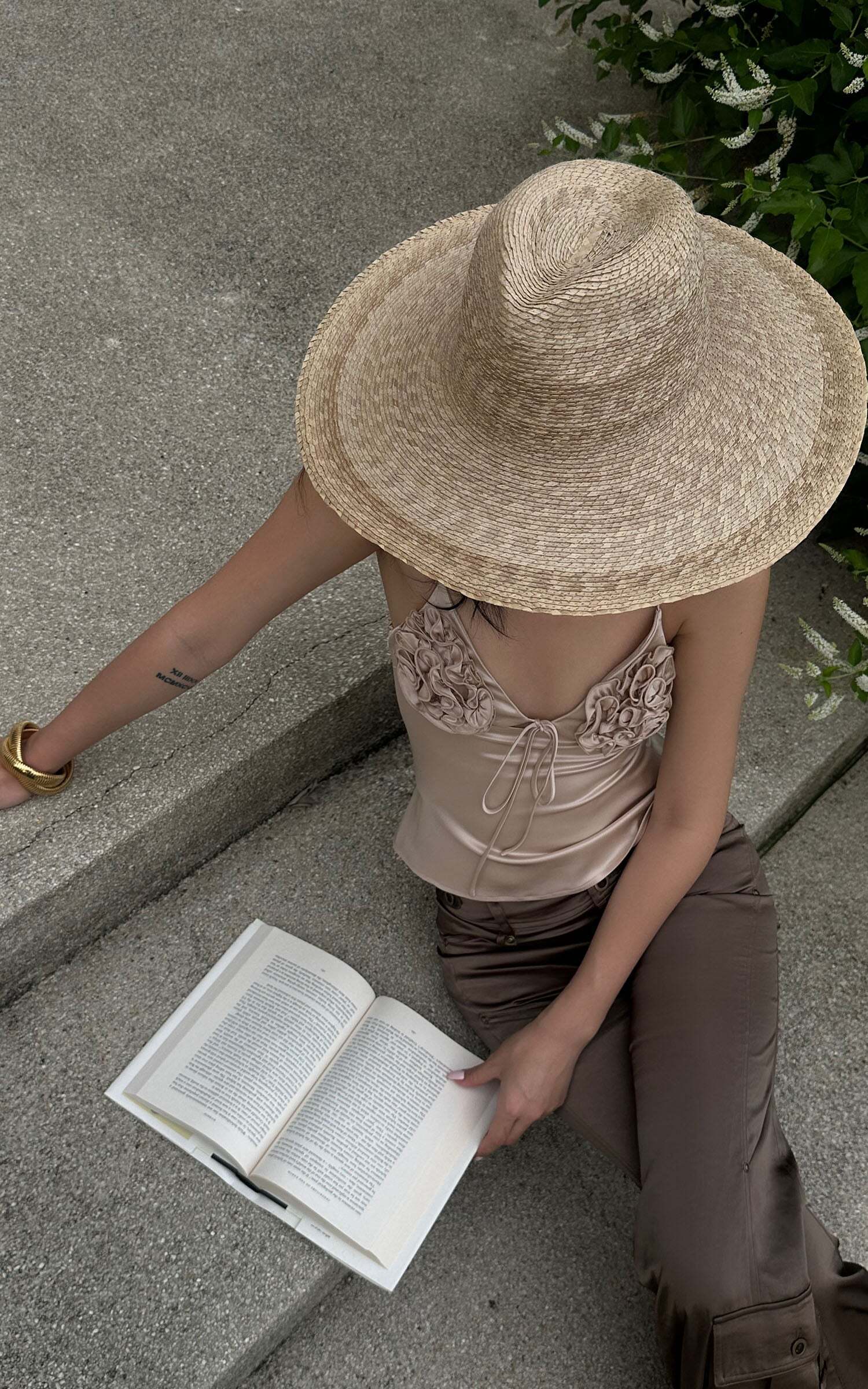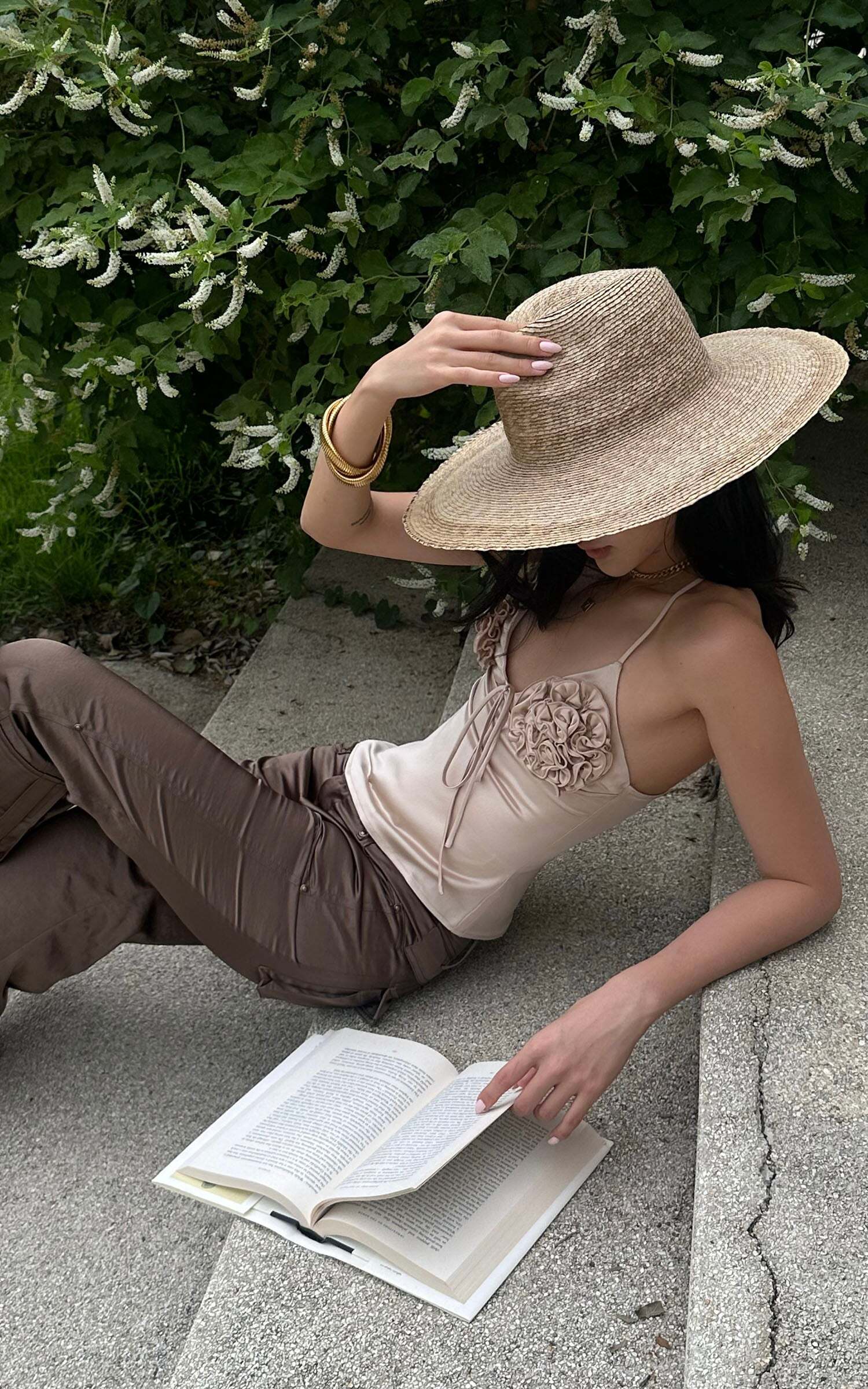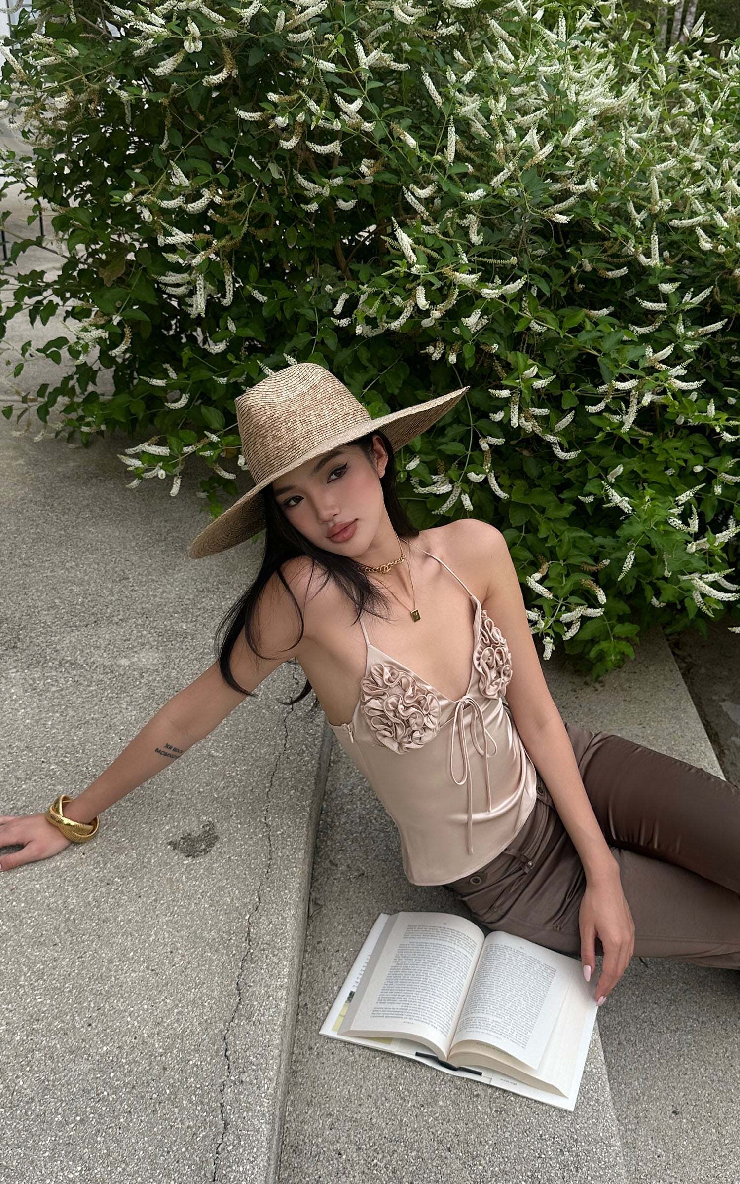 Delicate and sculptural, this camisole is a quiet celebration of sensuality. Crafted from a soft satin fabric that caresses the body, its cups are adorned with three-dimensional rosette appliqués—floral folds that bloom with every glance. Adjustable thin straps and a center-front tie ensure a flattering, custom fit. Whether worn alone or layered under tailoring, it adds a dose of poetic drama to any look.