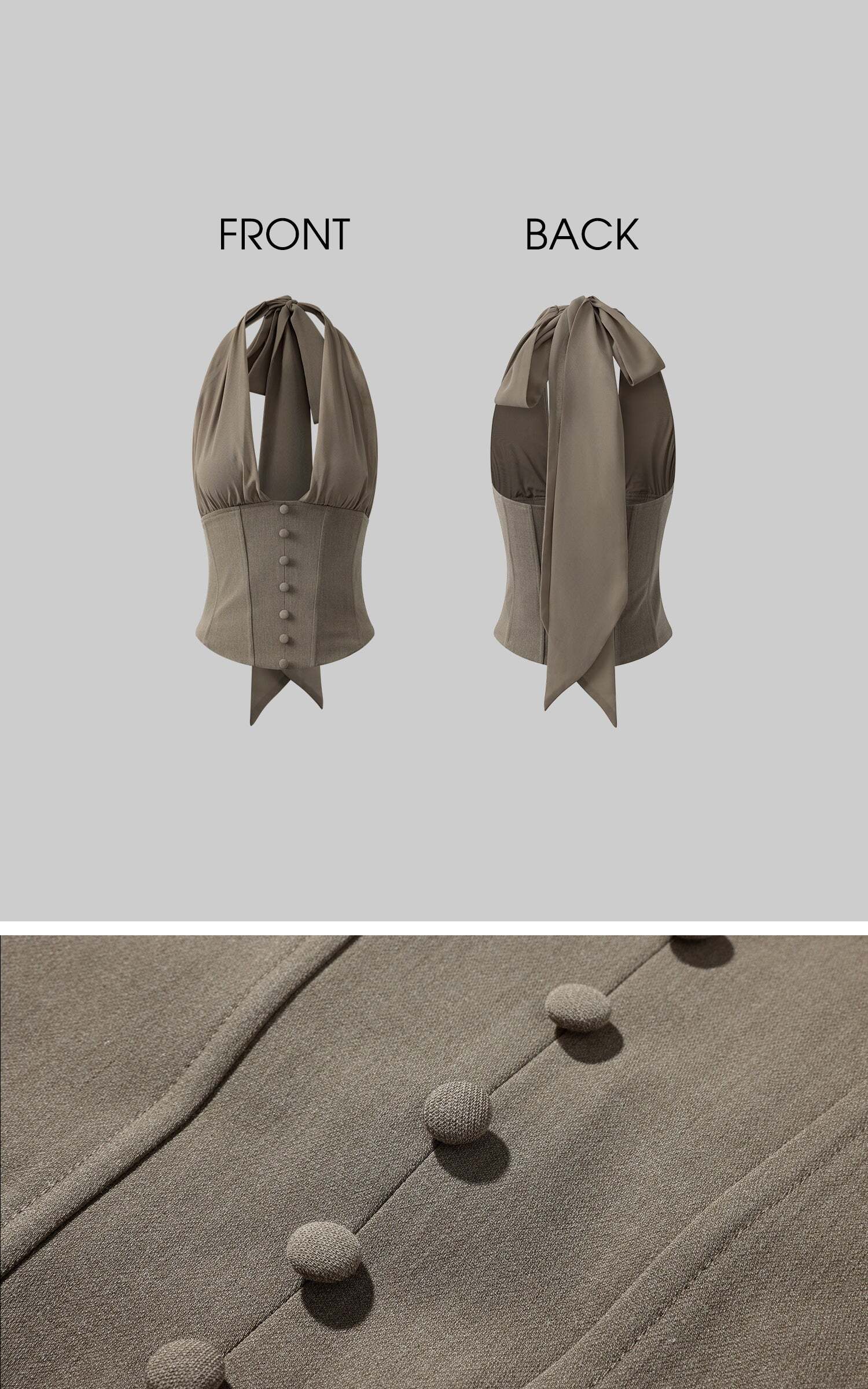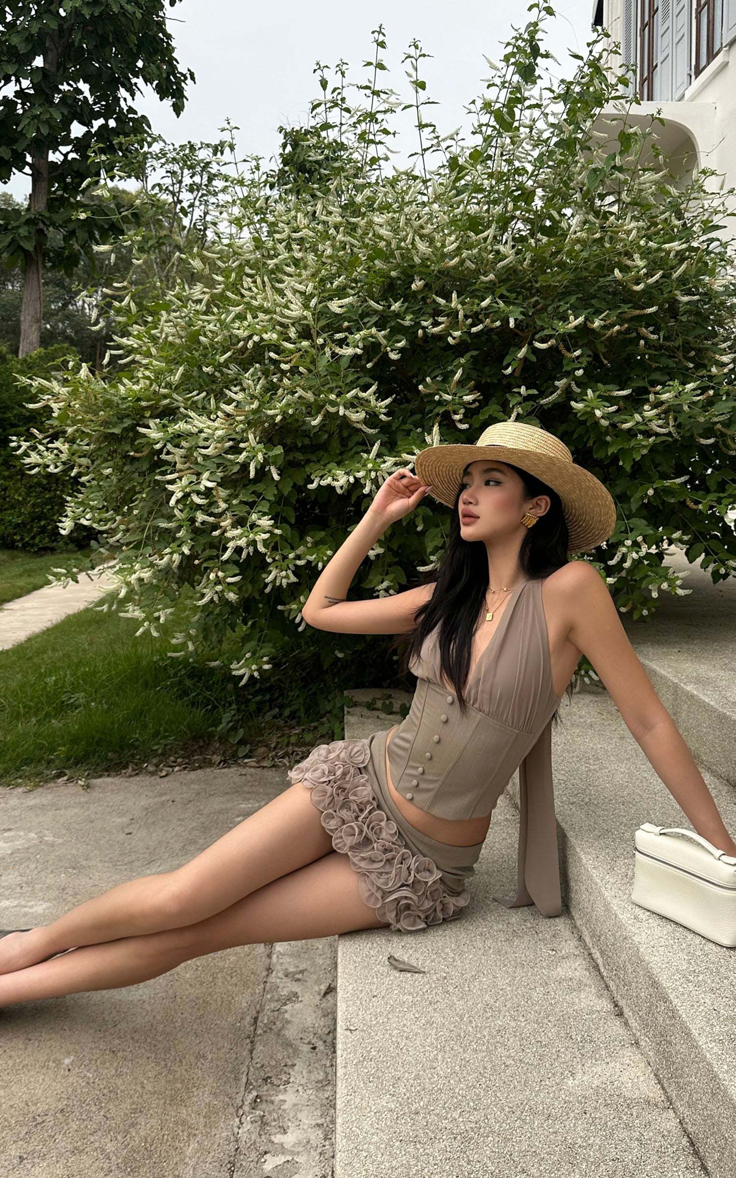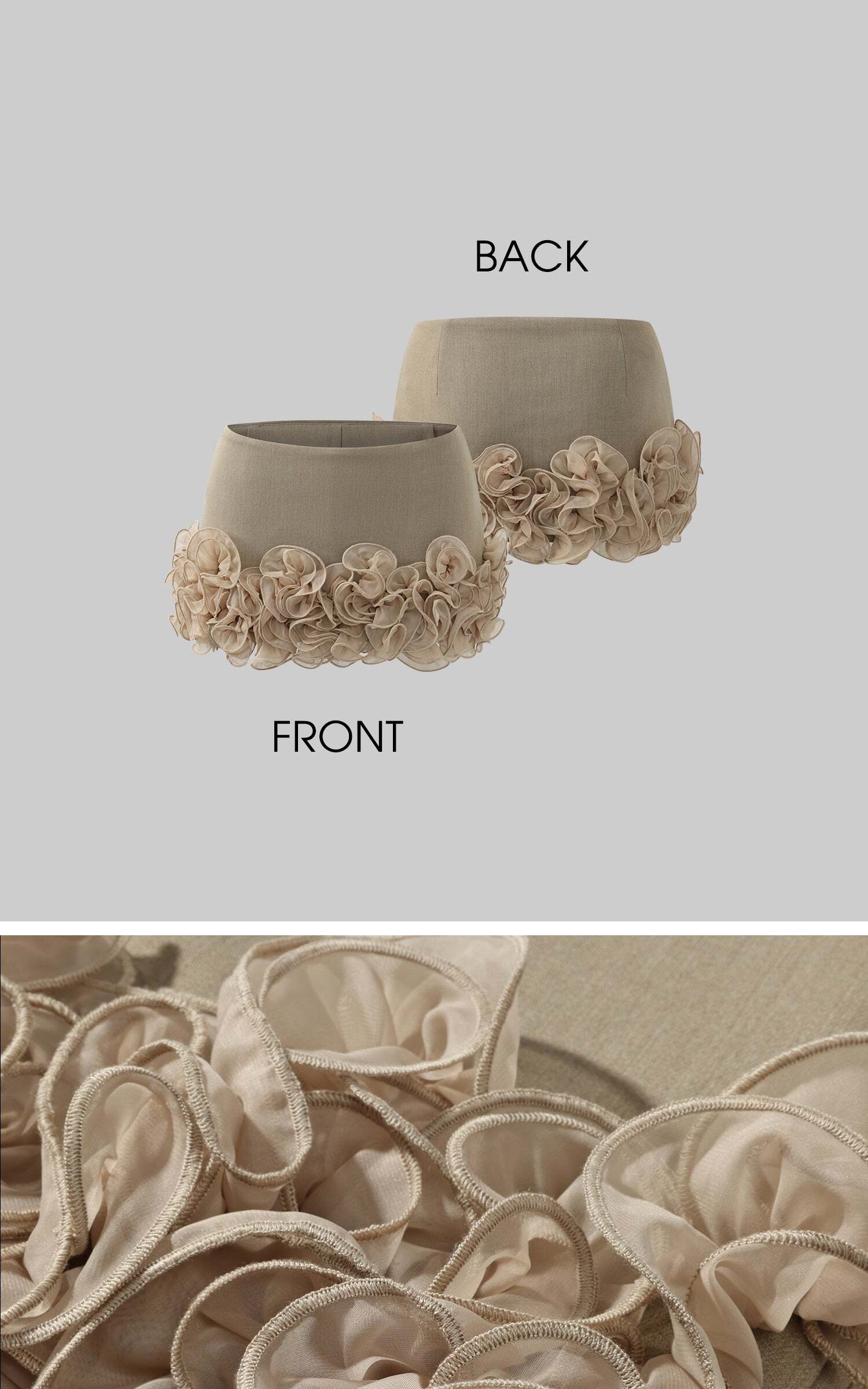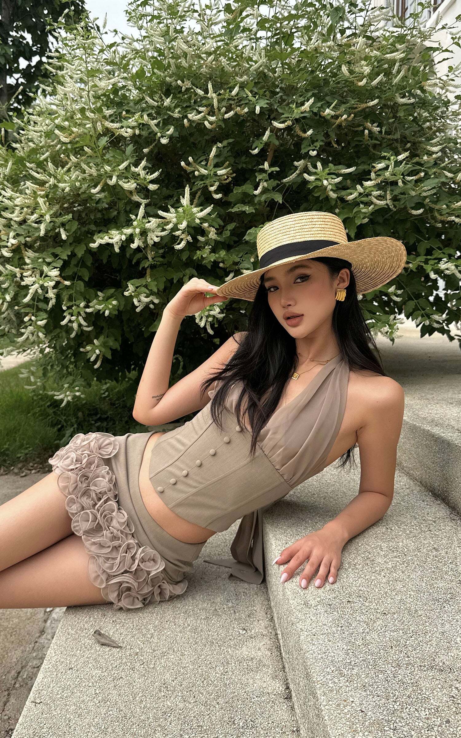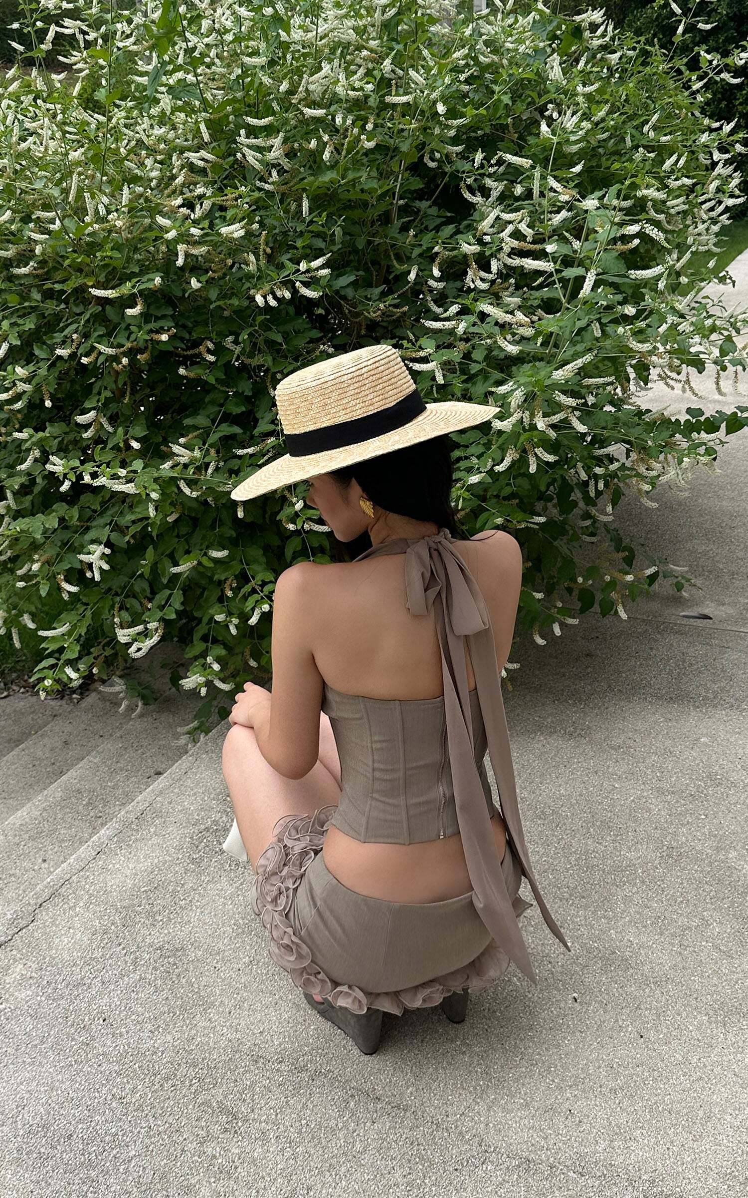 This matching set is made to mesmerize — a flirtatious fusion of soft florals and sculpted tailoring. The halter top cinches the waist with a corset-like silhouette and a dramatic sash tie at the back, while the low-rise mini skirt blooms with delicate 3D rosettes that add playful volume and romantic flair. Perfect for outdoor brunches, garden strolls, or spontaneous summer escapes, this look captures effortless sensuality with couture-level detail.