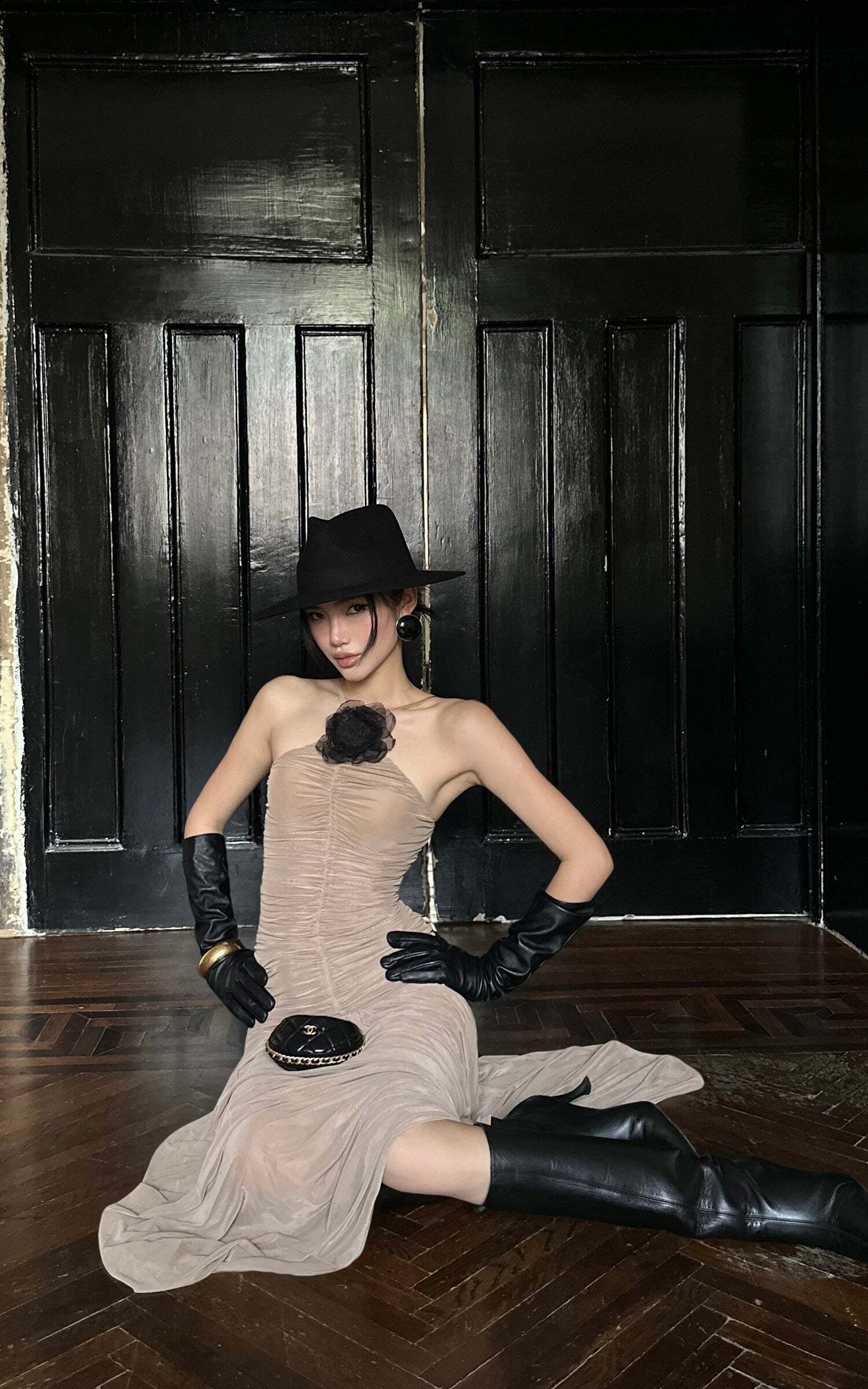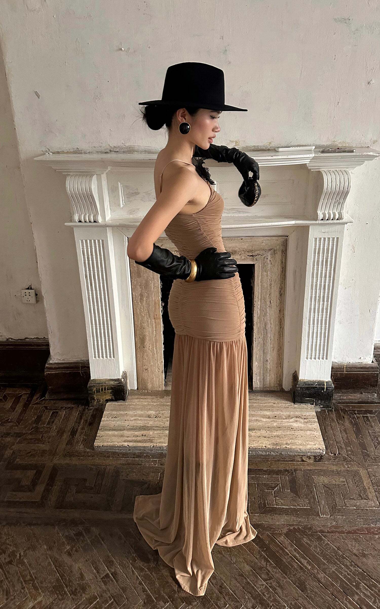 A statement silhouette that merges sultry minimalism with bold drama. Designed in sheer stretch mesh, this maxi dress clings to the body with ruched detailing along the torso, before releasing into a fluid, floor-length hem. The delicate spaghetti straps frame the shoulders, while a detachable black floral brooch at the bust adds a striking focal point. Perfect for after-dark entrances or styling with sculptural accessories, it exudes effortless allure and modern elegance.
