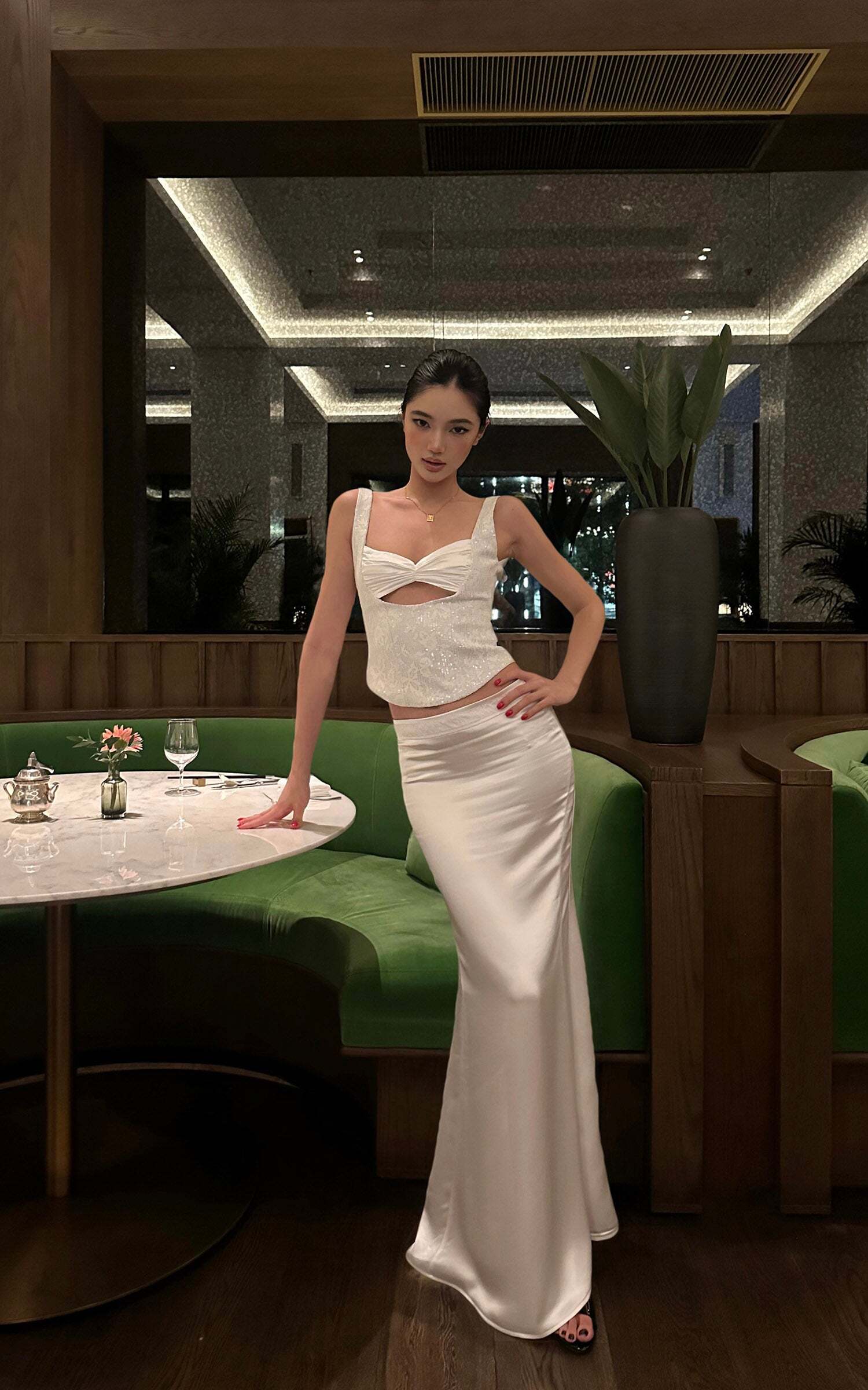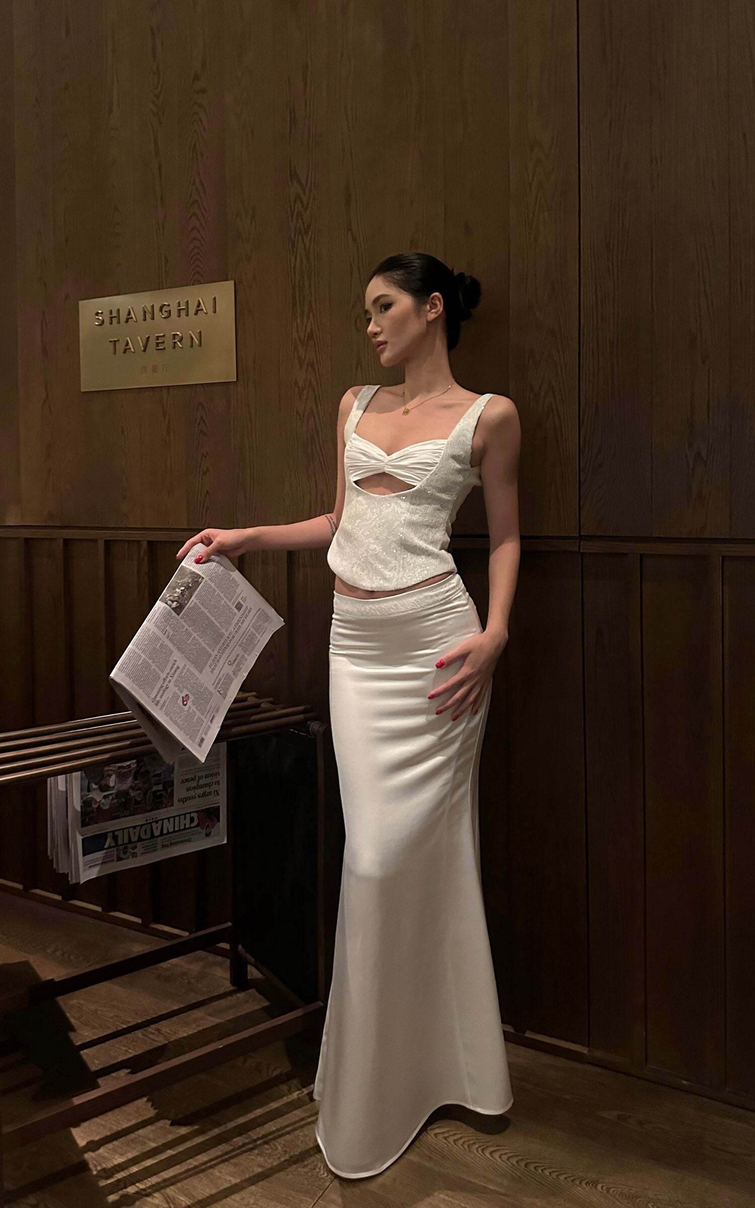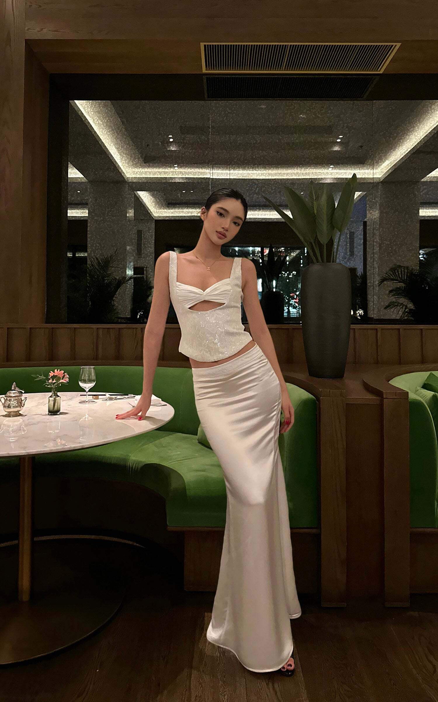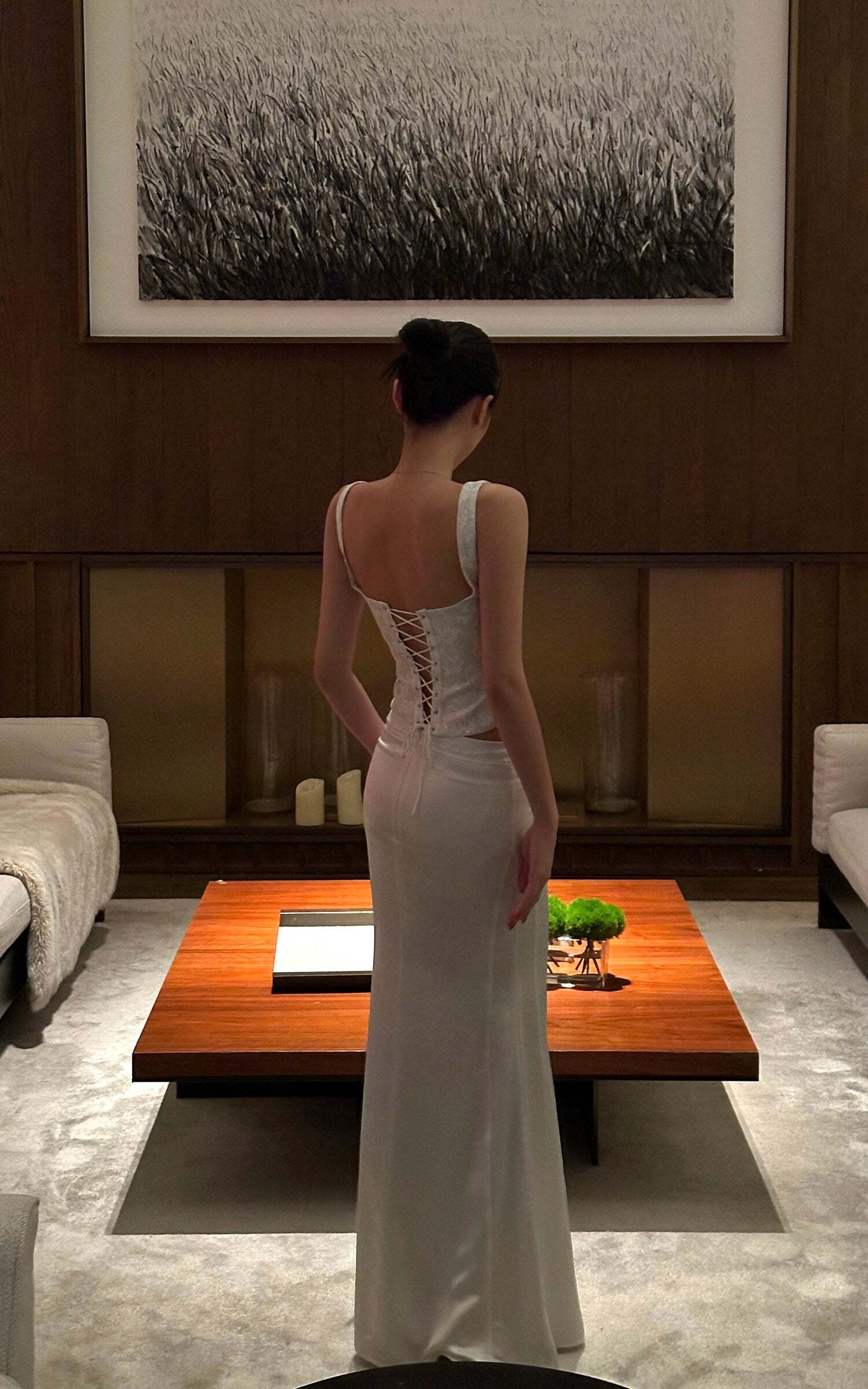 A sleek two-piece with a touch of allure. The tank top features a delicate lace overlay with a ruched satin bust and front cutout, while the lace-up back detail adds a modern twist. The high-waisted satin mermaid skirt glides smoothly over the hips, flaring subtly at the hem for fluid movement. Perfect for evening moments that call for both elegance and edge.