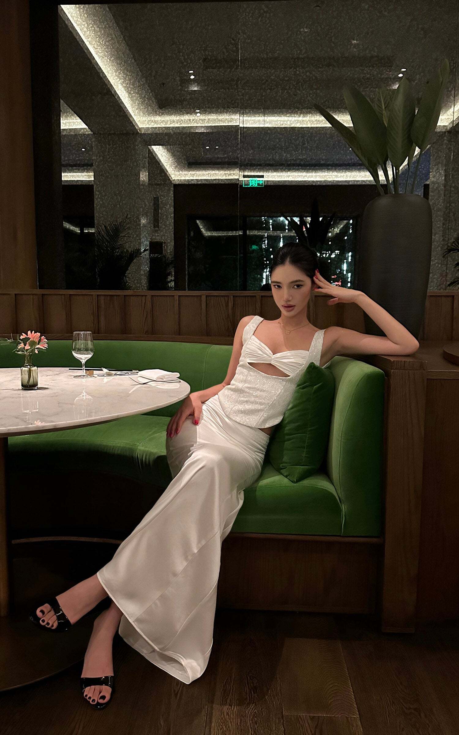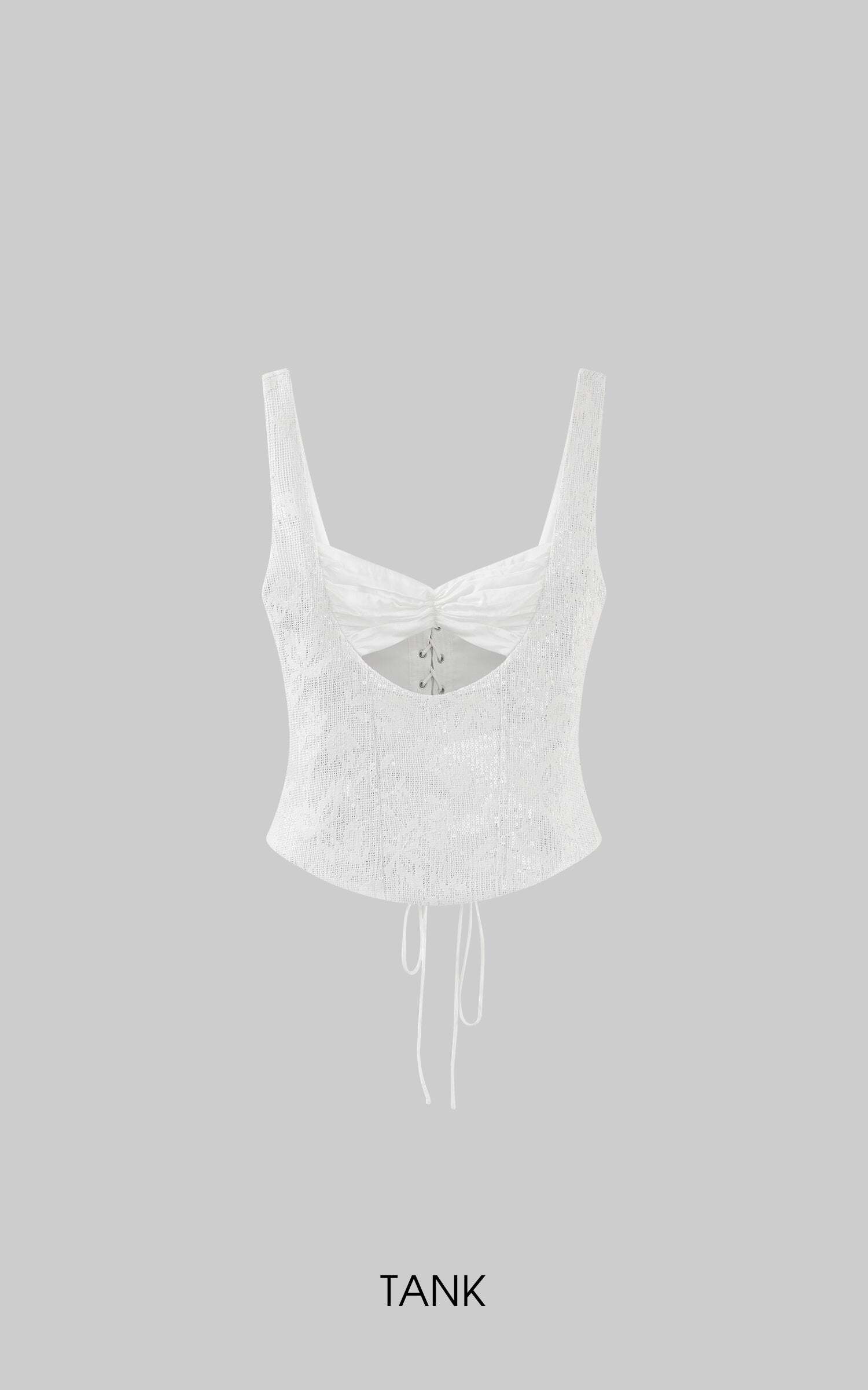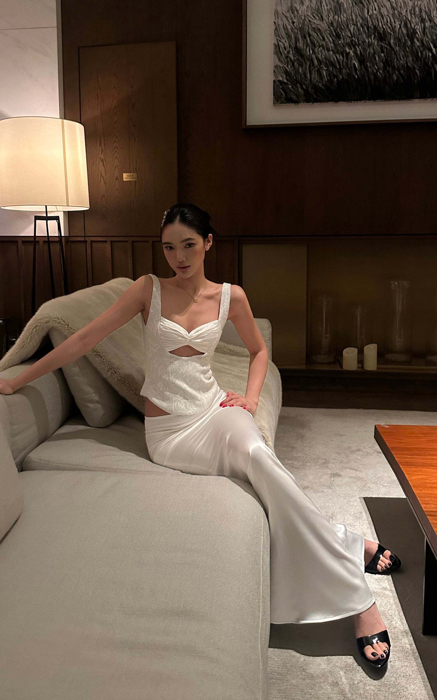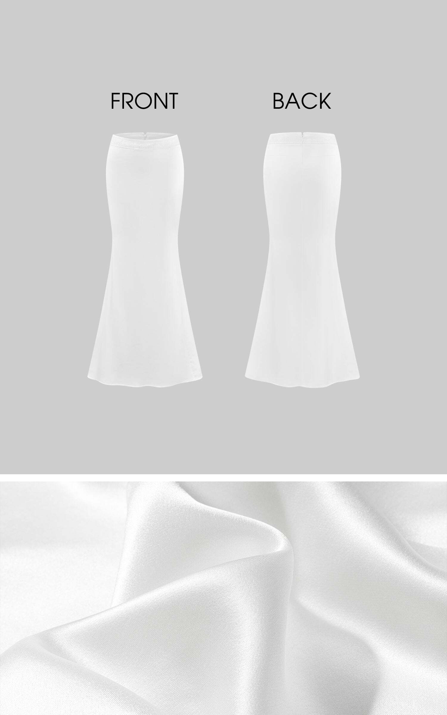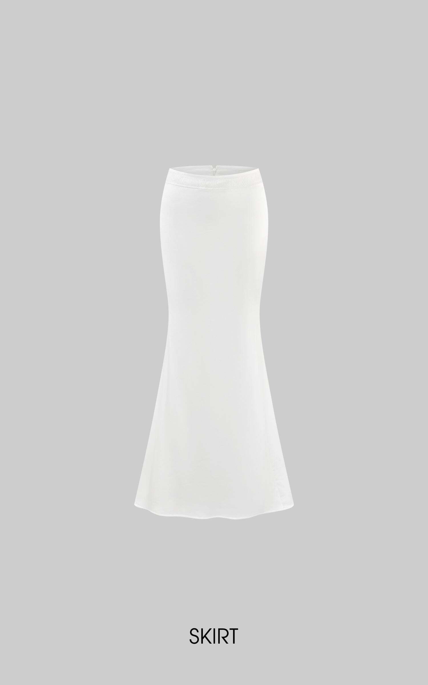 A sleek two-piece with a touch of allure. The tank top features a delicate lace overlay with a ruched satin bust and front cutout, while the lace-up back detail adds a modern twist. The high-waisted satin mermaid skirt glides smoothly over the hips, flaring subtly at the hem for fluid movement. Perfect for evening moments that call for both elegance and edge.