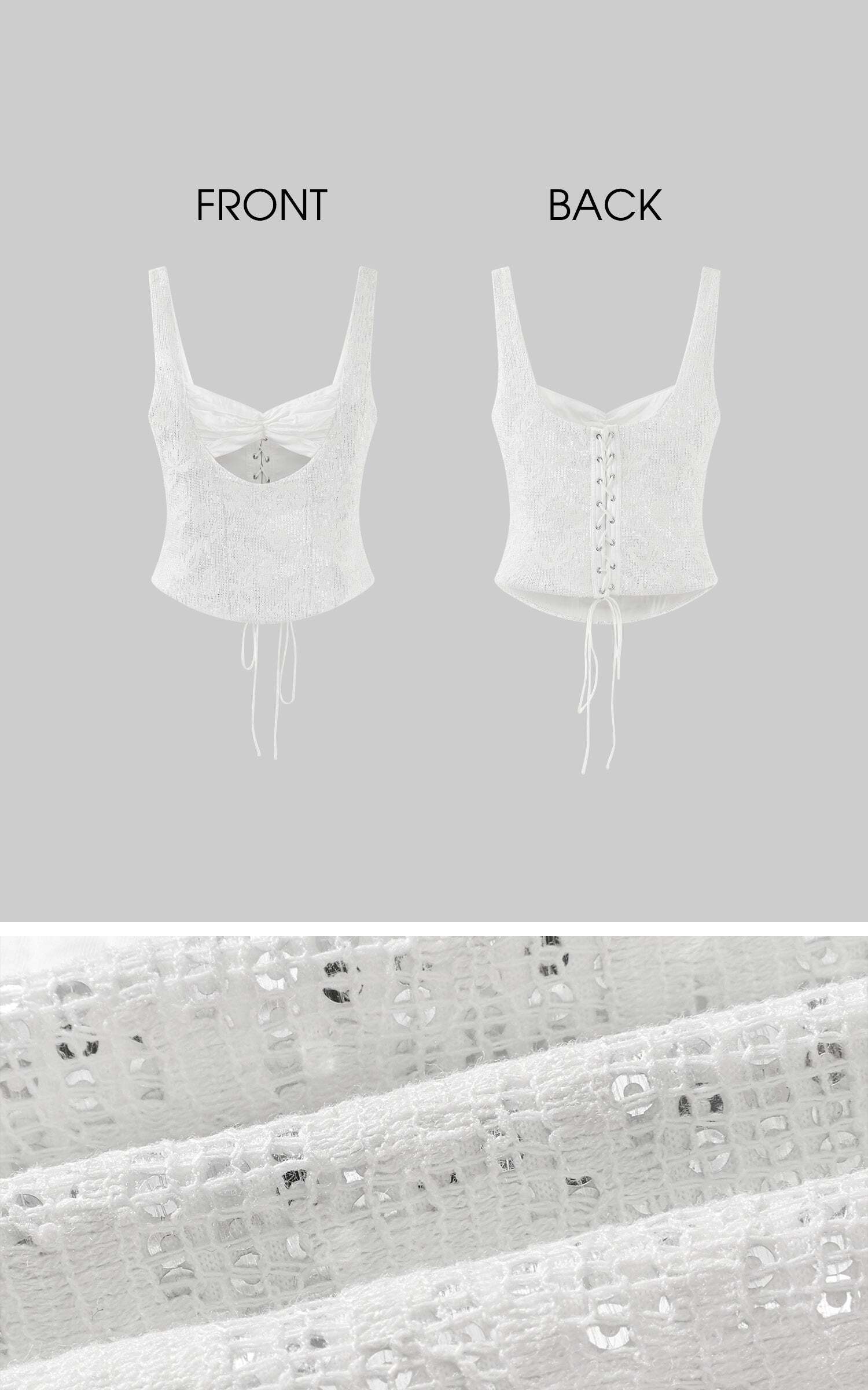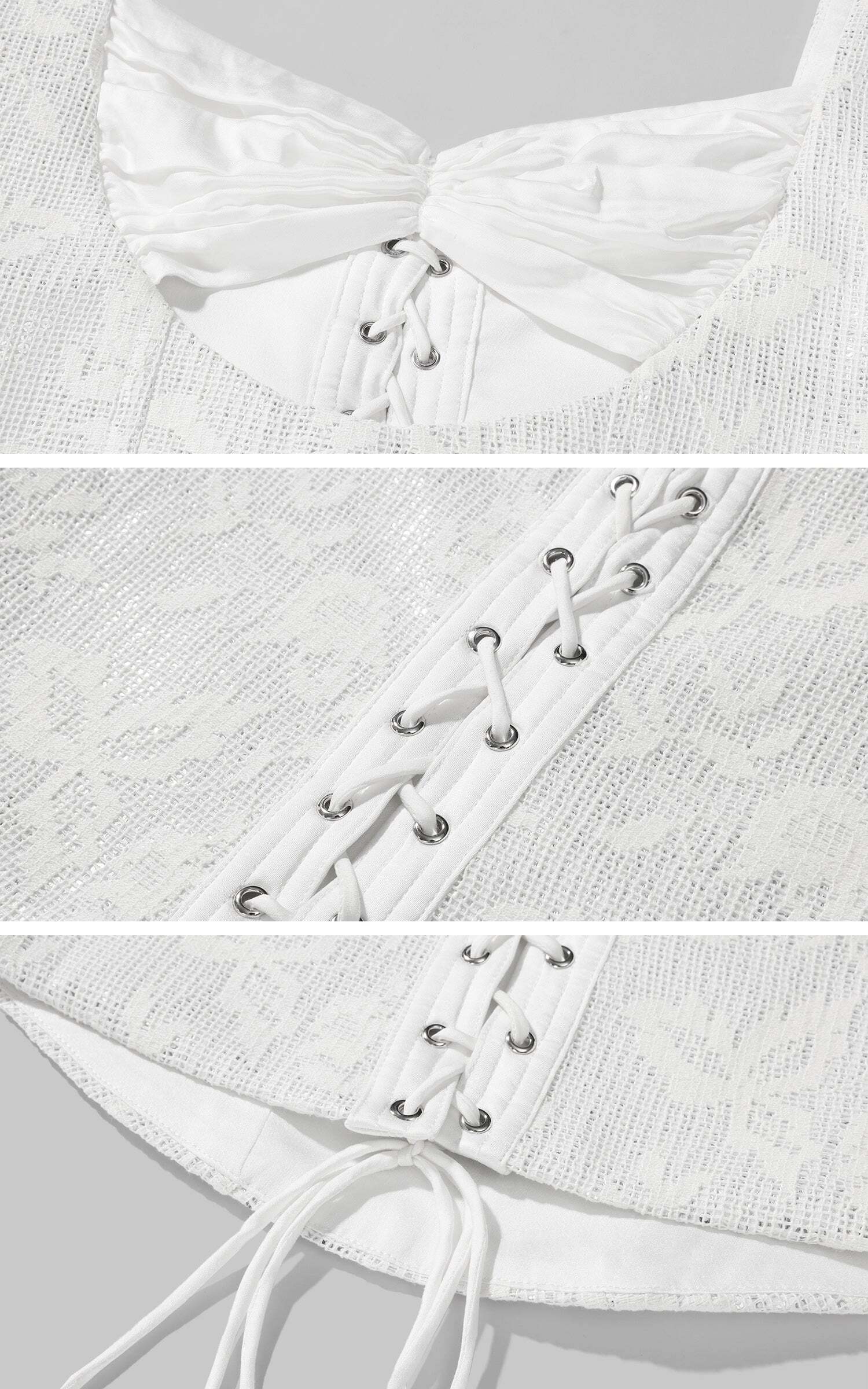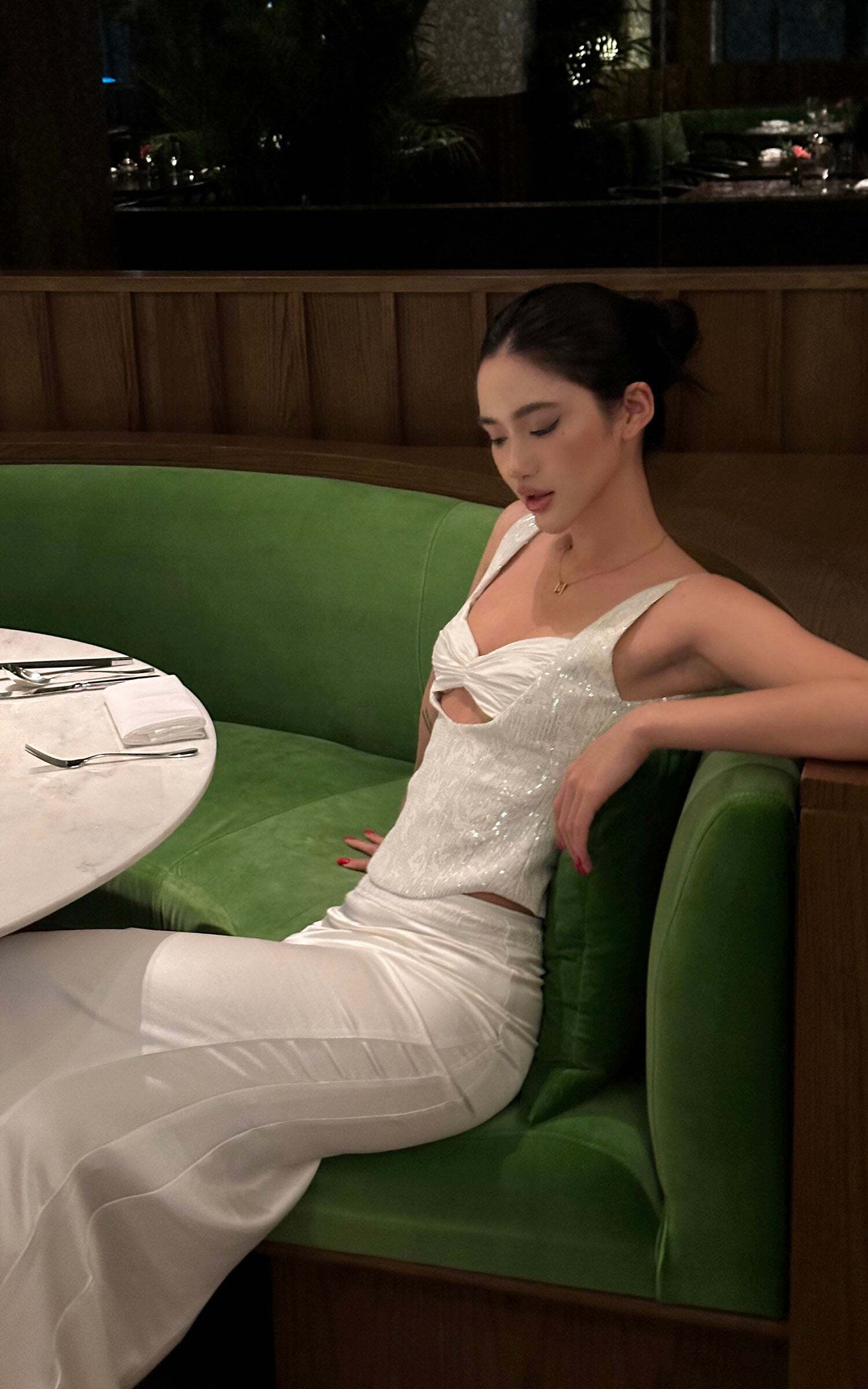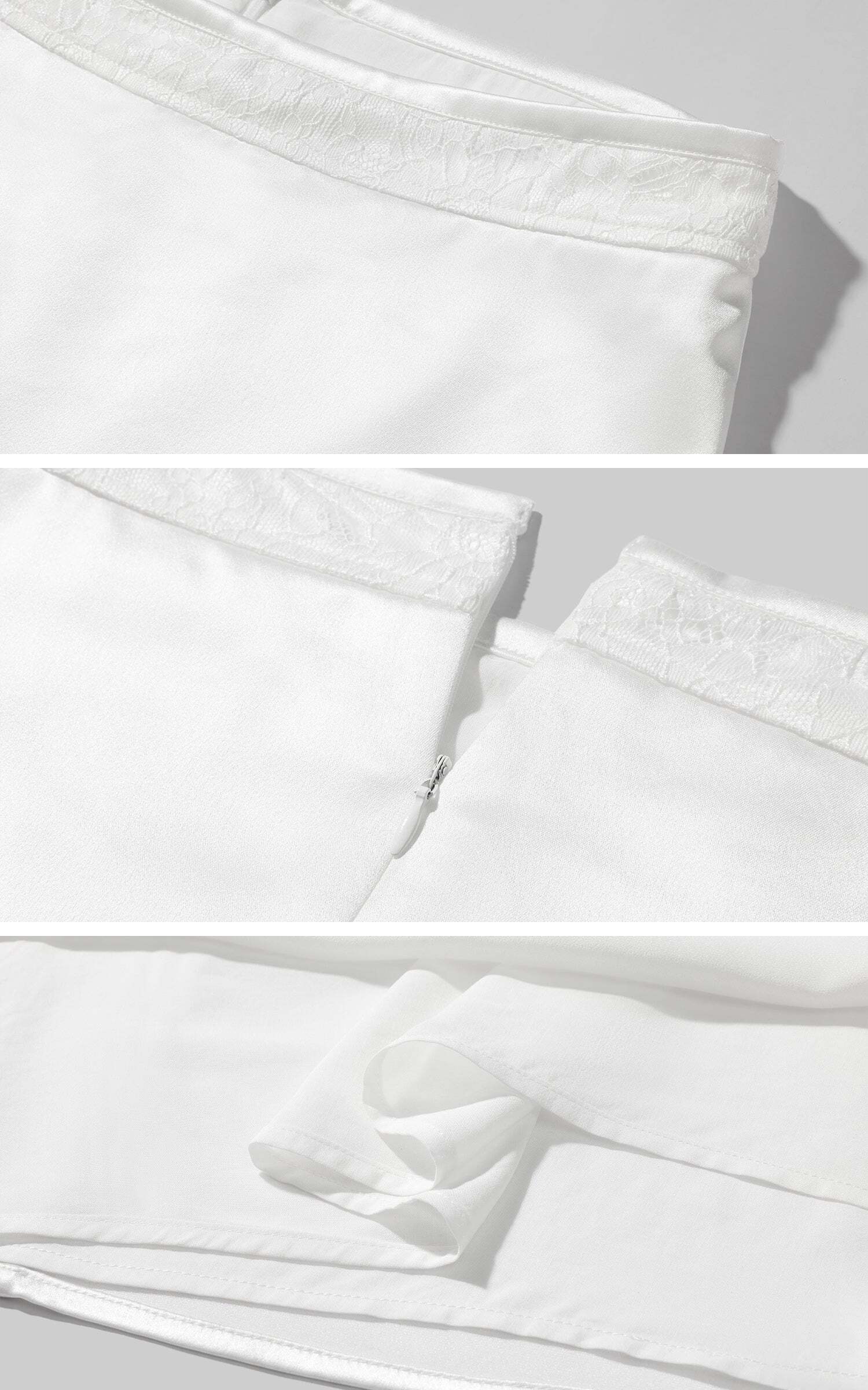 A sleek two-piece with a touch of allure. The tank top features a delicate lace overlay with a ruched satin bust and front cutout, while the lace-up back detail adds a modern twist. The high-waisted satin mermaid skirt glides smoothly over the hips, flaring subtly at the hem for fluid movement. Perfect for evening moments that call for both elegance and edge.