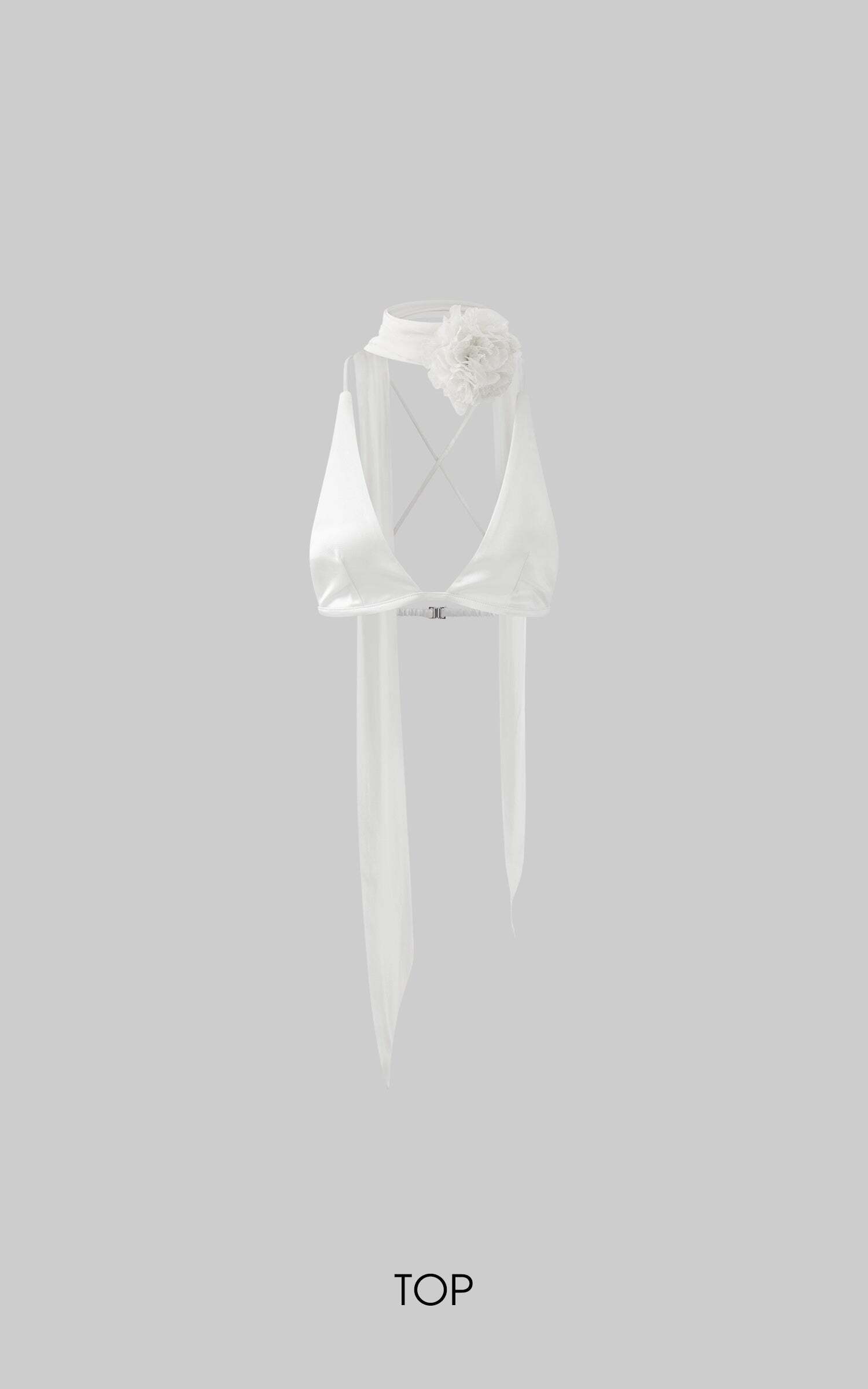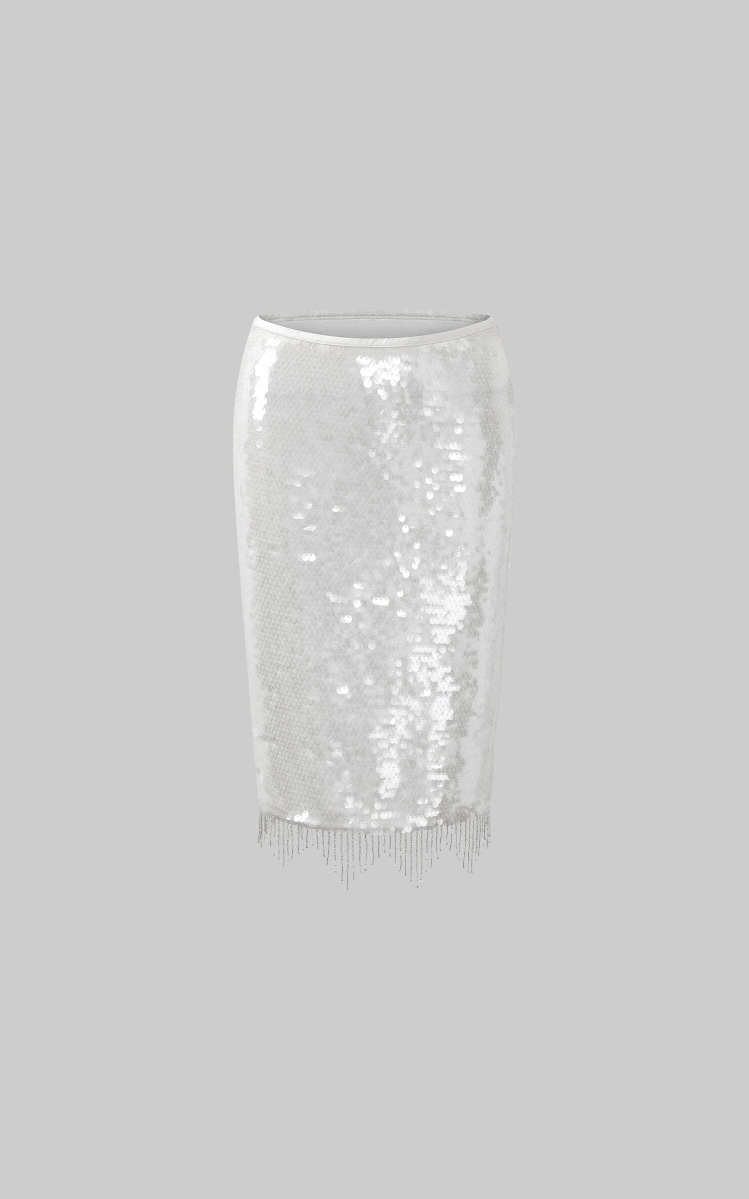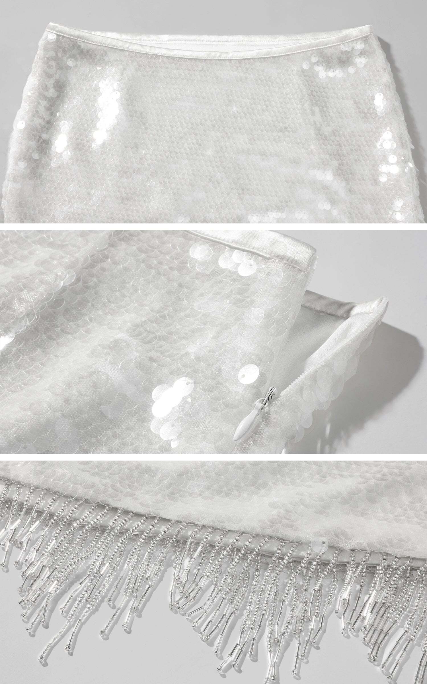 Designed to steal the spotlight, this two-piece set delivers high drama with sensual edge. The satin halter top features a plunging neckline, delicate cross-back straps, and a detachable rosette scarf that wraps the neck with poetic flair. Paired with a high-waisted sequin skirt that hugs the hips and catches the light with every movement, it’s finished with fringe beading for extra sparkle. Bold, sleek, and unapologetically magnetic.