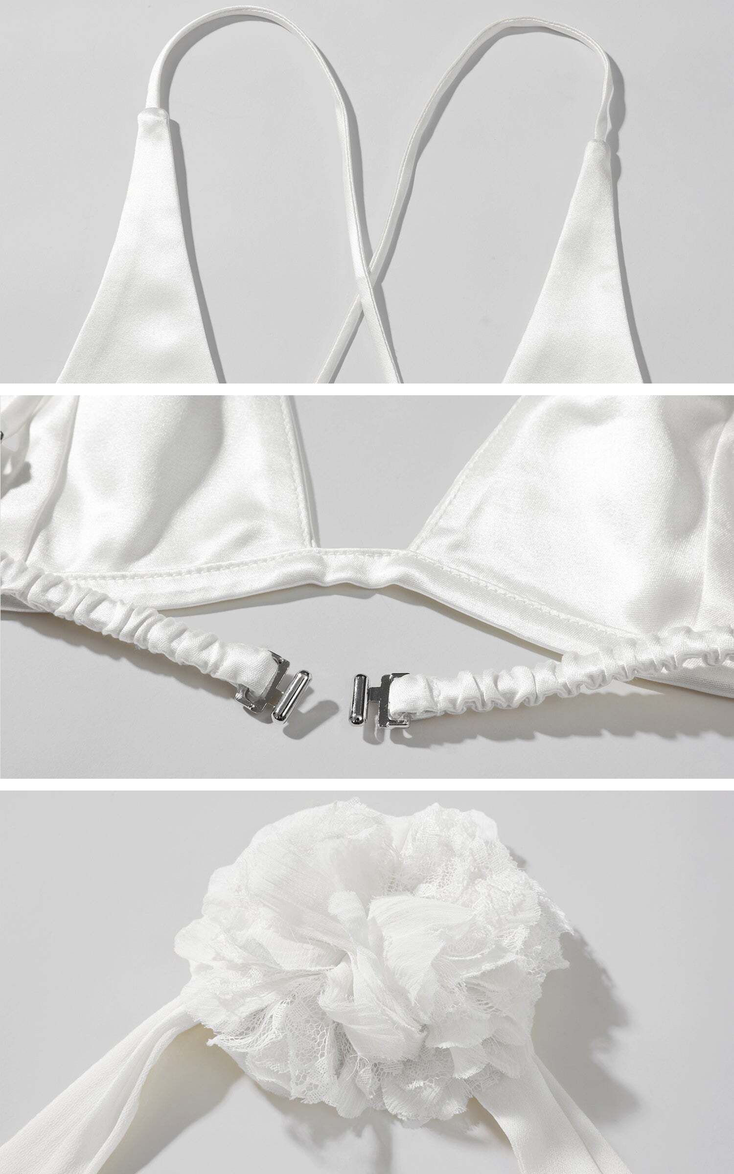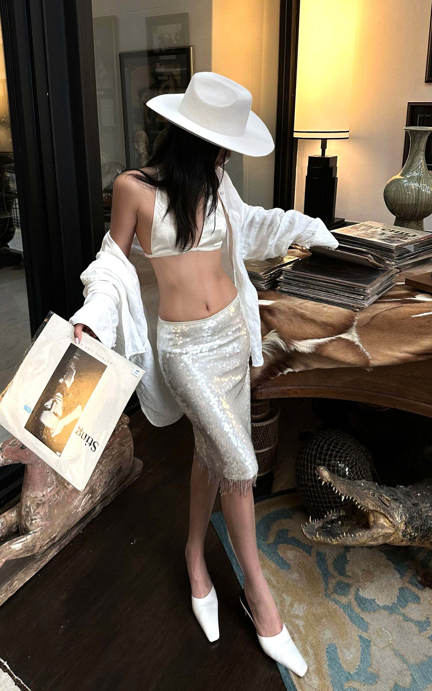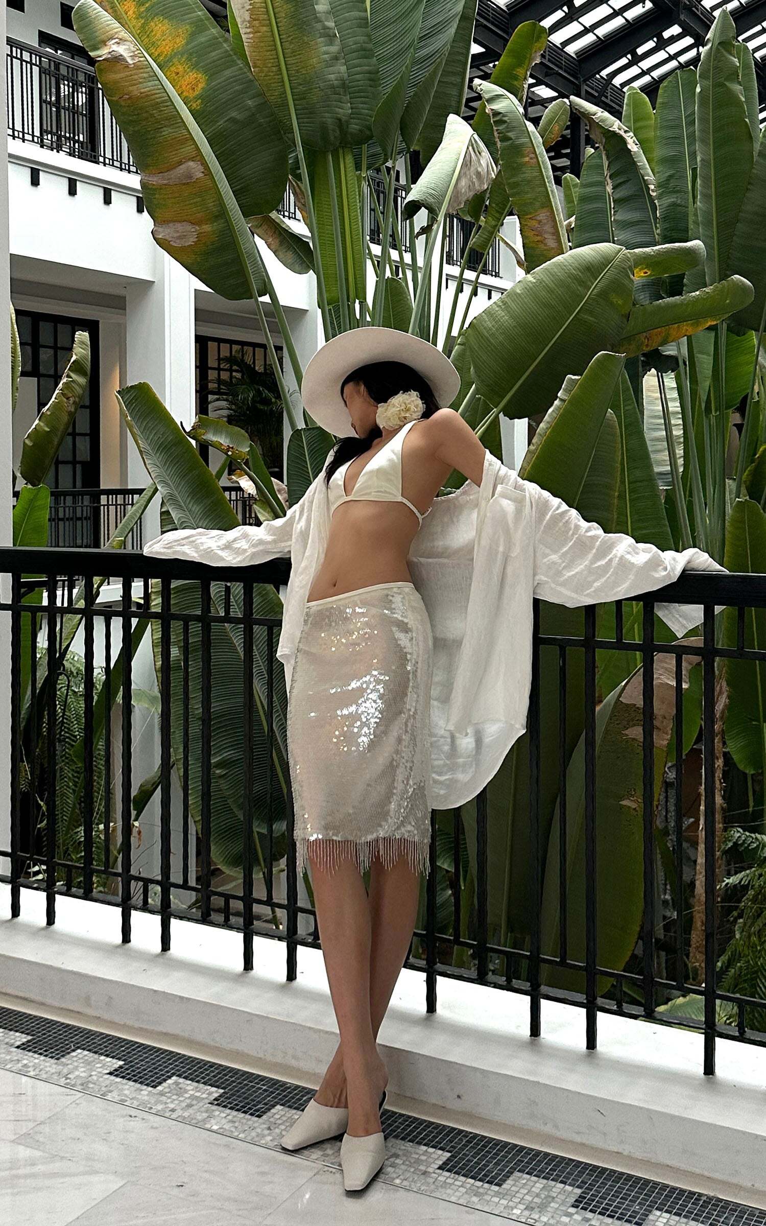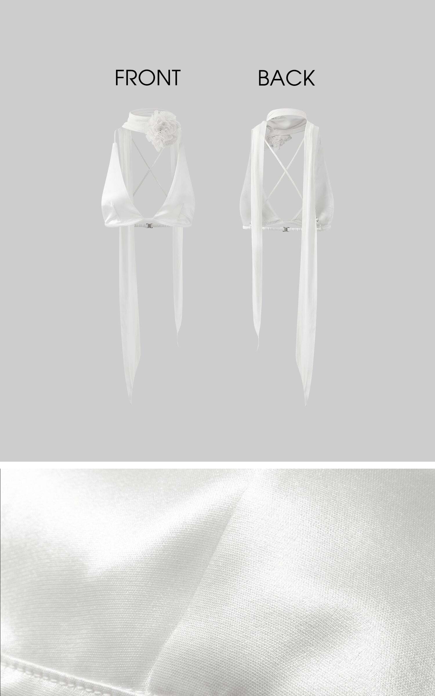 Designed to steal the spotlight, this two-piece set delivers high drama with sensual edge. The satin halter top features a plunging neckline, delicate cross-back straps, and a detachable rosette scarf that wraps the neck with poetic flair. Paired with a high-waisted sequin skirt that hugs the hips and catches the light with every movement, it’s finished with fringe beading for extra sparkle. Bold, sleek, and unapologetically magnetic.