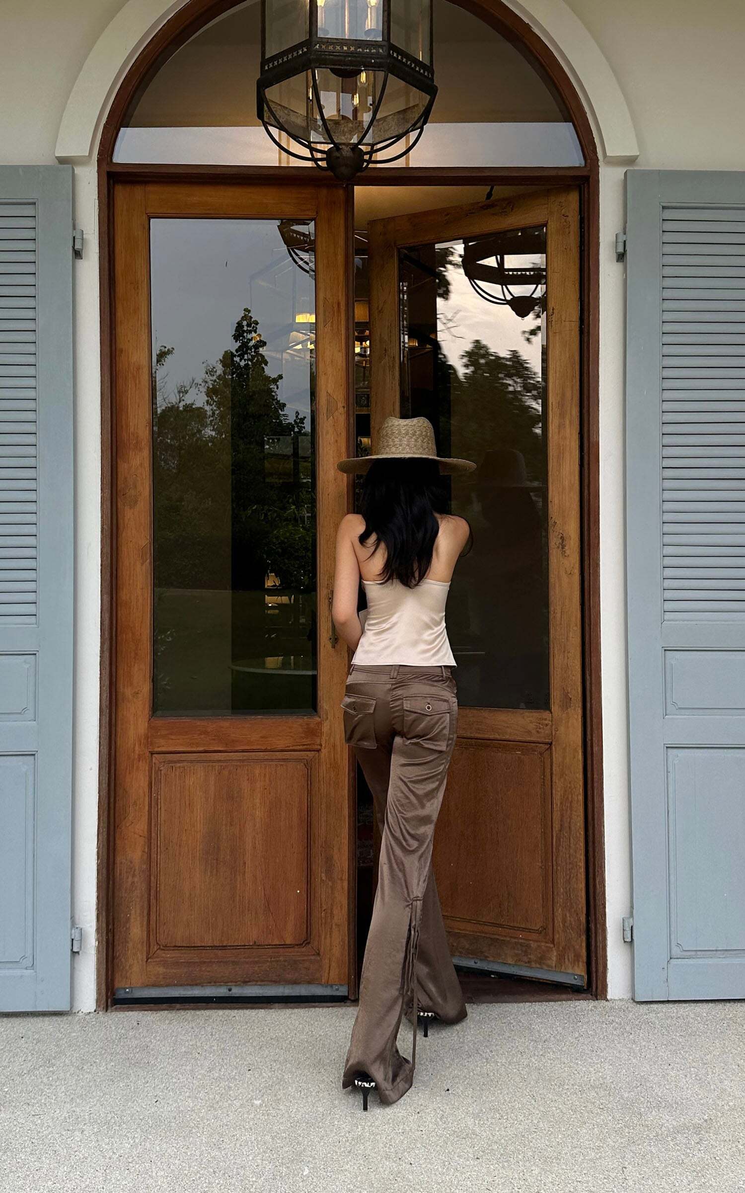 A fusion of sensual gloss and utilitarian edge. These satin flare pants feature dual-button detailing, structured cargo pockets, and zipped ankle slits that let you control the silhouette. Designed to cinch the waist and flow with every step—equal parts attitude and ease. Pair with barely-there heels or a corset top for a subversive take on soft glamour.