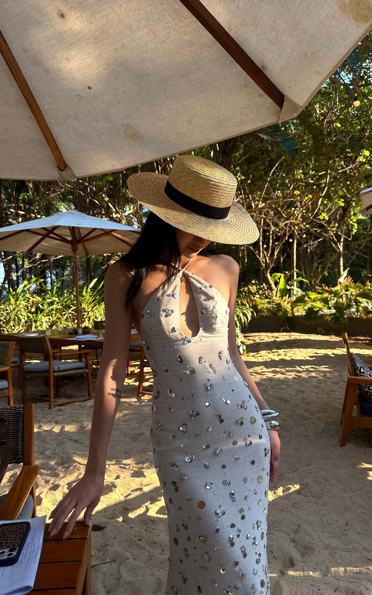 Where soft sensuality meets after-dark sparkle. This halter maxi dress is cut in a sculpting silhouette that gently flares from the hips, designed in a textured linen-blend base and drenched in an ombré cascade of metallic sequins. The keyhole front reveals a sliver of skin, balanced by a low-cut back and fine crossover straps that frame the shoulders with ease.From candlelit resort dinners to city rooftop affairs, this piece demands attention—effortlessly fluid, yet unapologetically dazzling. Style it with sculptural heels or barefoot under the palms—it will shine either way.