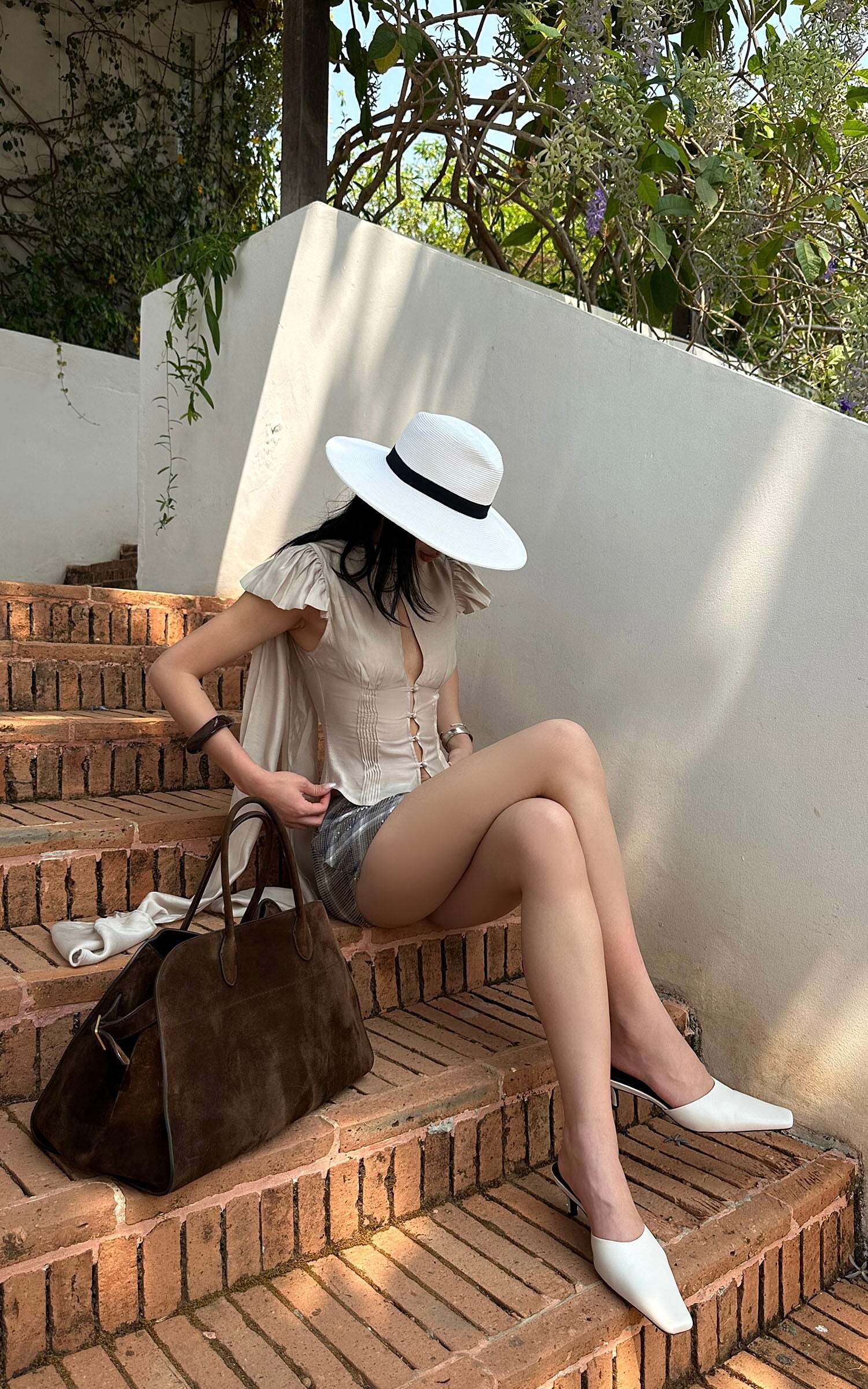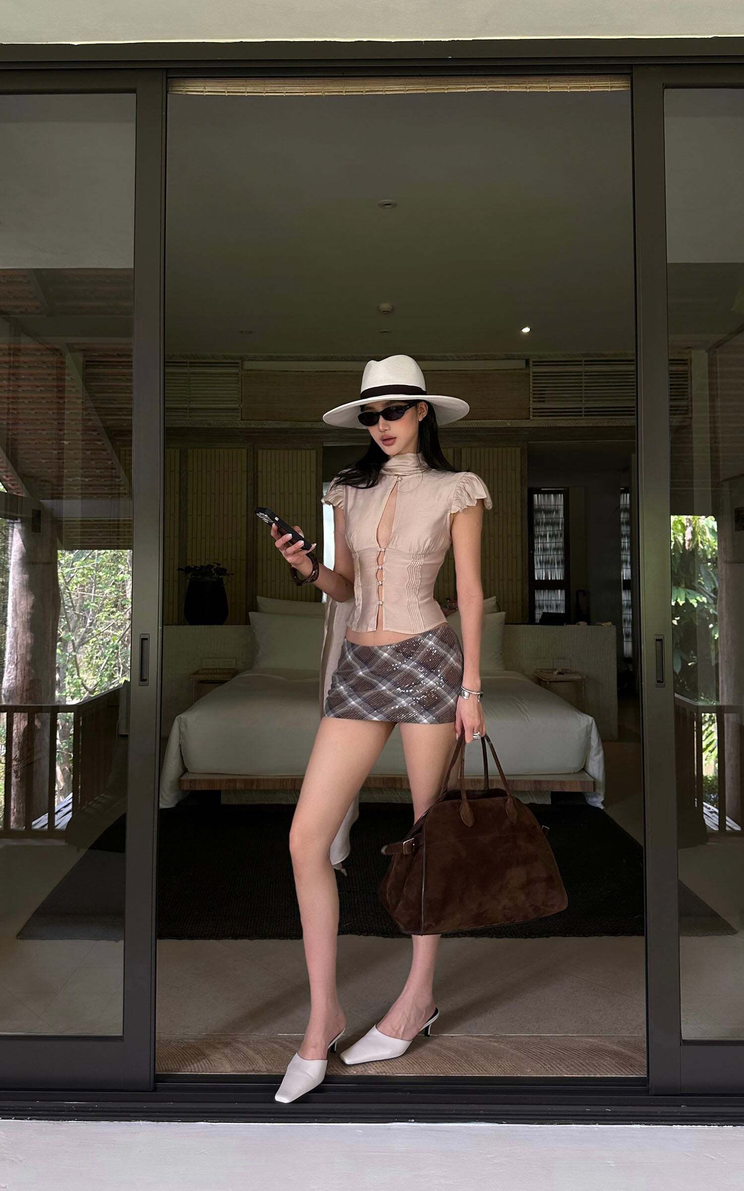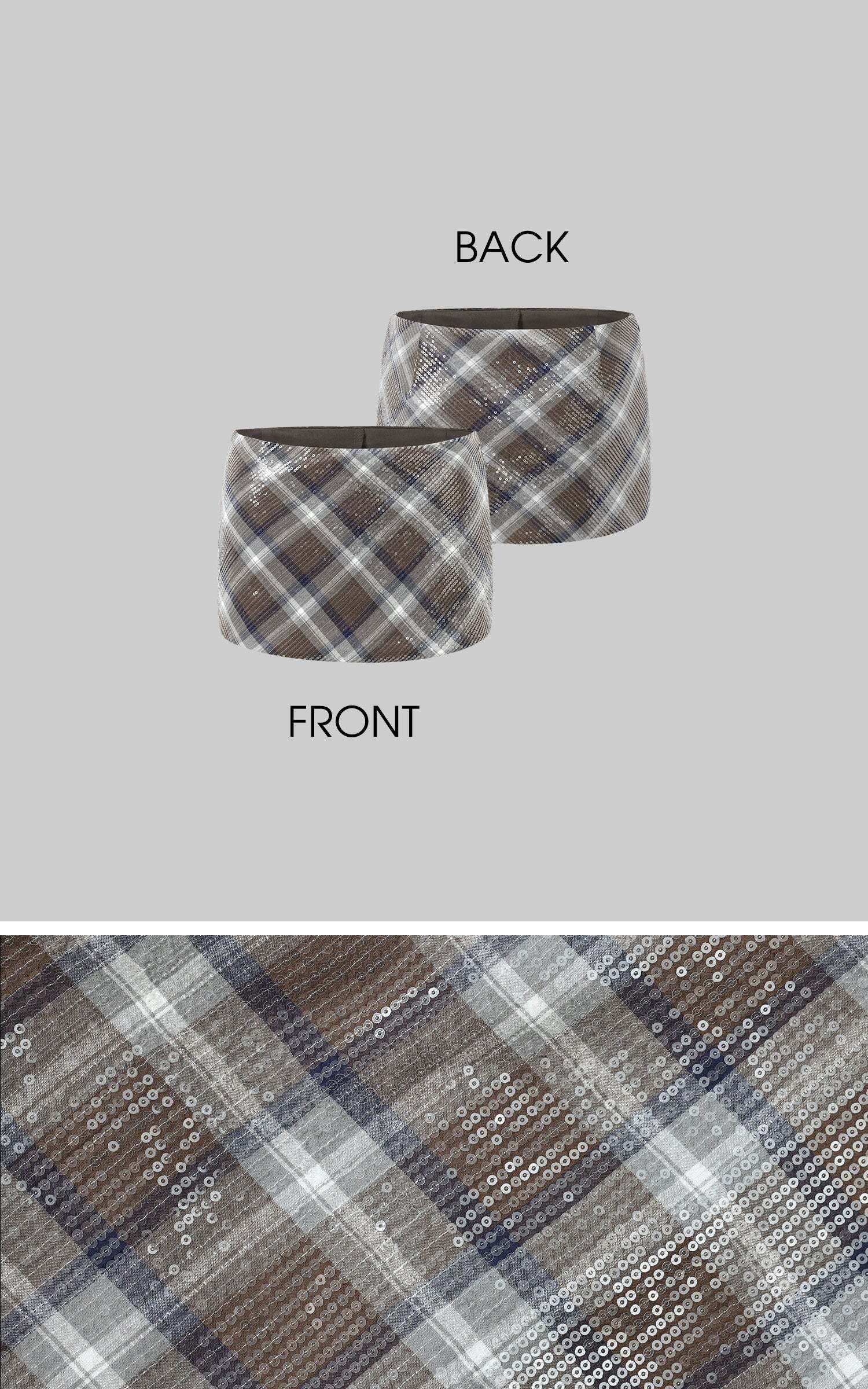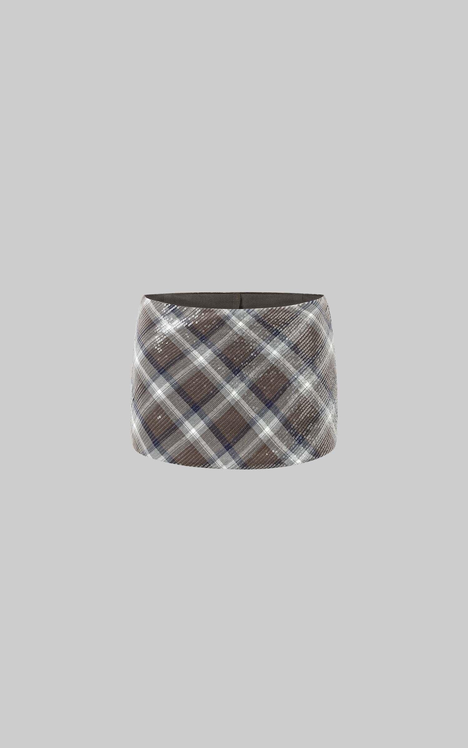 A mini skirt made to flirt with the sunlight and your silhouette. This checkered number features a diagonally draped cut with a precise high-waisted fit and dazzling sequins woven across a rich plaid base. The glimmering overlay catches light with every step, while the smooth inner lining ensures comfort without compromising on edge. Style it with a corset top or a crisp shirt for a bold day-to-night contrast.