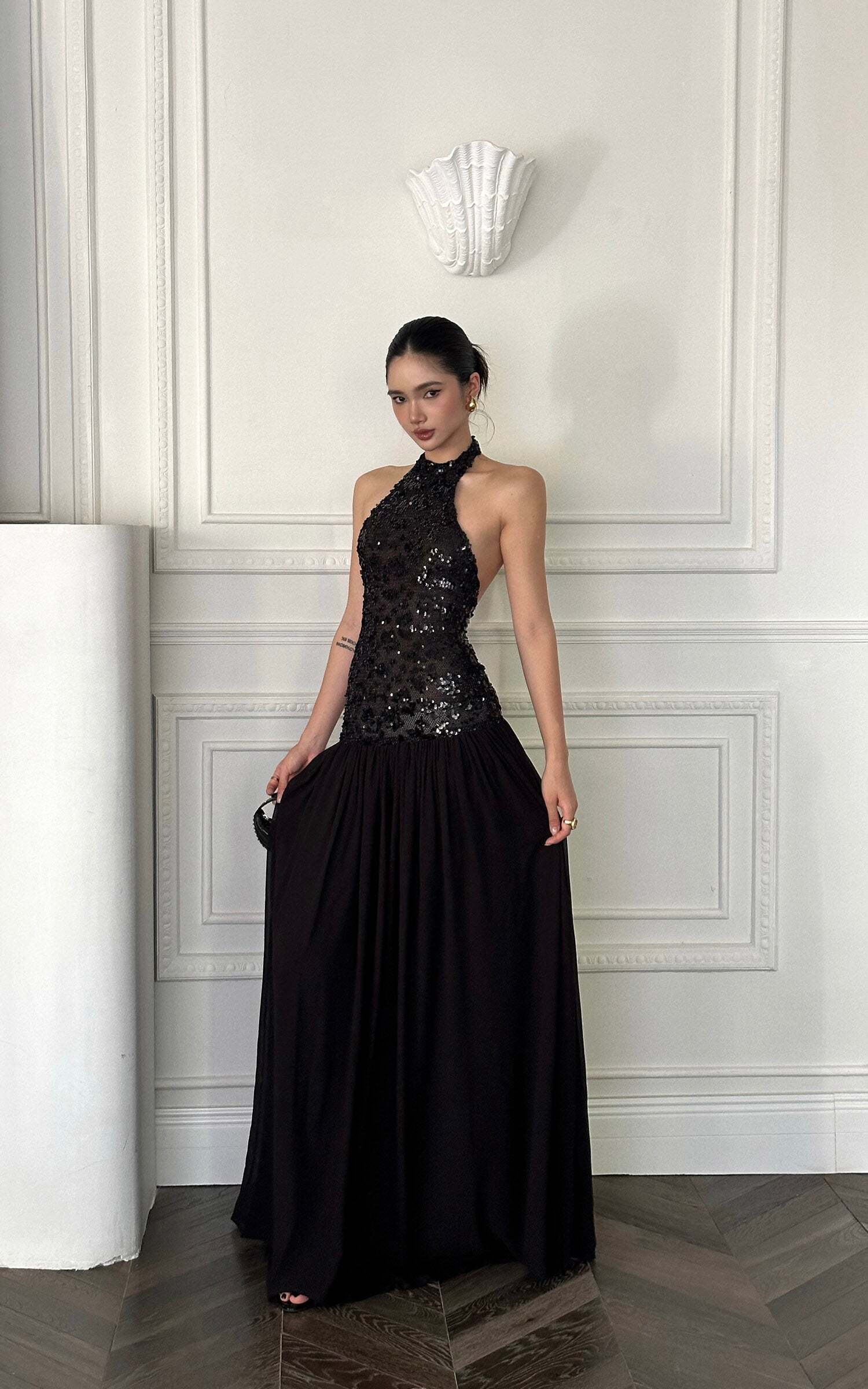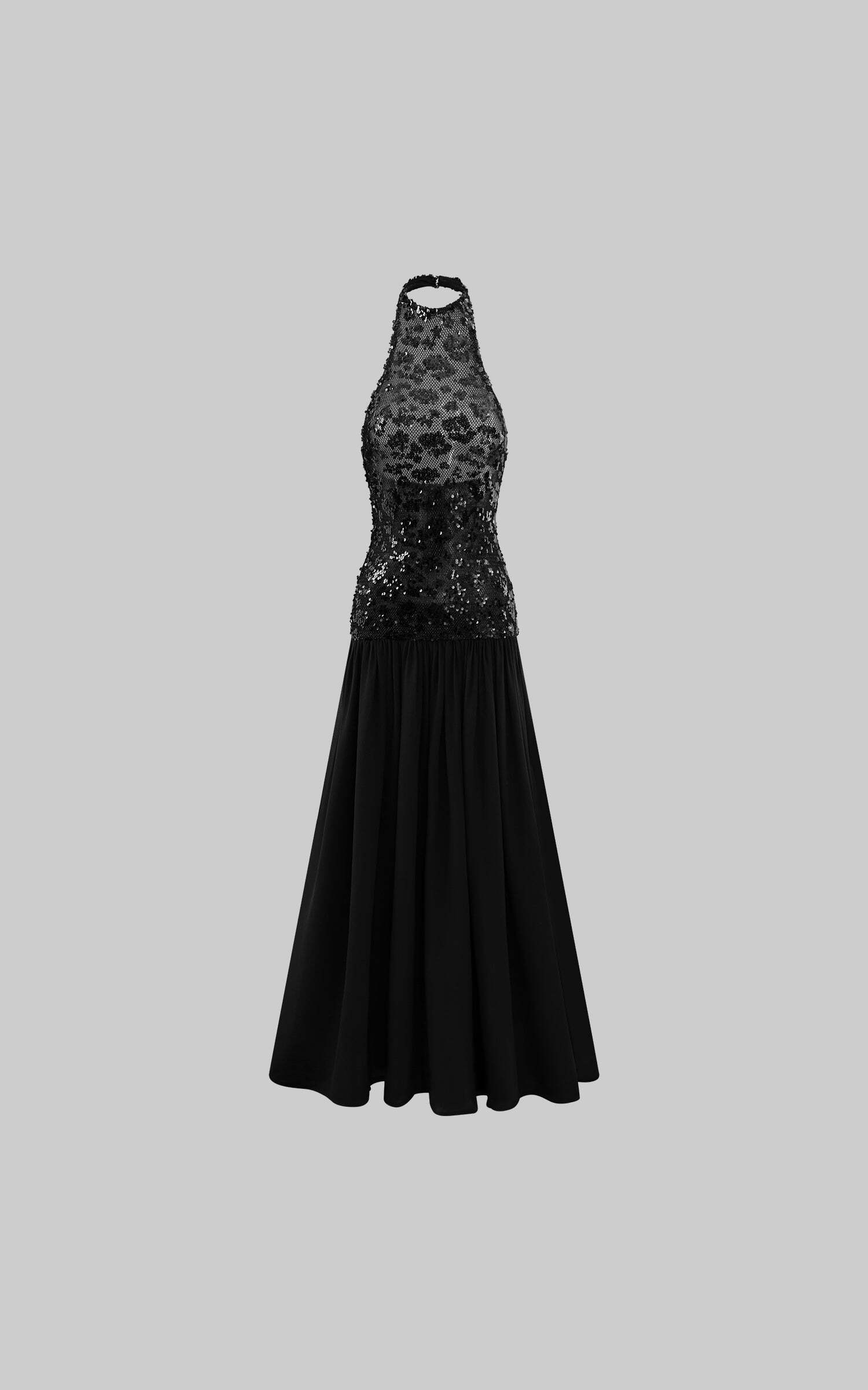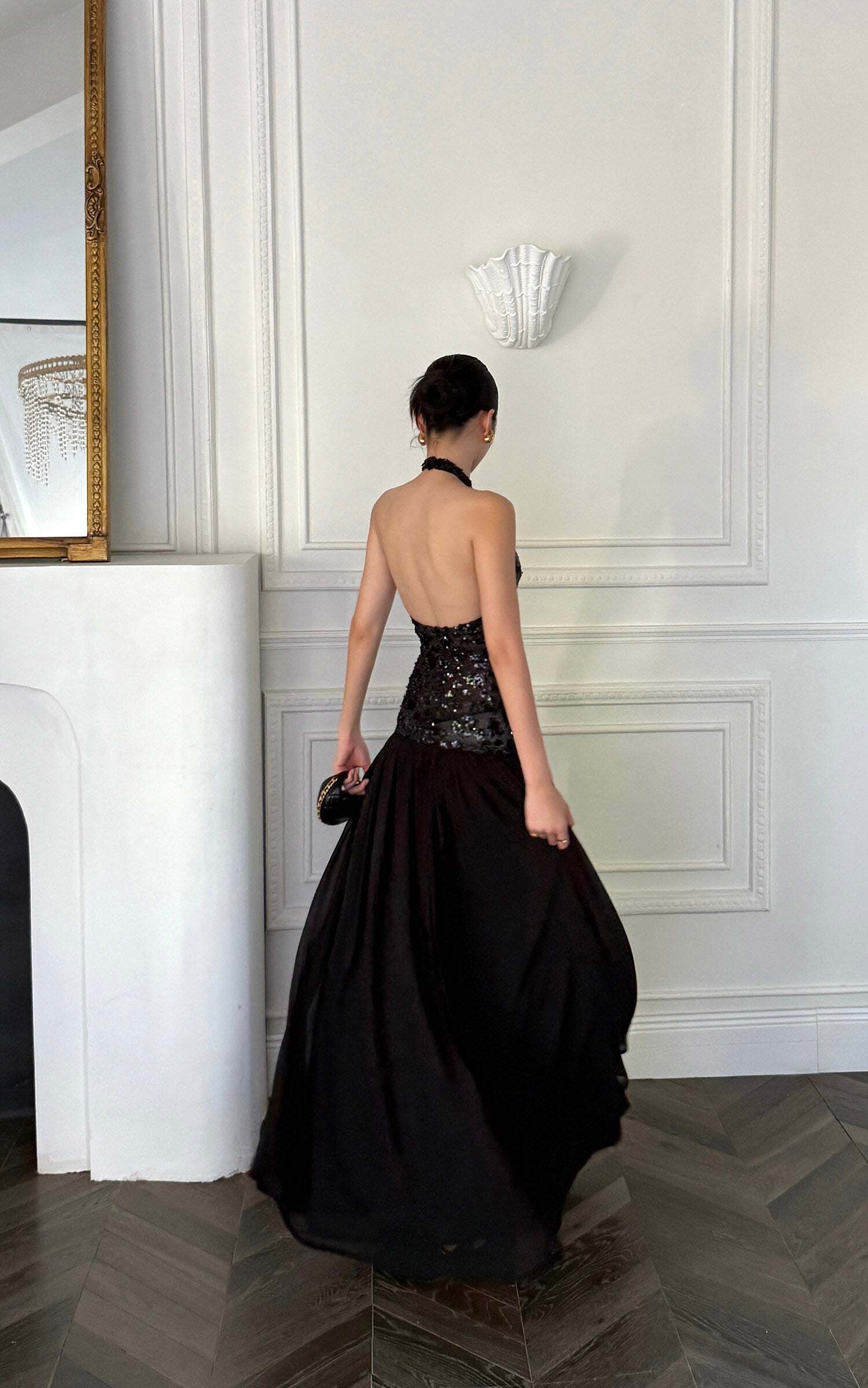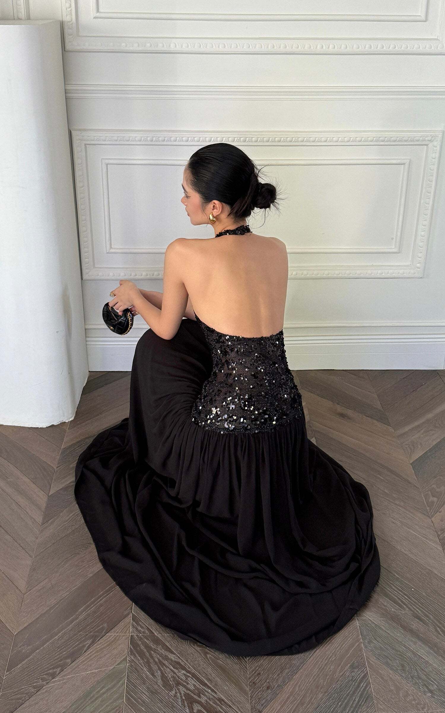 This maxi dress turns heads with a daring halter neckline and a fully sequined bodice that catches the light from every angle. The open back adds a sensual twist, while the flowing skirt moves with effortless drama. Crafted for after-dark allure, it balances bold glamour with sleek sophistication, making it the ultimate choice for high-impact entrances.