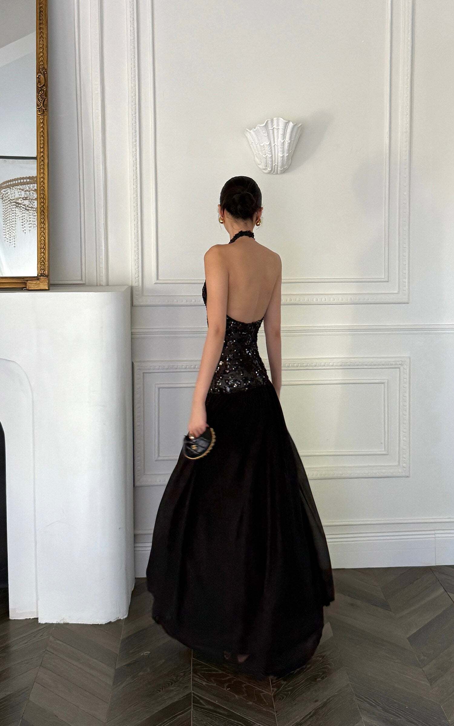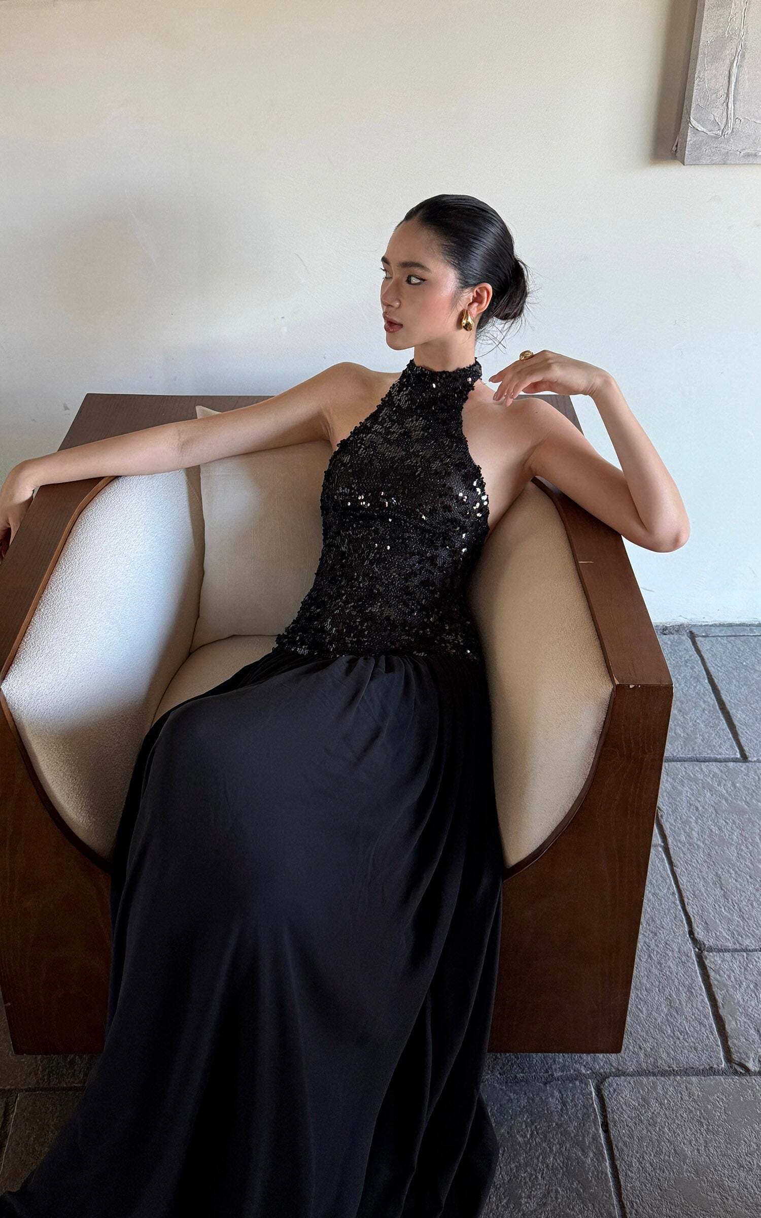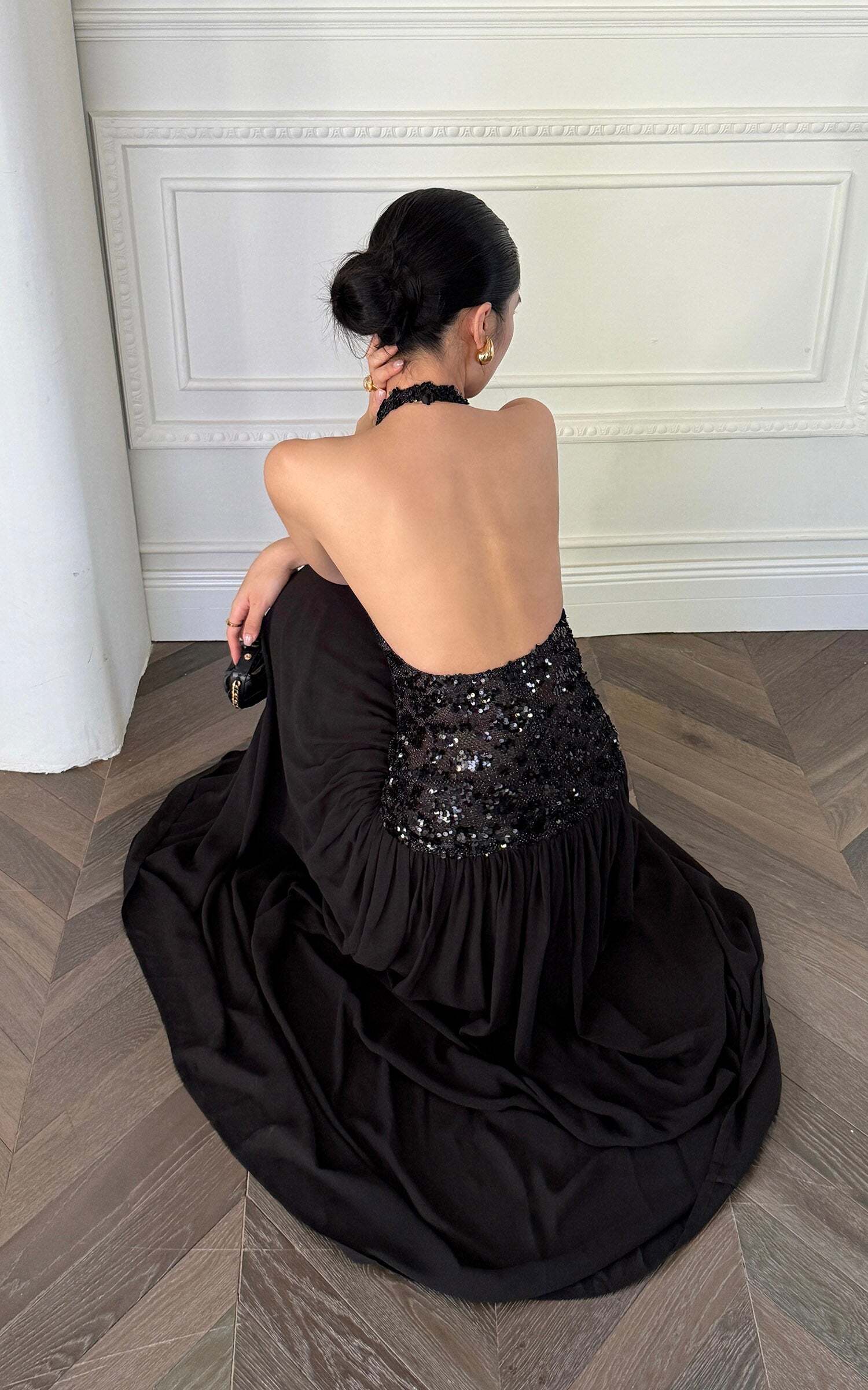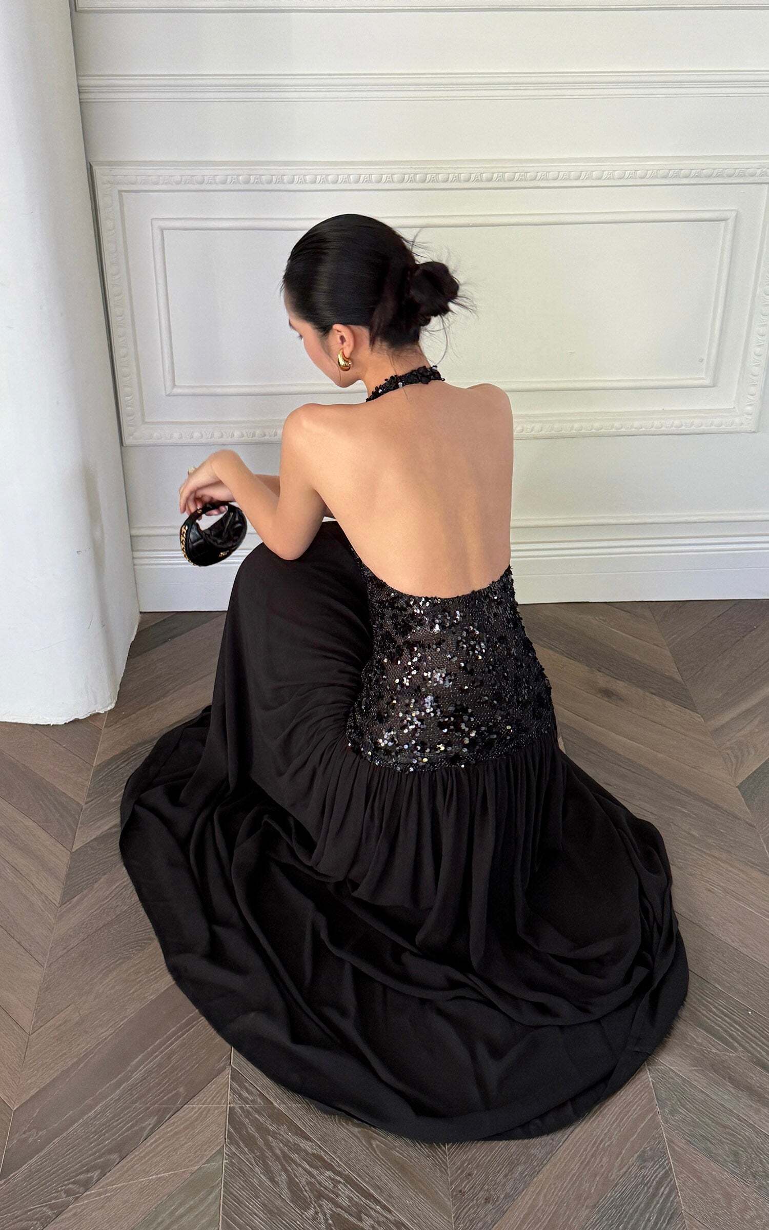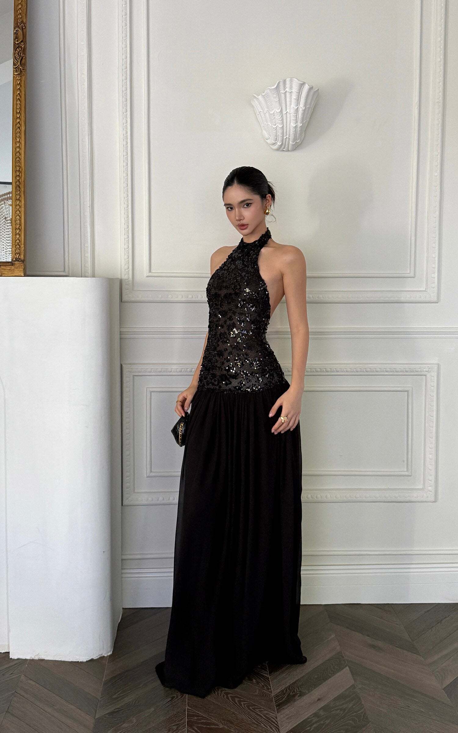 This maxi dress turns heads with a daring halter neckline and a fully sequined bodice that catches the light from every angle. The open back adds a sensual twist, while the flowing skirt moves with effortless drama. Crafted for after-dark allure, it balances bold glamour with sleek sophistication, making it the ultimate choice for high-impact entrances.