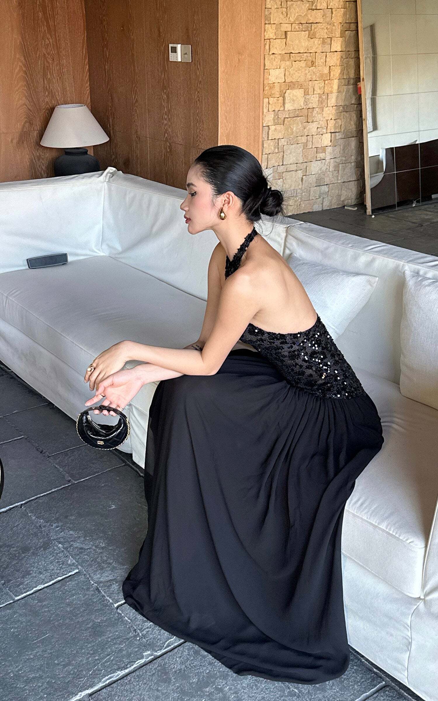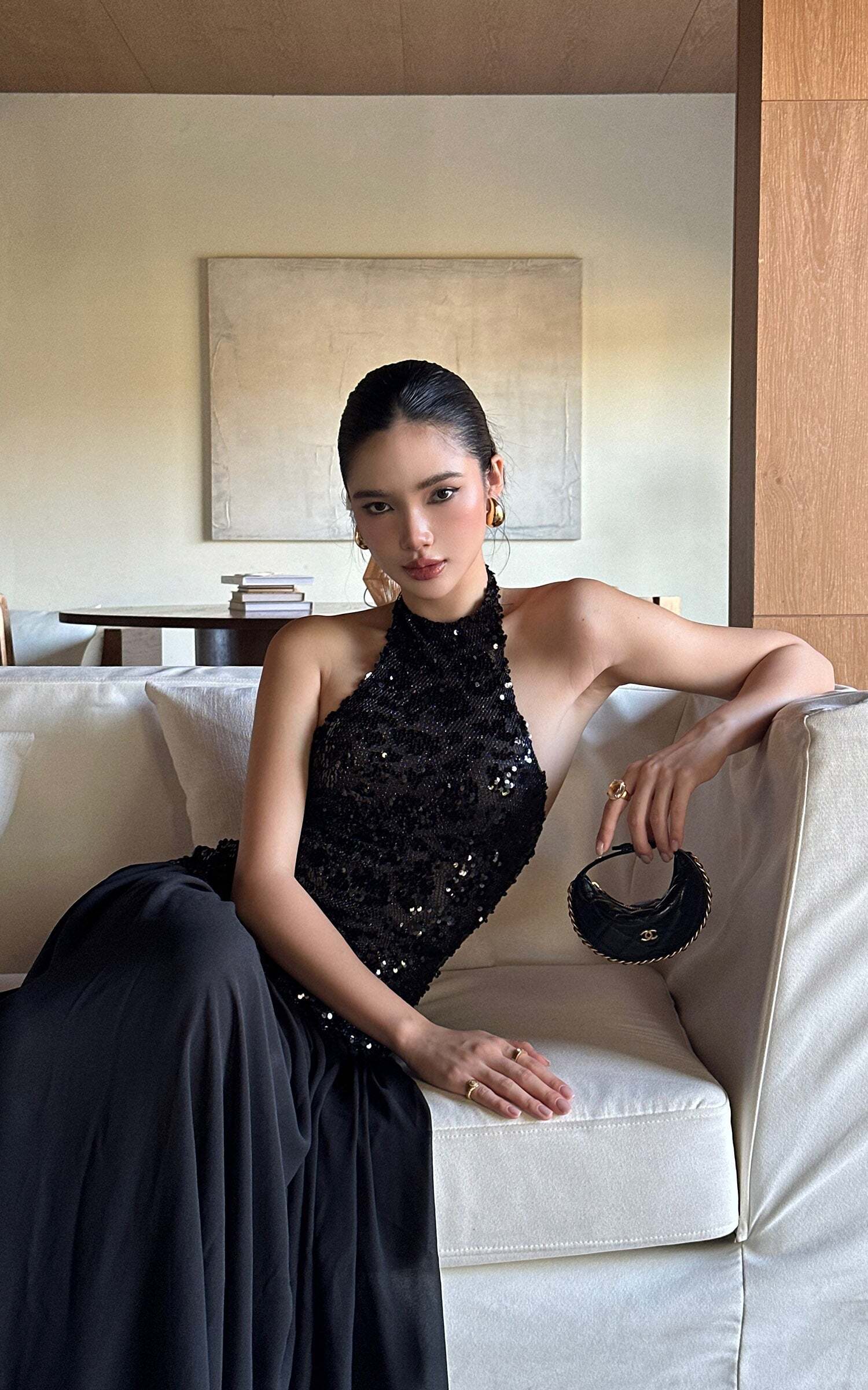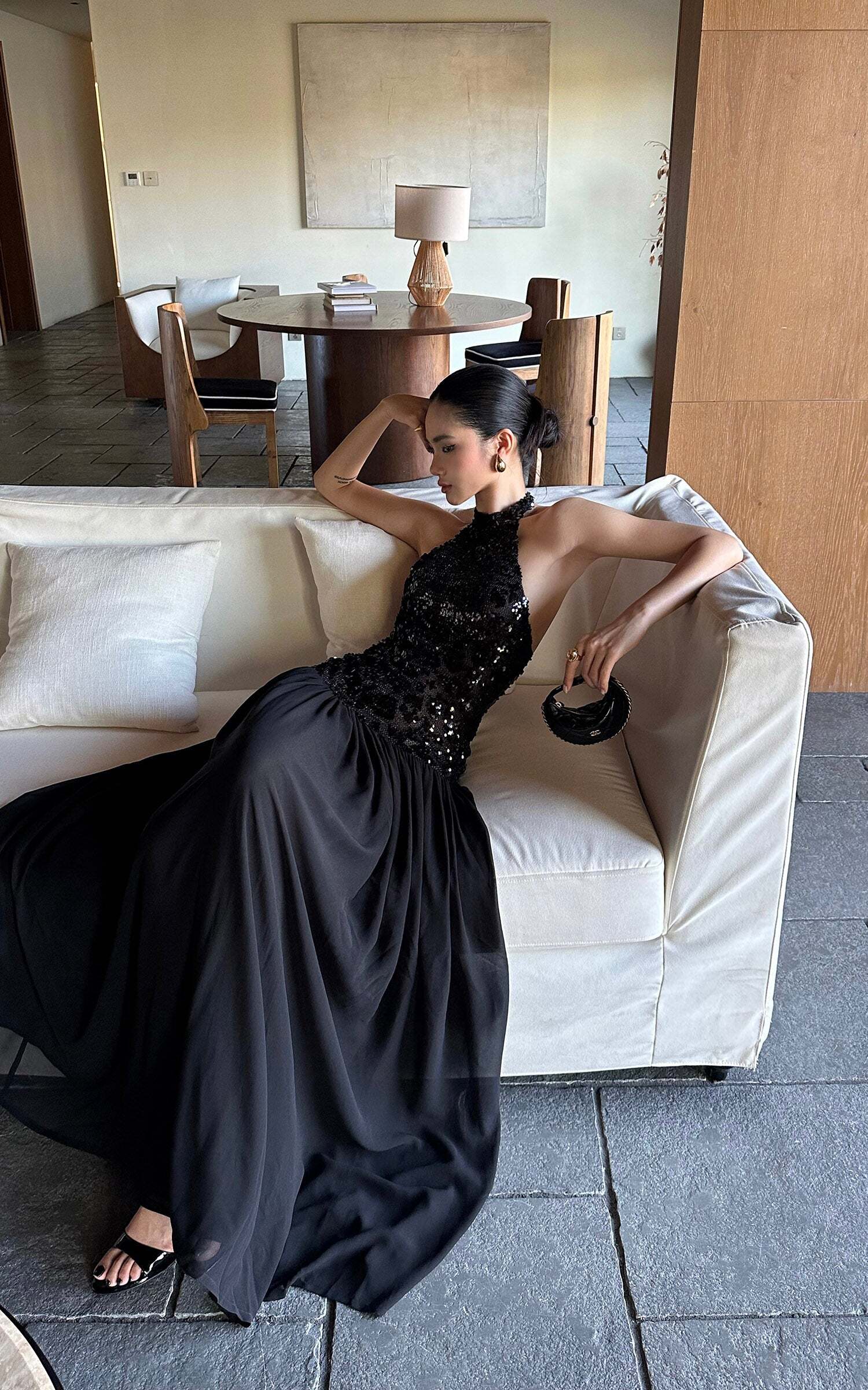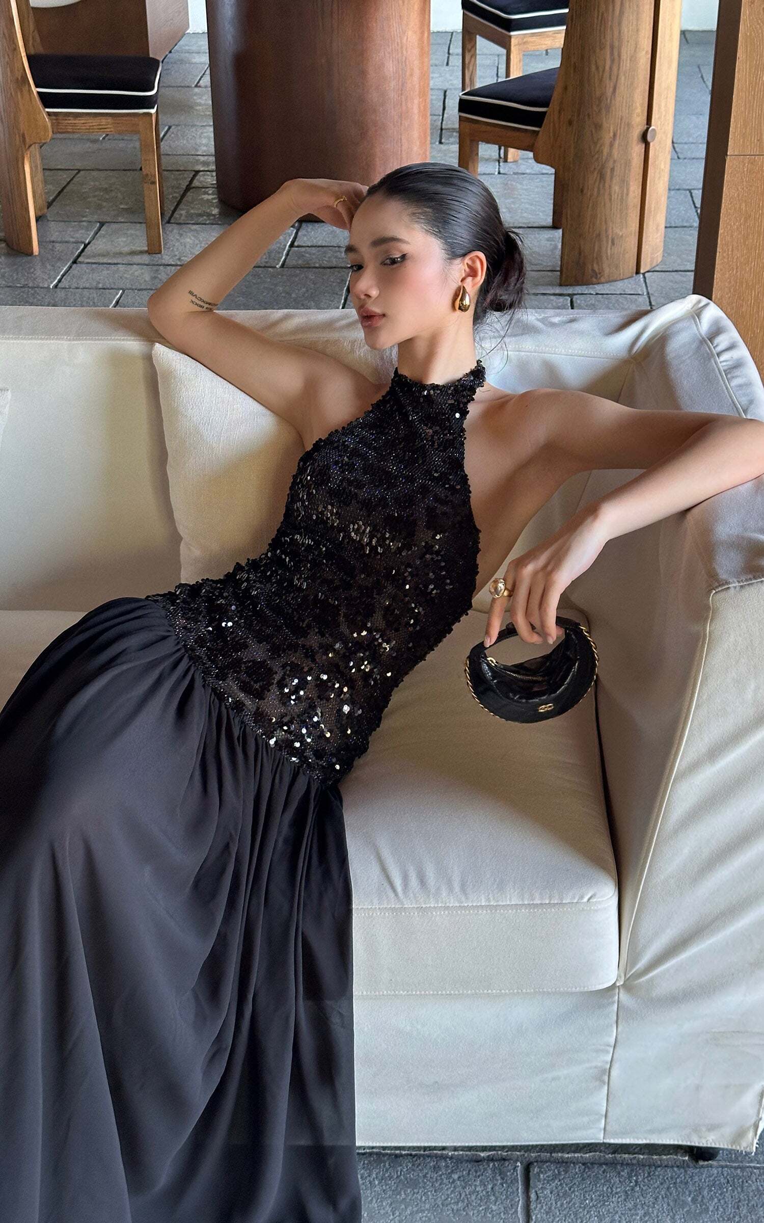 This maxi dress turns heads with a daring halter neckline and a fully sequined bodice that catches the light from every angle. The open back adds a sensual twist, while the flowing skirt moves with effortless drama. Crafted for after-dark allure, it balances bold glamour with sleek sophistication, making it the ultimate choice for high-impact entrances.