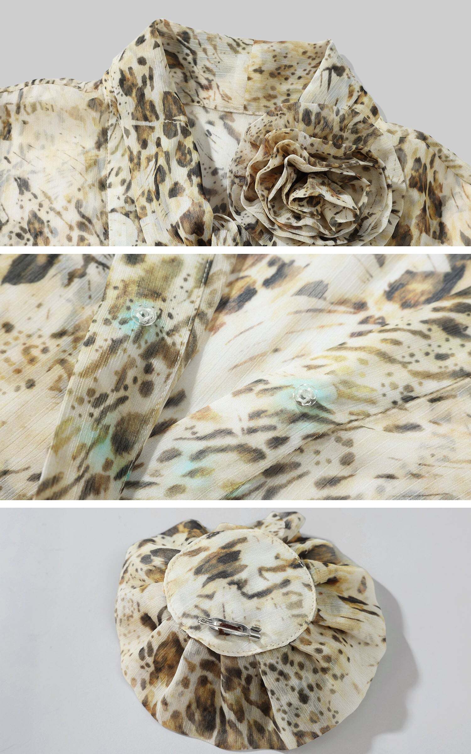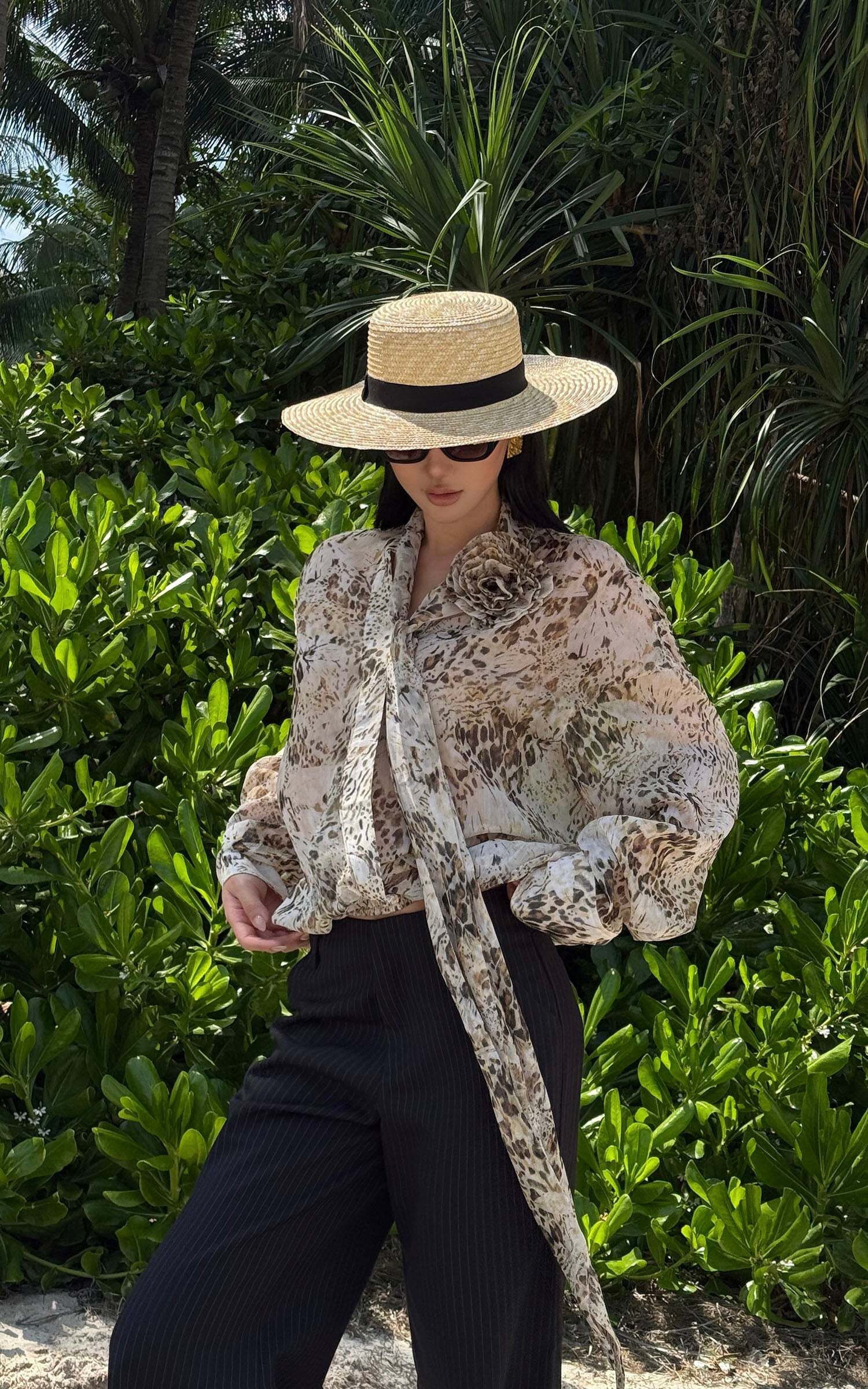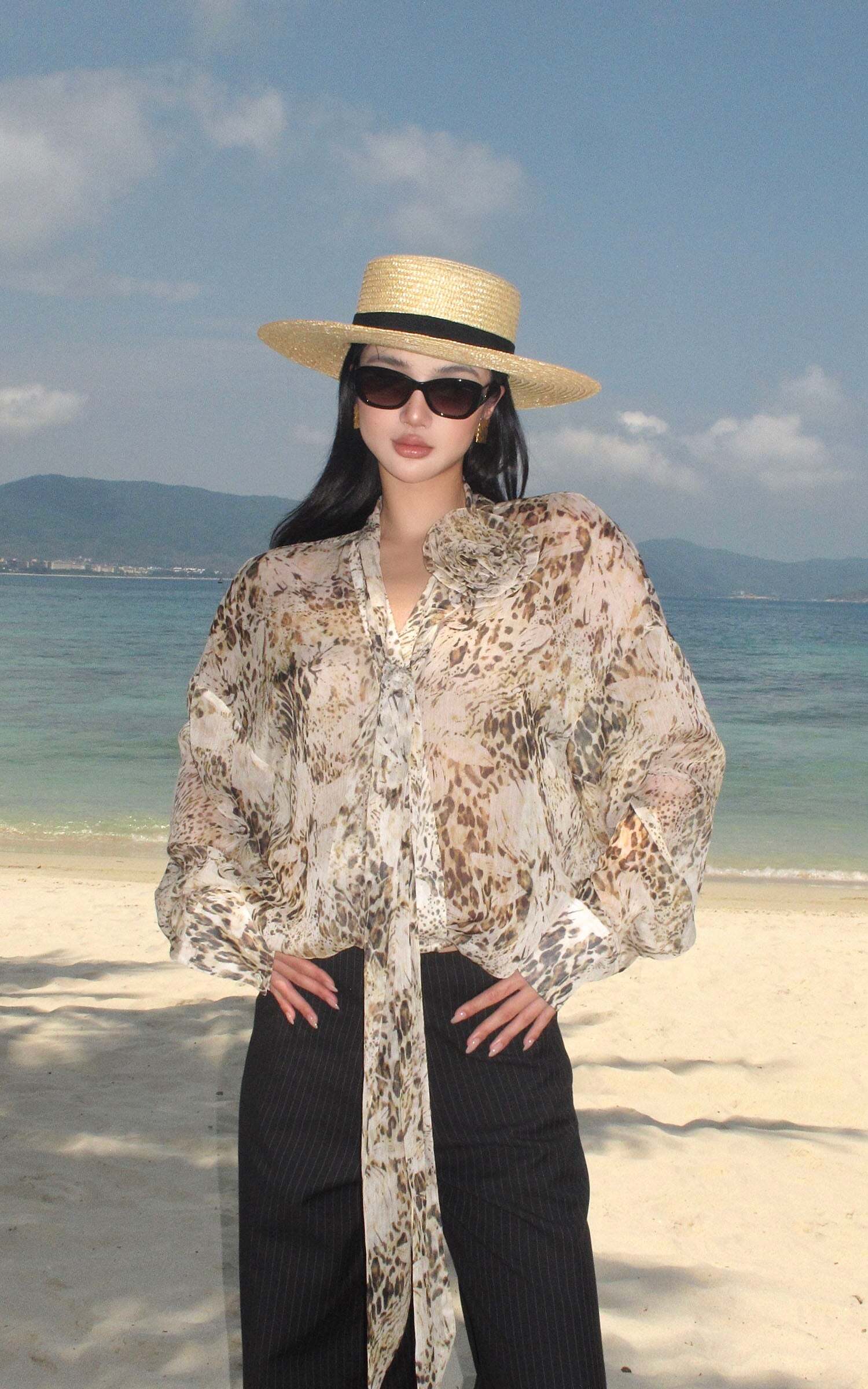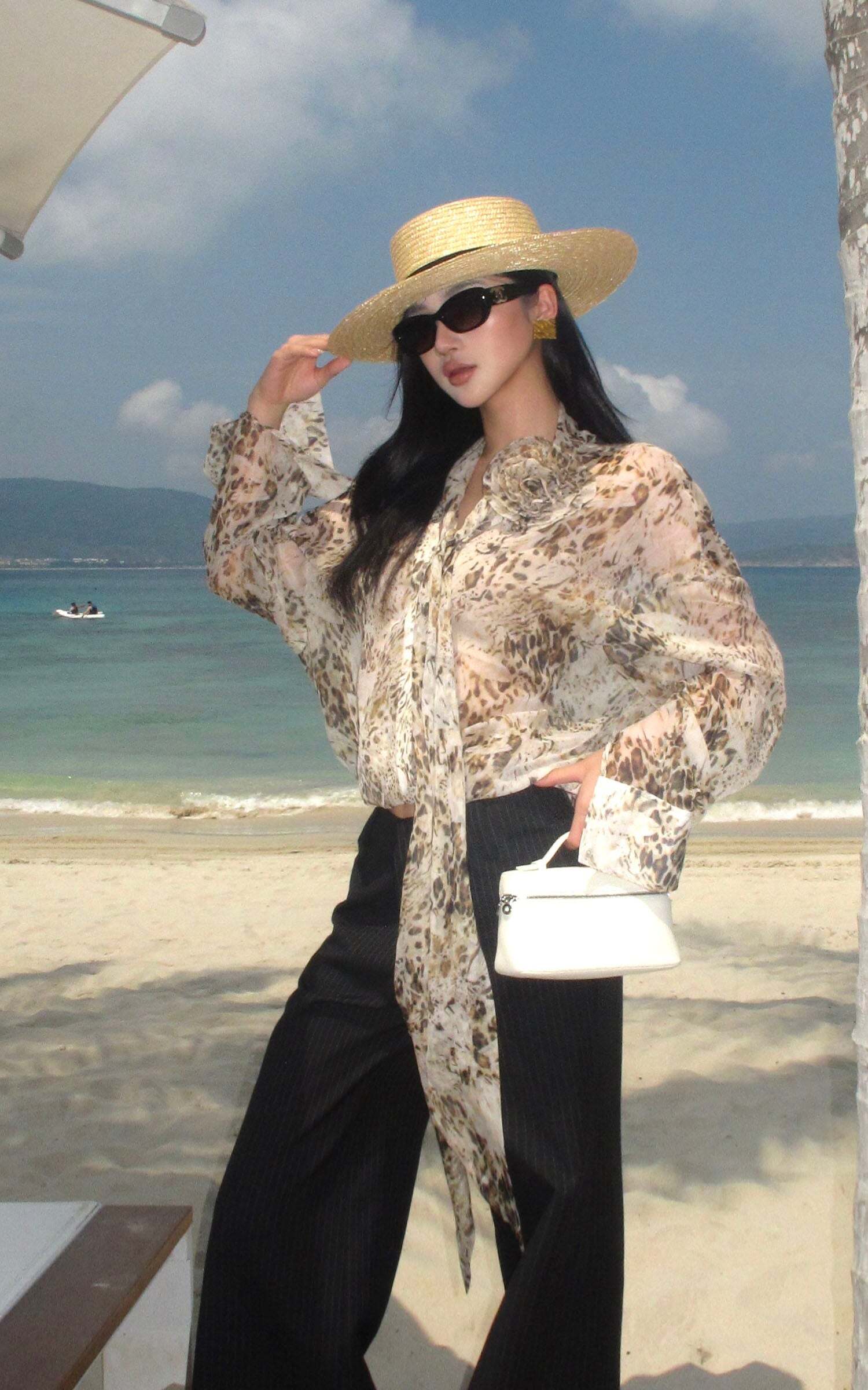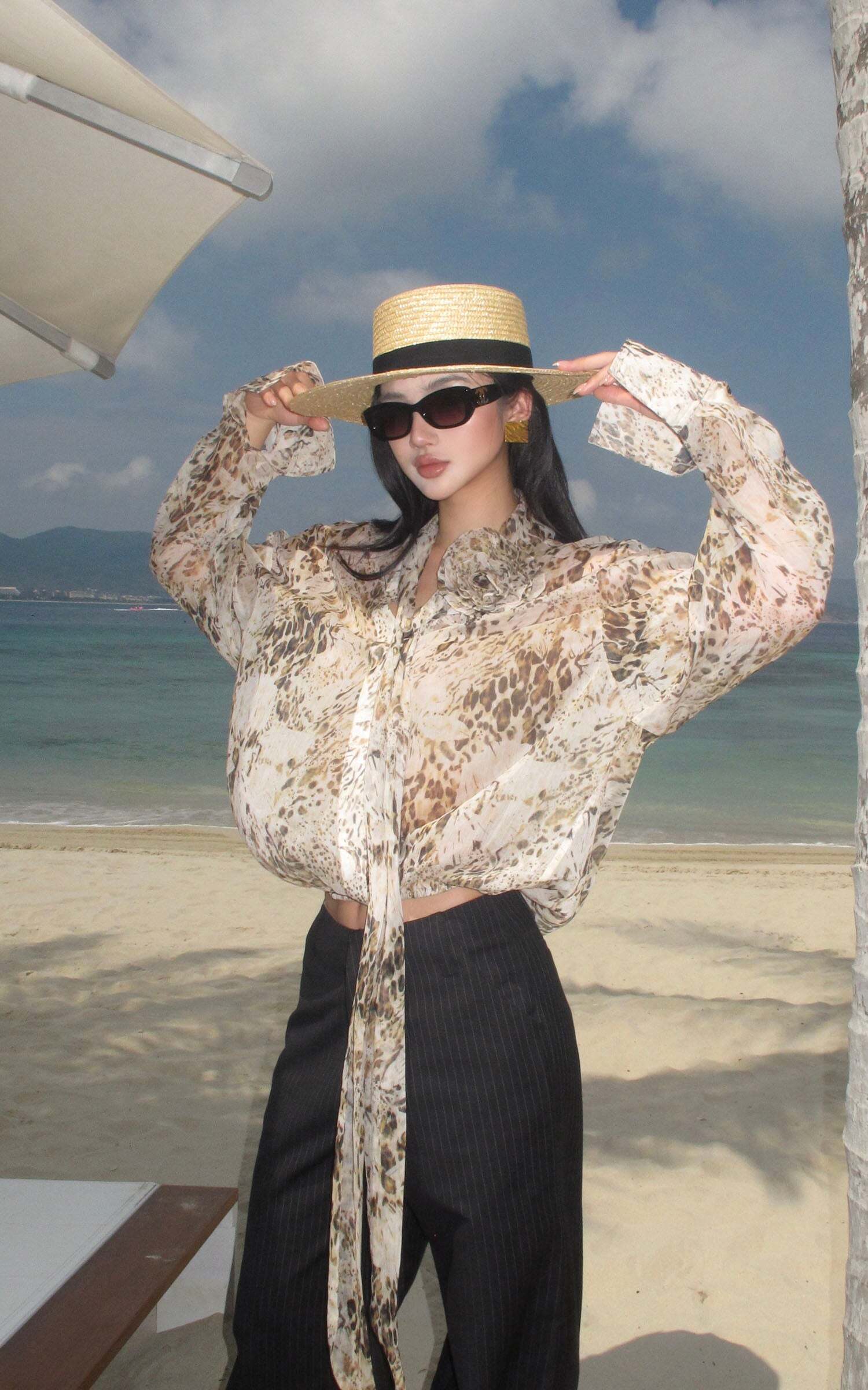 Unruly elegance meets bohemian ease. This sheer chiffon blouse is drenched in a wild leopard motif and elevated by an oversized necktie that can be looped into a bow or left loose for undone glamour. The lightweight fabric floats effortlessly with every breeze, while the hand-sewn 3D rosette adds sculptural charm and femme contrast. Cuffed balloon sleeves offer soft structure, making it a standout piece whether tucked into tailored trousers or thrown over a bikini. From beachside drinks to twilight parties, this blouse slips between bold and breezy with effortless allure.