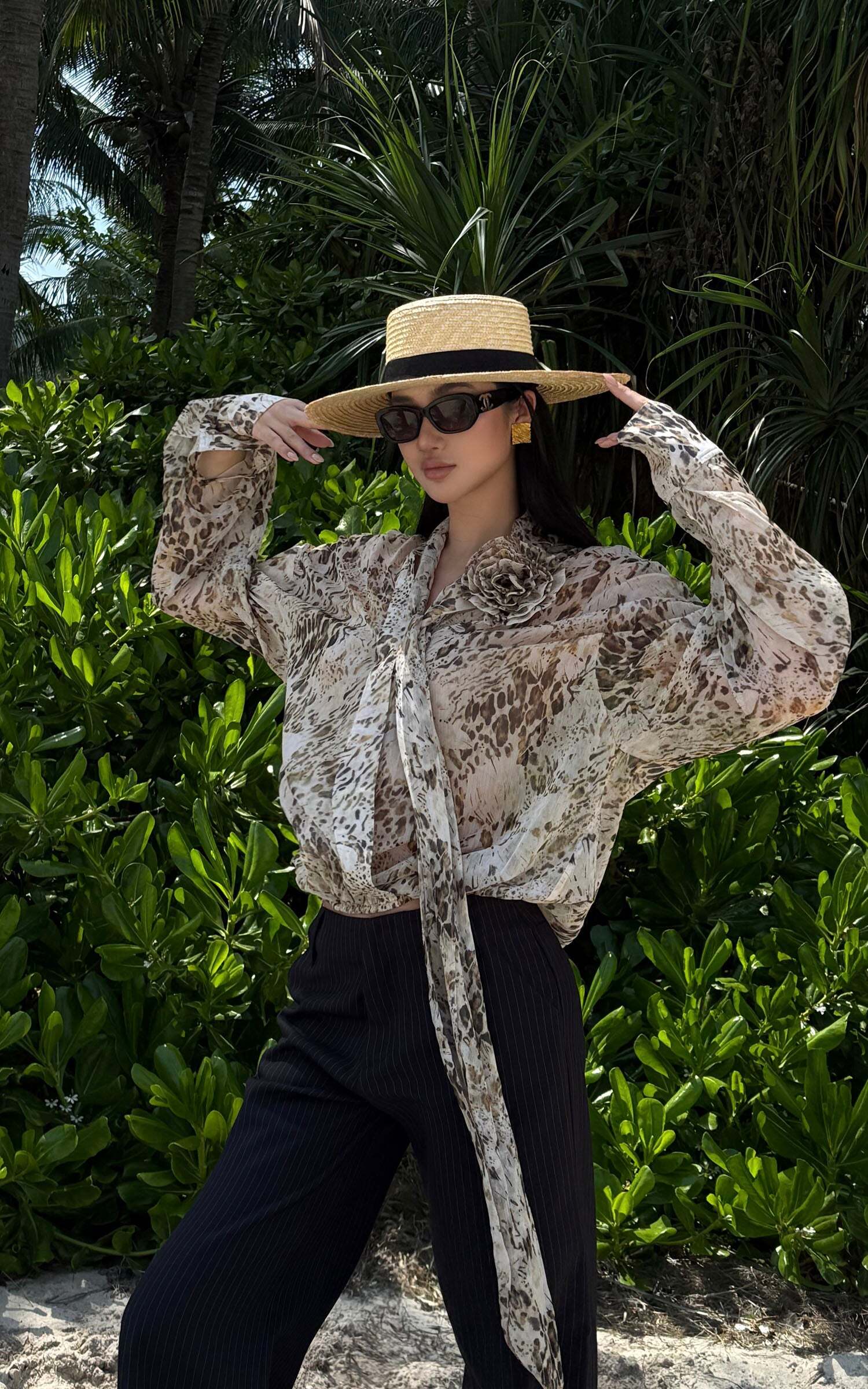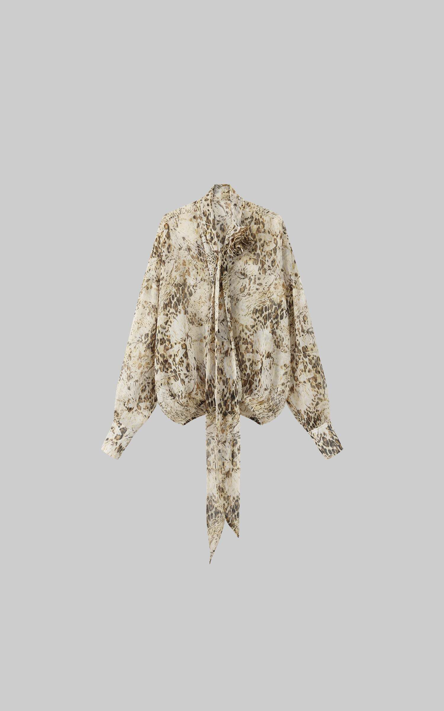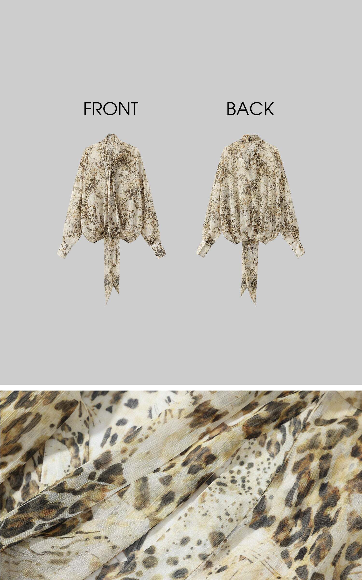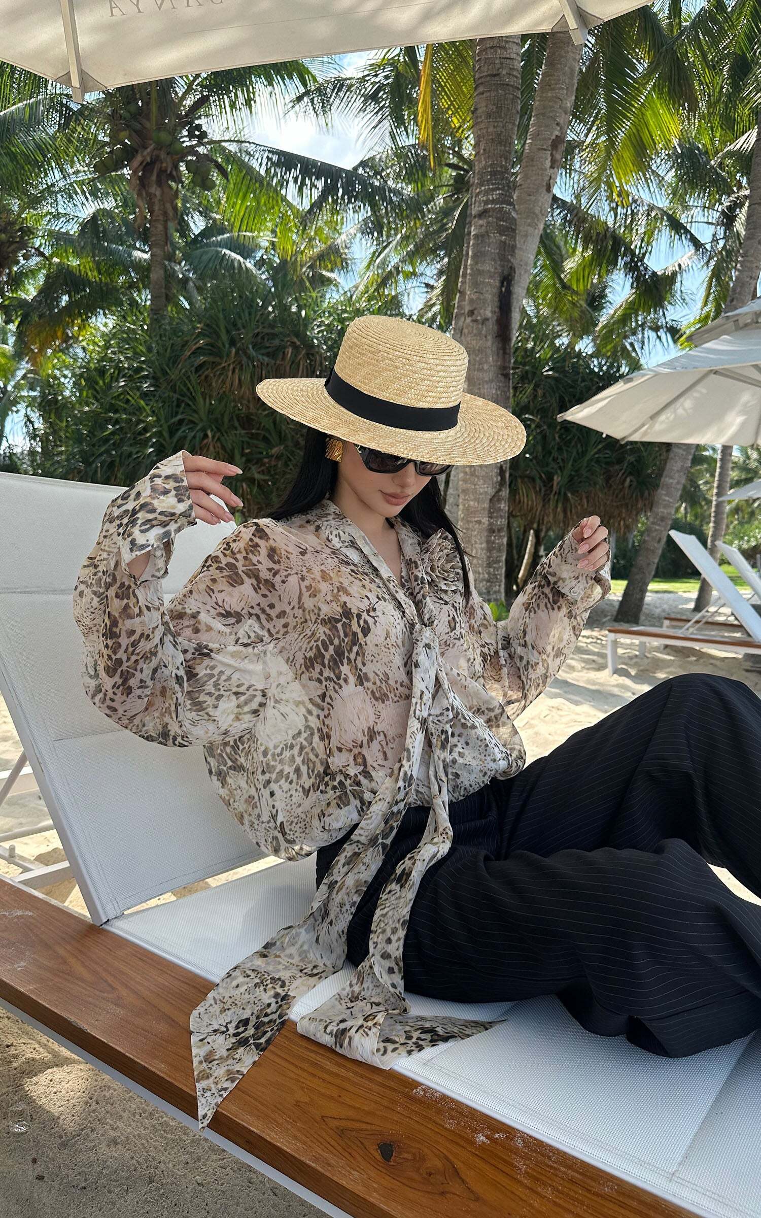 Unruly elegance meets bohemian ease. This sheer chiffon blouse is drenched in a wild leopard motif and elevated by an oversized necktie that can be looped into a bow or left loose for undone glamour. The lightweight fabric floats effortlessly with every breeze, while the hand-sewn 3D rosette adds sculptural charm and femme contrast. Cuffed balloon sleeves offer soft structure, making it a standout piece whether tucked into tailored trousers or thrown over a bikini. From beachside drinks to twilight parties, this blouse slips between bold and breezy with effortless allure.