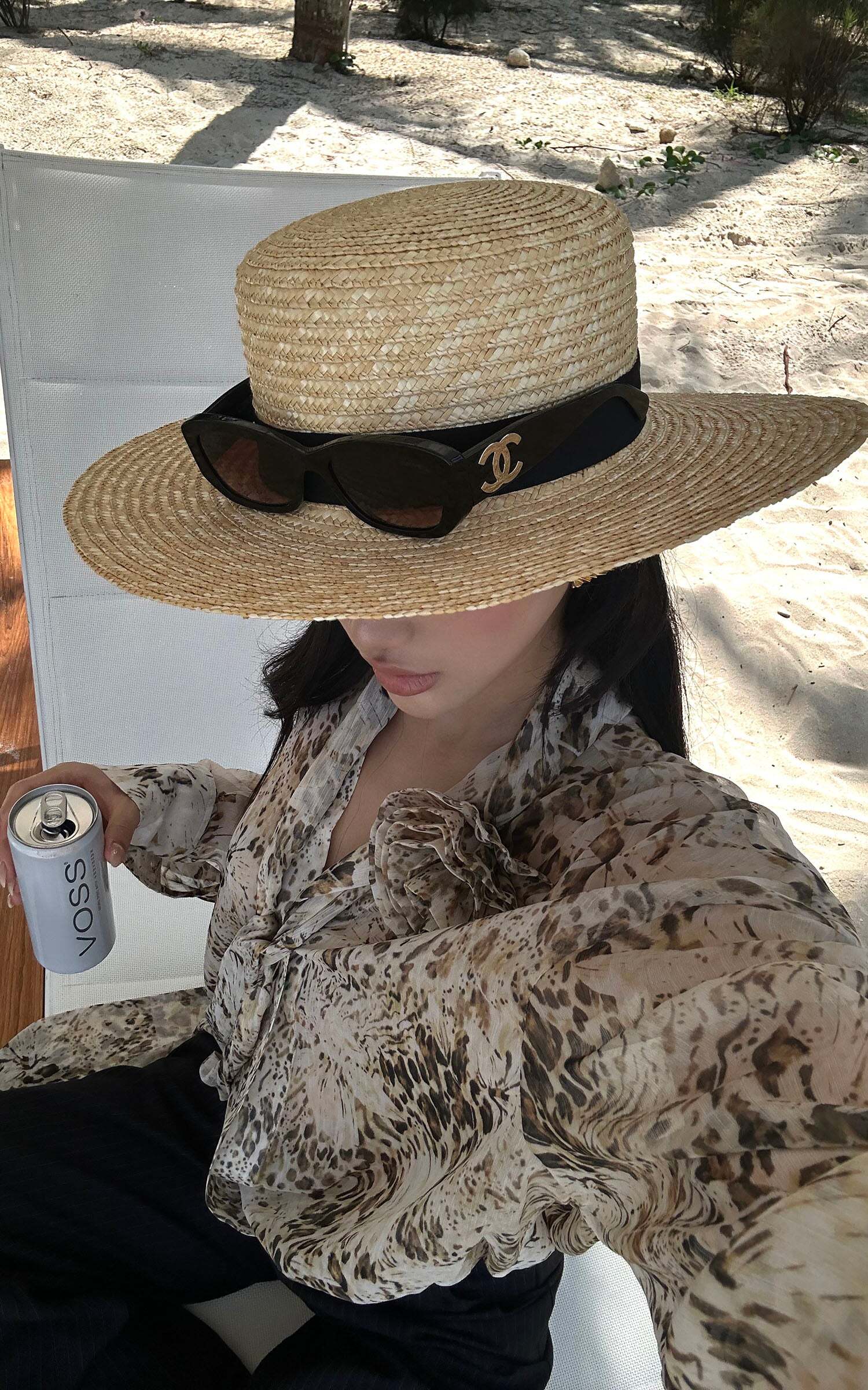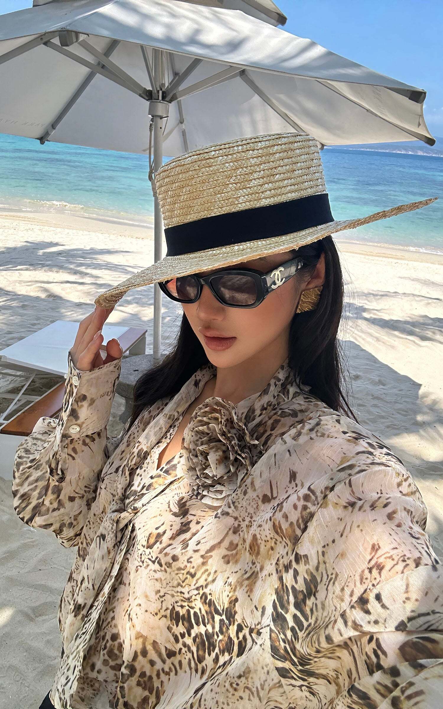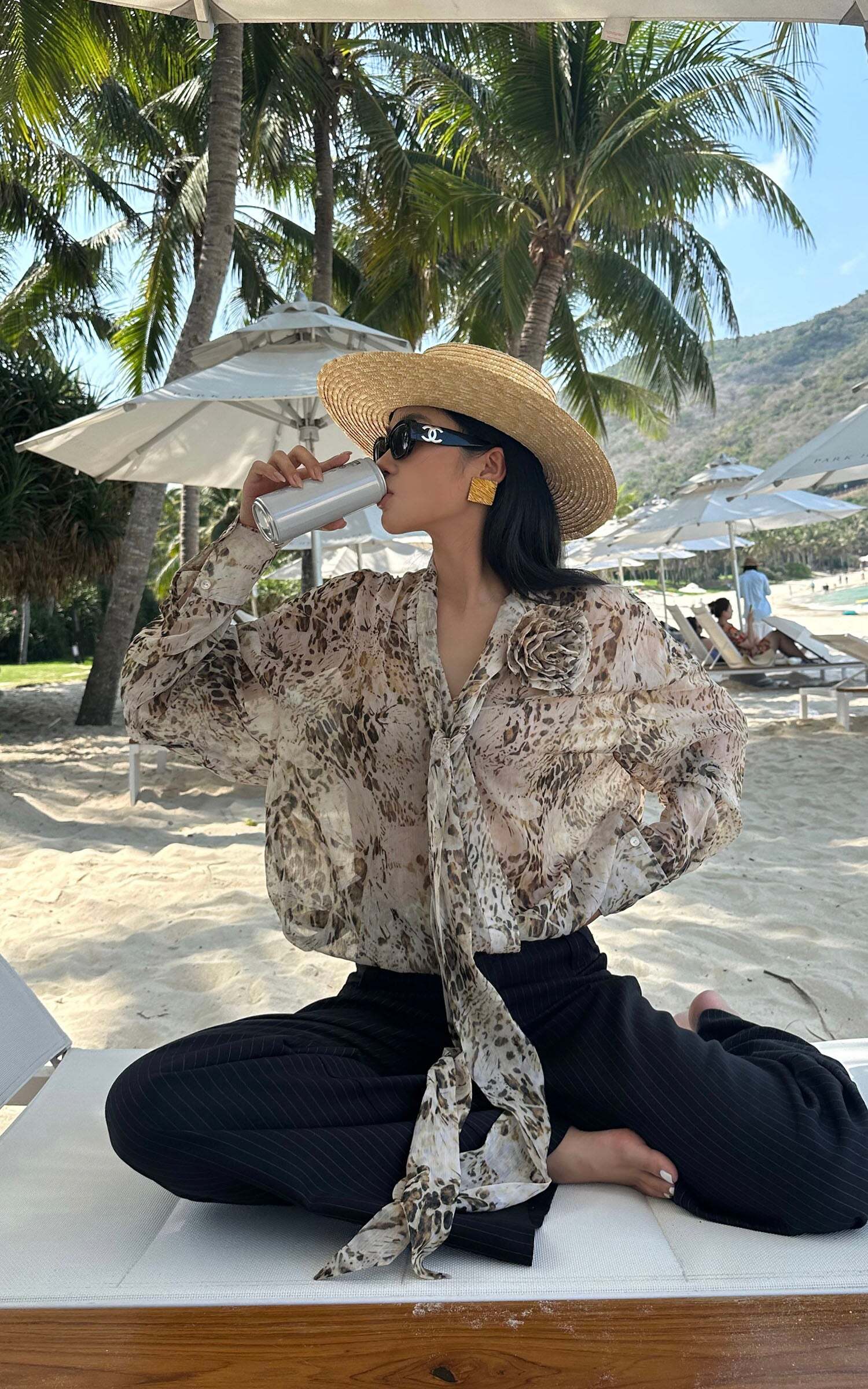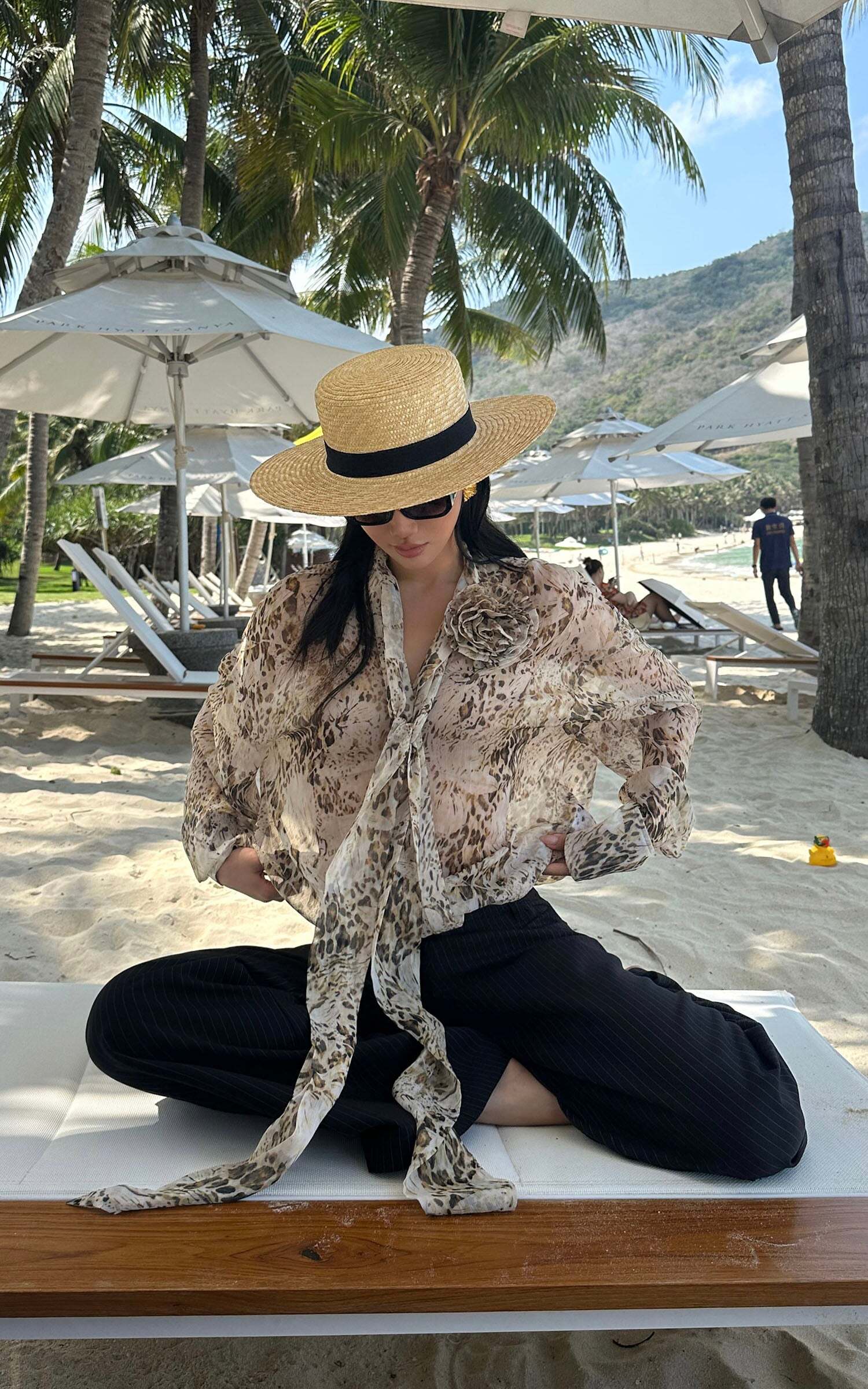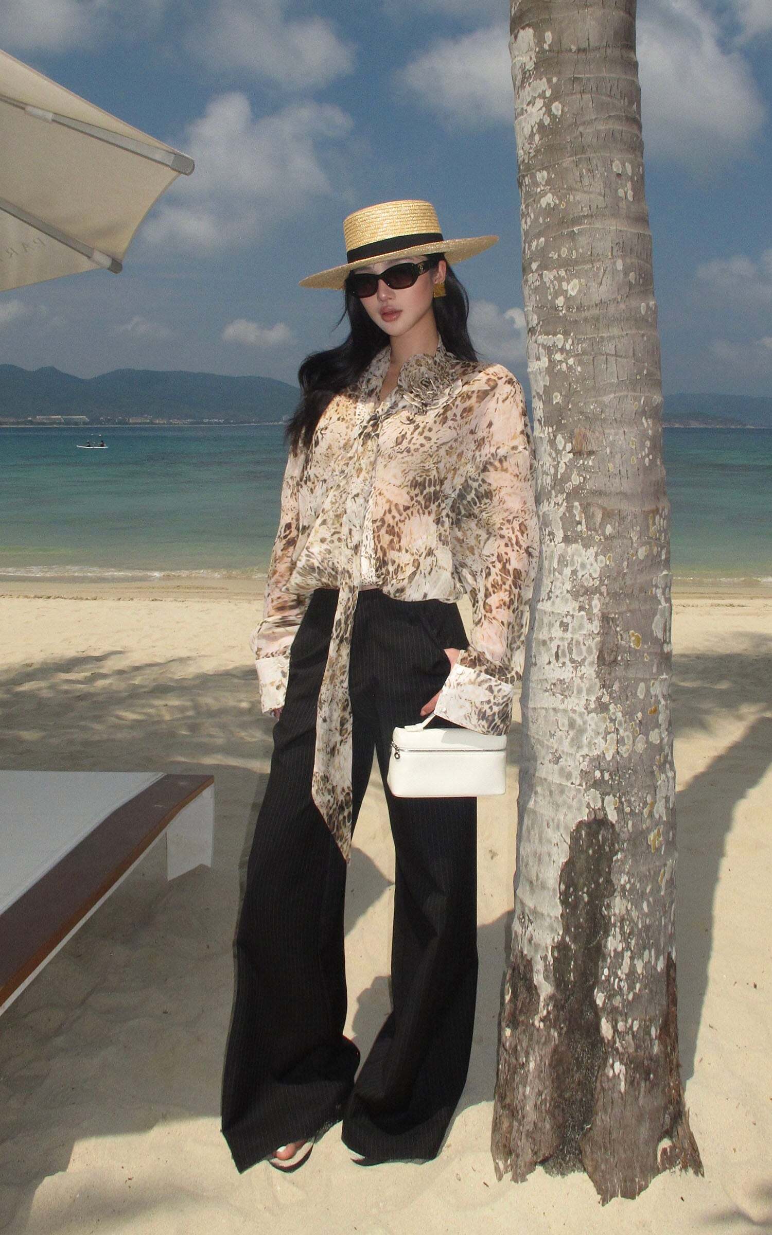 Unruly elegance meets bohemian ease. This sheer chiffon blouse is drenched in a wild leopard motif and elevated by an oversized necktie that can be looped into a bow or left loose for undone glamour. The lightweight fabric floats effortlessly with every breeze, while the hand-sewn 3D rosette adds sculptural charm and femme contrast. Cuffed balloon sleeves offer soft structure, making it a standout piece whether tucked into tailored trousers or thrown over a bikini. From beachside drinks to twilight parties, this blouse slips between bold and breezy with effortless allure.