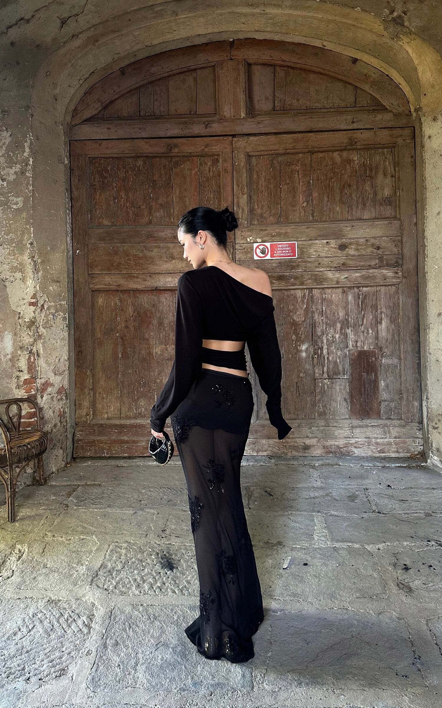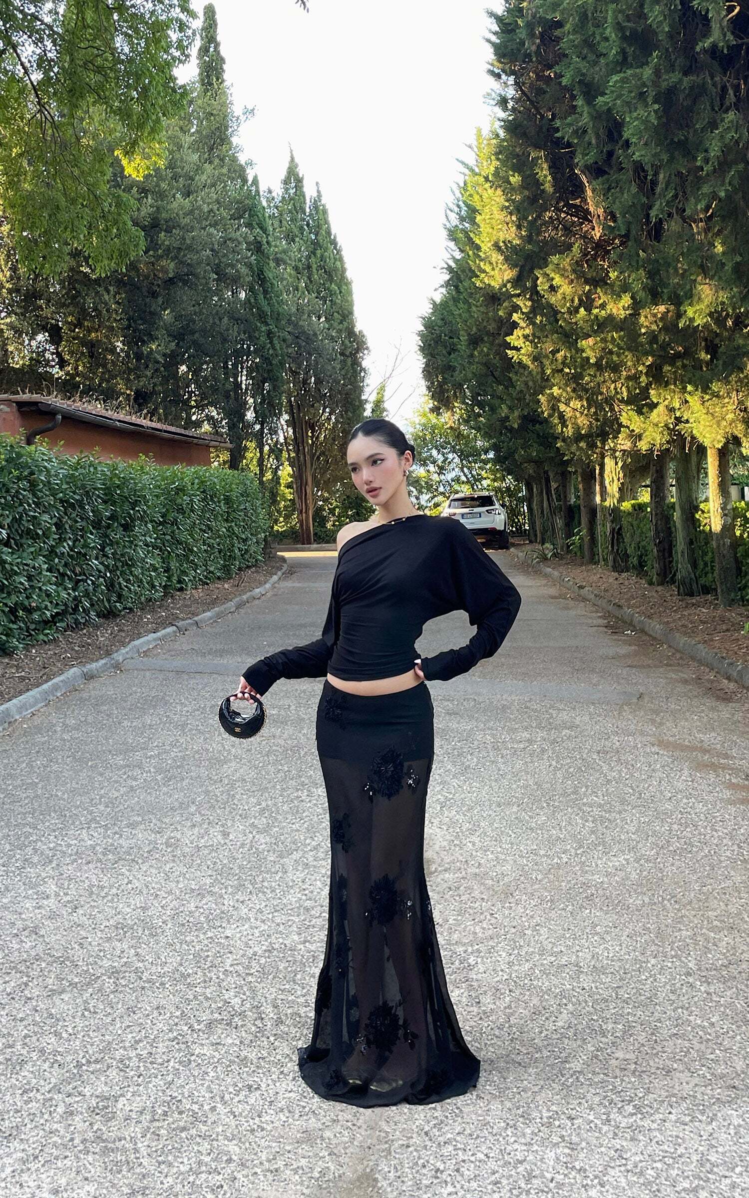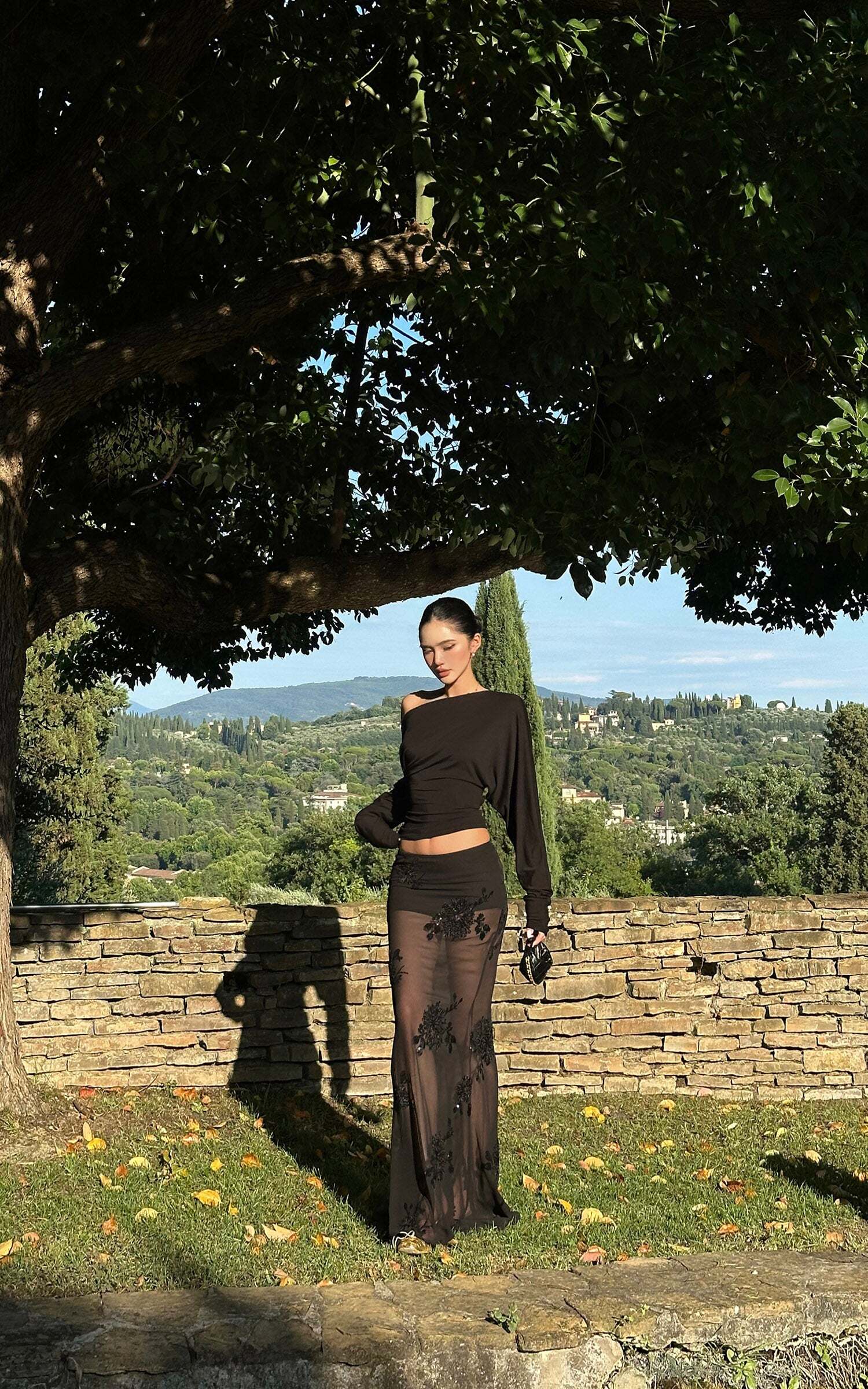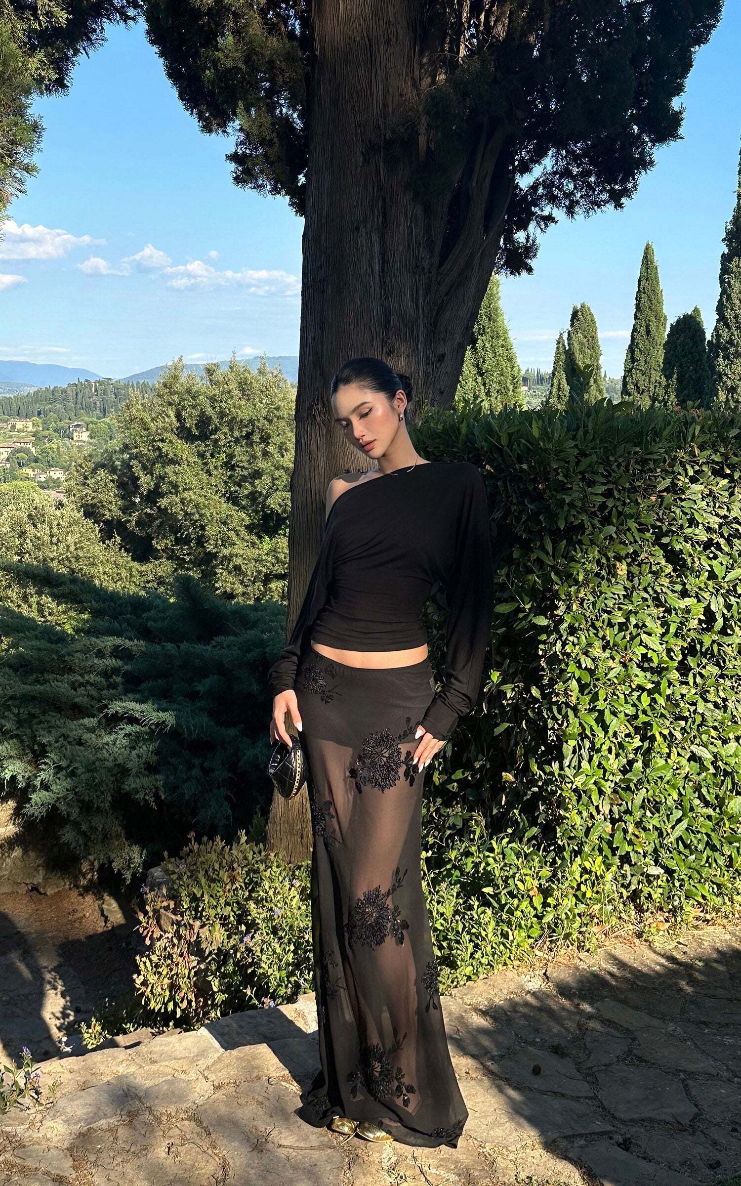 A striking balance of seduction and sophistication, this maxi skirt is crafted from sheer mesh and adorned with intricate floral embroidery and shimmering sequins. The fluid silhouette skims the figure while offering a dramatic floor-grazing length. Style it with a sleek top for after-dark elegance or layer over bodysuits for a daring statement.