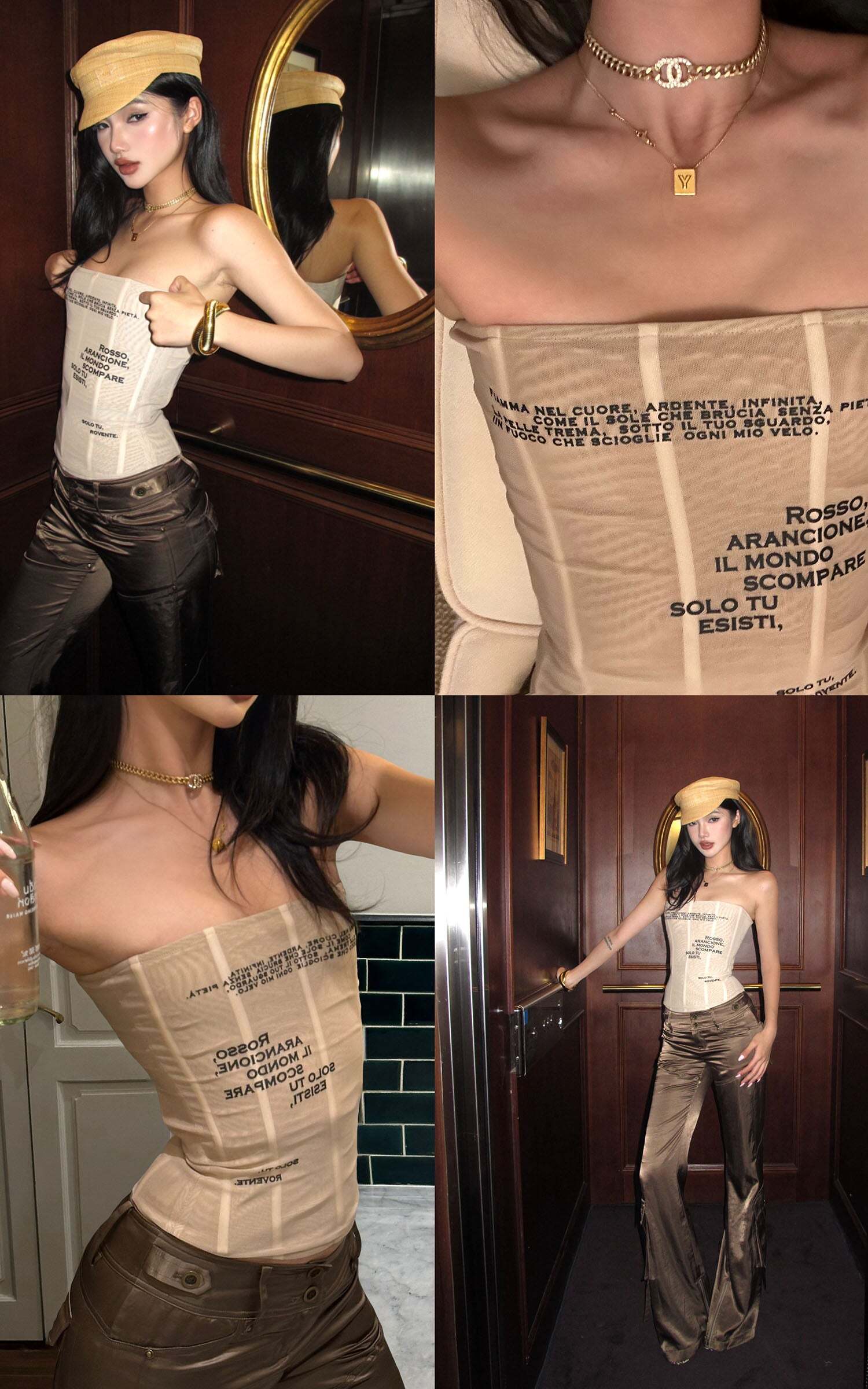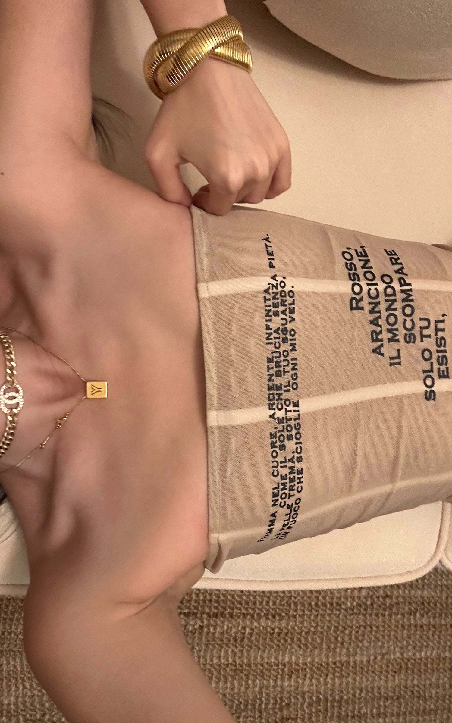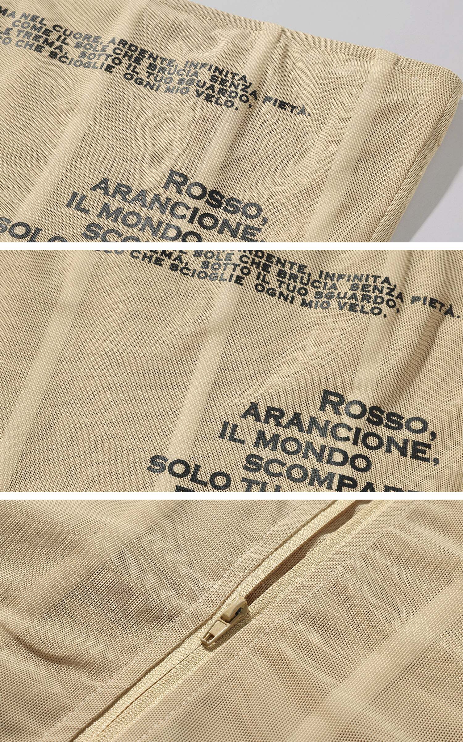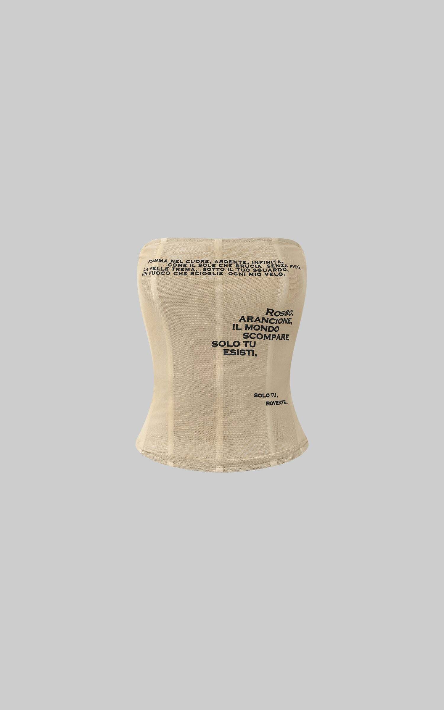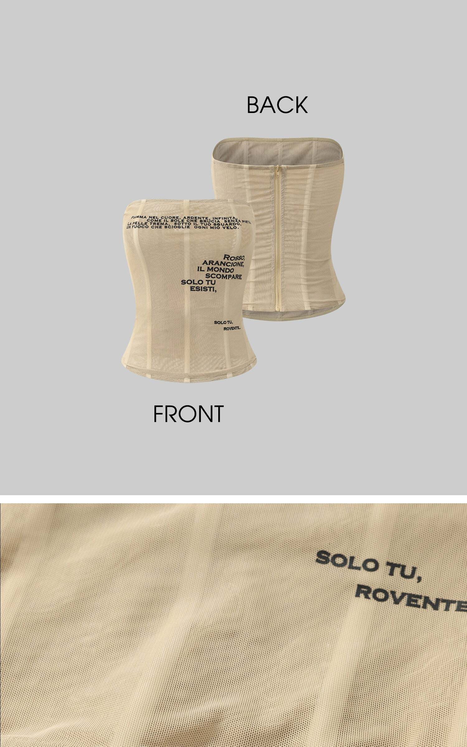 This sultry mesh corset top is your next statement piece — sculpted with boning to contour the waist and cut strapless to bare the collarbone. Featuring an asymmetric layout of romantic Italian verses, it whispers poetry against your skin. A back zip keeps the silhouette sleek and fitted, while the sheer stretch mesh offers comfort without compromising edge. Pair it with satin cargo pants or low-rise leather for a coolly undone aesthetic.